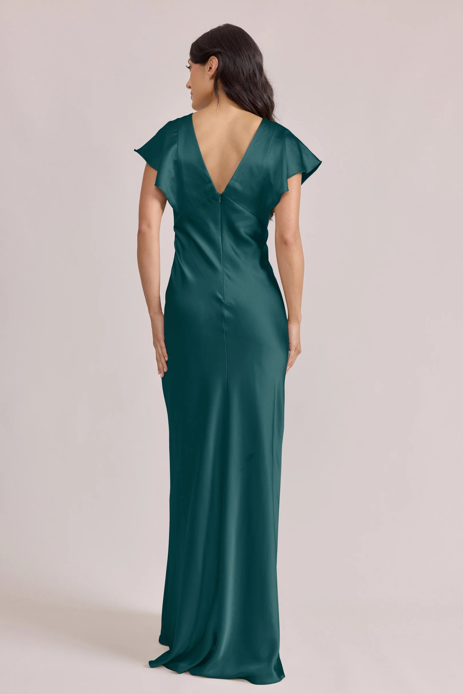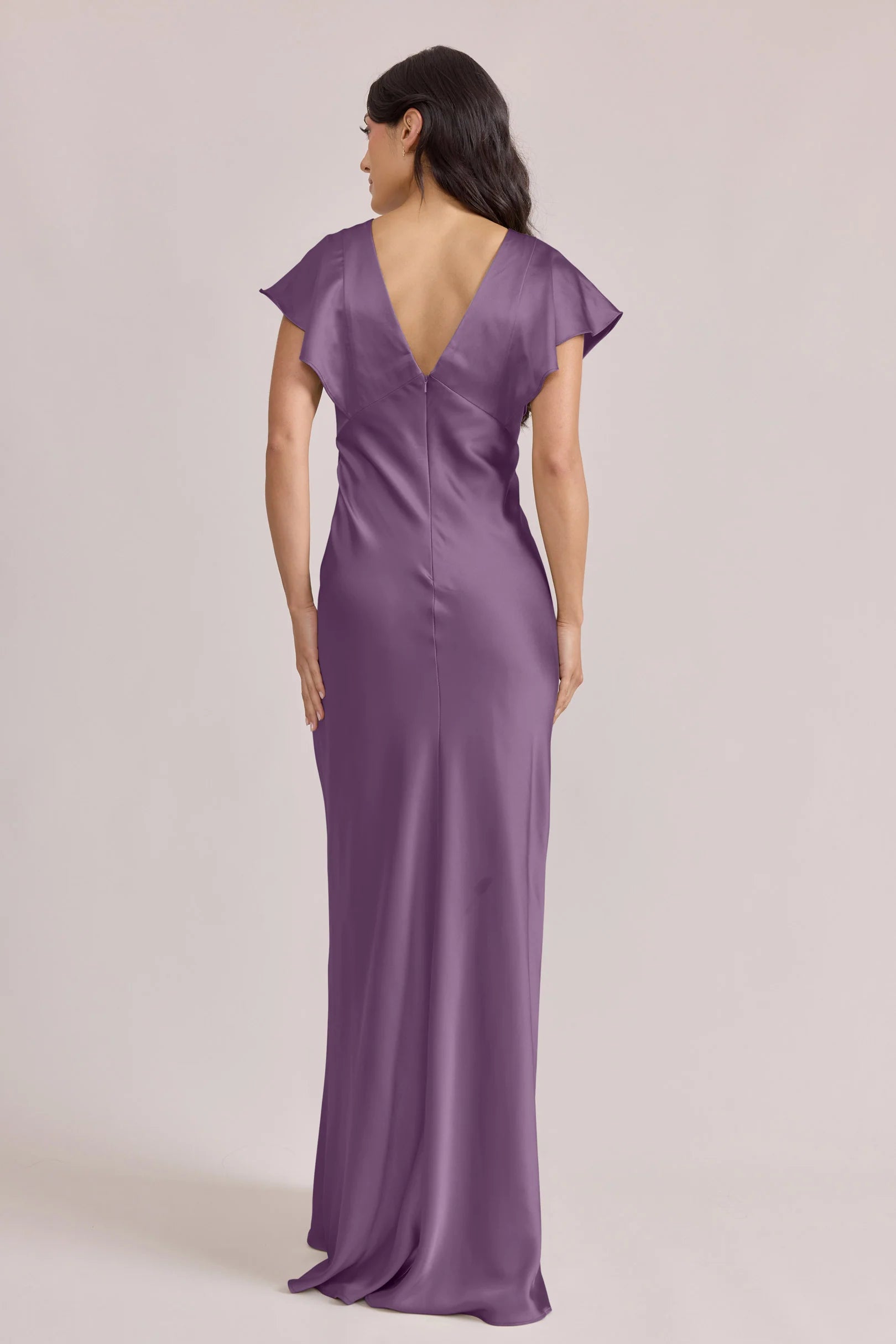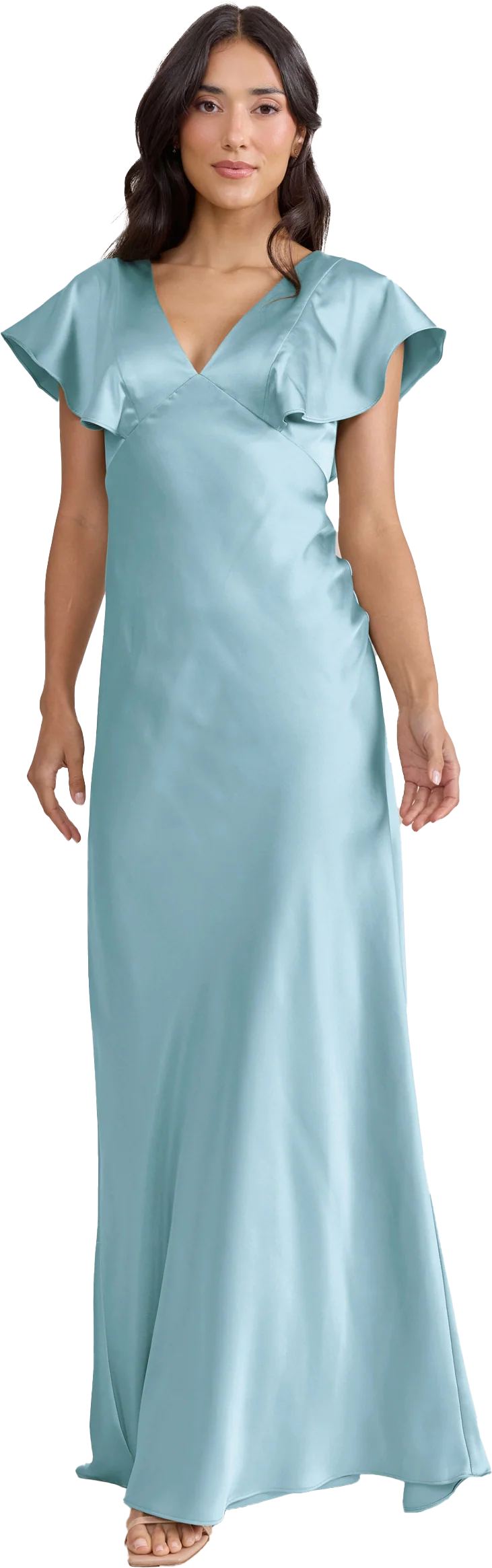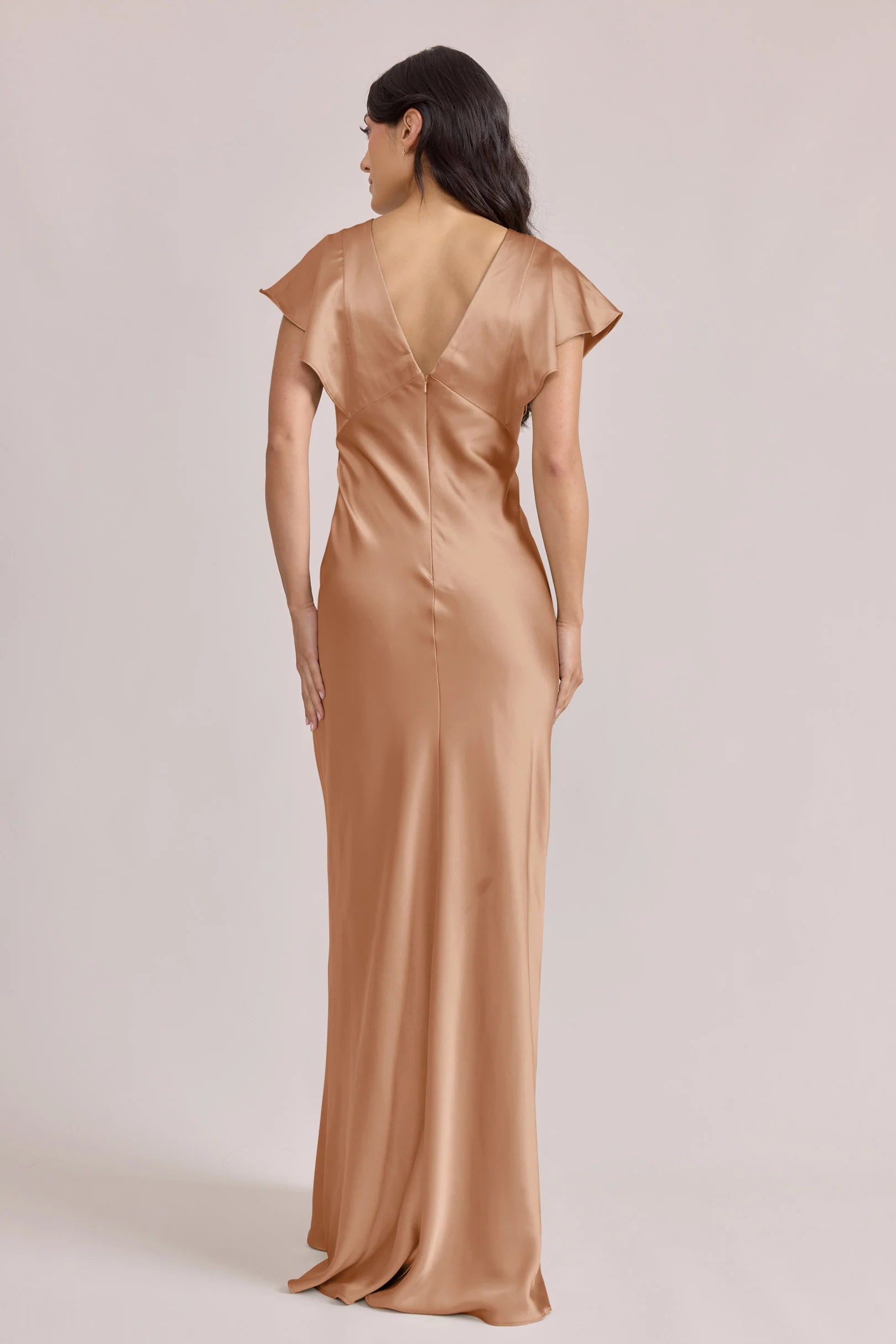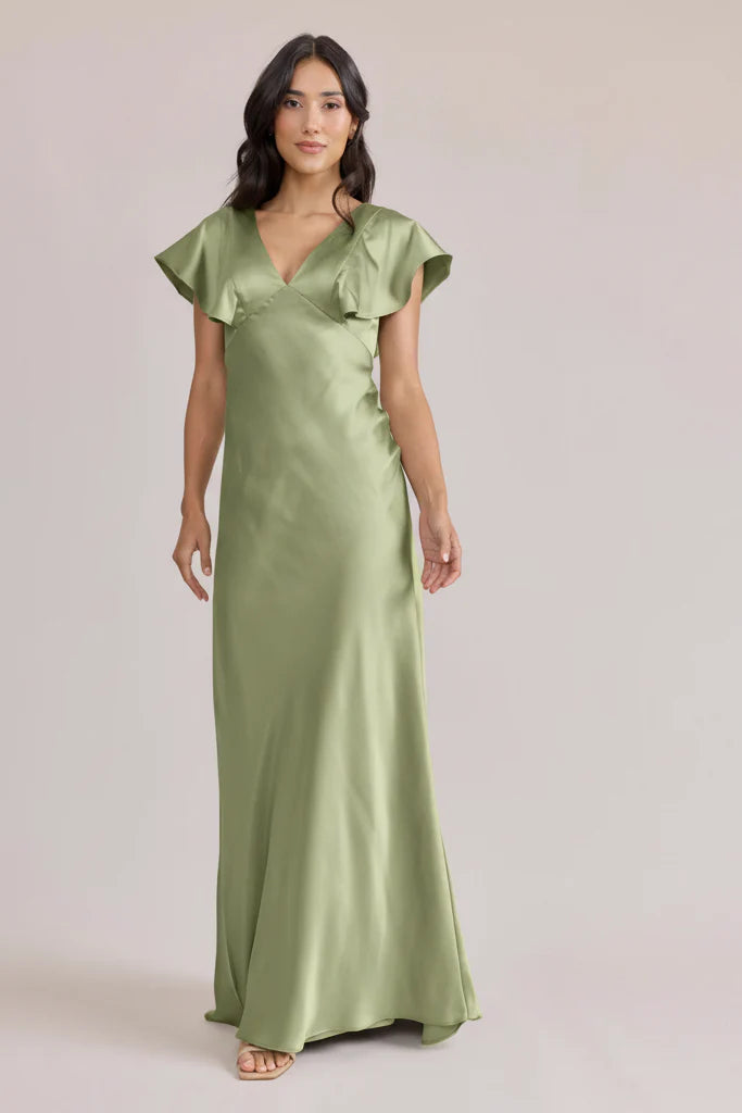 Effortlessly elegant, the Ellapink Satin Dress is a modern take on timeless romance. Designed with a sleek column silhouette and flattering empire waistline, Eden features a soft V-neckline and flutter sleeves that cascade from delicate princess seams. Built-in bra cups offer subtle support, while the back zipper ensures a smooth, tailored fit.