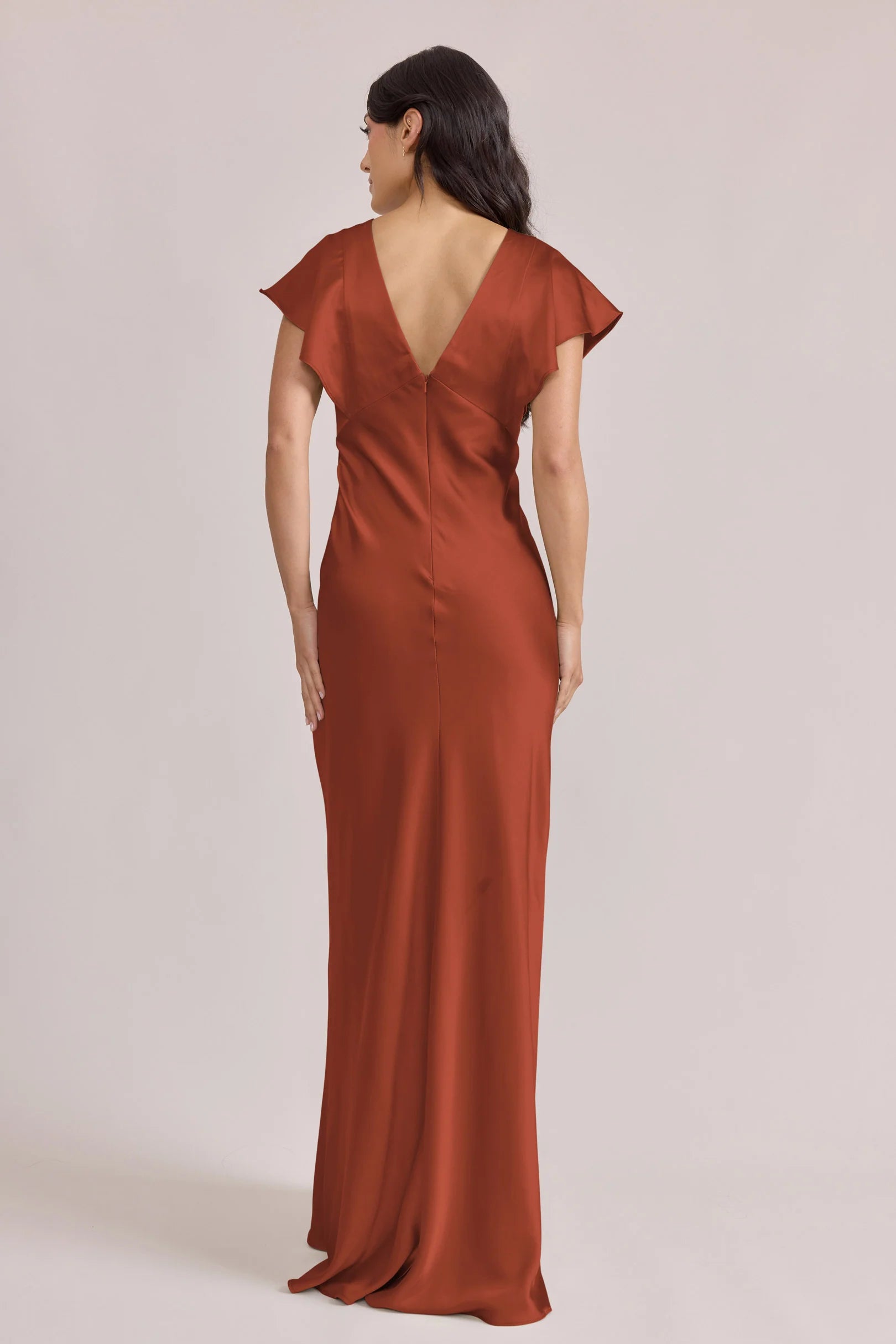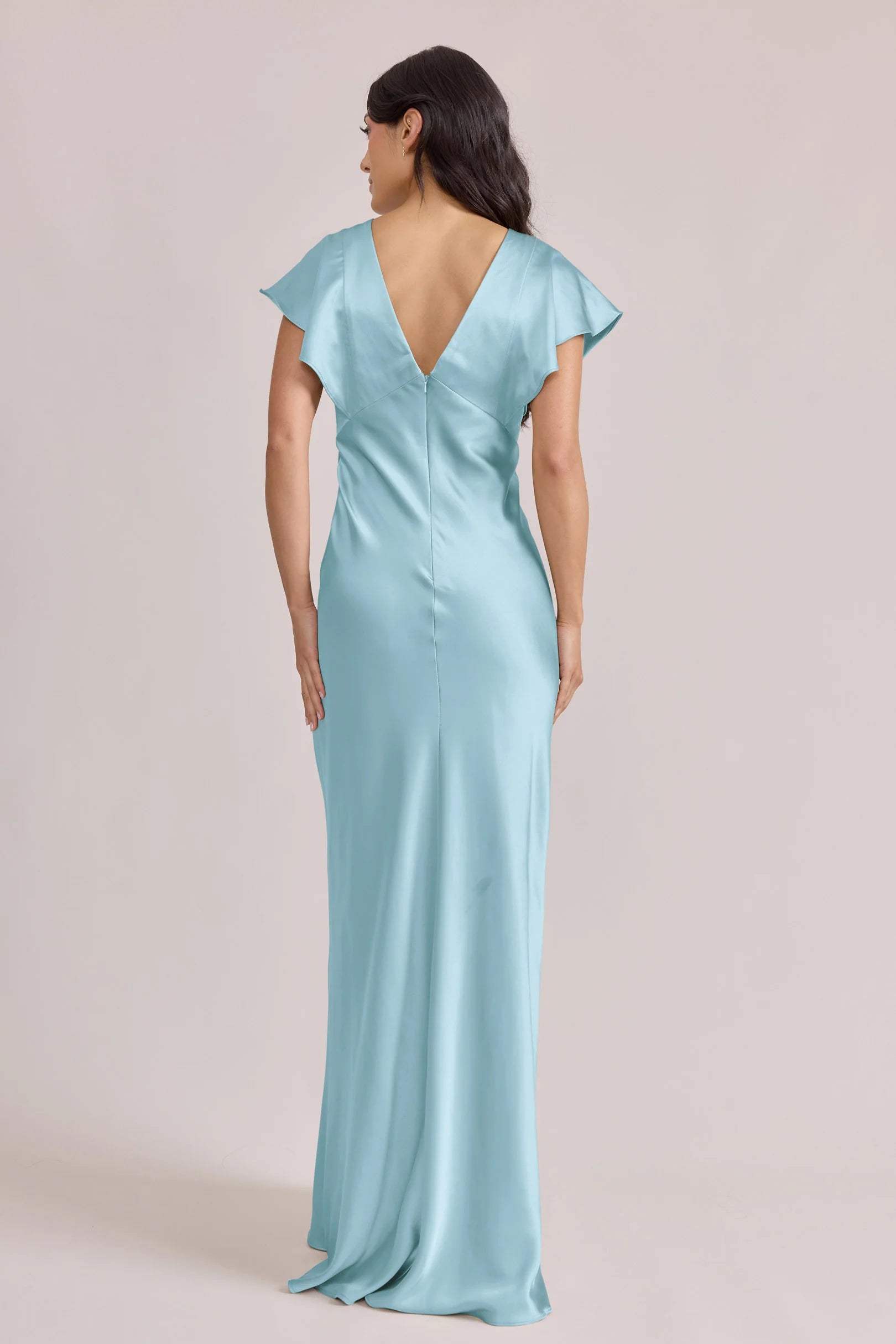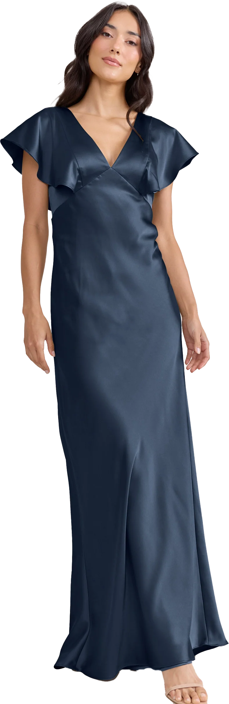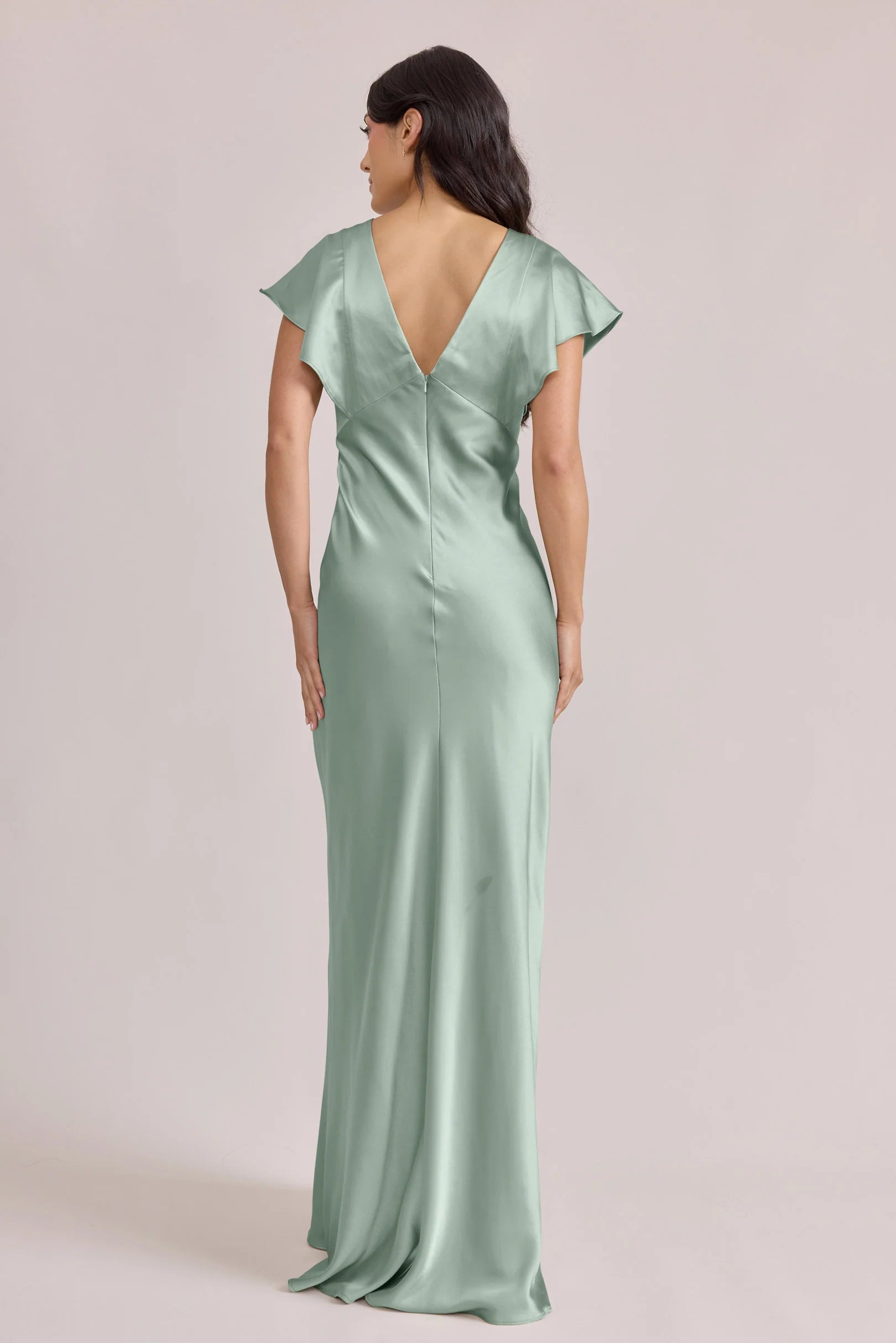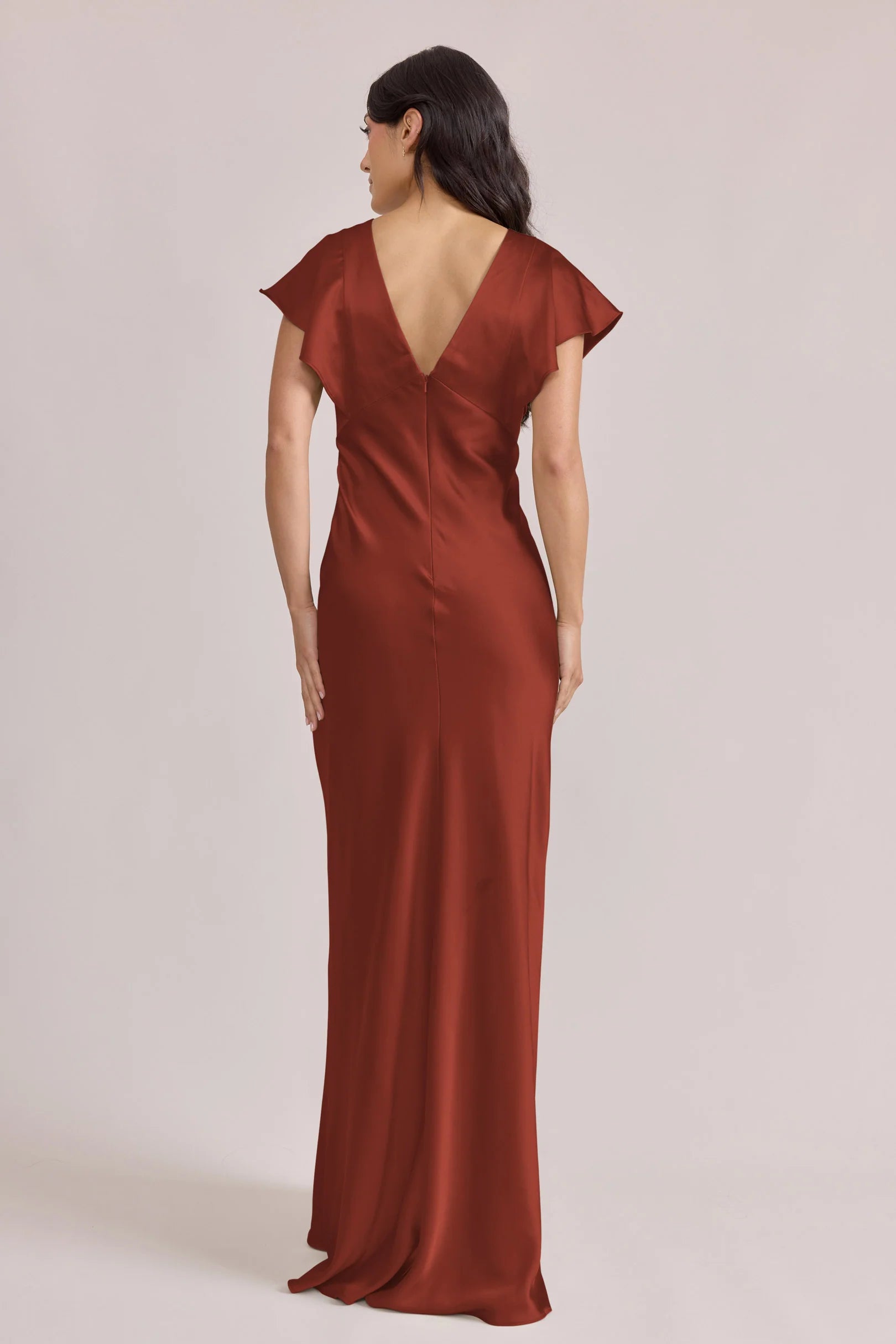 Effortlessly elegant, the Ellapink Satin Dress is a modern take on timeless romance. Designed with a sleek column silhouette and flattering empire waistline, Eden features a soft V-neckline and flutter sleeves that cascade from delicate princess seams. Built-in bra cups offer subtle support, while the back zipper ensures a smooth, tailored fit.