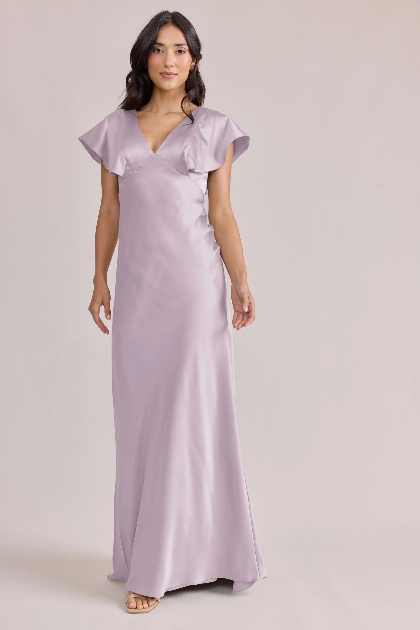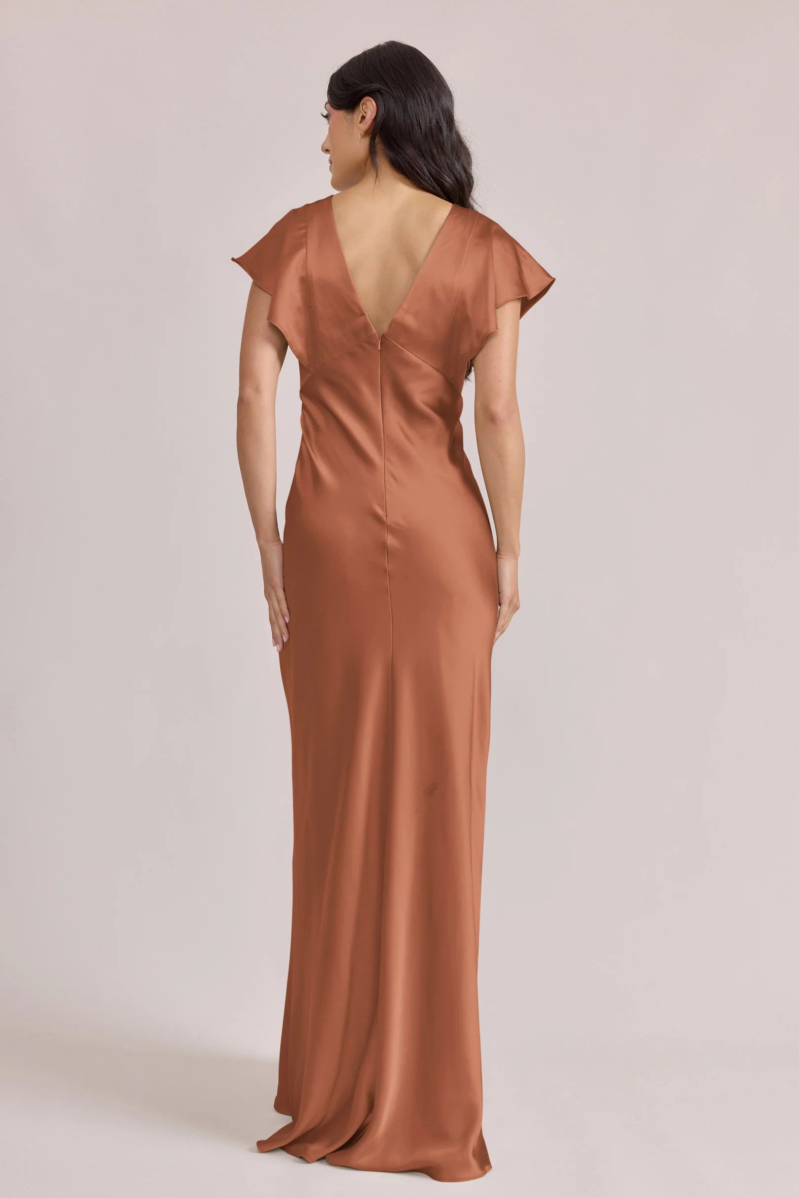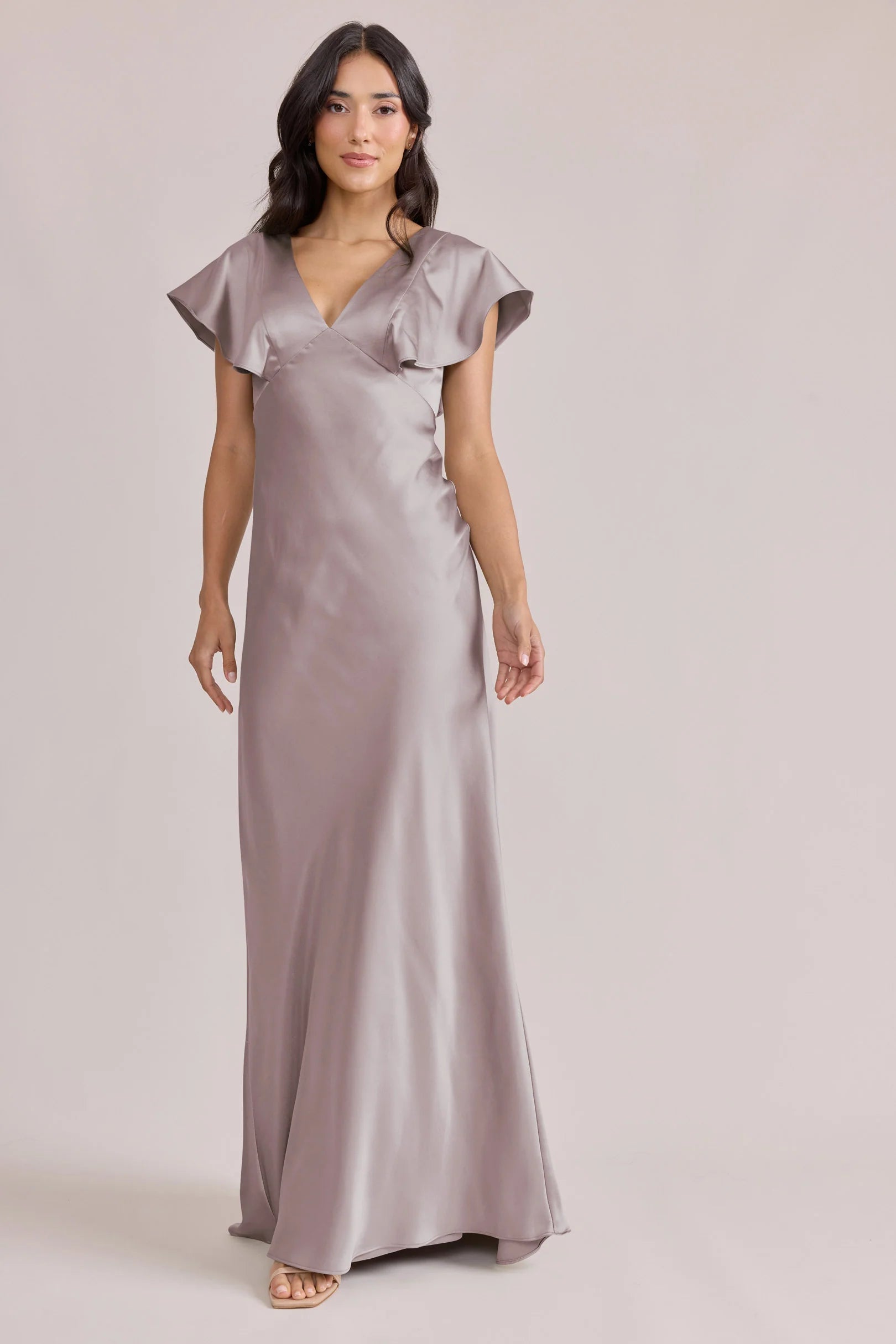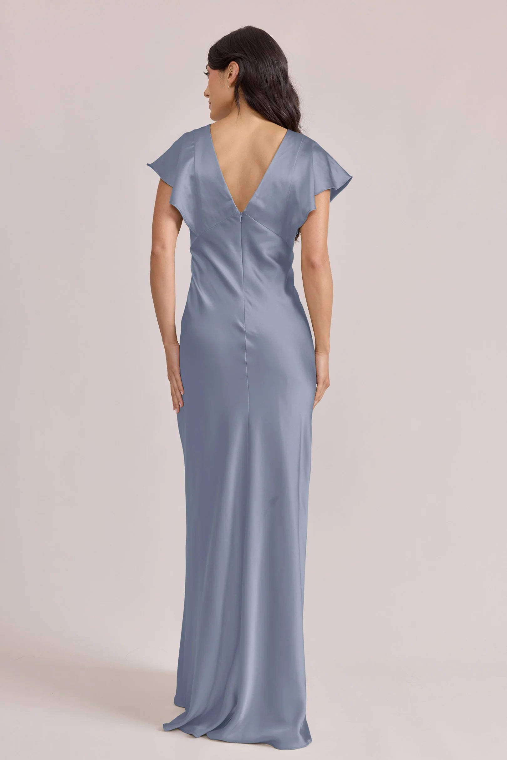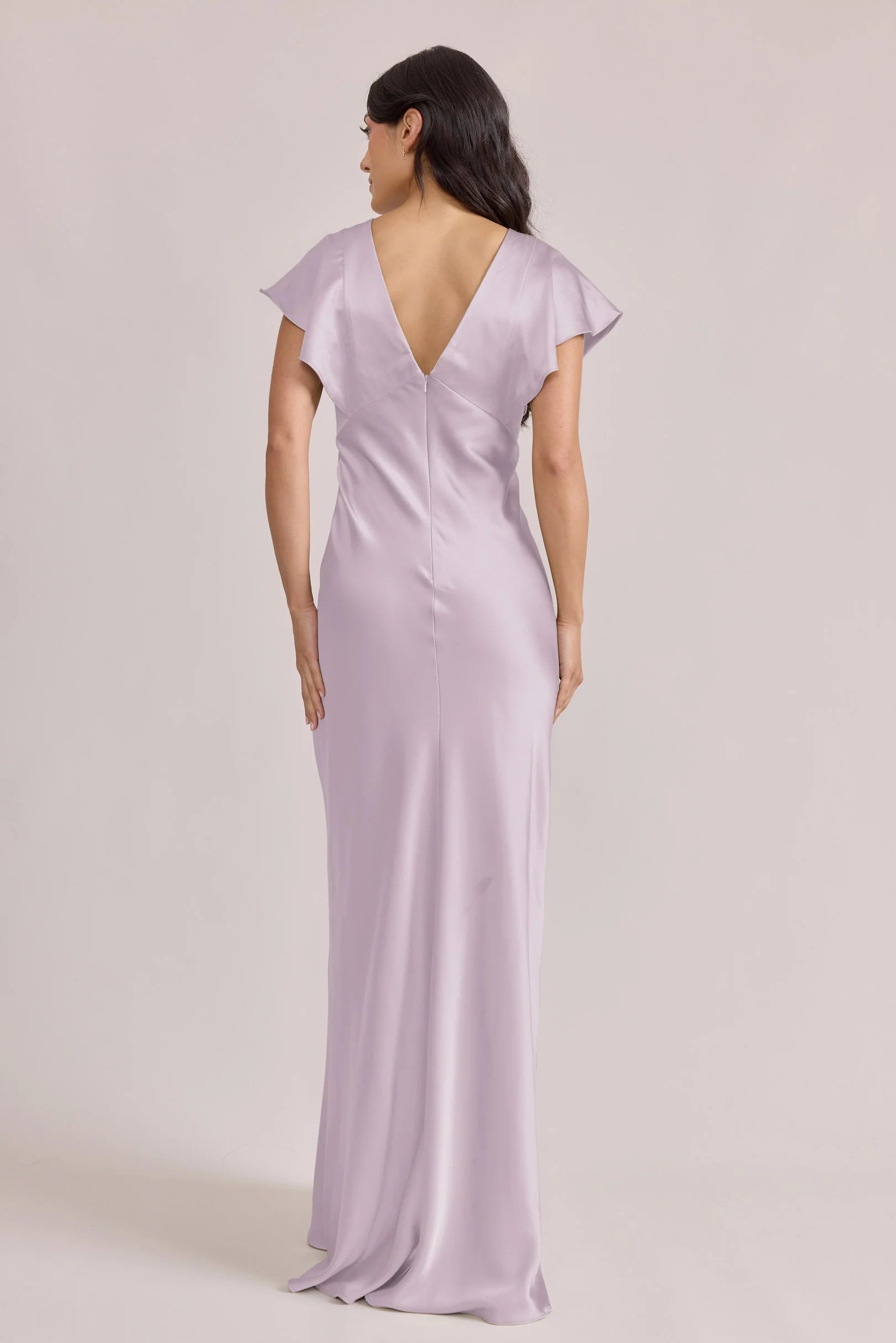 Effortlessly elegant, the Ellapink Satin Dress is a modern take on timeless romance. Designed with a sleek column silhouette and flattering empire waistline, Eden features a soft V-neckline and flutter sleeves that cascade from delicate princess seams. Built-in bra cups offer subtle support, while the back zipper ensures a smooth, tailored fit.