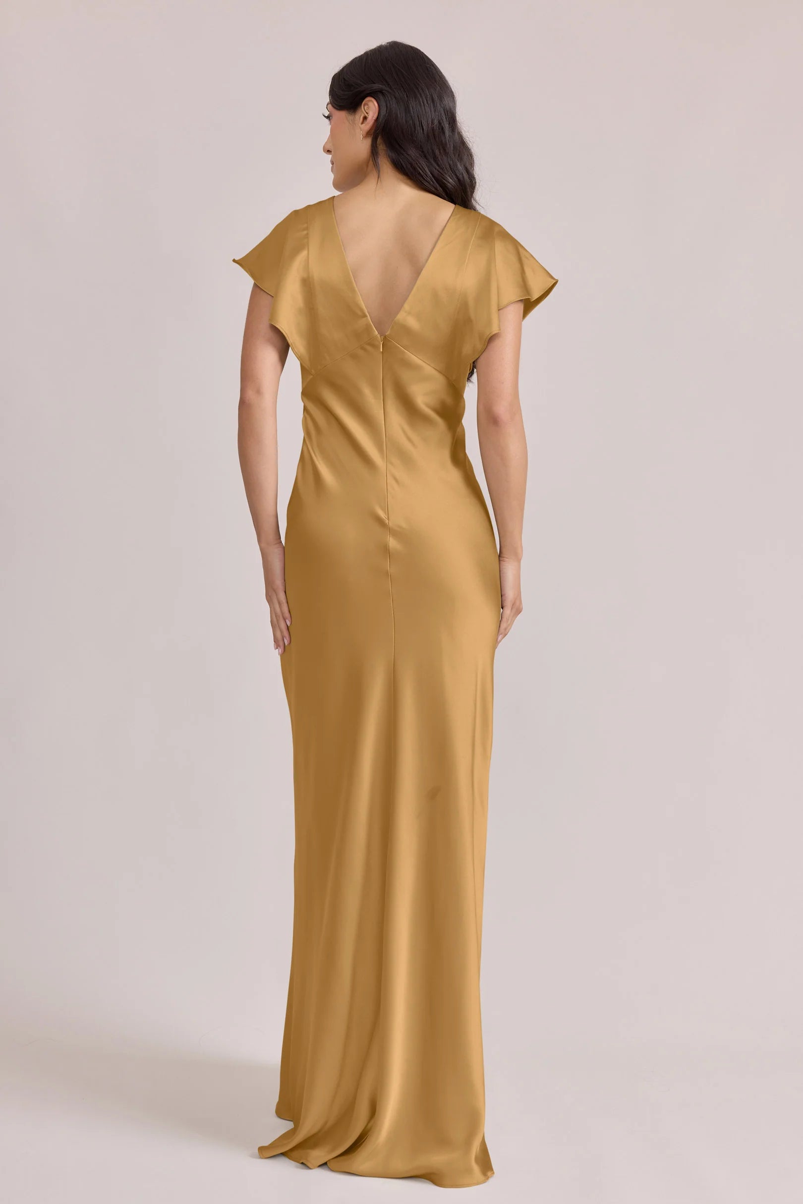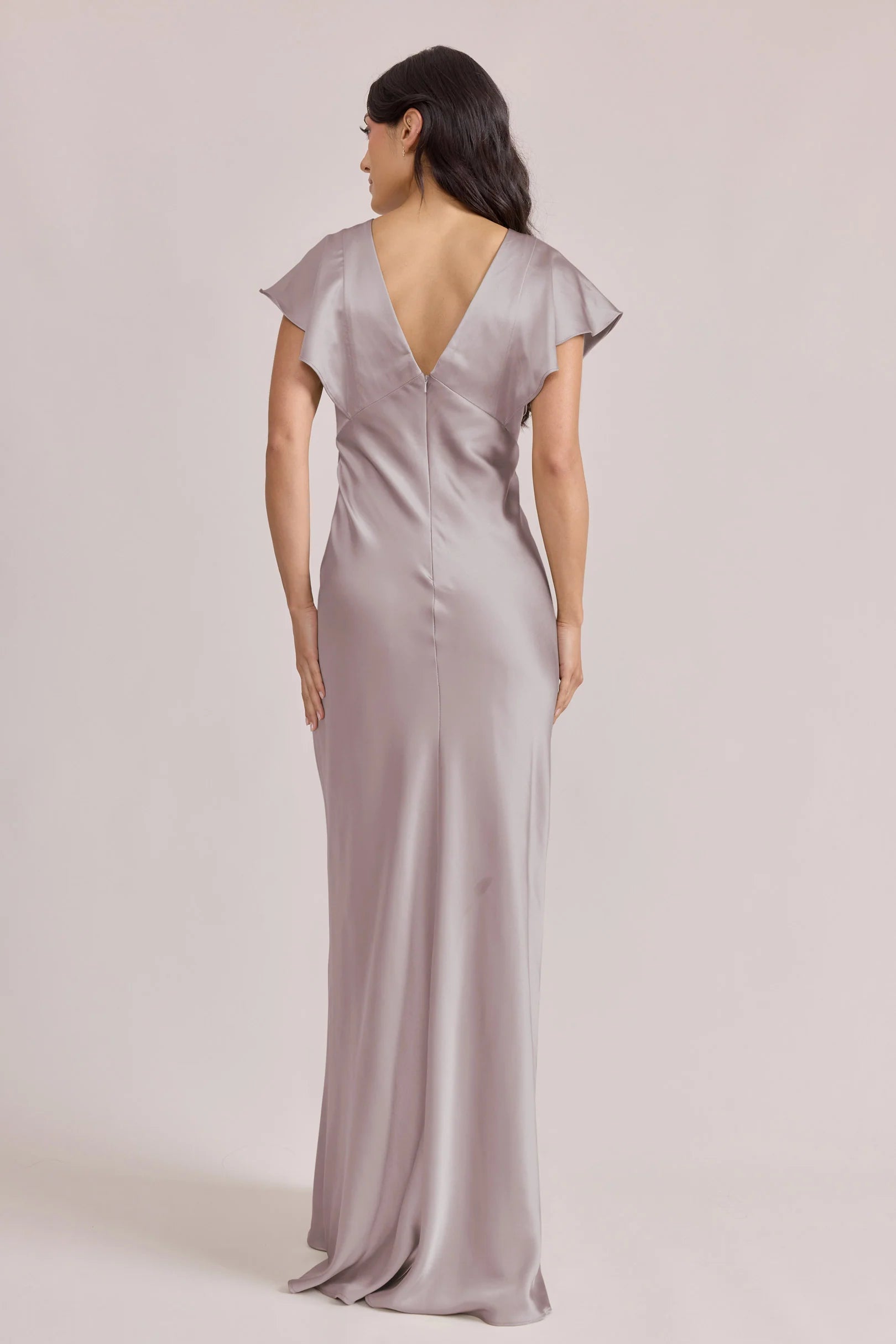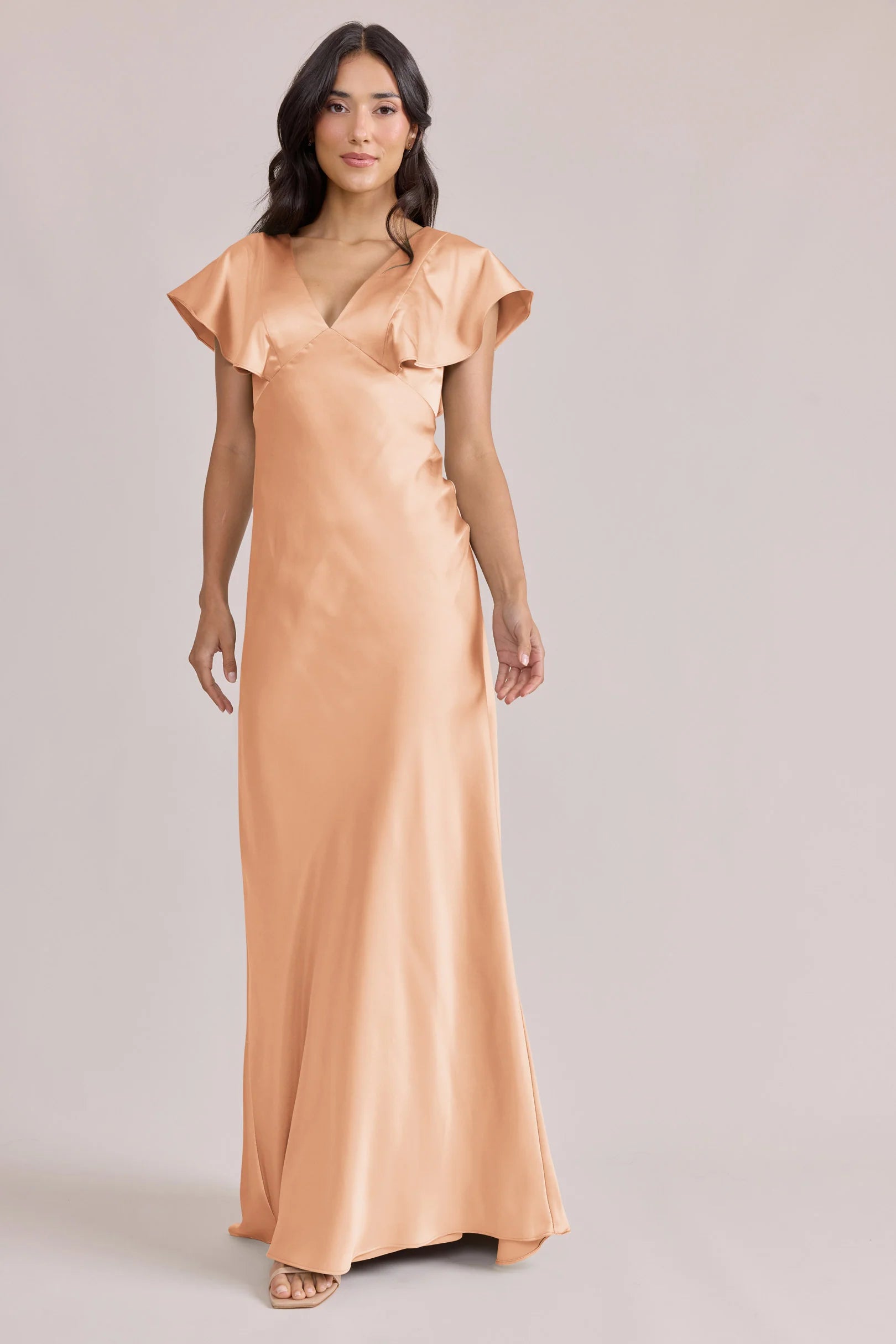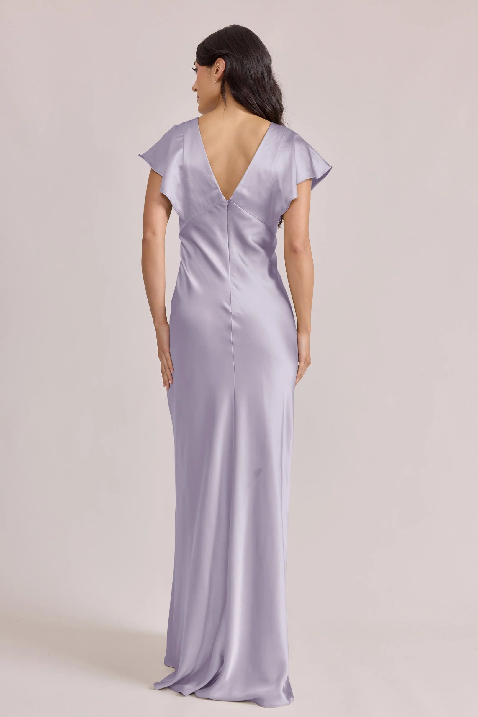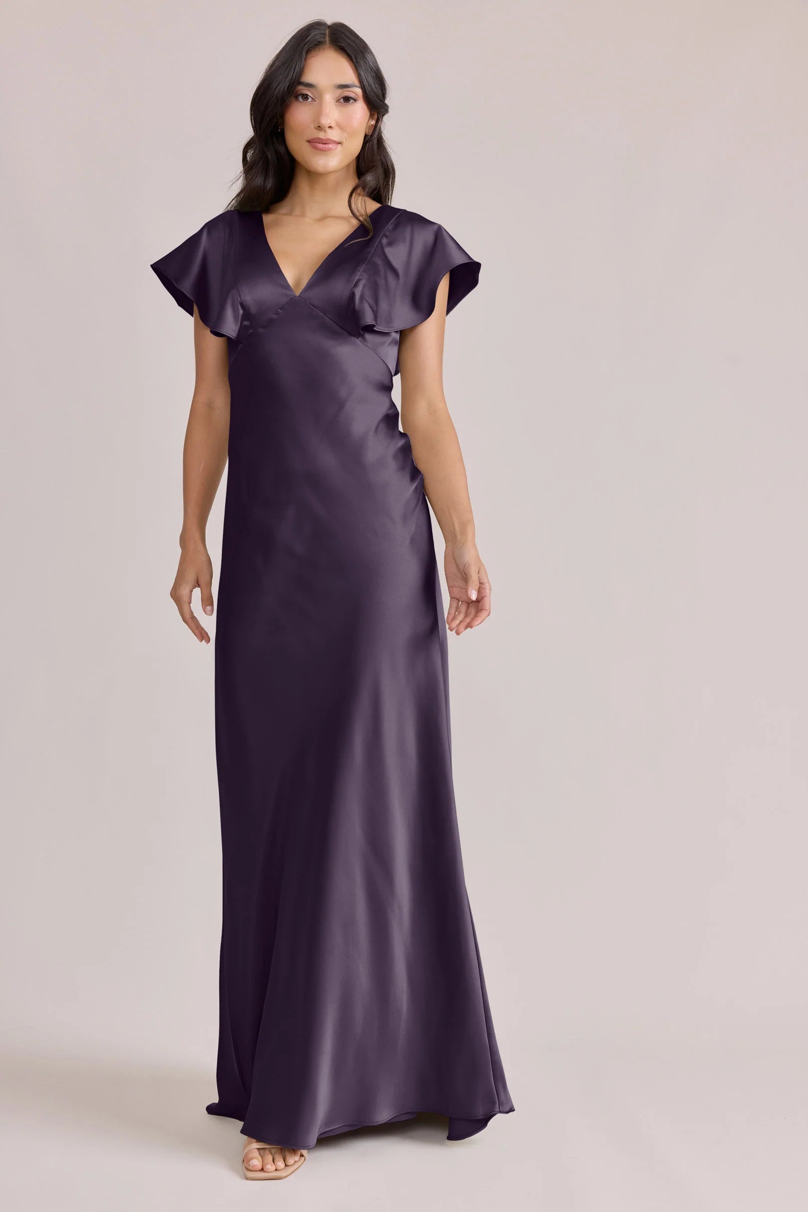Effortlessly elegant, the Ellapink Satin Dress is a modern take on timeless romance. Designed with a sleek column silhouette and flattering empire waistline, Eden features a soft V-neckline and flutter sleeves that cascade from delicate princess seams. Built-in bra cups offer subtle support, while the back zipper ensures a smooth, tailored fit.