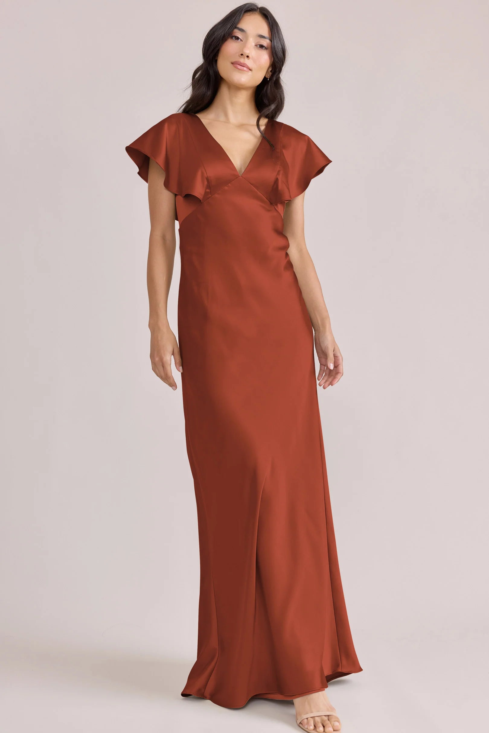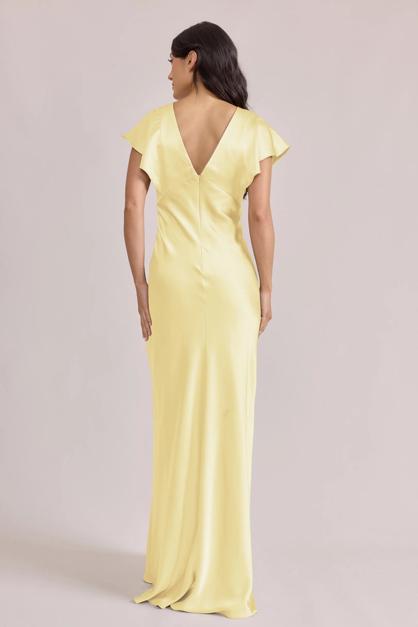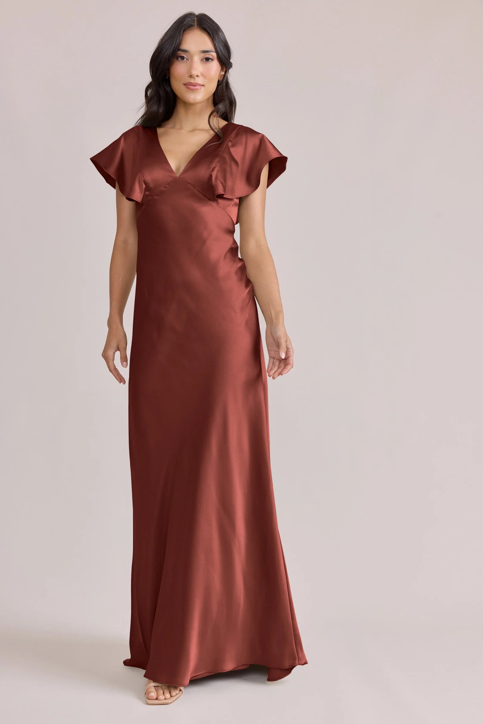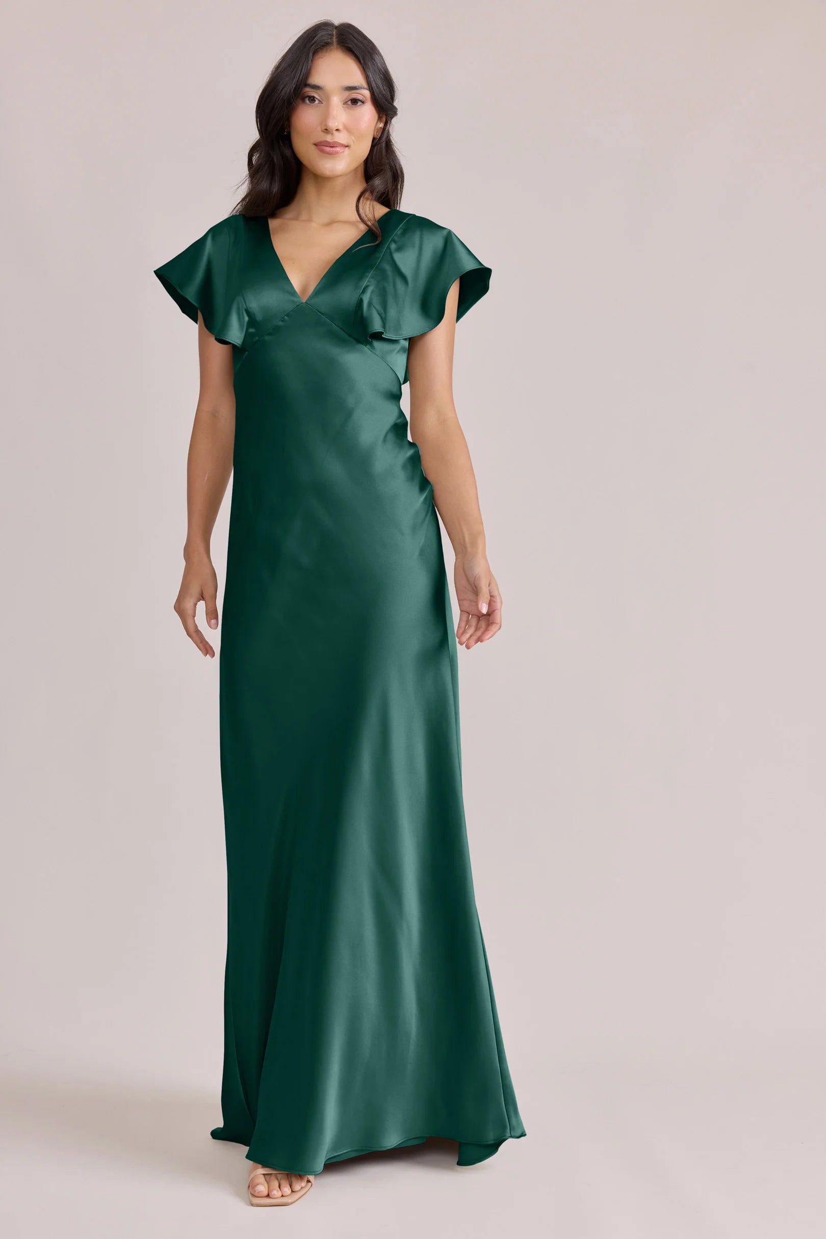 Effortlessly elegant, the Ellapink Satin Dress is a modern take on timeless romance. Designed with a sleek column silhouette and flattering empire waistline, Eden features a soft V-neckline and flutter sleeves that cascade from delicate princess seams. Built-in bra cups offer subtle support, while the back zipper ensures a smooth, tailored fit.