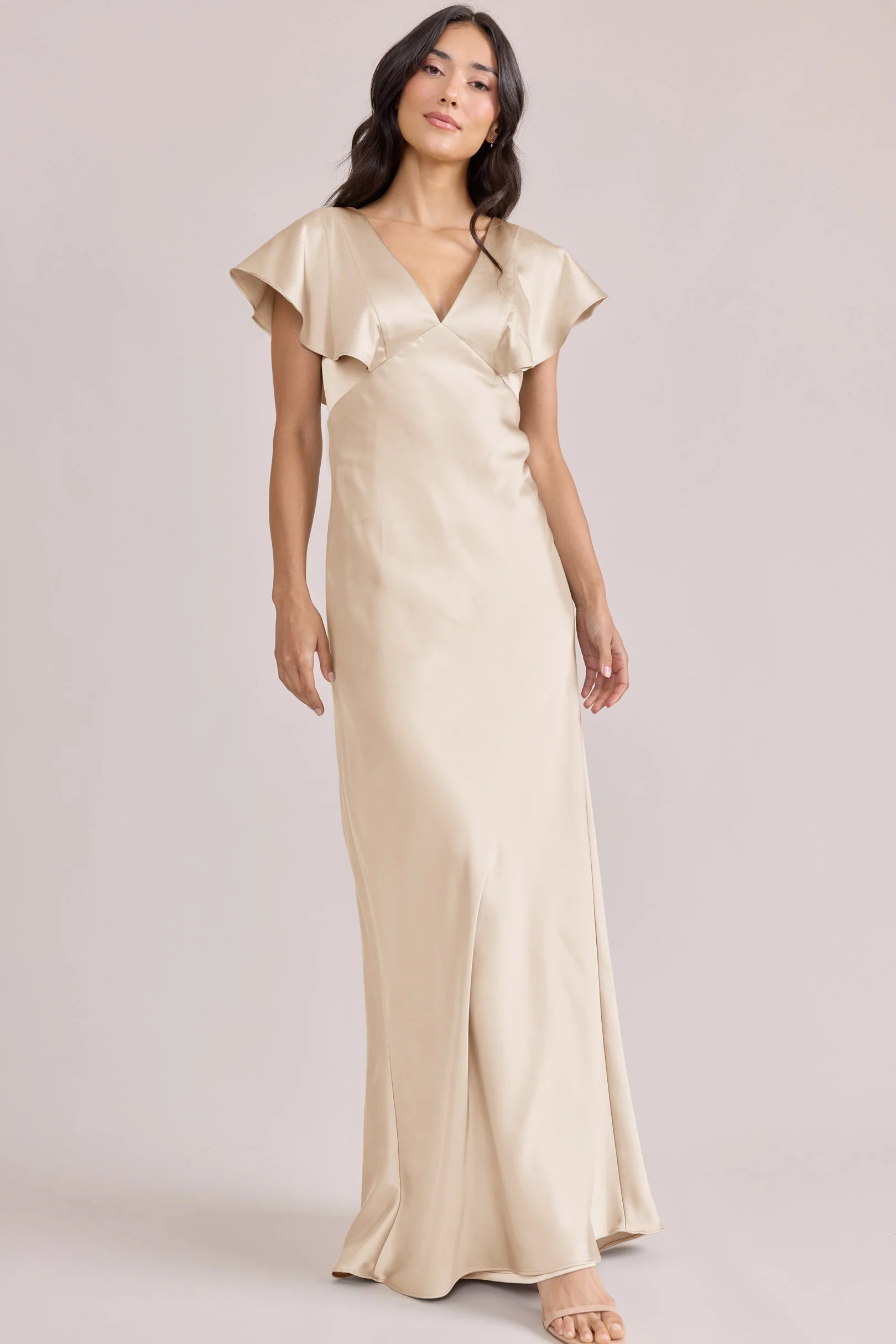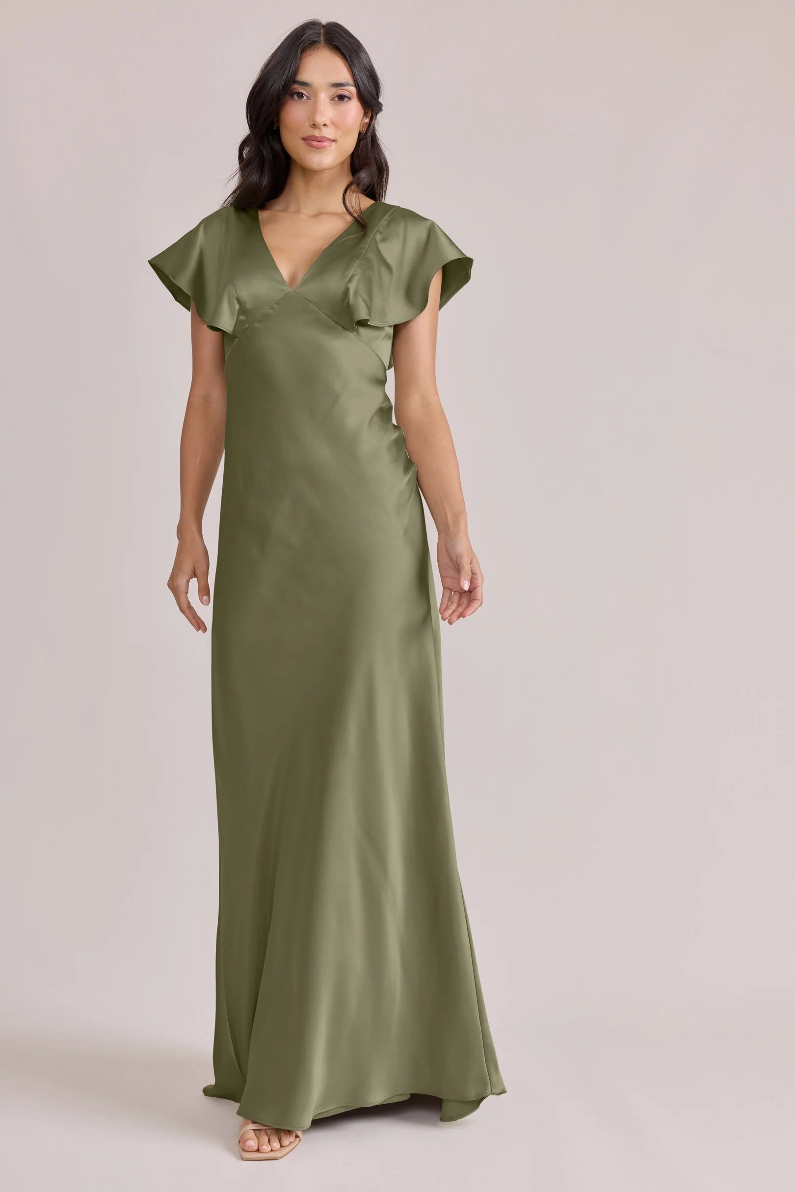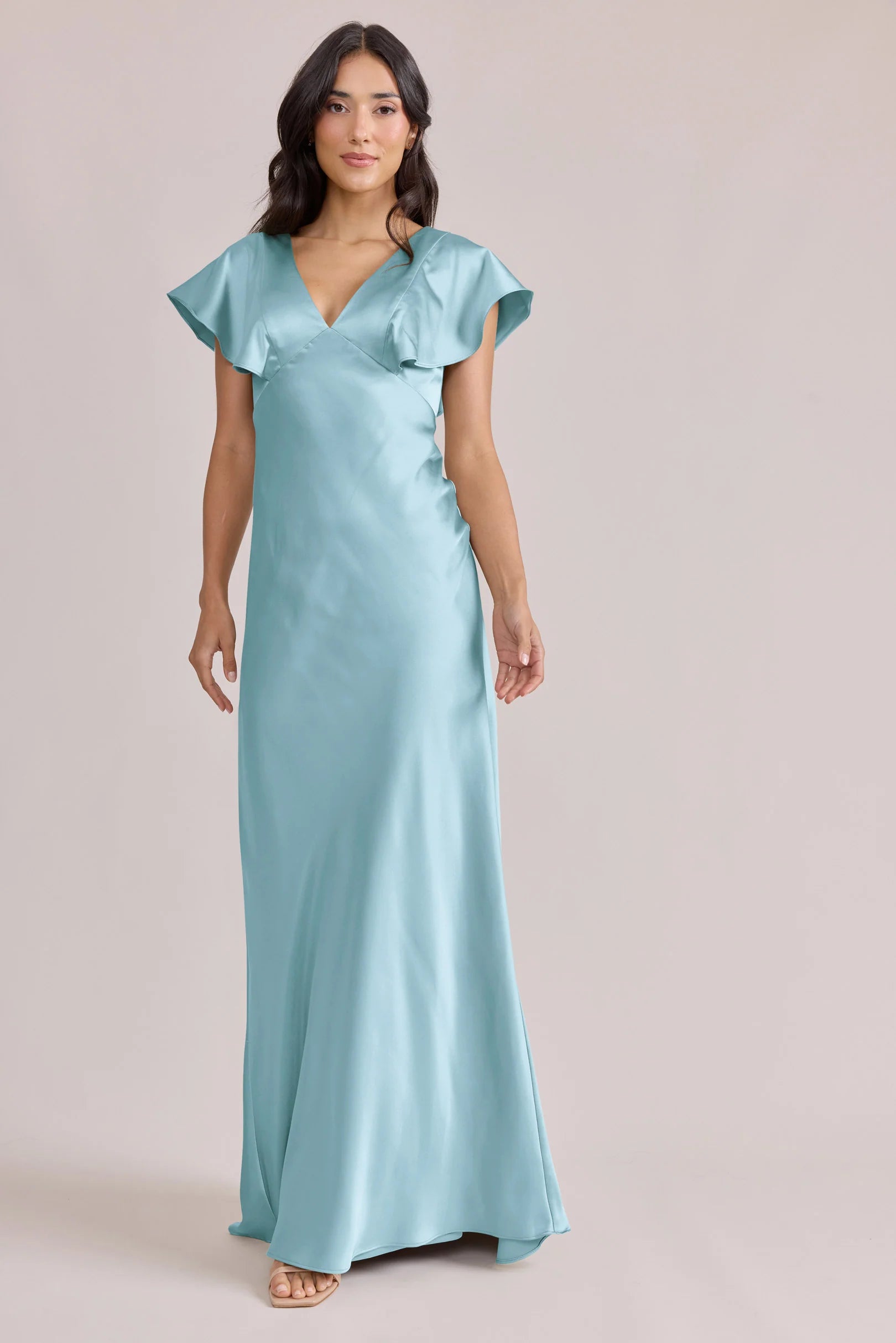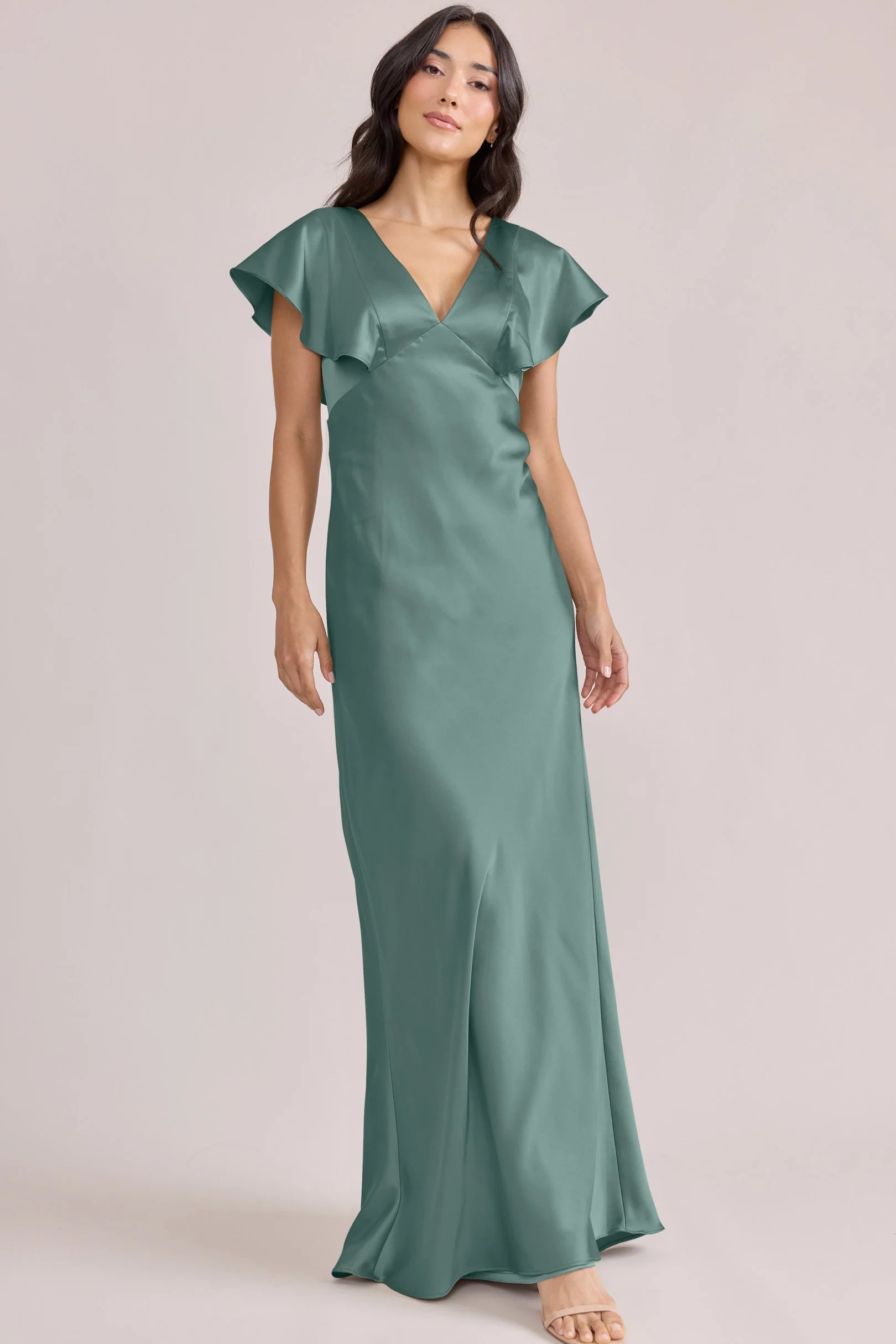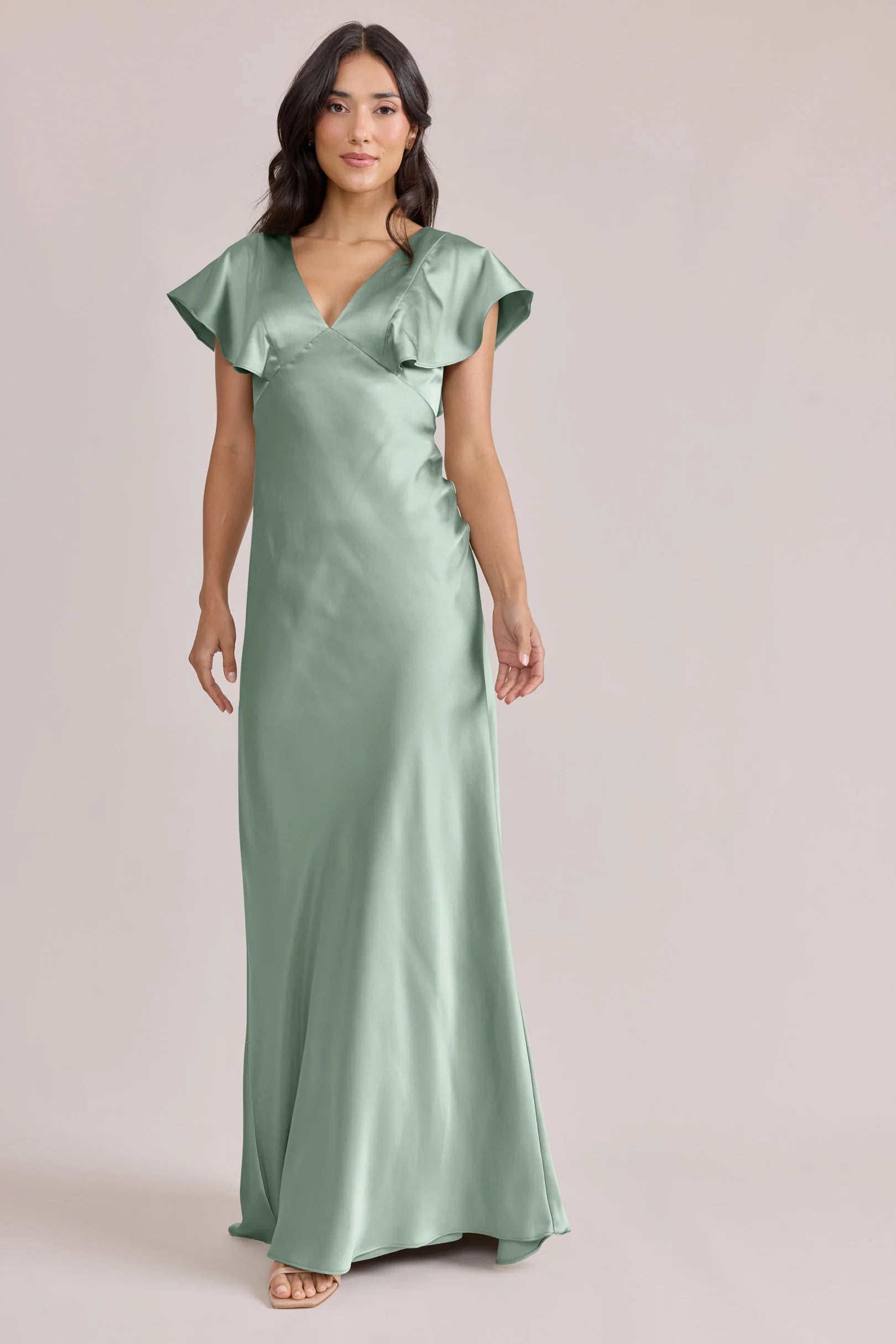 Effortlessly elegant, the Ellapink Satin Dress is a modern take on timeless romance. Designed with a sleek column silhouette and flattering empire waistline, Eden features a soft V-neckline and flutter sleeves that cascade from delicate princess seams. Built-in bra cups offer subtle support, while the back zipper ensures a smooth, tailored fit.