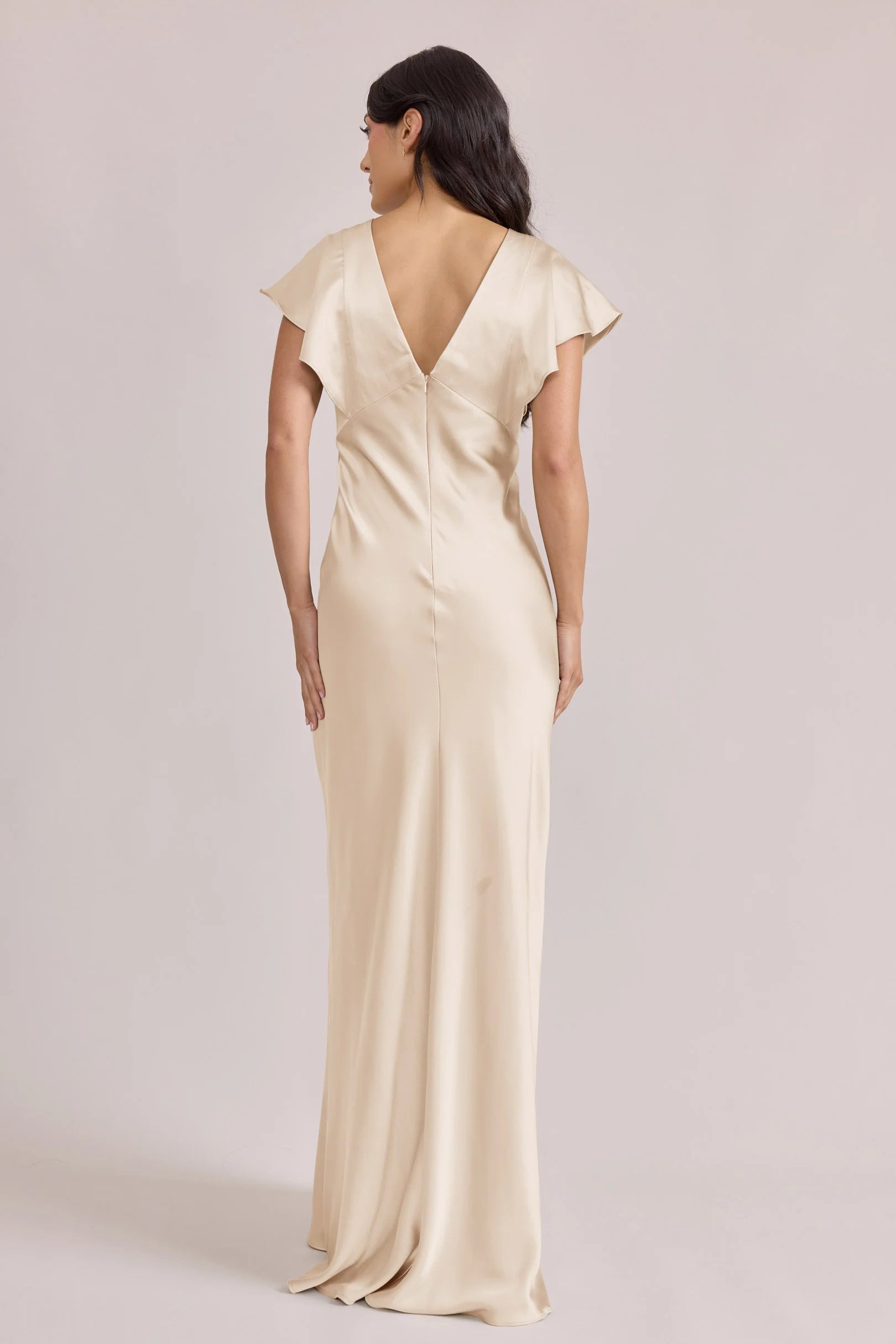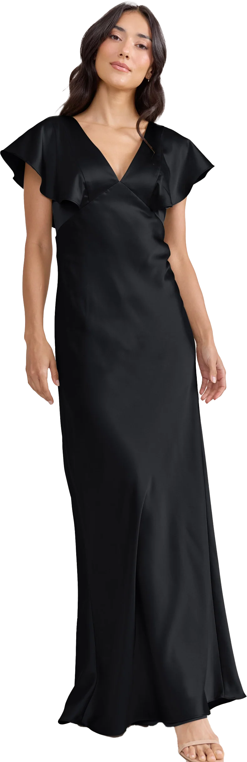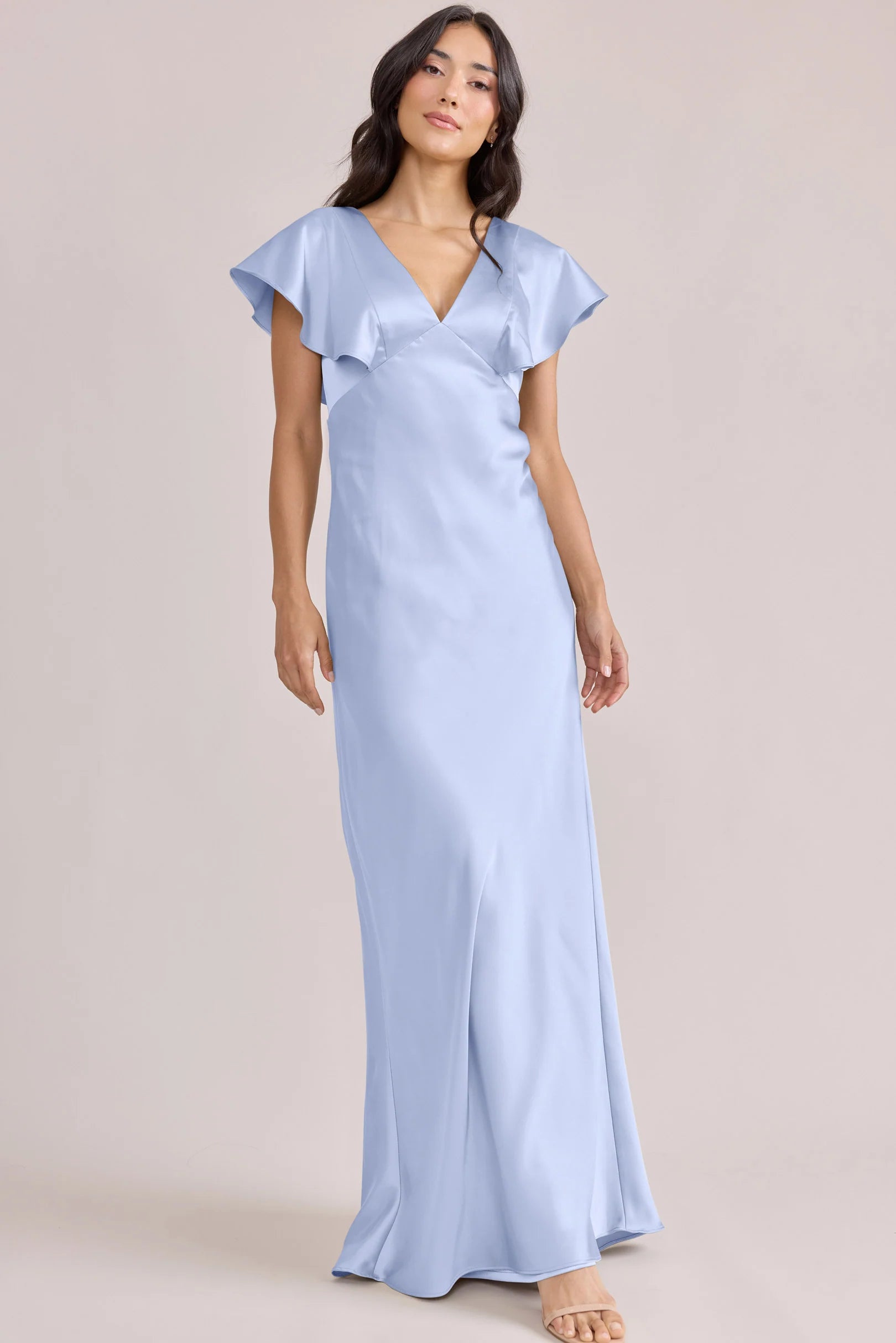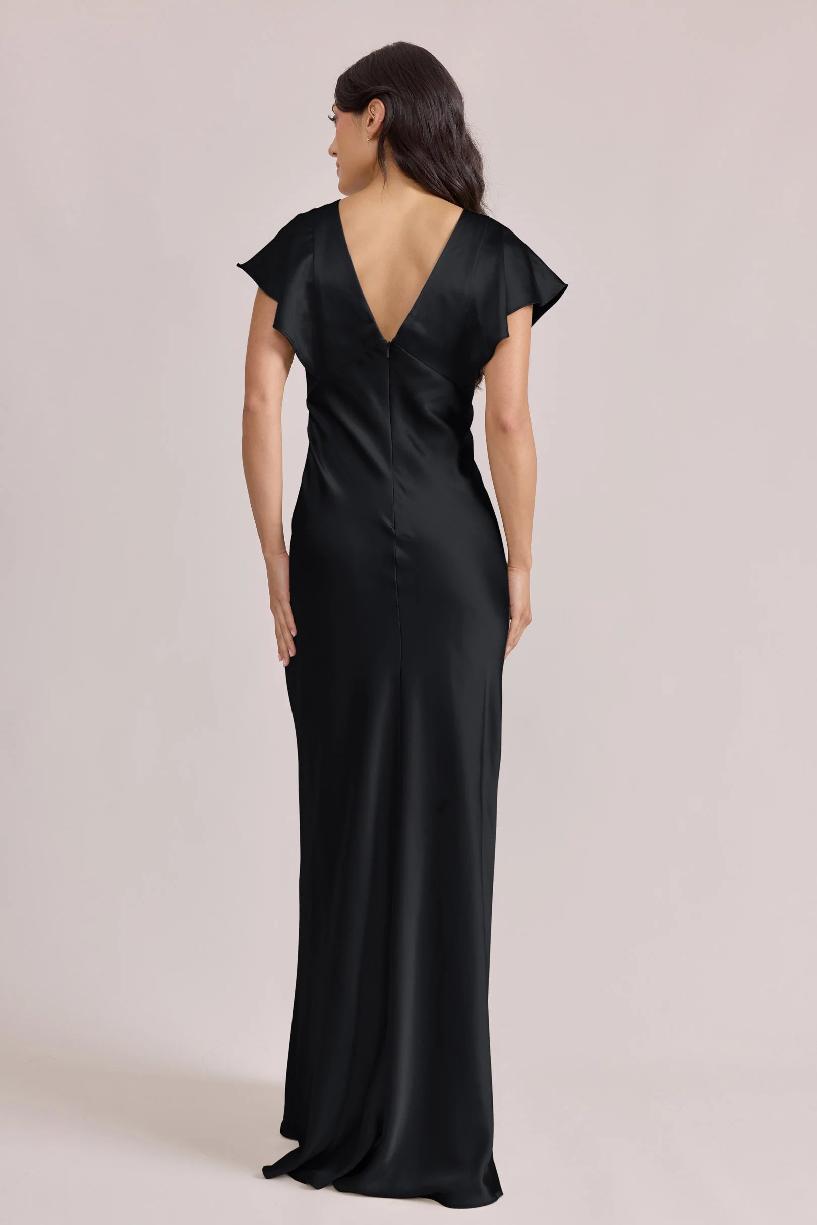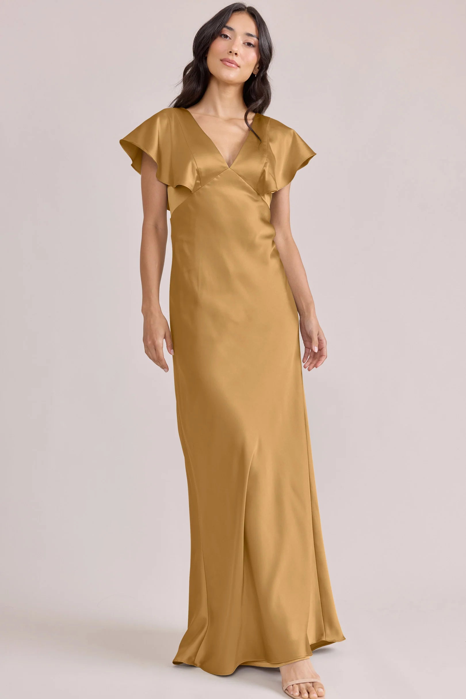 Effortlessly elegant, the Ellapink Satin Dress is a modern take on timeless romance. Designed with a sleek column silhouette and flattering empire waistline, Eden features a soft V-neckline and flutter sleeves that cascade from delicate princess seams. Built-in bra cups offer subtle support, while the back zipper ensures a smooth, tailored fit.