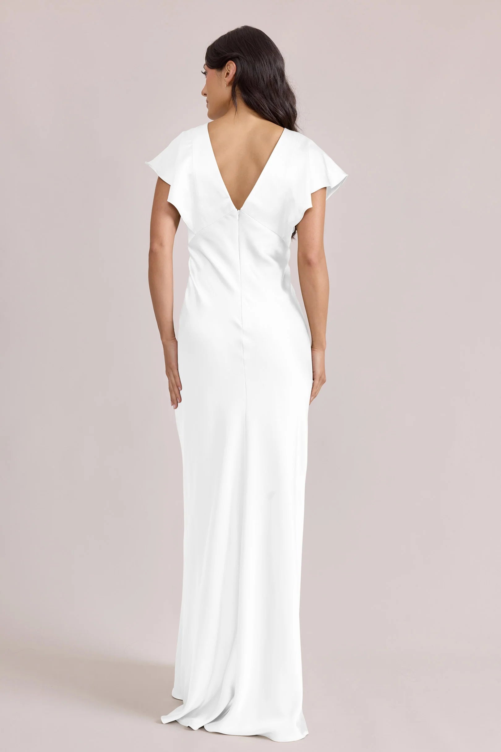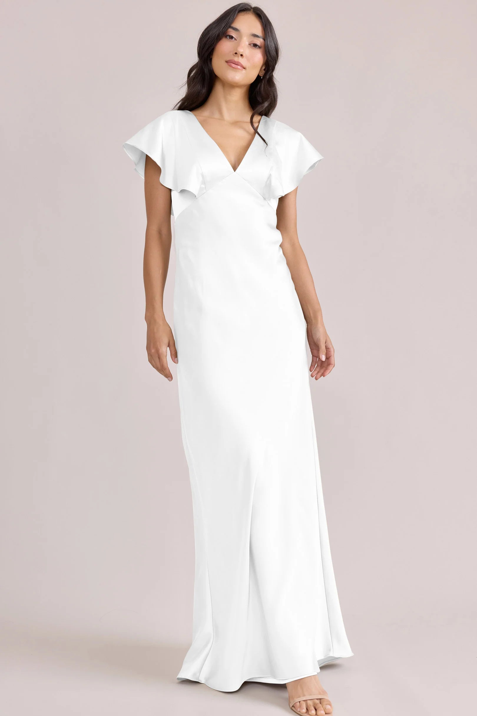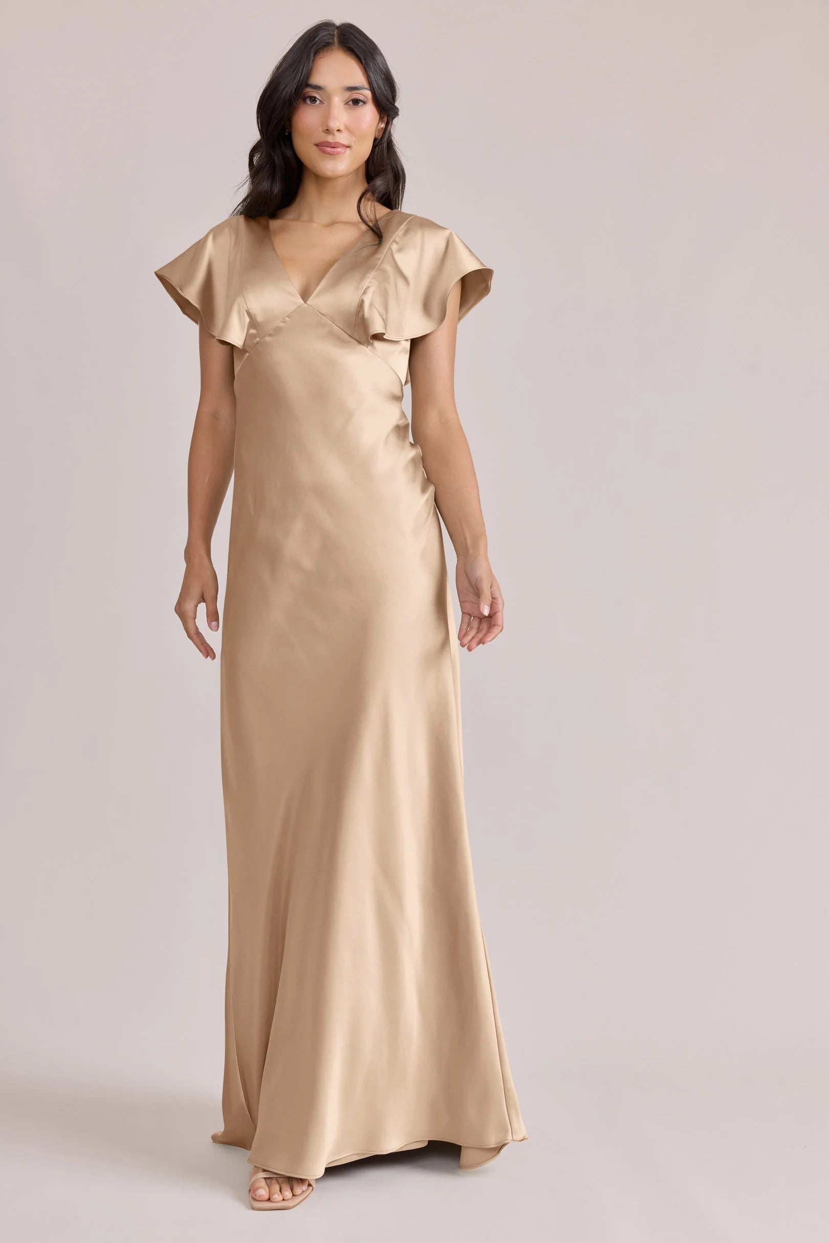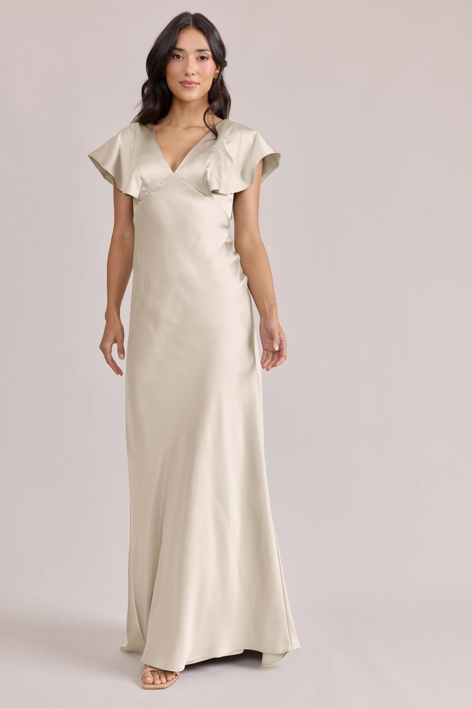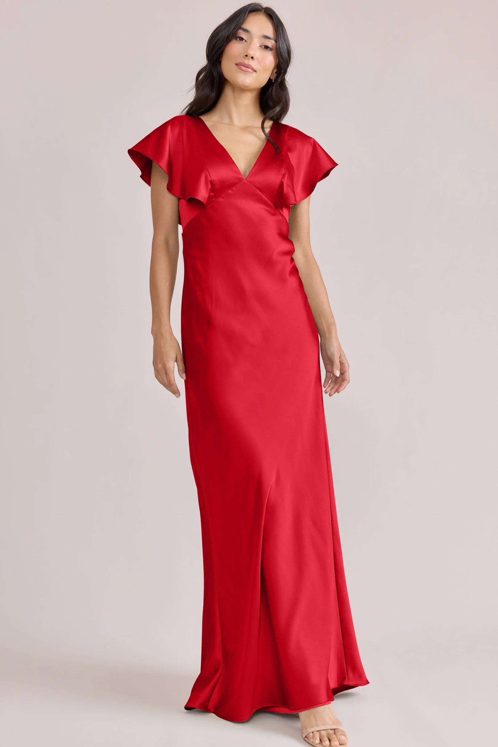 Effortlessly elegant, the Ellapink Satin Dress is a modern take on timeless romance. Designed with a sleek column silhouette and flattering empire waistline, Eden features a soft V-neckline and flutter sleeves that cascade from delicate princess seams. Built-in bra cups offer subtle support, while the back zipper ensures a smooth, tailored fit.