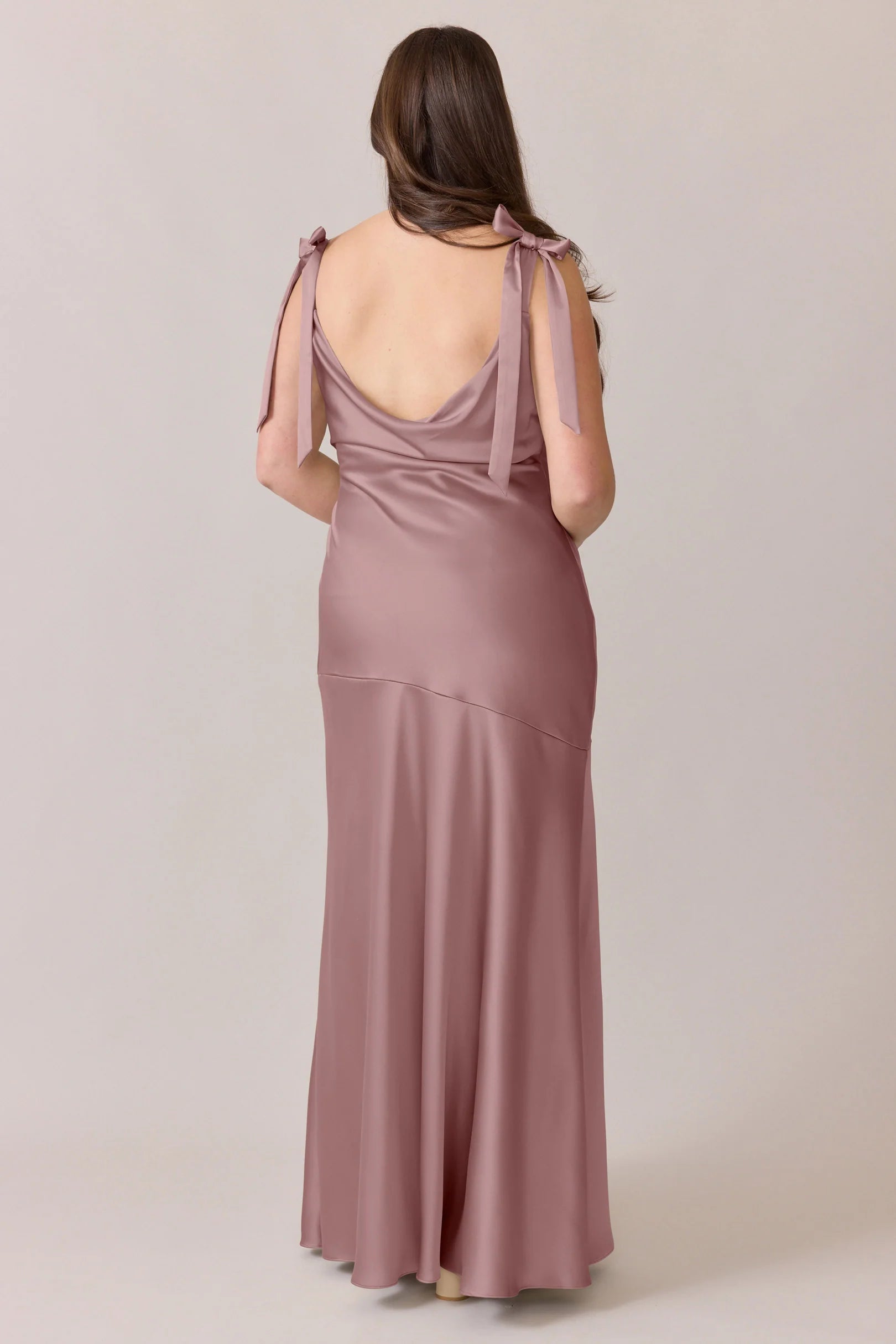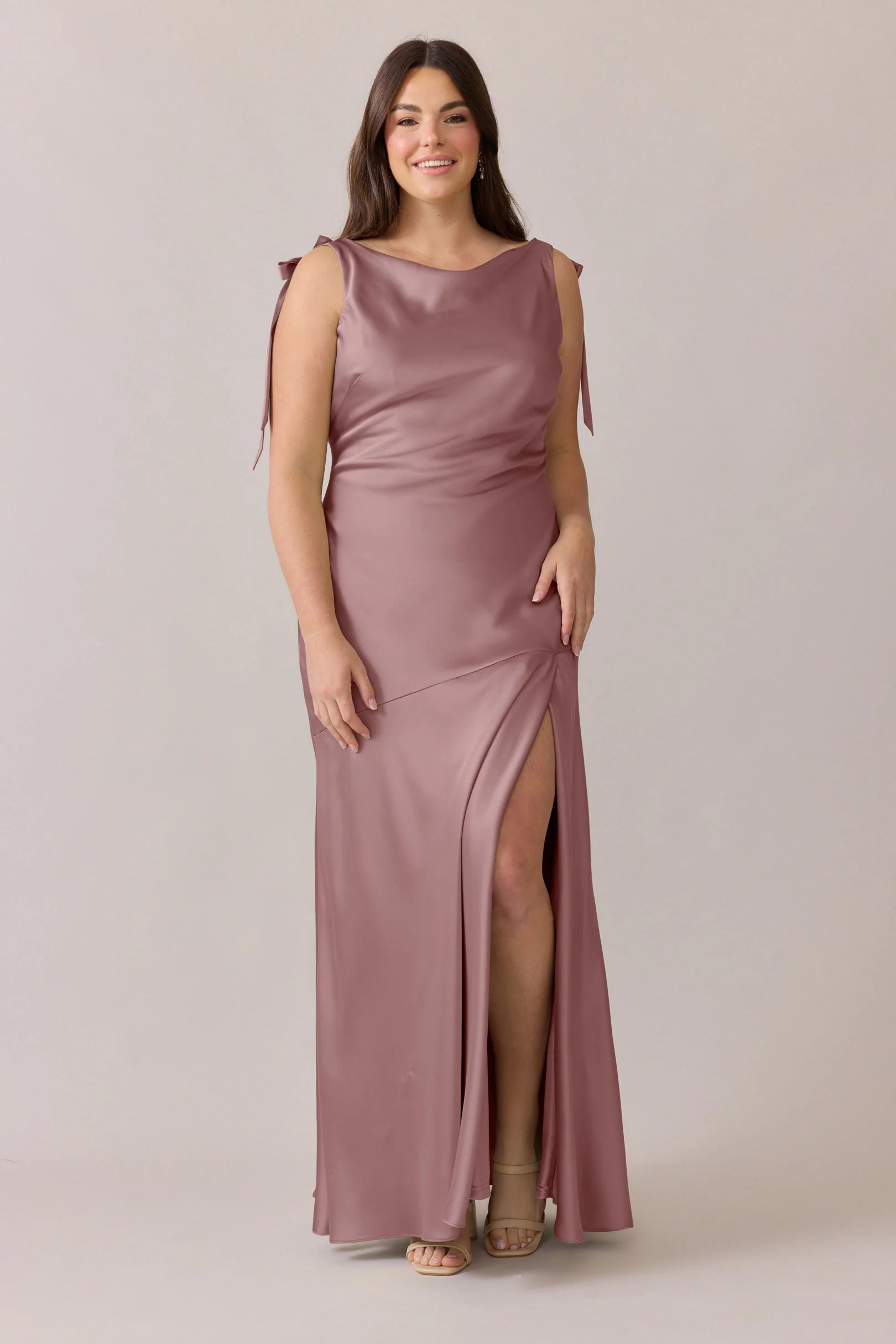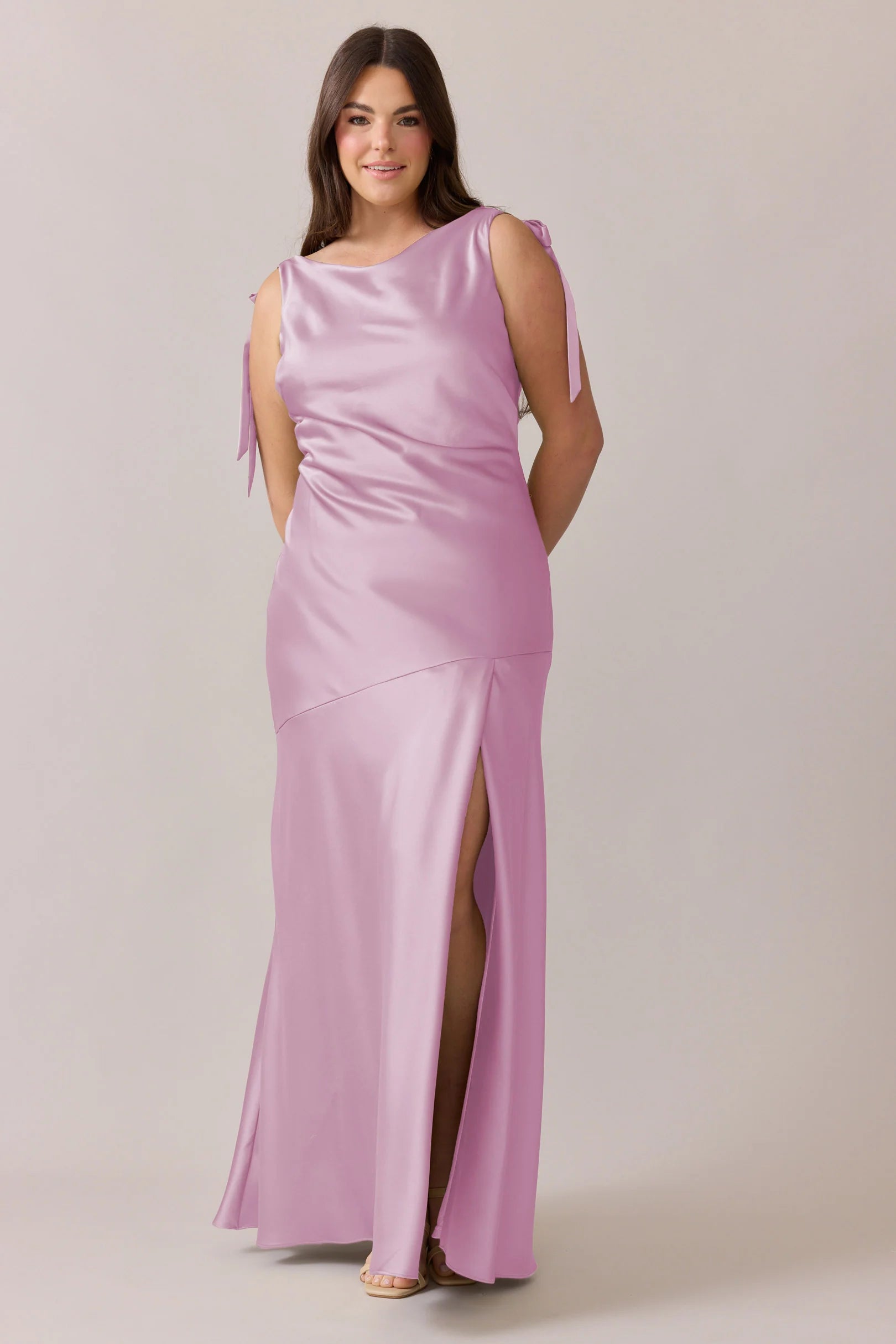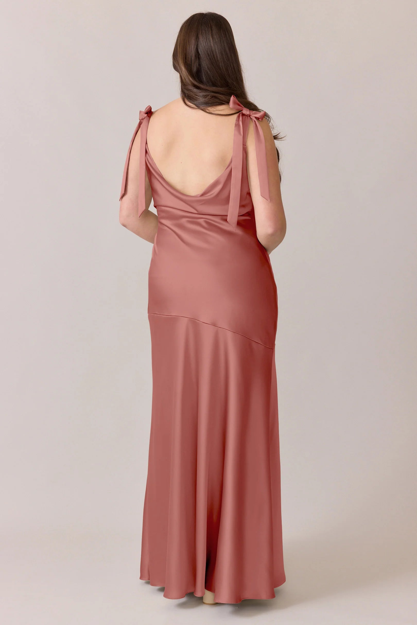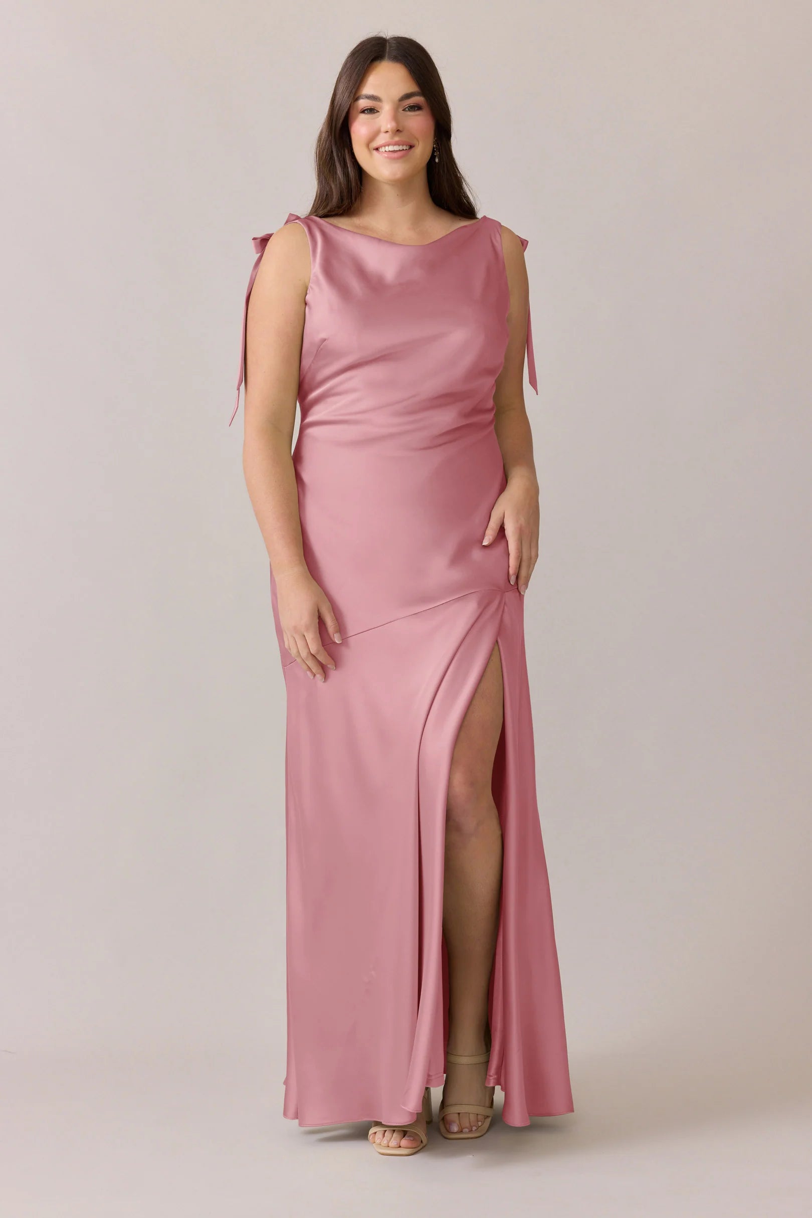 Chic and effortless, the Ellapink Satin Dress is a modern take on the classic slip silhouette. Featuring a subtle high-neck cowl neckline and delicate pre-tied bow straps, this dress floats over the body with no defined waistline for a sleek, elongating look. The asymmetrical skirt break and front slit add a touch of drama, while built-in bra cups and full-length lining ensure comfort and support. Finished with a hidden side zip for easy wear, Aaliyah is understated elegance made for the aisle and beyond.