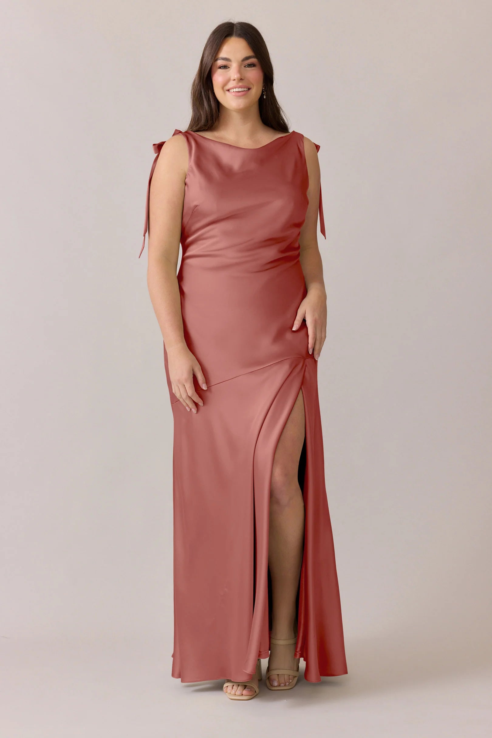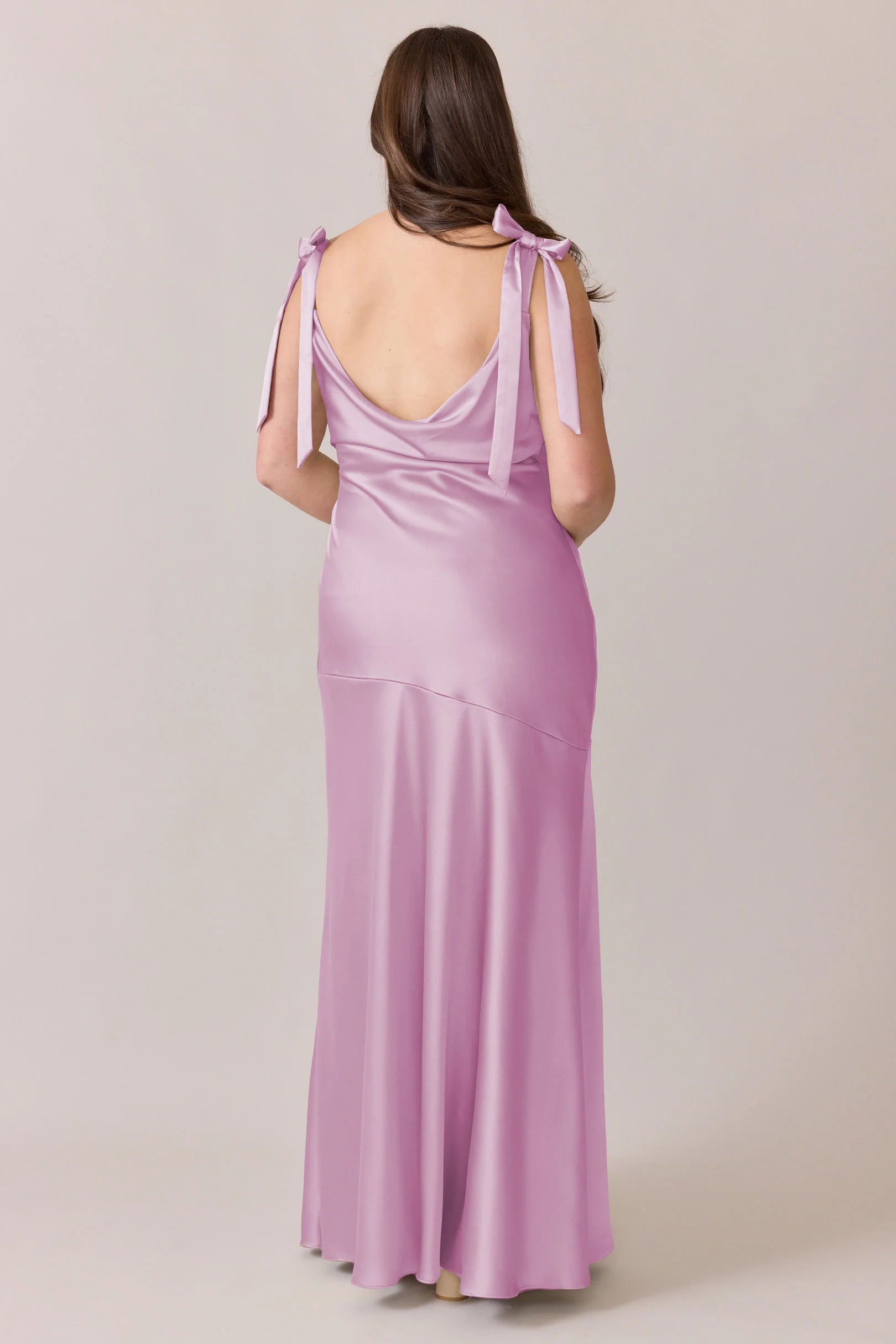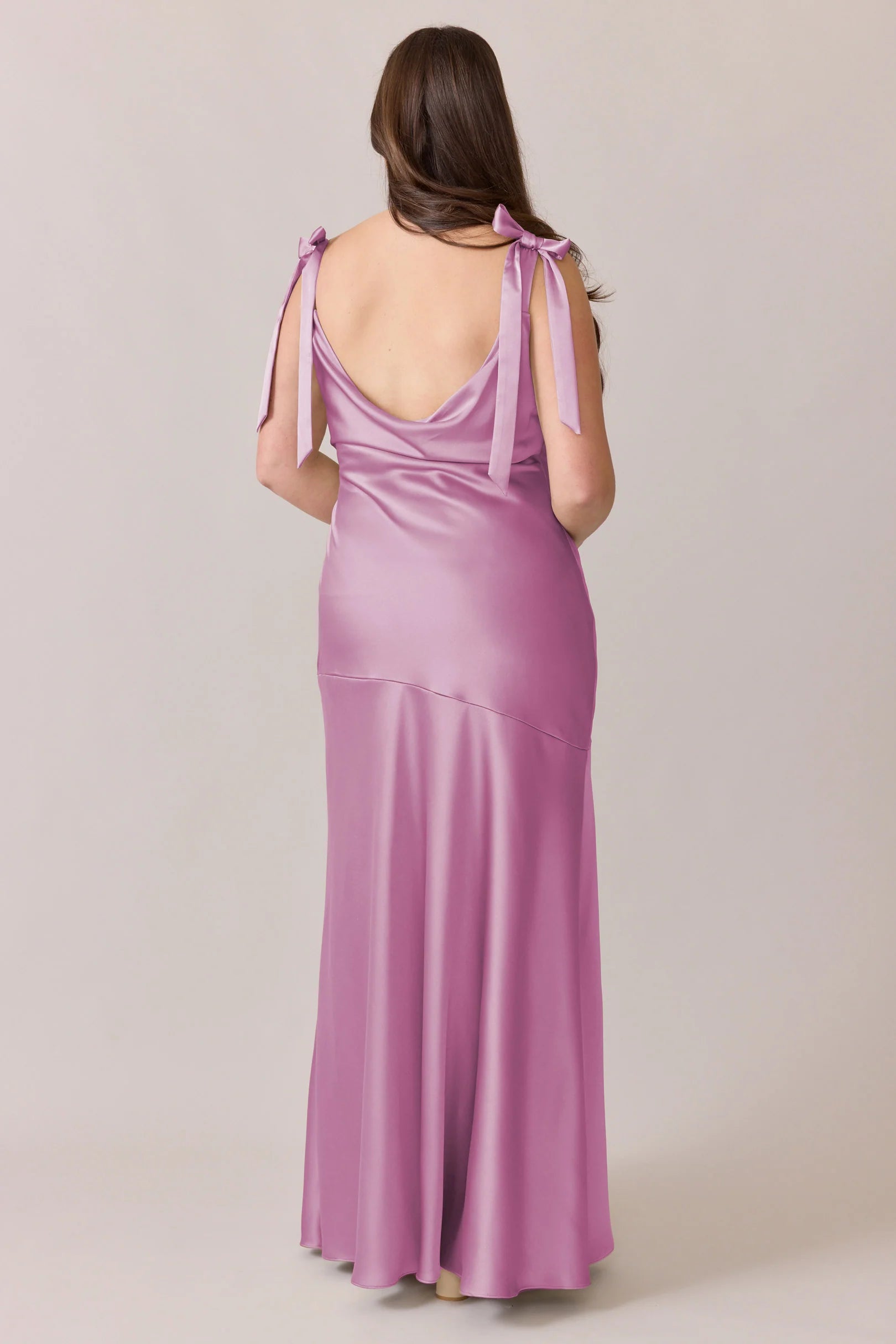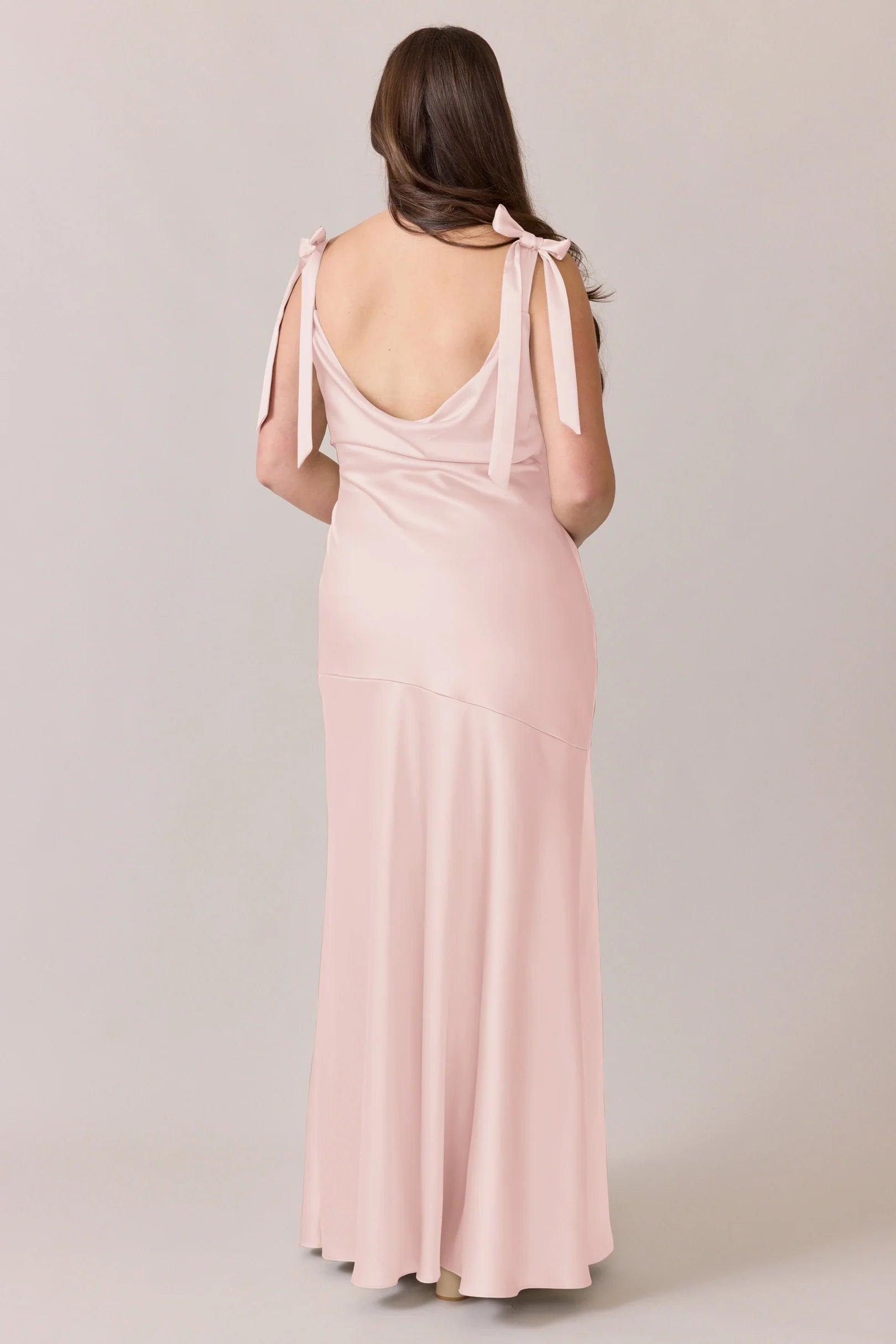 Chic and effortless, the Ellapink Satin Dress is a modern take on the classic slip silhouette. Featuring a subtle high-neck cowl neckline and delicate pre-tied bow straps, this dress floats over the body with no defined waistline for a sleek, elongating look. The asymmetrical skirt break and front slit add a touch of drama, while built-in bra cups and full-length lining ensure comfort and support. Finished with a hidden side zip for easy wear, Aaliyah is understated elegance made for the aisle and beyond.