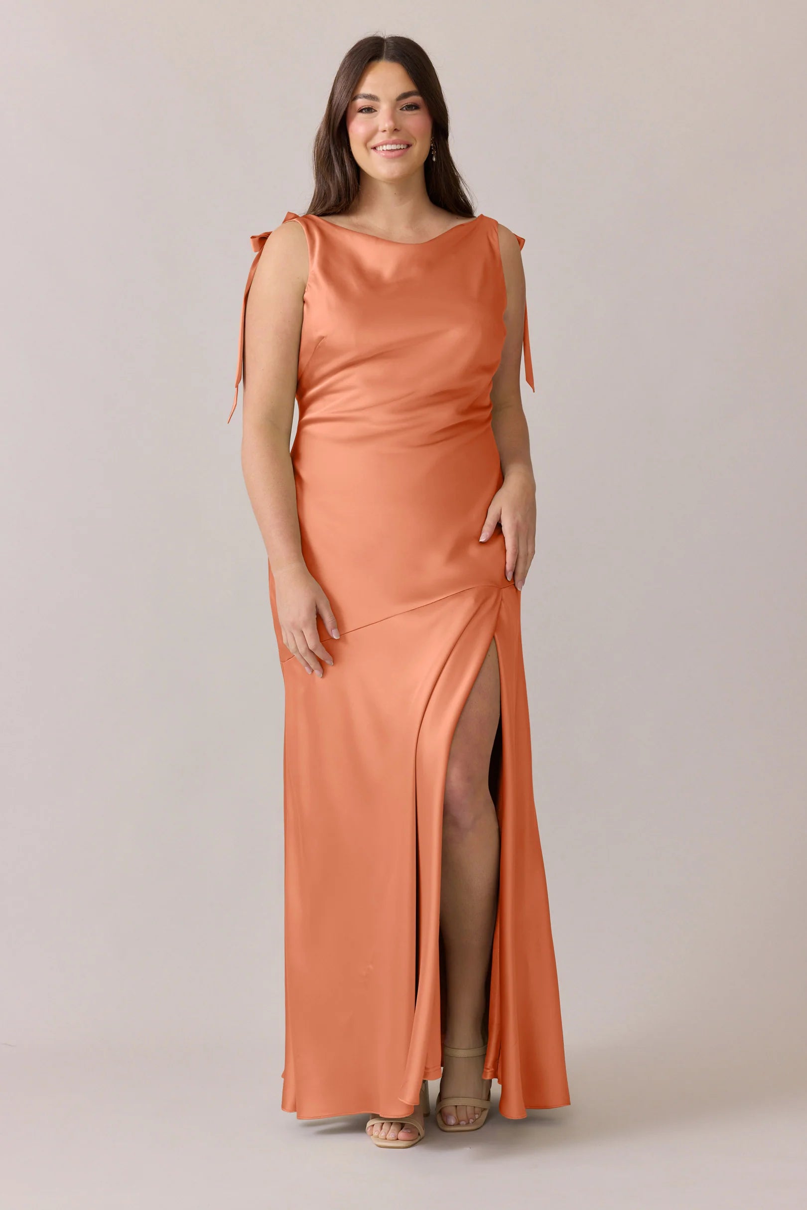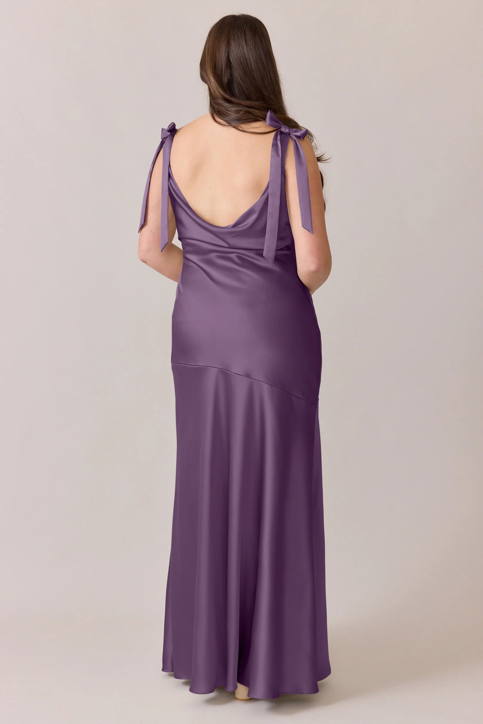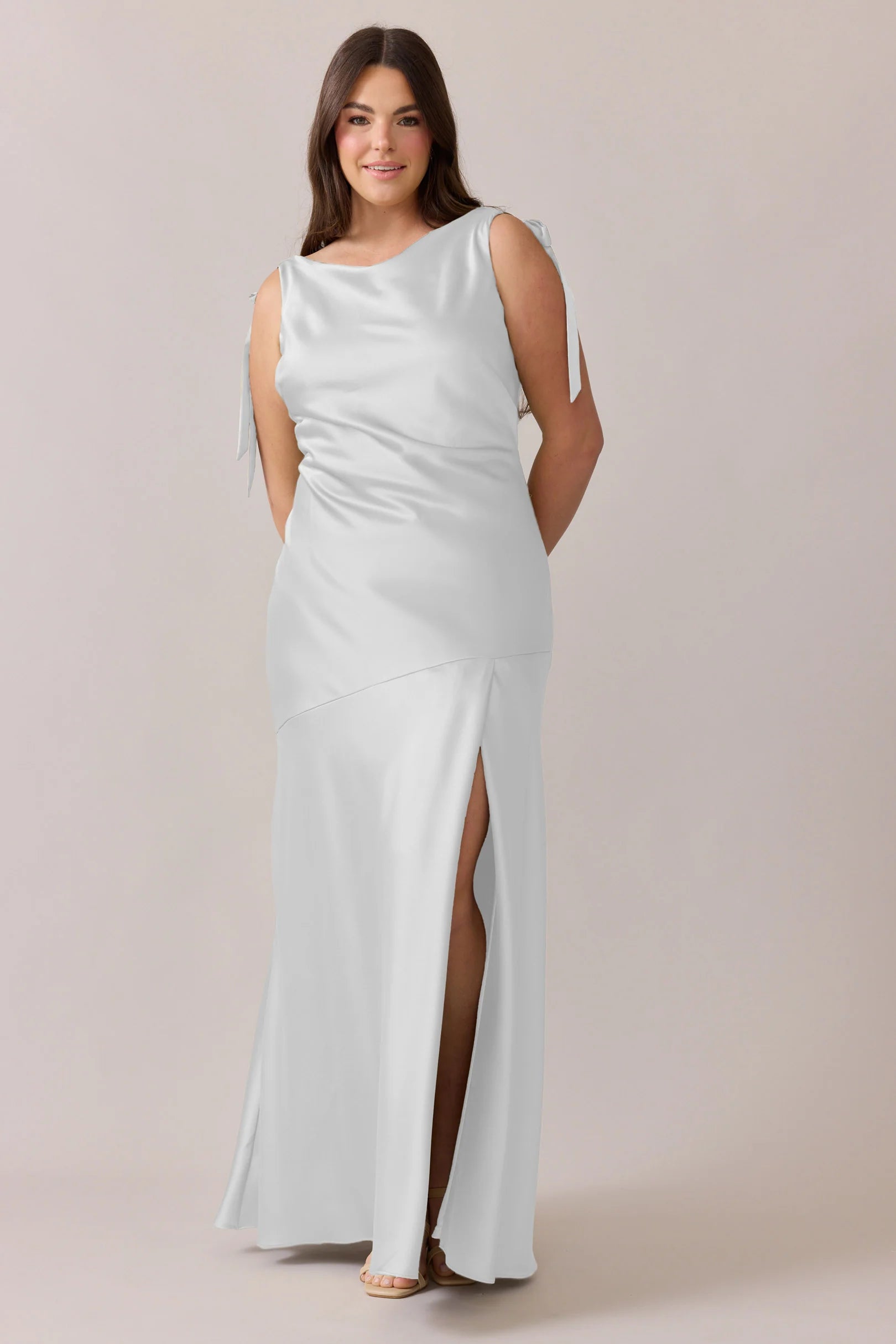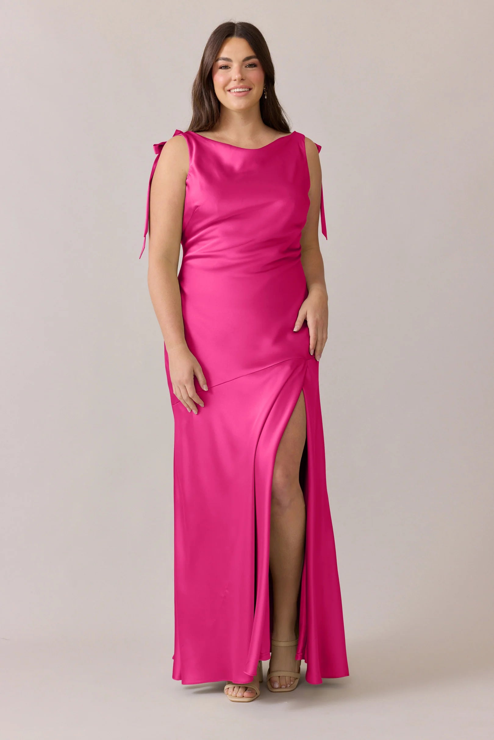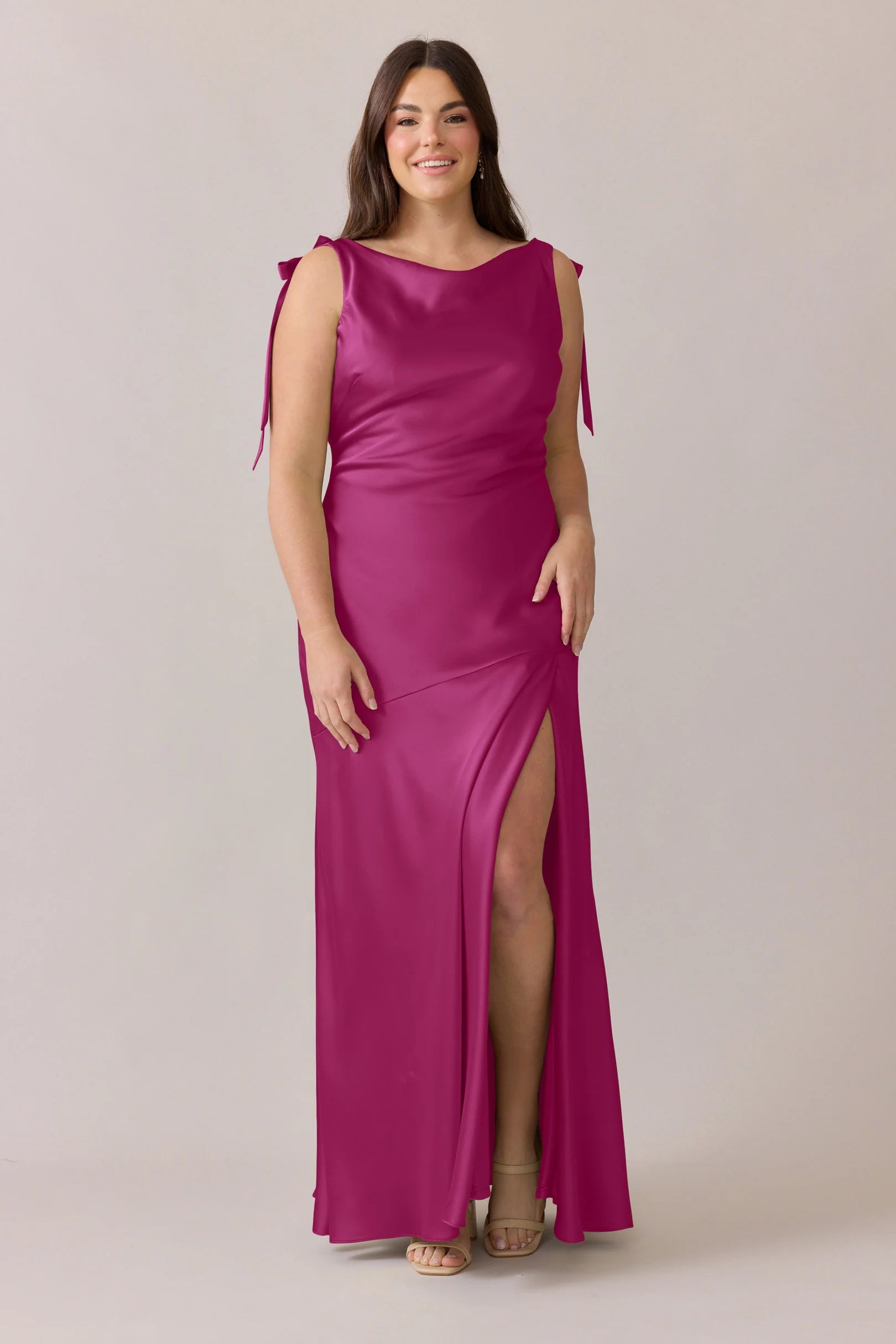 Chic and effortless, the Ellapink Satin Dress is a modern take on the classic slip silhouette. Featuring a subtle high-neck cowl neckline and delicate pre-tied bow straps, this dress floats over the body with no defined waistline for a sleek, elongating look. The asymmetrical skirt break and front slit add a touch of drama, while built-in bra cups and full-length lining ensure comfort and support. Finished with a hidden side zip for easy wear, Aaliyah is understated elegance made for the aisle and beyond.