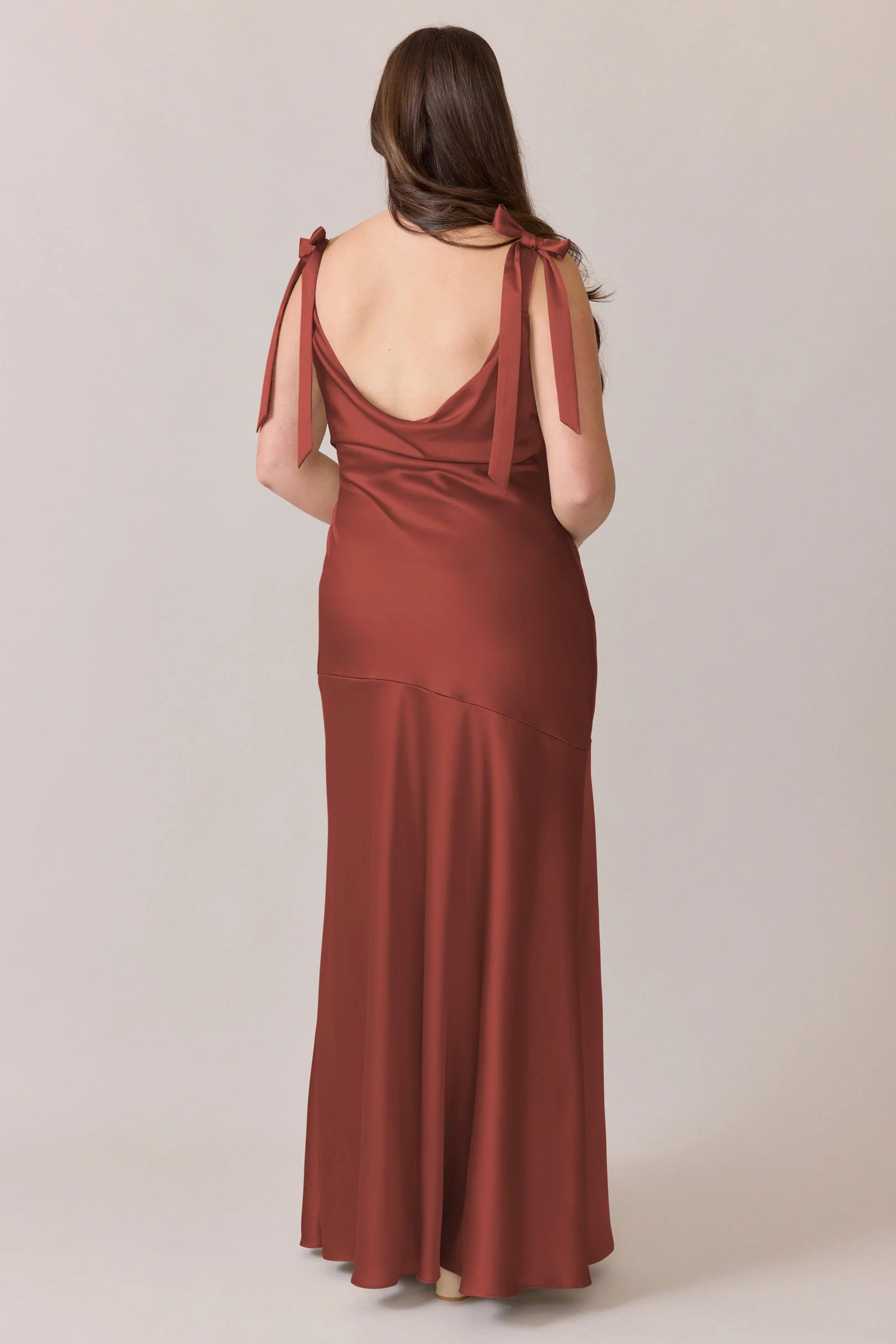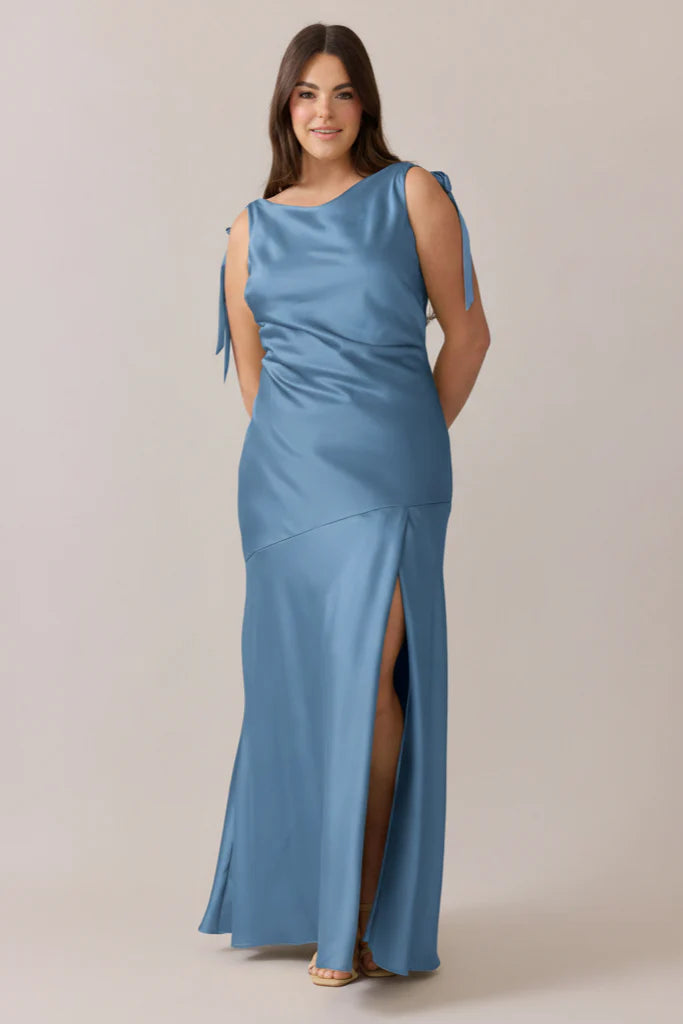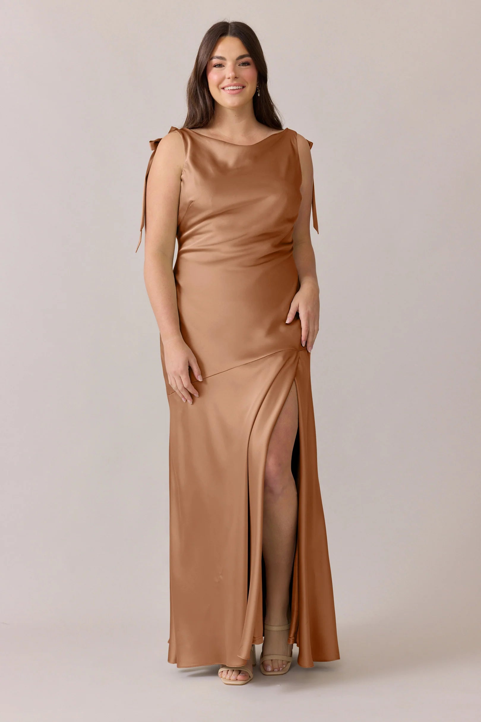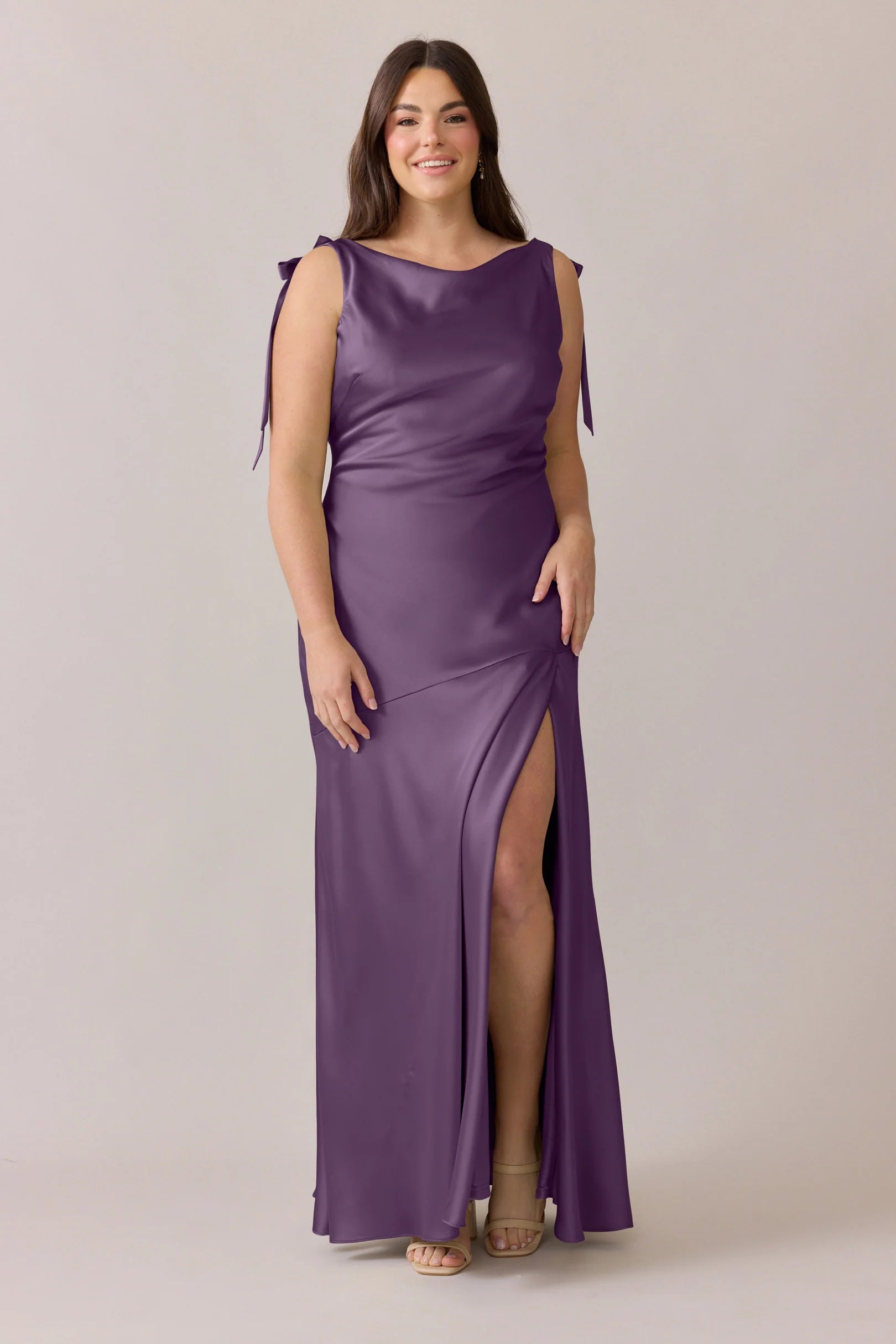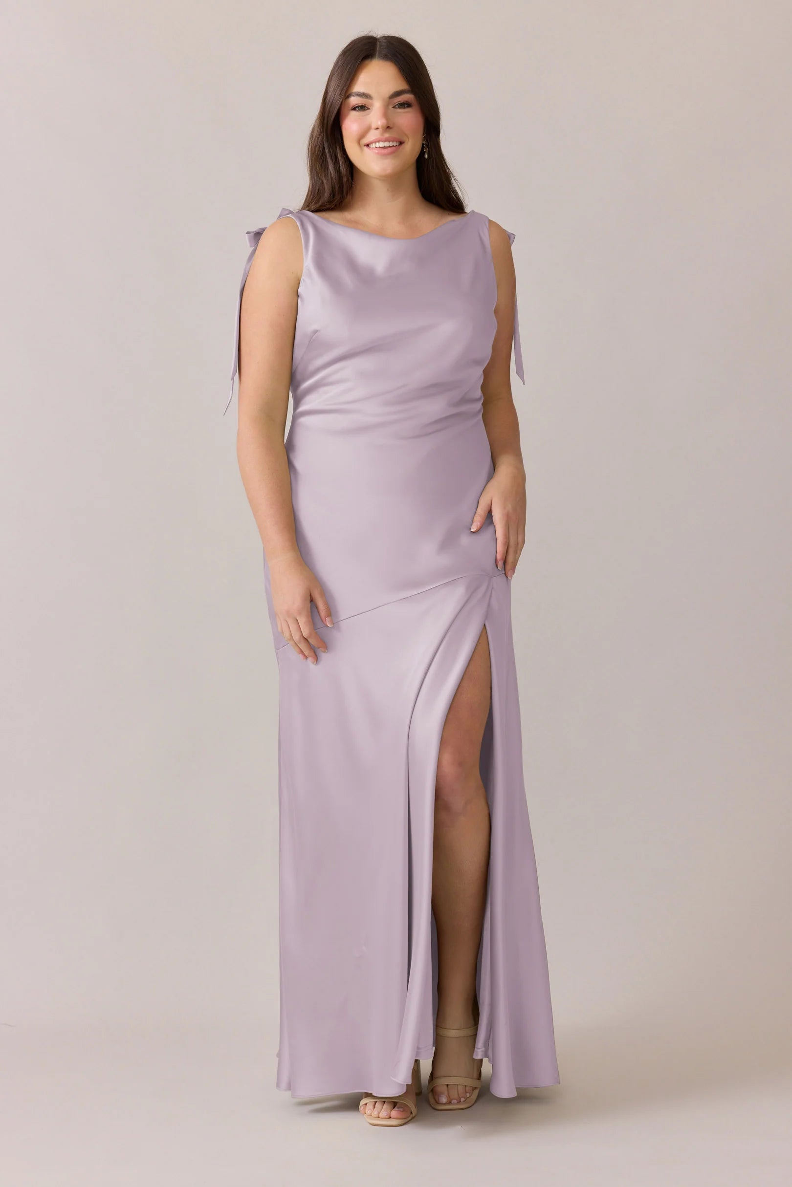 Chic and effortless, the Ellapink Satin Dress is a modern take on the classic slip silhouette. Featuring a subtle high-neck cowl neckline and delicate pre-tied bow straps, this dress floats over the body with no defined waistline for a sleek, elongating look. The asymmetrical skirt break and front slit add a touch of drama, while built-in bra cups and full-length lining ensure comfort and support. Finished with a hidden side zip for easy wear, Aaliyah is understated elegance made for the aisle and beyond.
