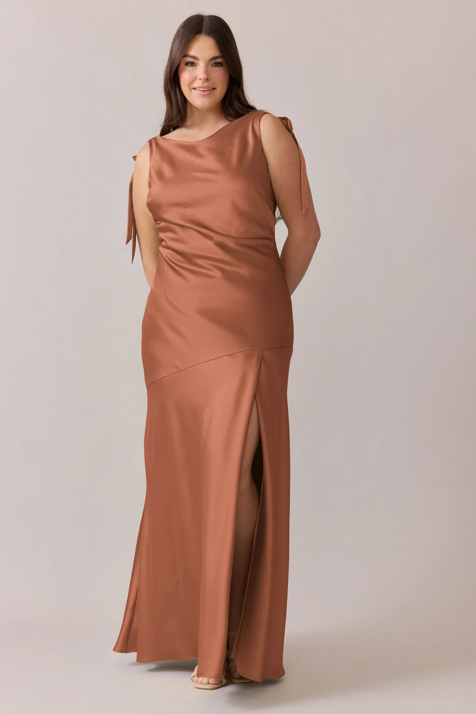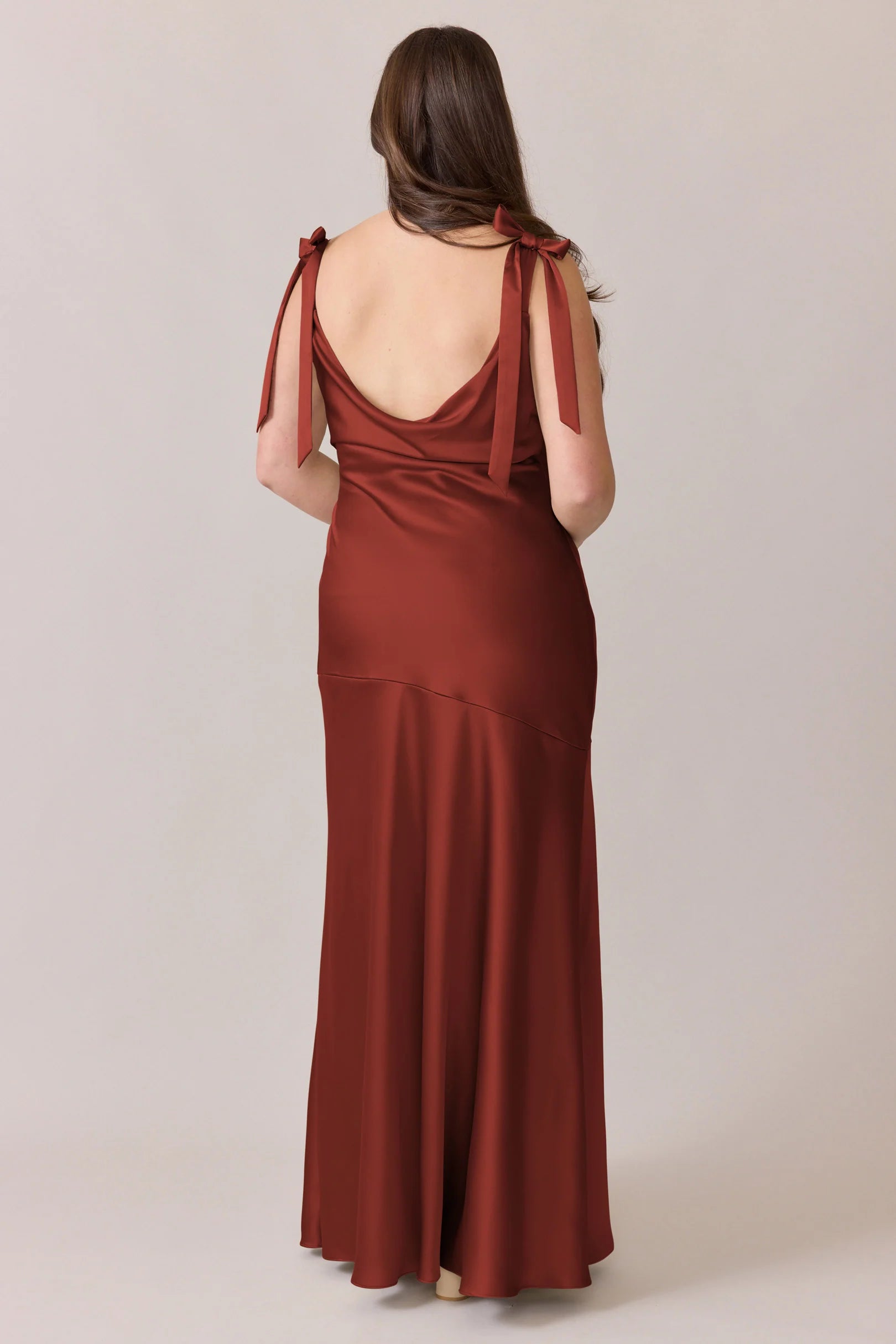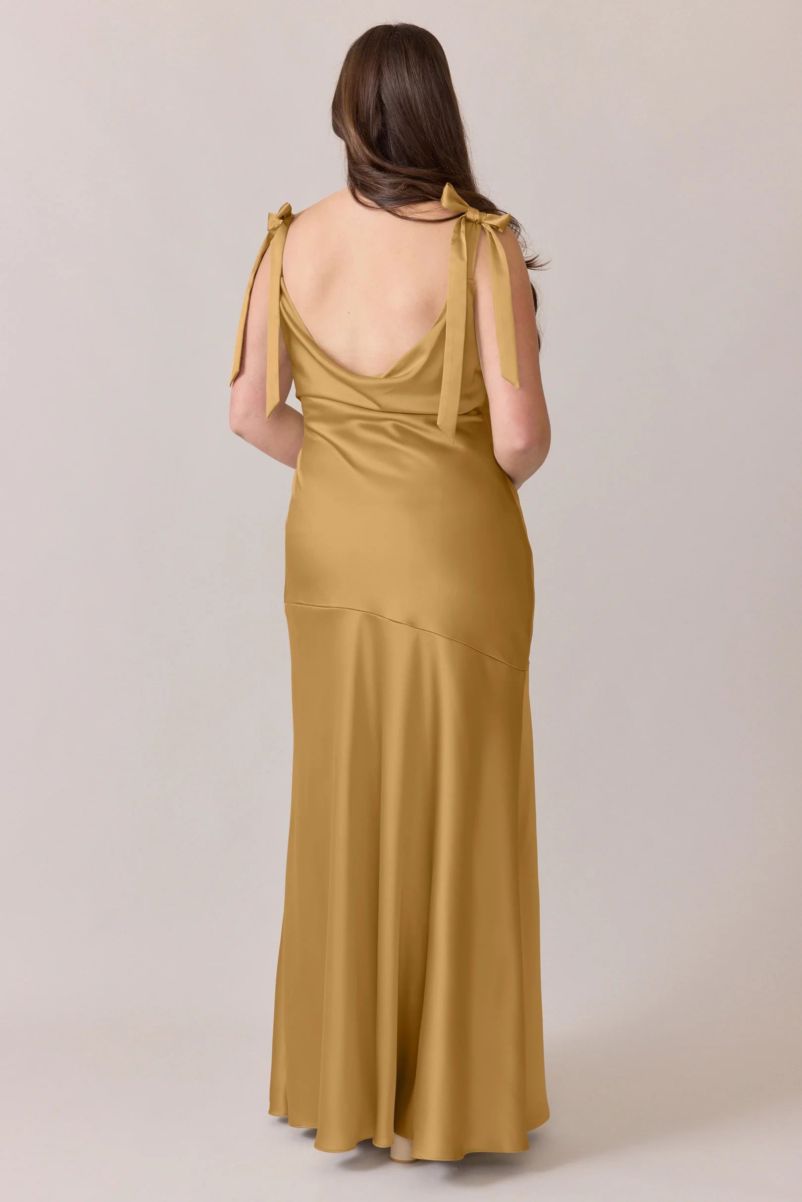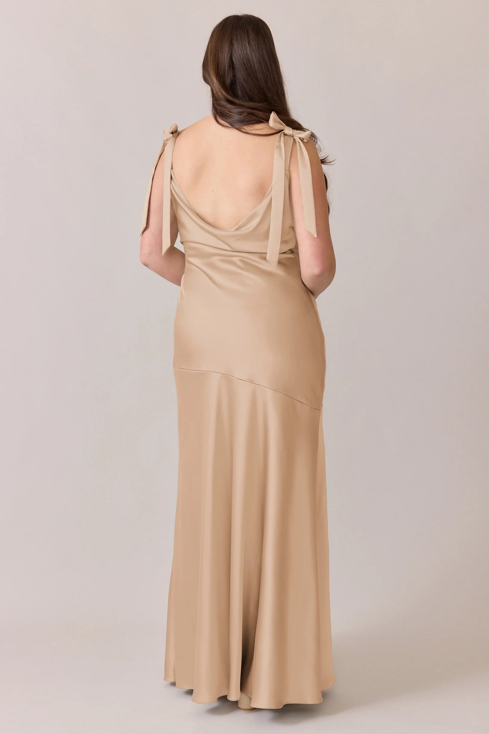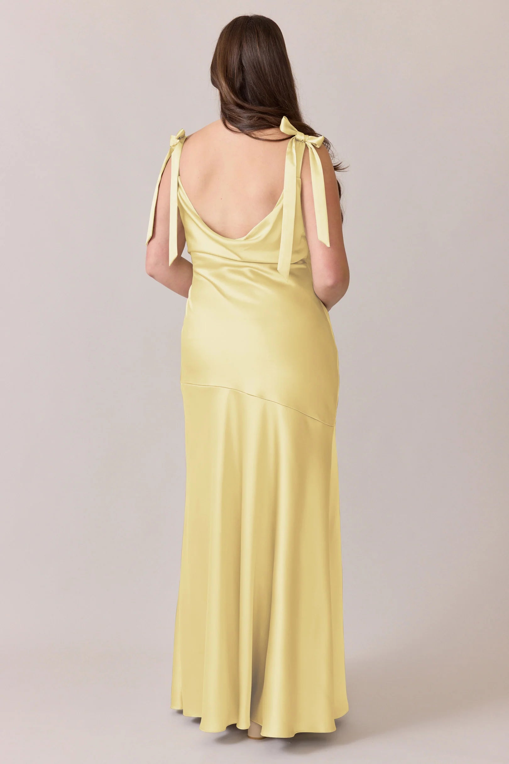 Chic and effortless, the Ellapink Satin Dress is a modern take on the classic slip silhouette. Featuring a subtle high-neck cowl neckline and delicate pre-tied bow straps, this dress floats over the body with no defined waistline for a sleek, elongating look. The asymmetrical skirt break and front slit add a touch of drama, while built-in bra cups and full-length lining ensure comfort and support. Finished with a hidden side zip for easy wear, Aaliyah is understated elegance made for the aisle and beyond.