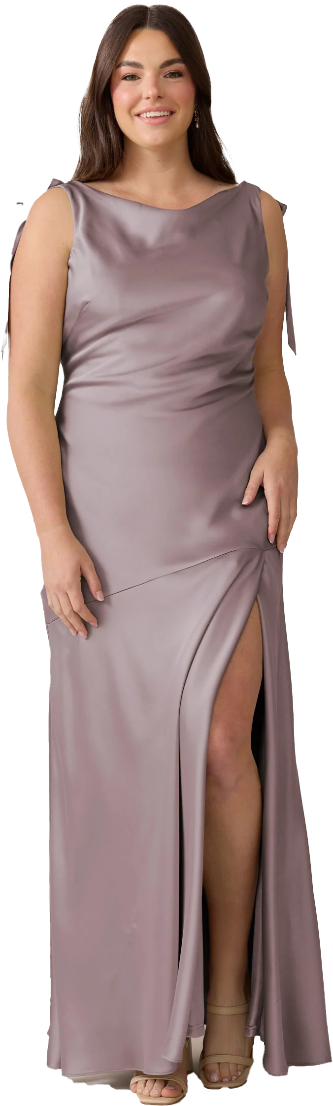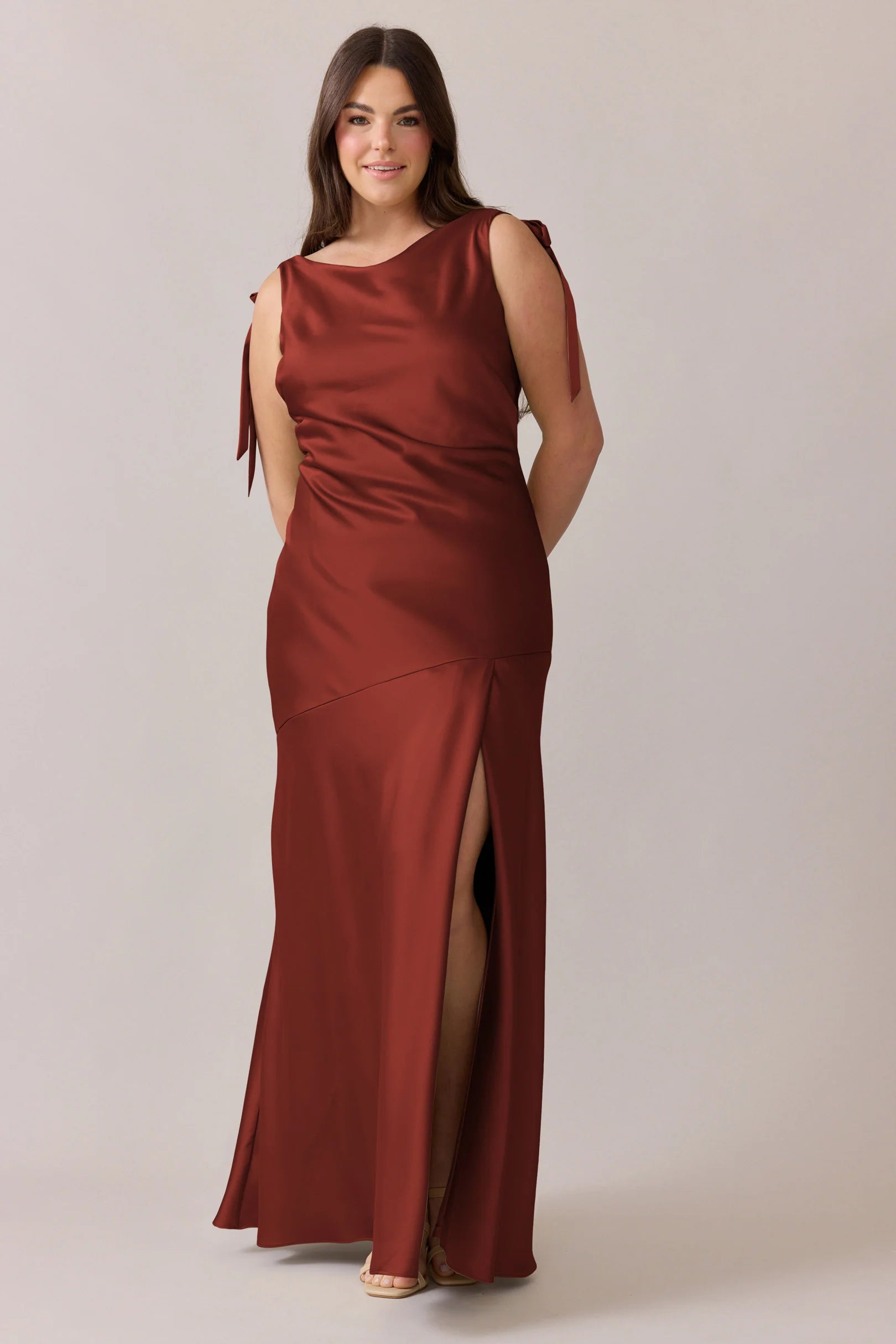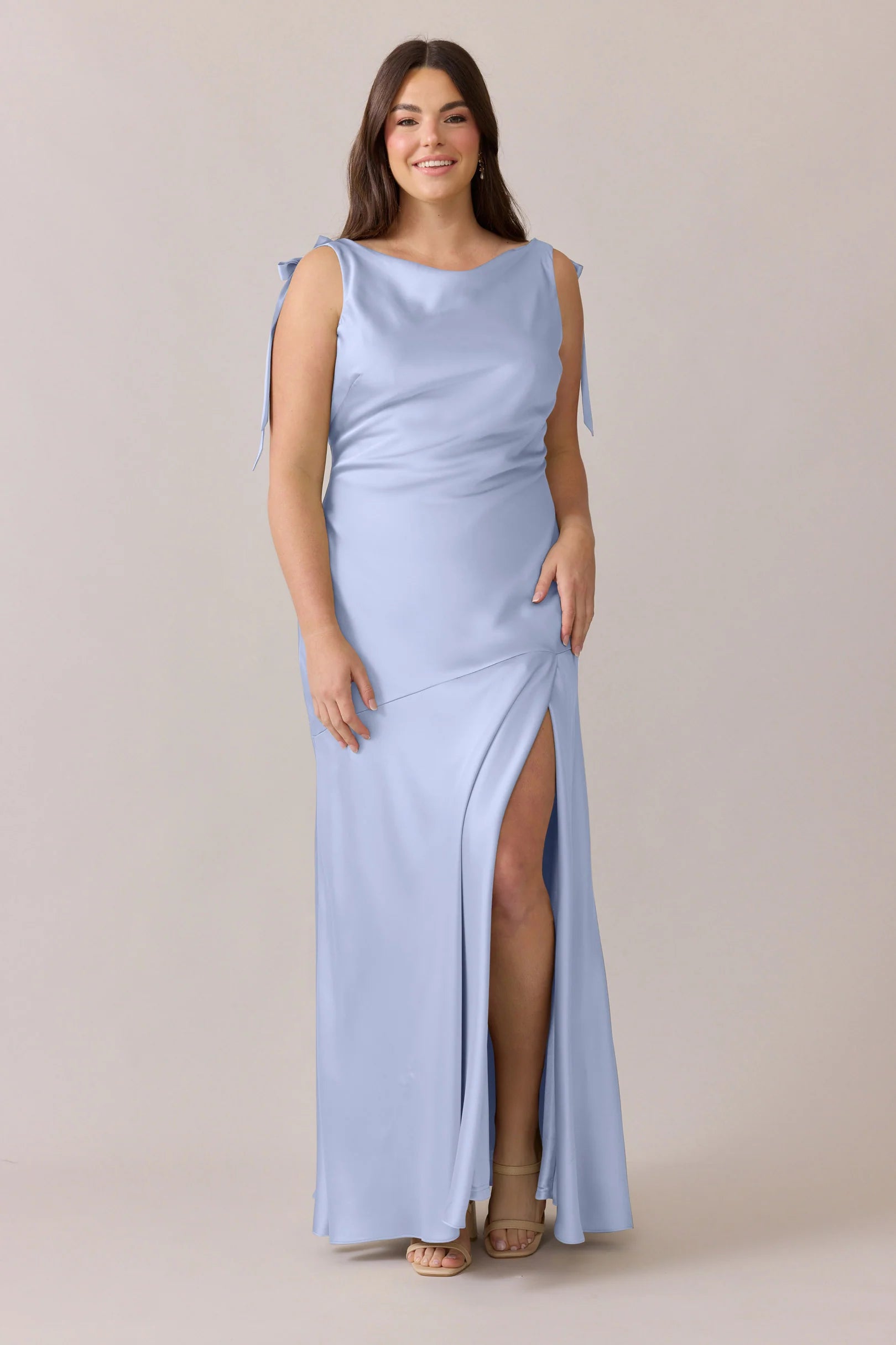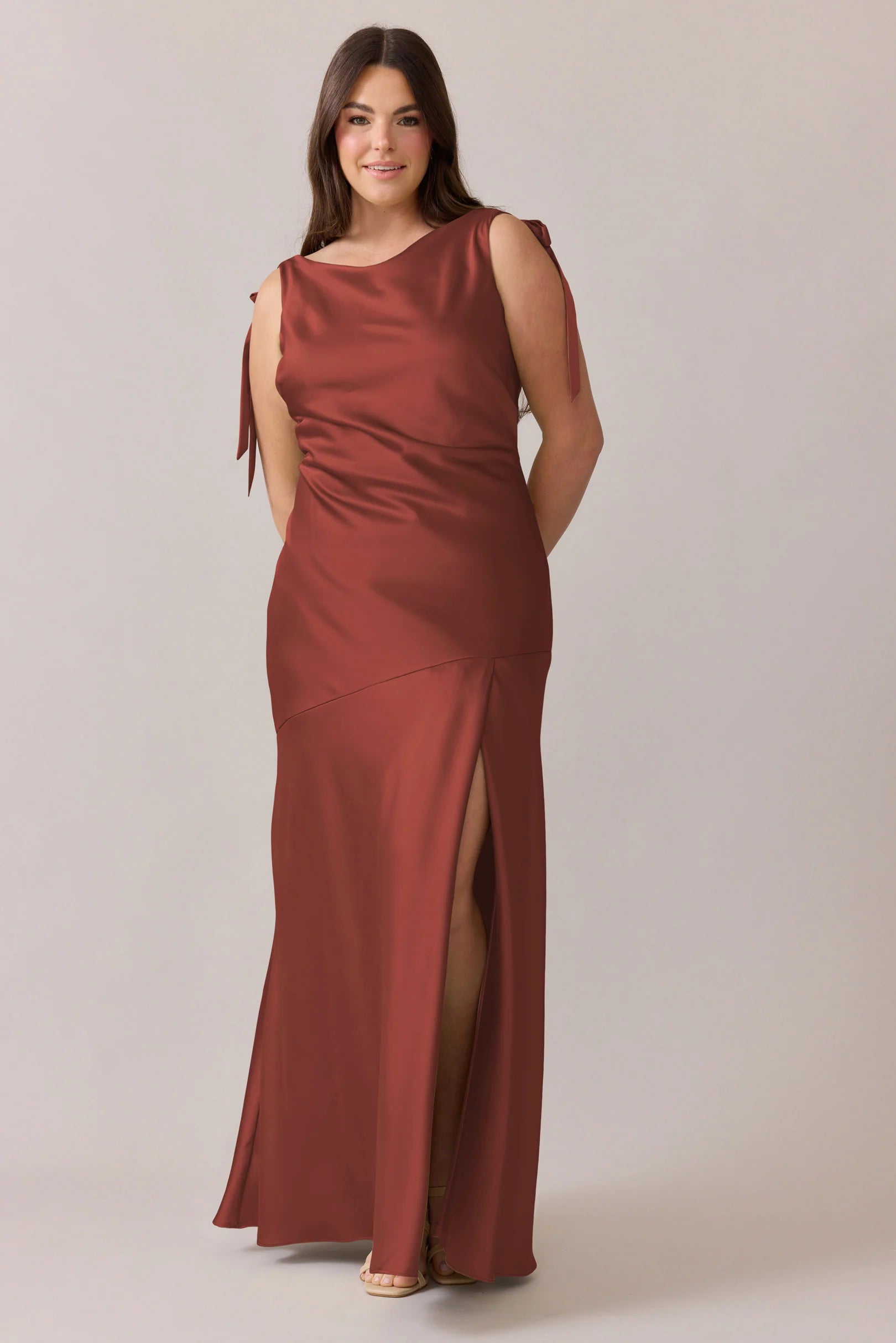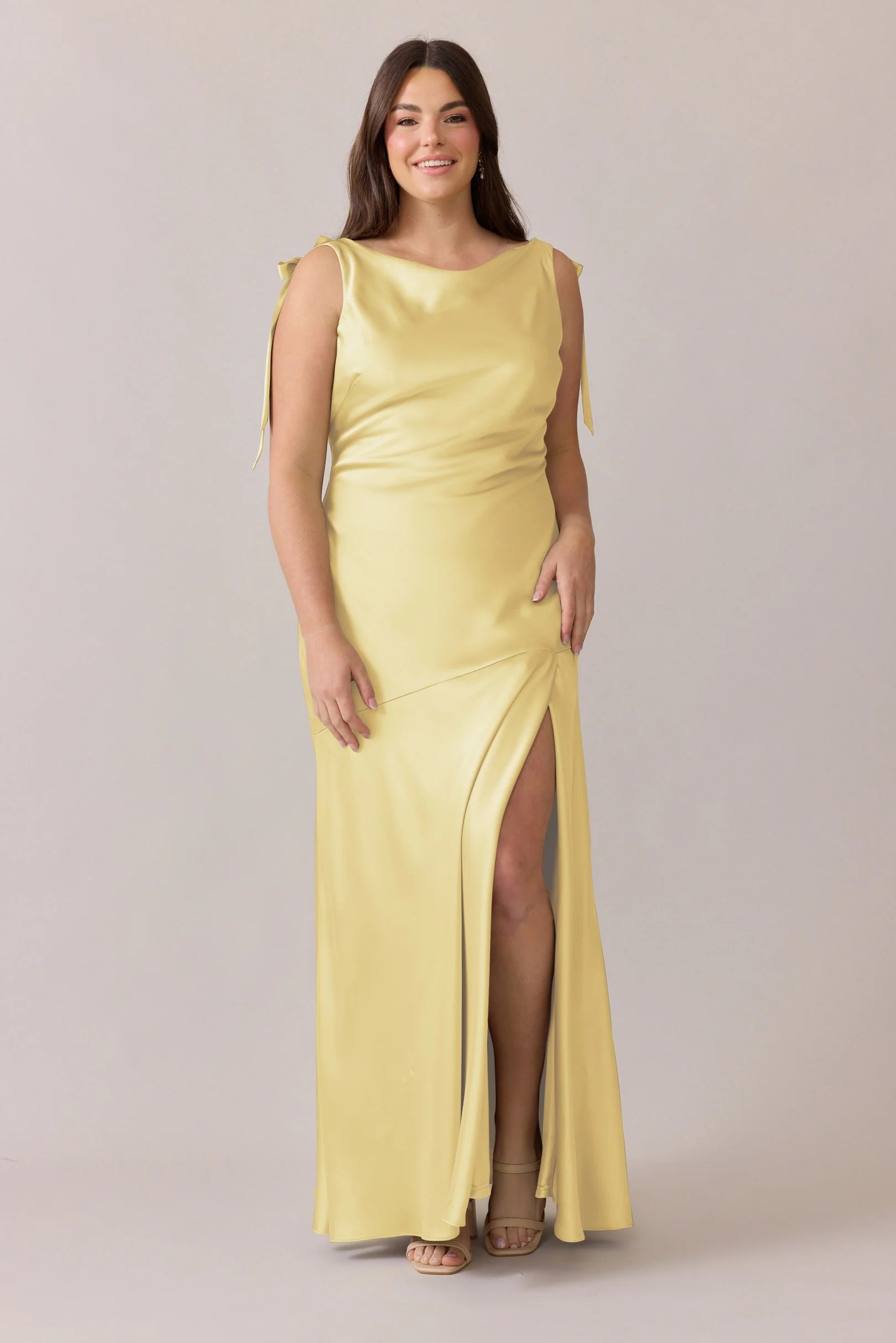 Chic and effortless, the Ellapink Satin Dress is a modern take on the classic slip silhouette. Featuring a subtle high-neck cowl neckline and delicate pre-tied bow straps, this dress floats over the body with no defined waistline for a sleek, elongating look. The asymmetrical skirt break and front slit add a touch of drama, while built-in bra cups and full-length lining ensure comfort and support. Finished with a hidden side zip for easy wear, Aaliyah is understated elegance made for the aisle and beyond.