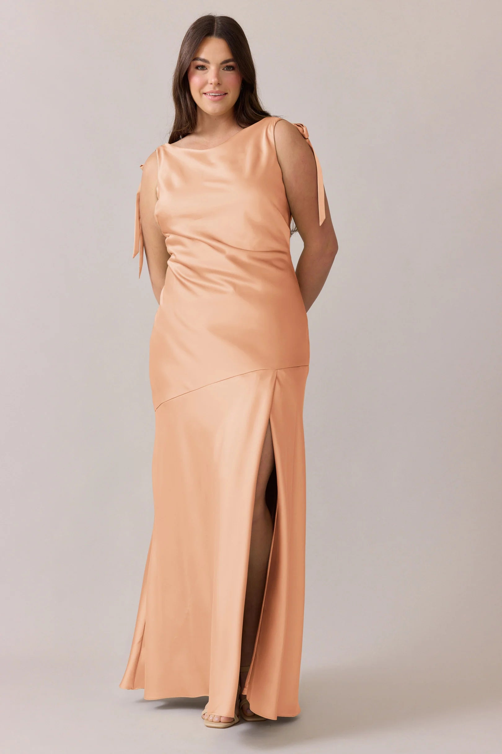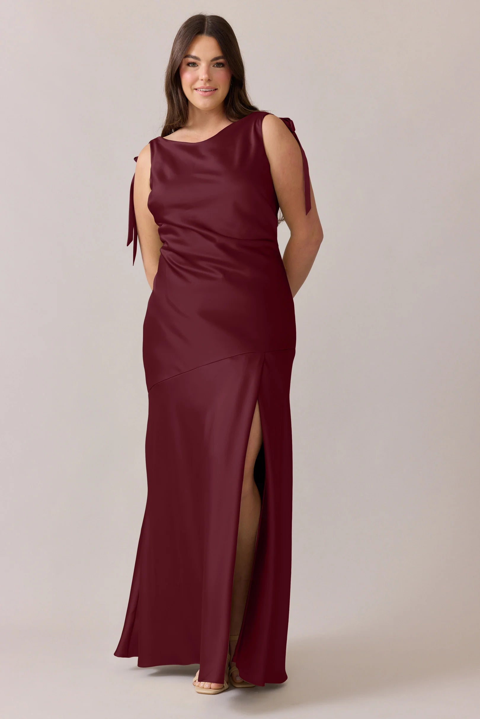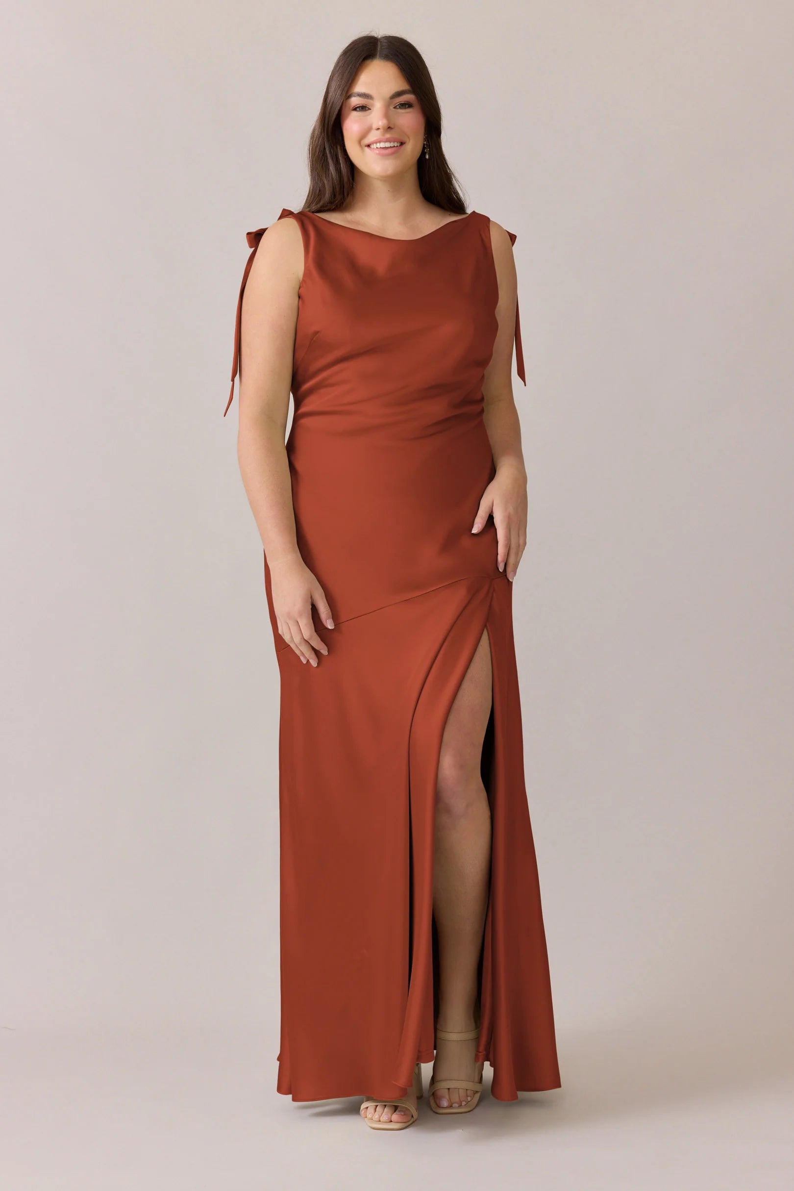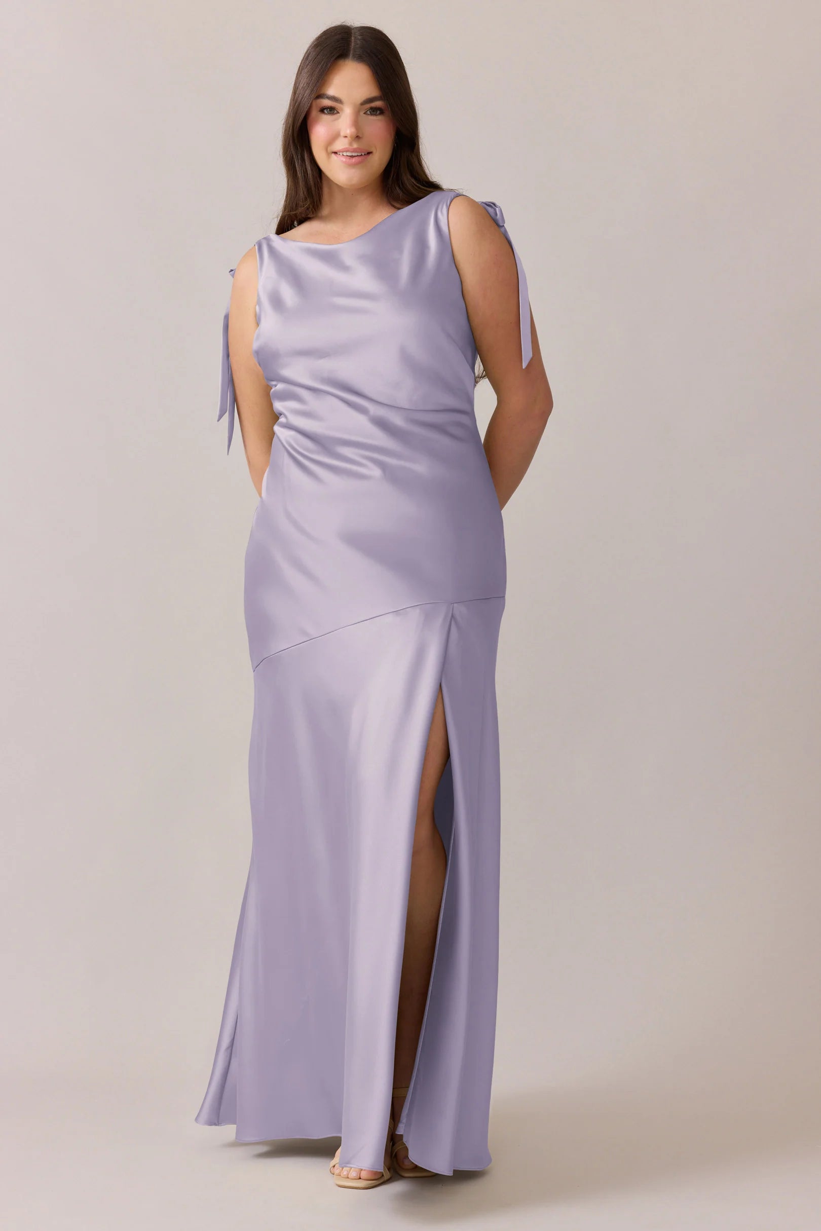 Chic and effortless, the Ellapink Satin Dress is a modern take on the classic slip silhouette. Featuring a subtle high-neck cowl neckline and delicate pre-tied bow straps, this dress floats over the body with no defined waistline for a sleek, elongating look. The asymmetrical skirt break and front slit add a touch of drama, while built-in bra cups and full-length lining ensure comfort and support. Finished with a hidden side zip for easy wear, Aaliyah is understated elegance made for the aisle and beyond.