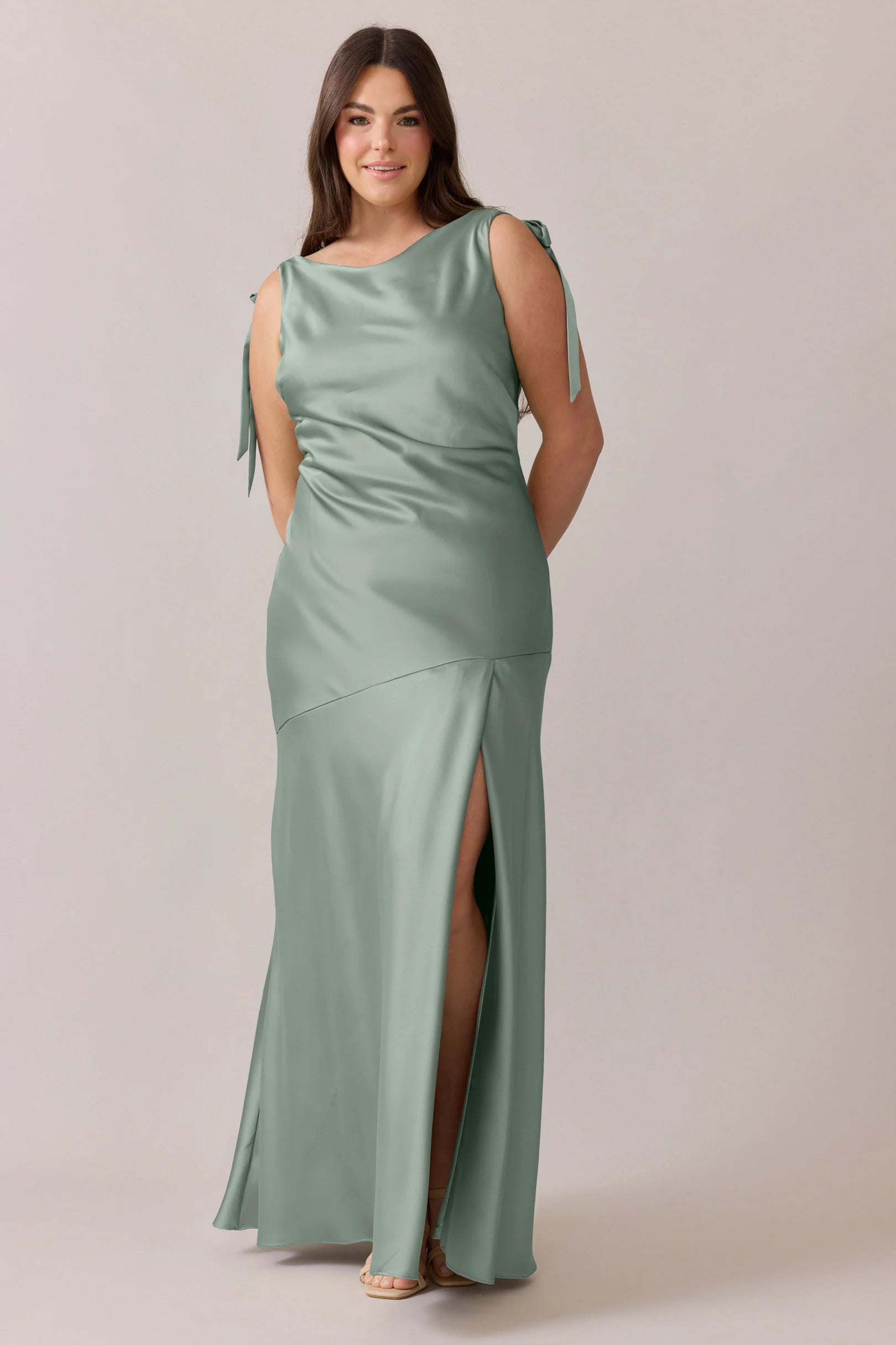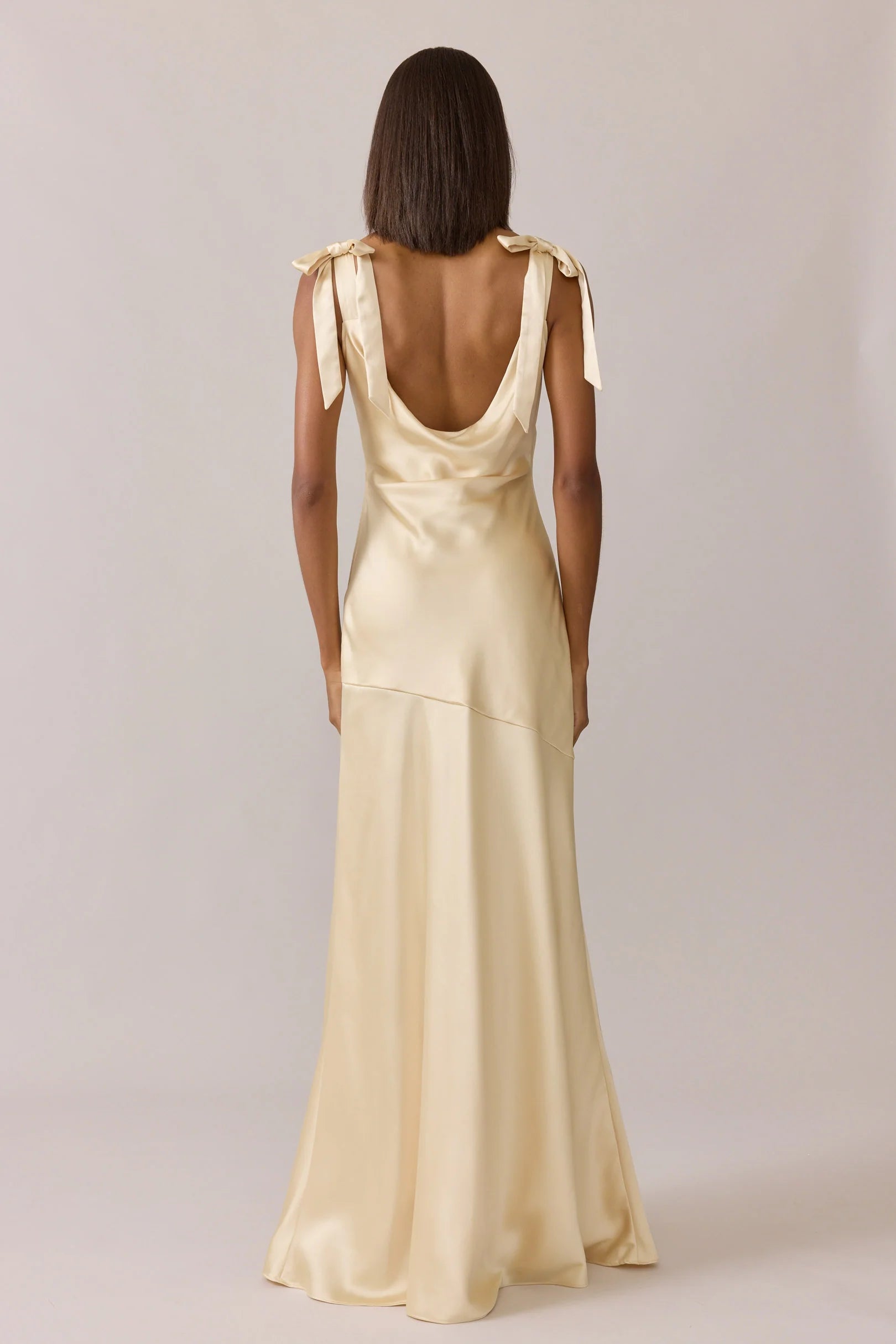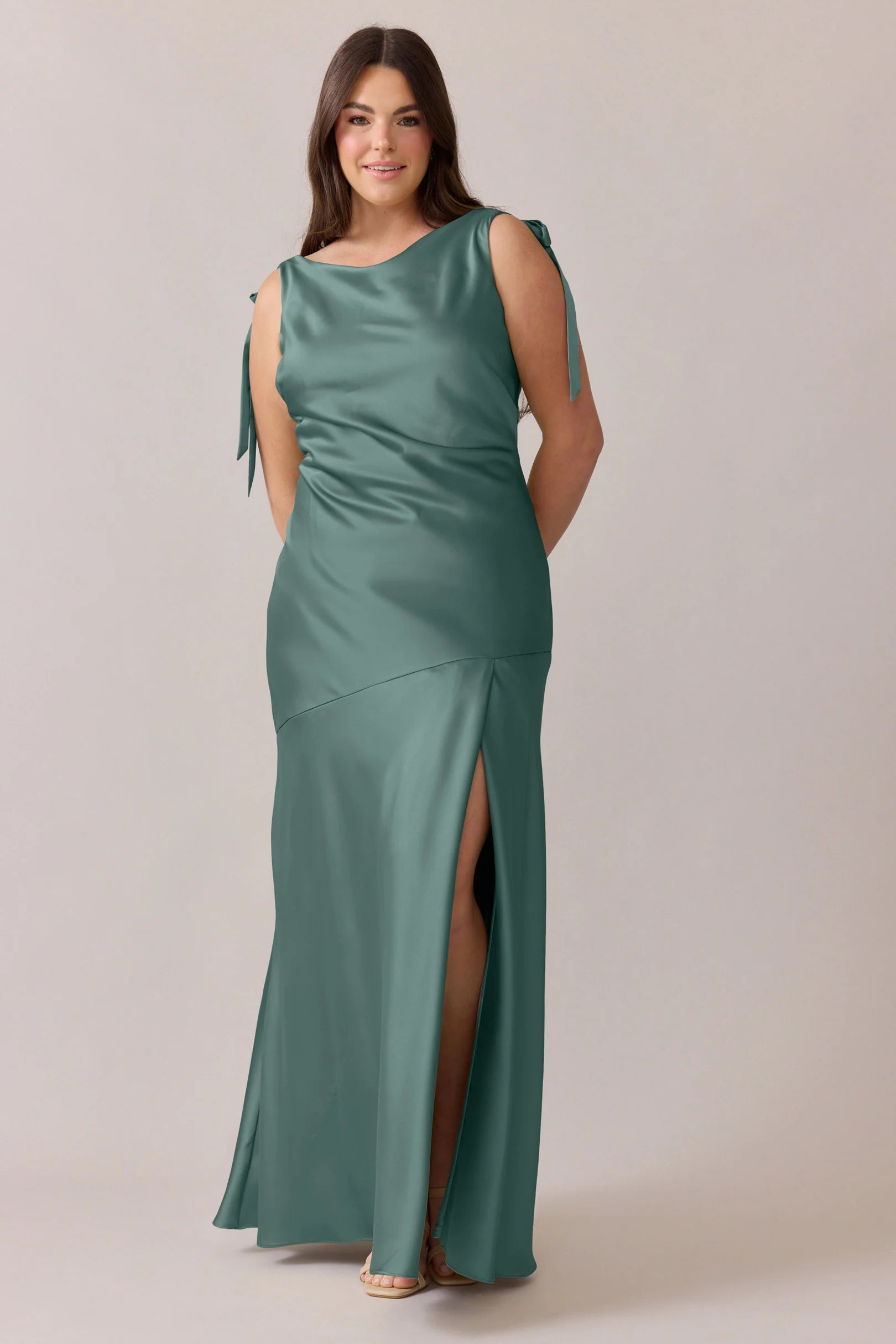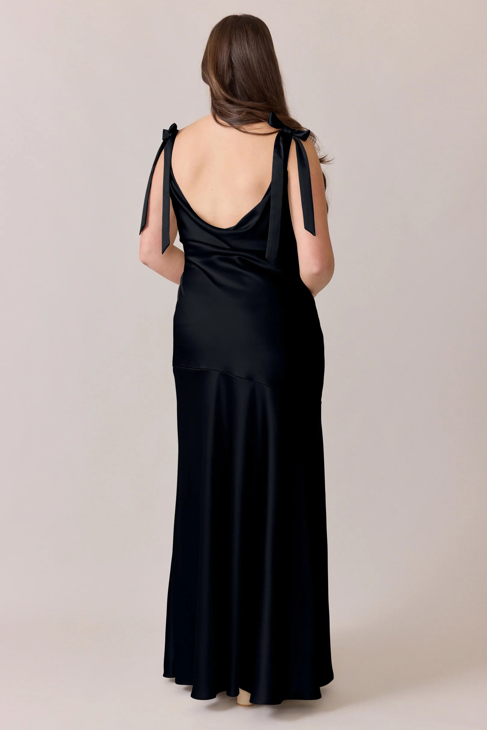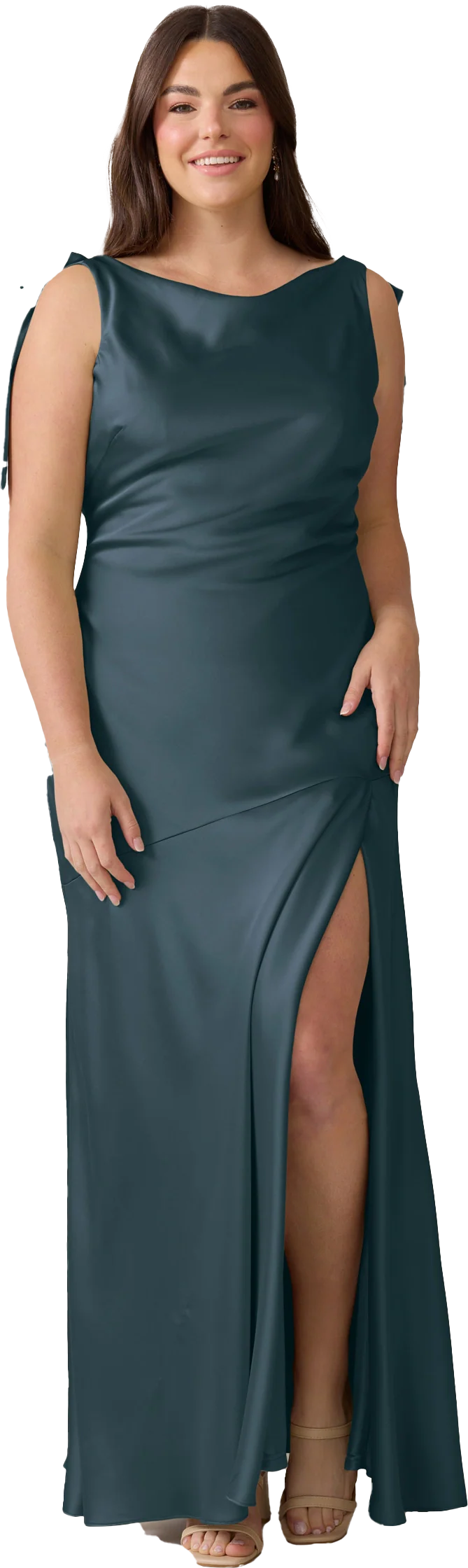 Chic and effortless, the Ellapink Satin Dress is a modern take on the classic slip silhouette. Featuring a subtle high-neck cowl neckline and delicate pre-tied bow straps, this dress floats over the body with no defined waistline for a sleek, elongating look. The asymmetrical skirt break and front slit add a touch of drama, while built-in bra cups and full-length lining ensure comfort and support. Finished with a hidden side zip for easy wear, Aaliyah is understated elegance made for the aisle and beyond.