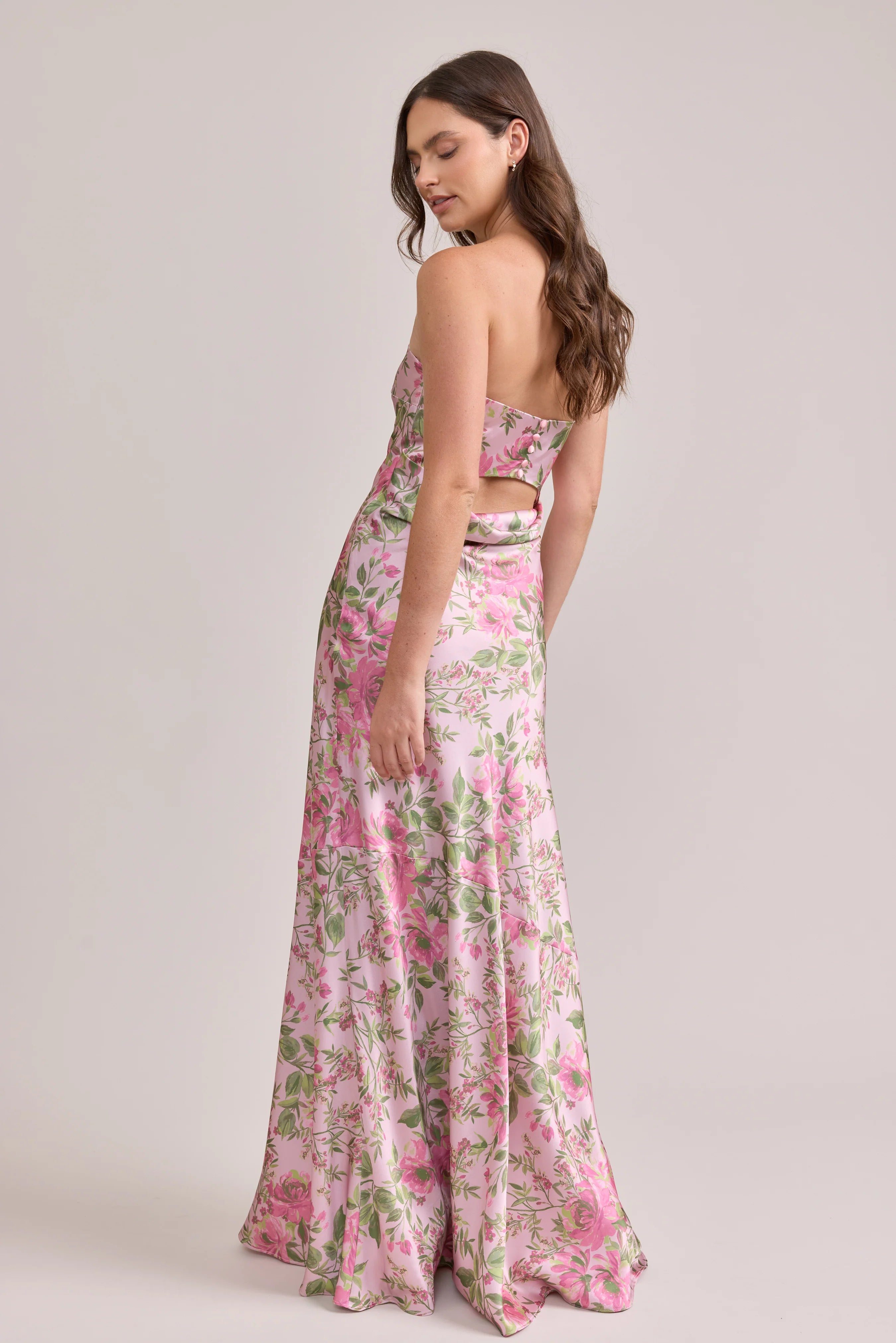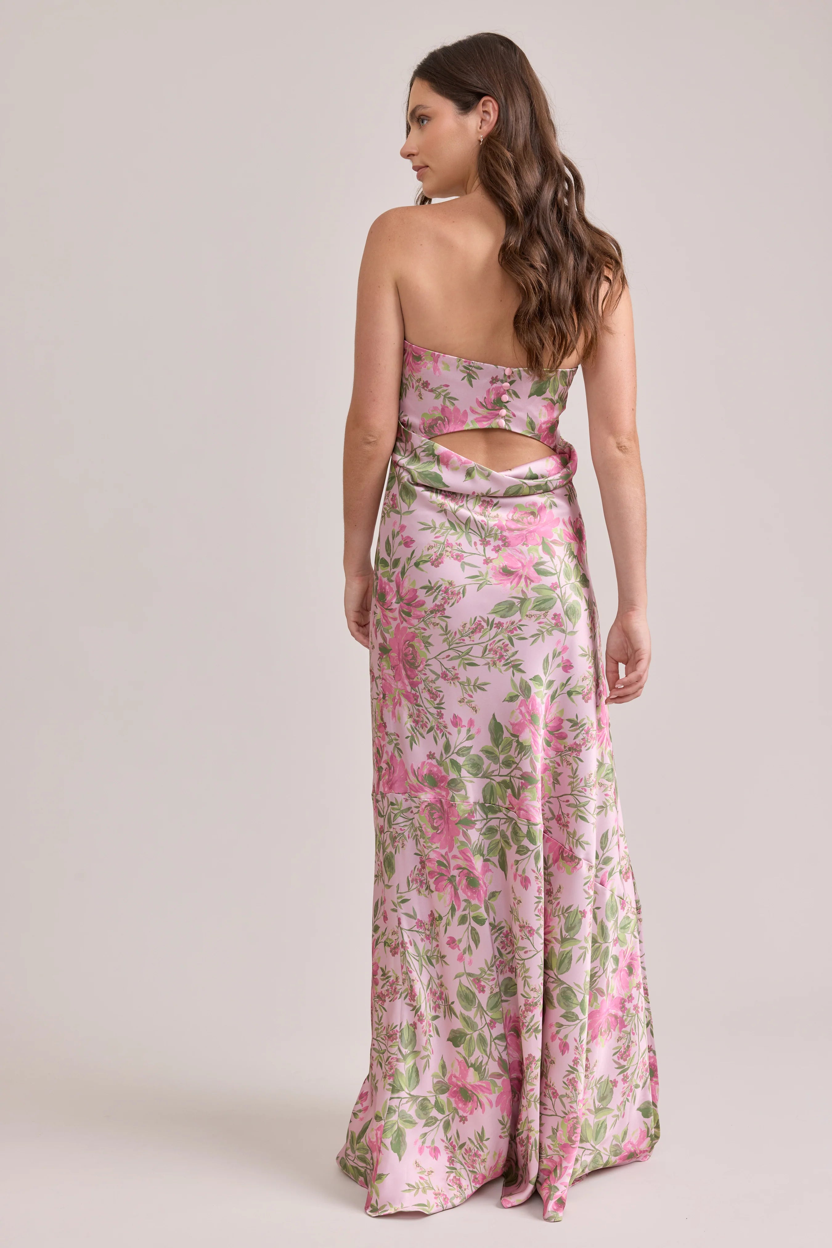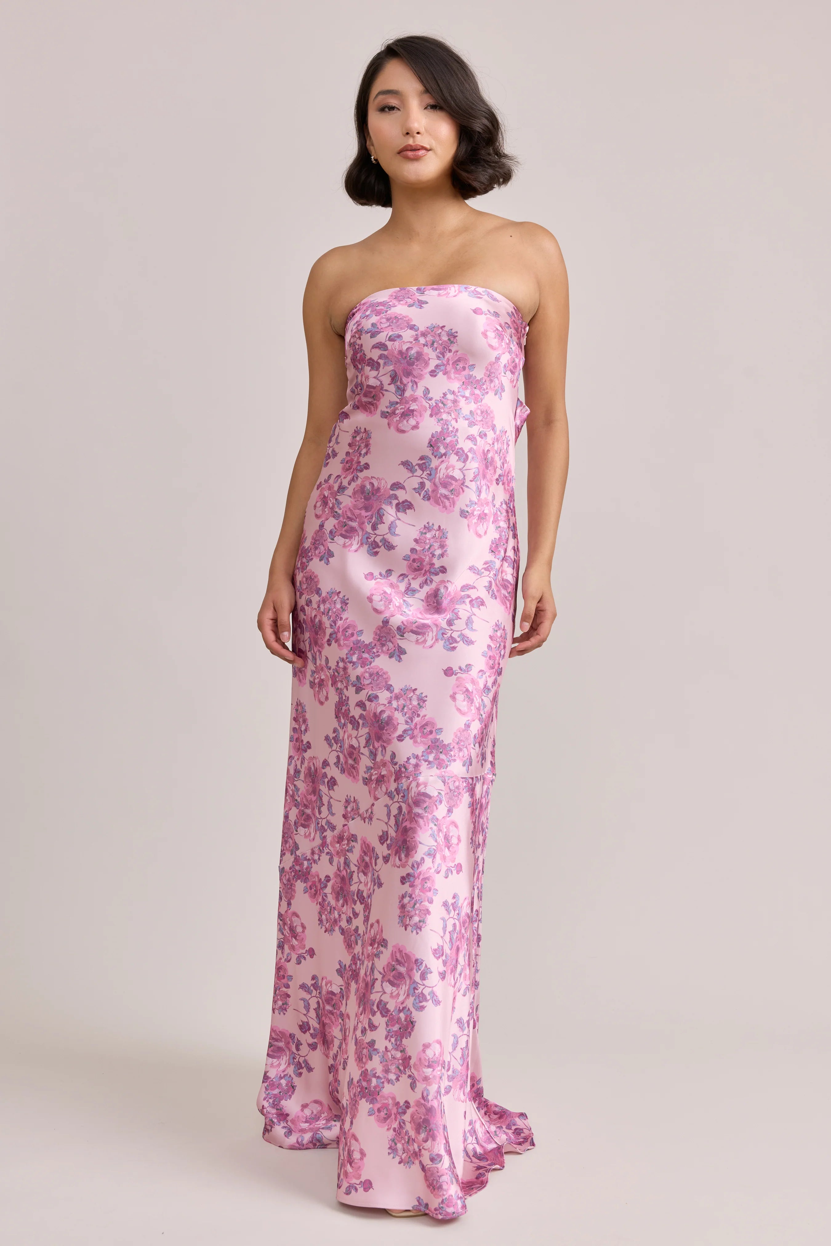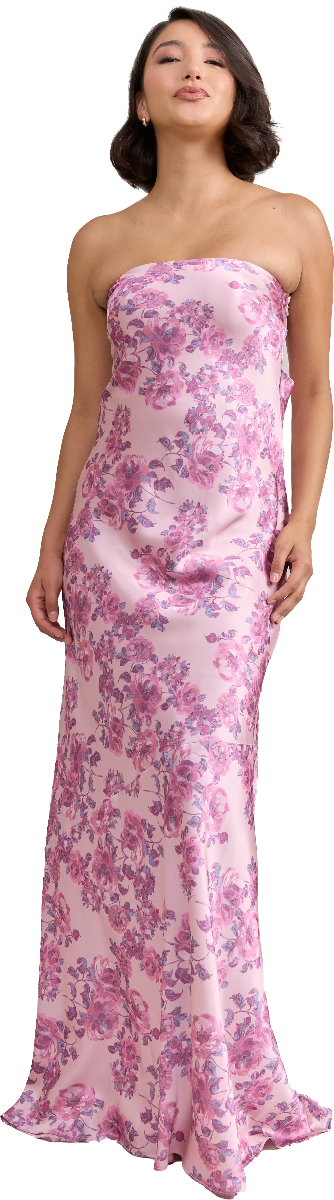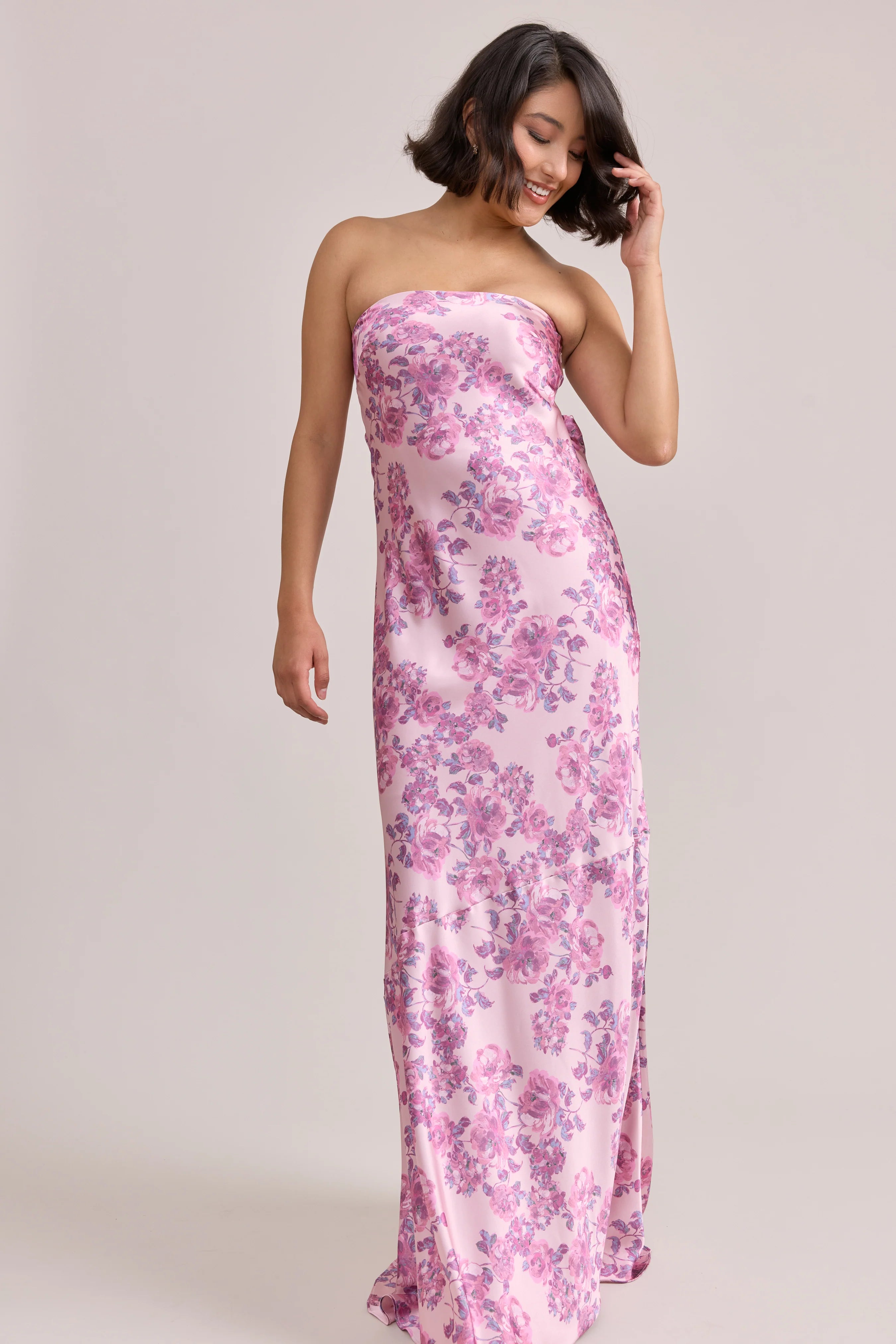 Our strapless Ellapink Satin dress will become the bridesmaid favorite for the modern wedding! Leo is modest in the front with a simple skirt break detail, but has mesmerizing features in the back of the dress with her cowl drape back and supporting band with faux, dainty buttons all to create a sexy keyhole detail.