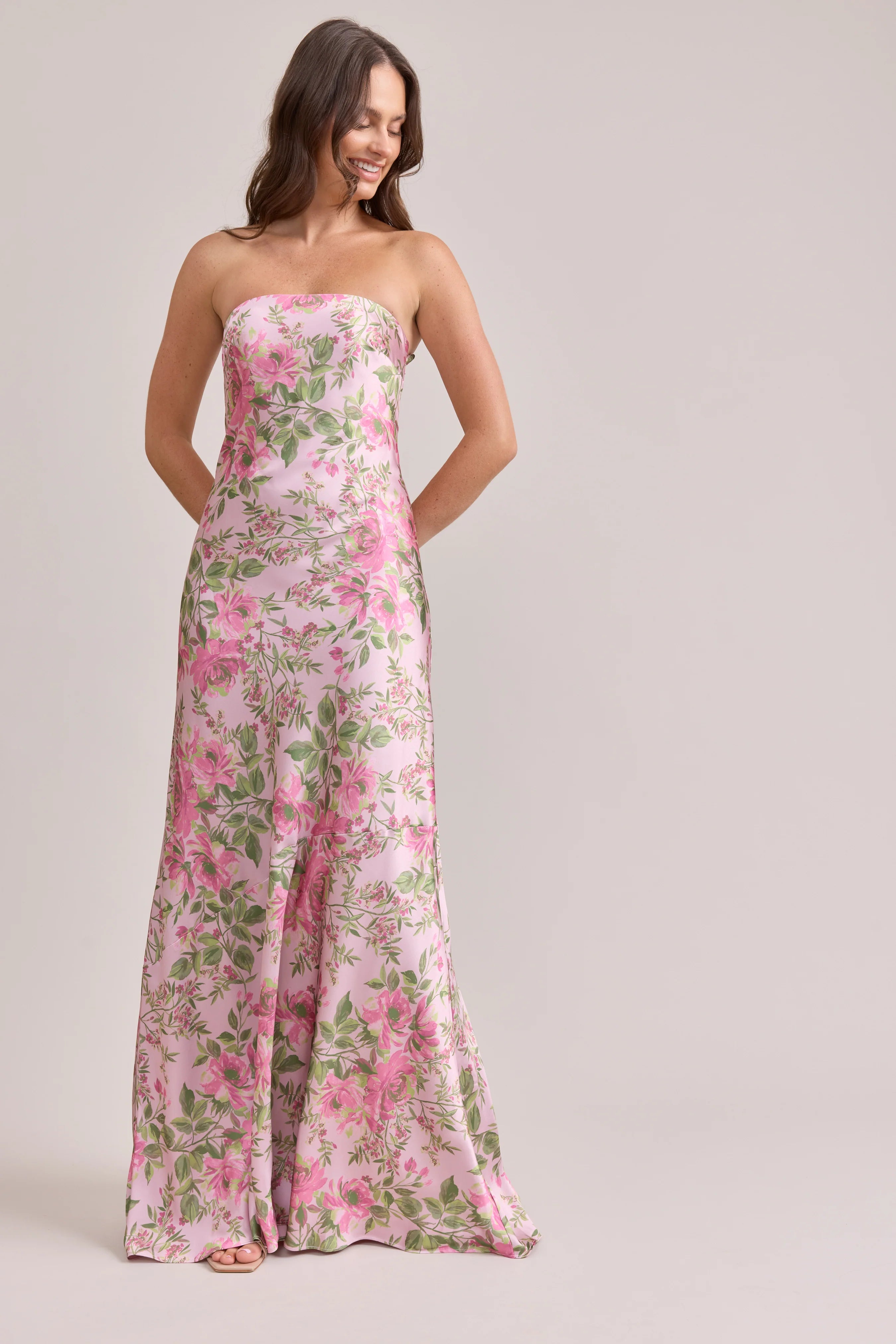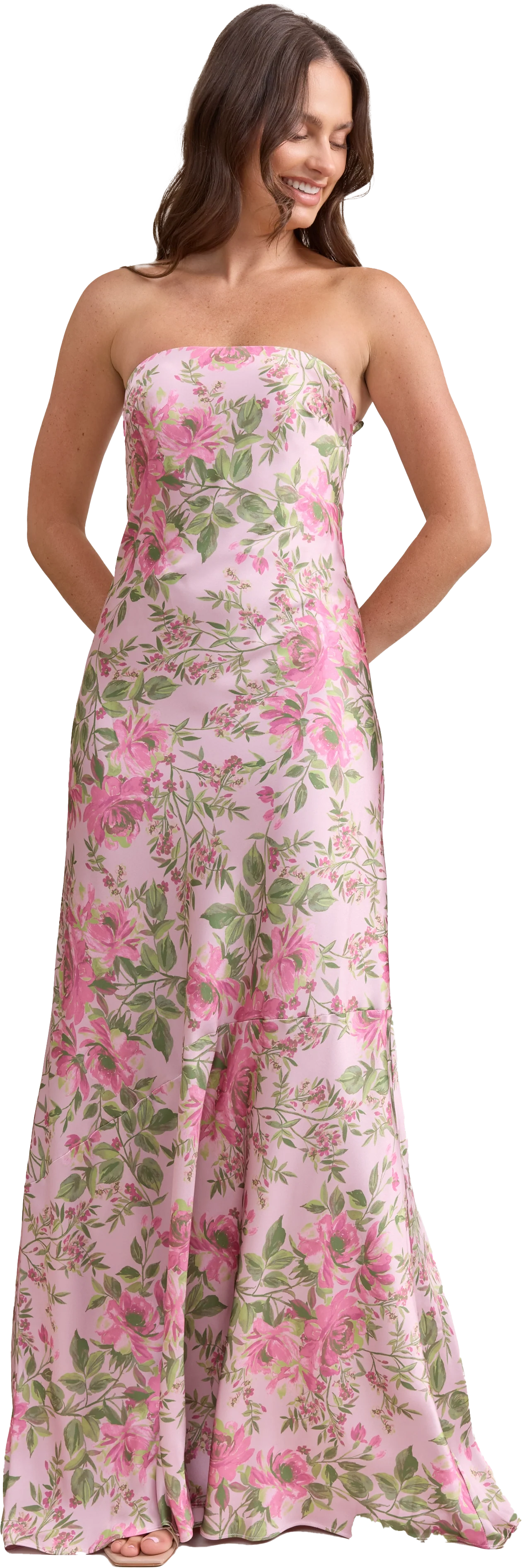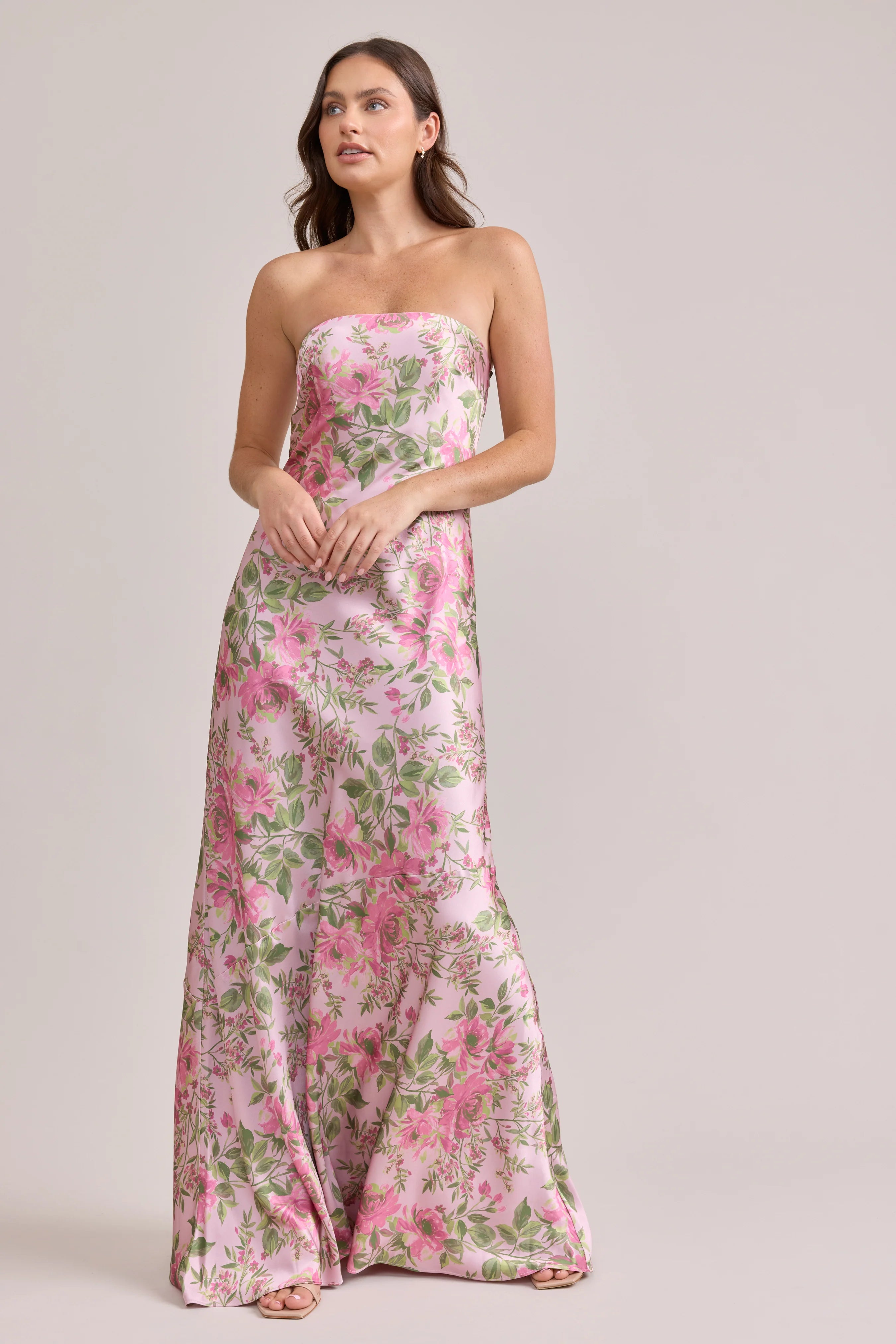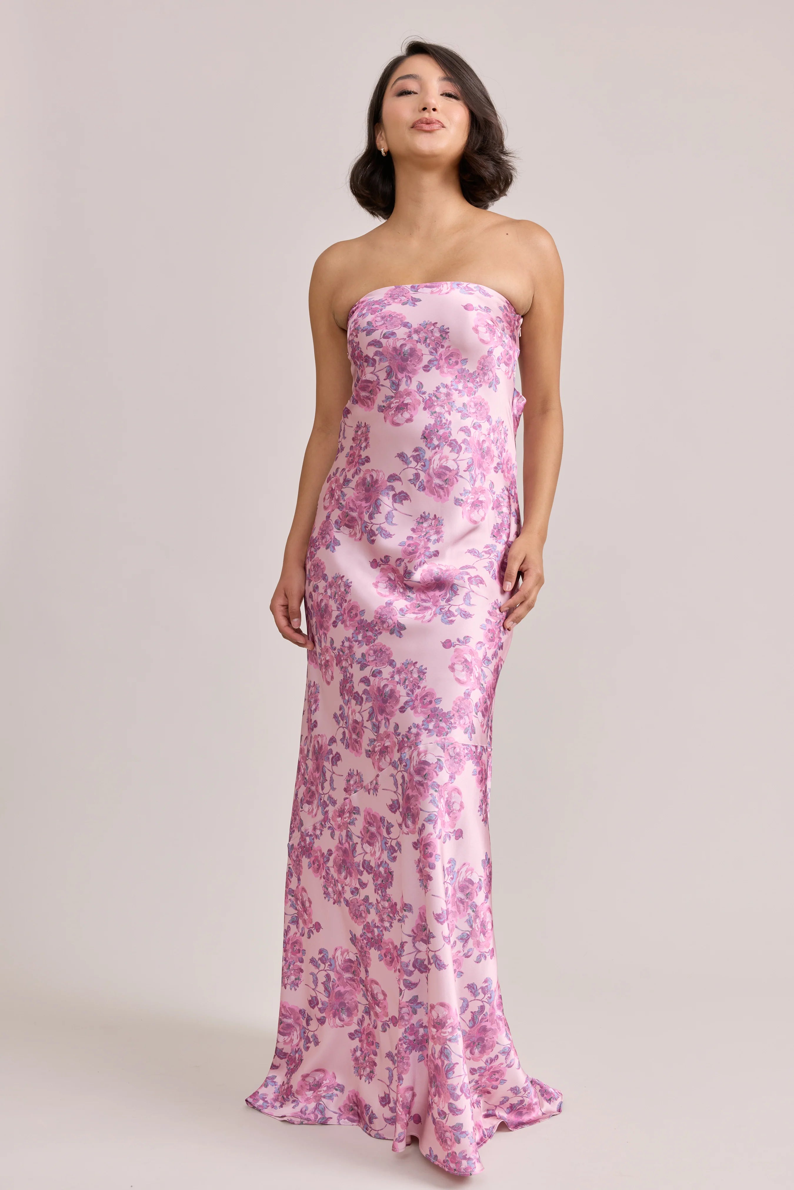 Our strapless Ellapink Satin dress will become the bridesmaid favorite for the modern wedding! Leo is modest in the front with a simple skirt break detail, but has mesmerizing features in the back of the dress with her cowl drape back and supporting band with faux, dainty buttons all to create a sexy keyhole detail.