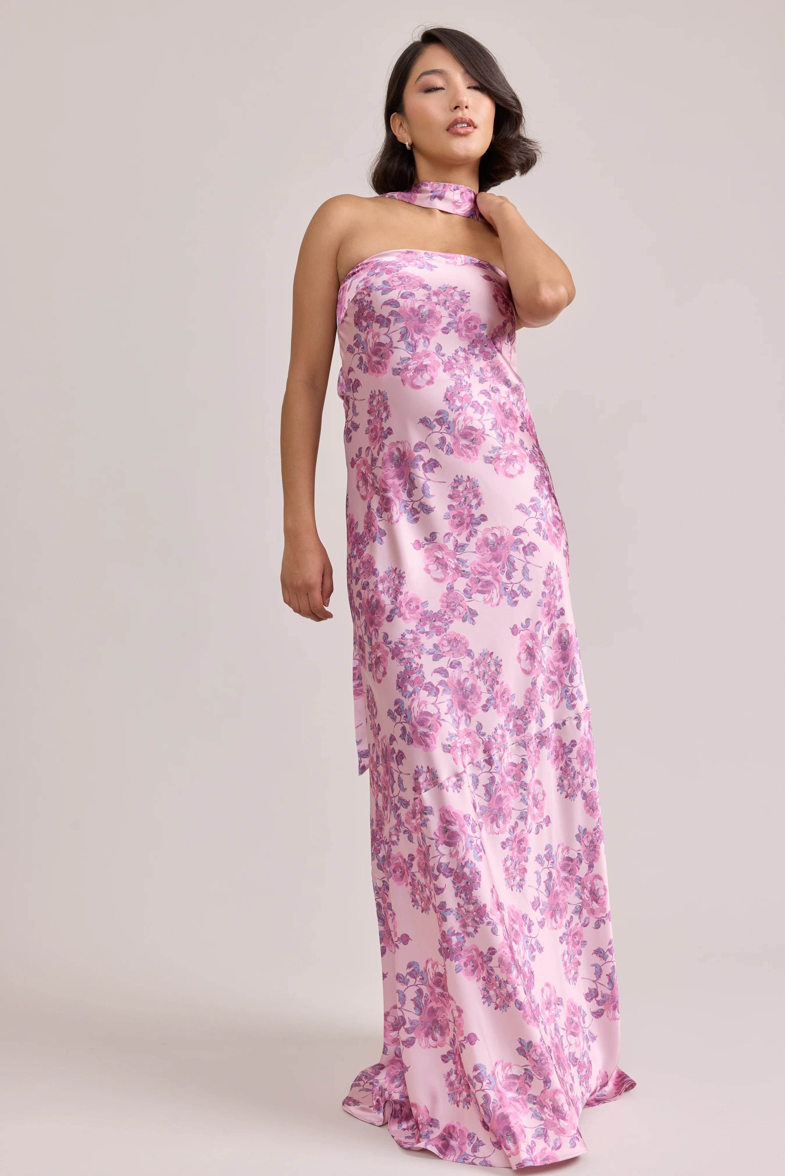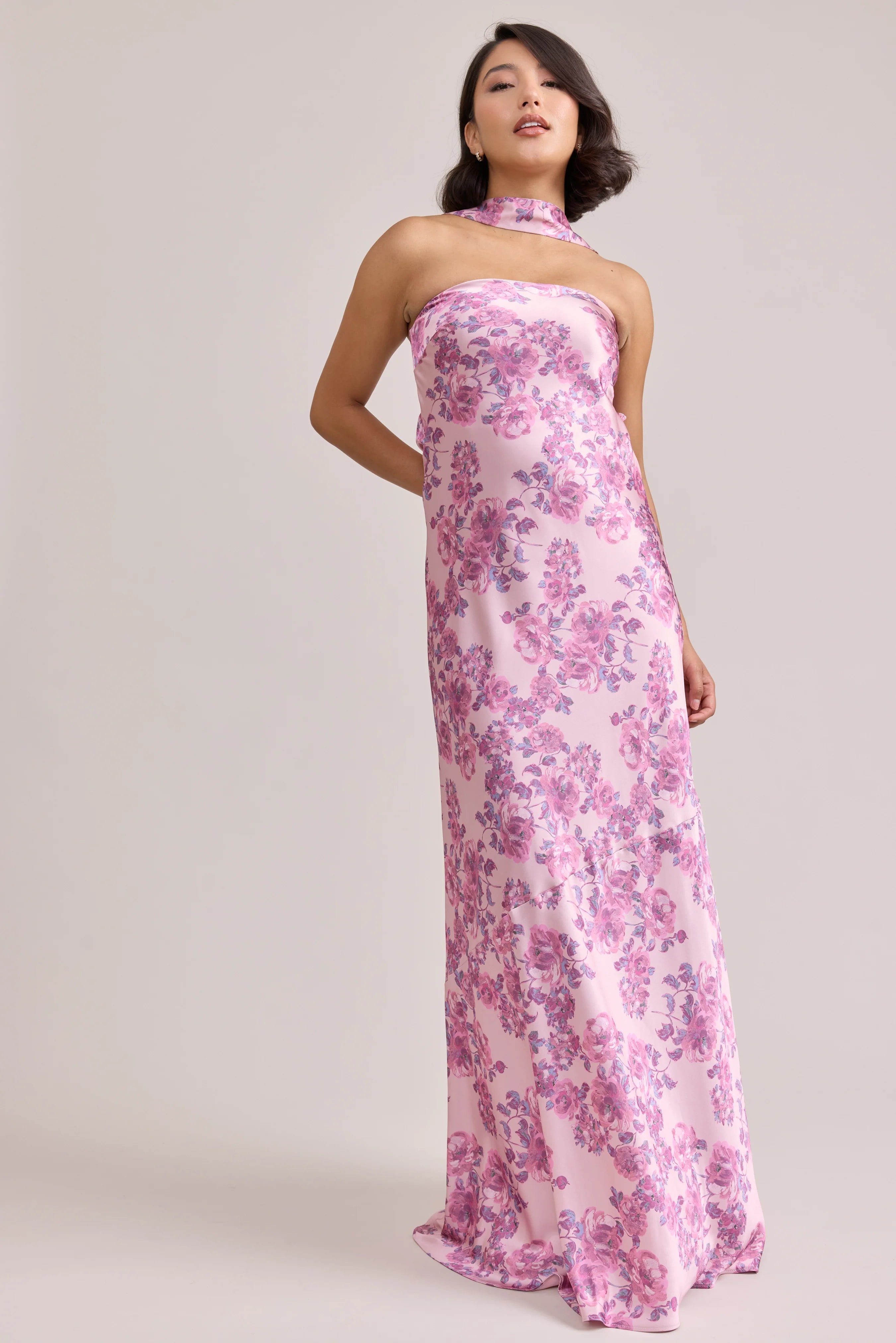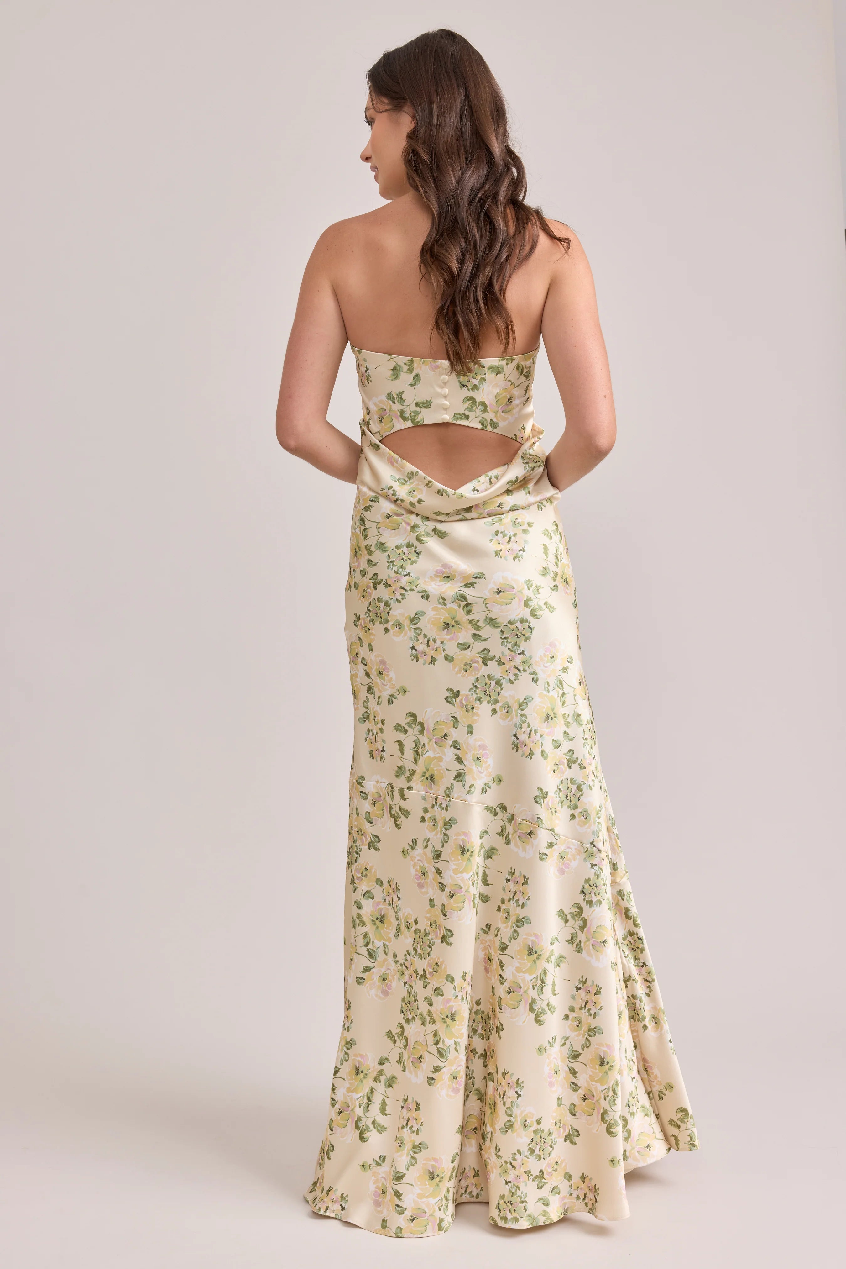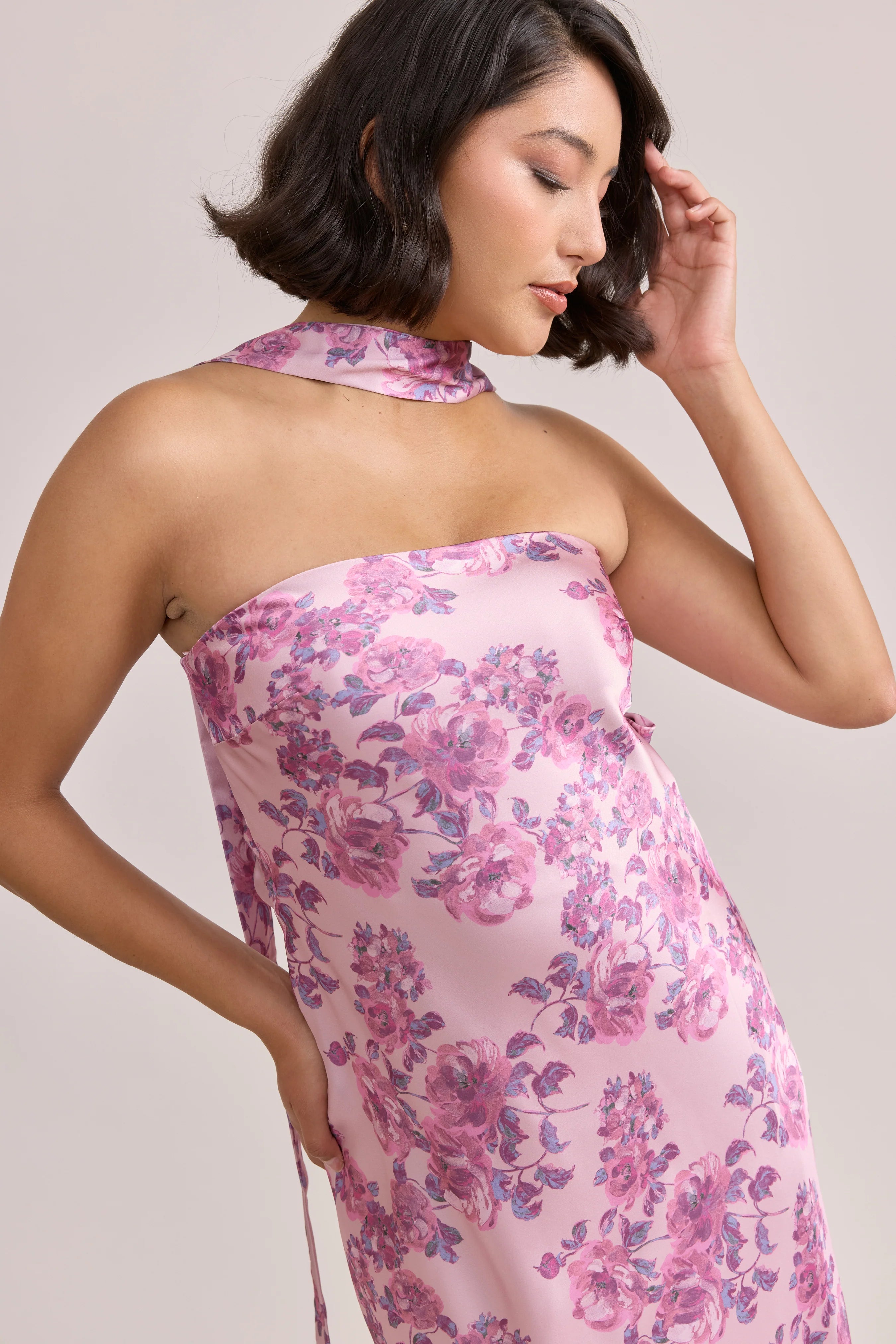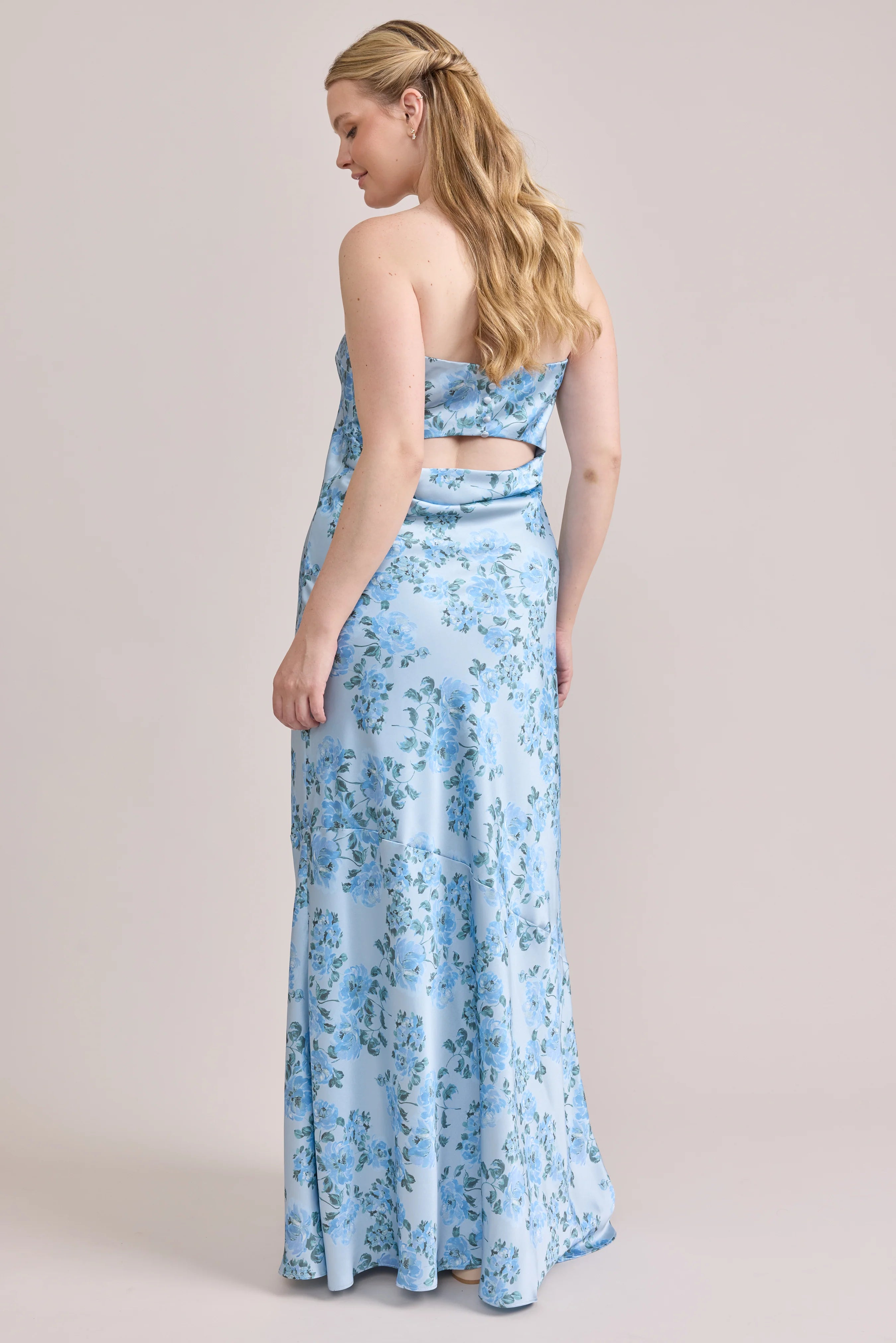 Our strapless Ellapink Satin dress will become the bridesmaid favorite for the modern wedding! Leo is modest in the front with a simple skirt break detail, but has mesmerizing features in the back of the dress with her cowl drape back and supporting band with faux, dainty buttons all to create a sexy keyhole detail.