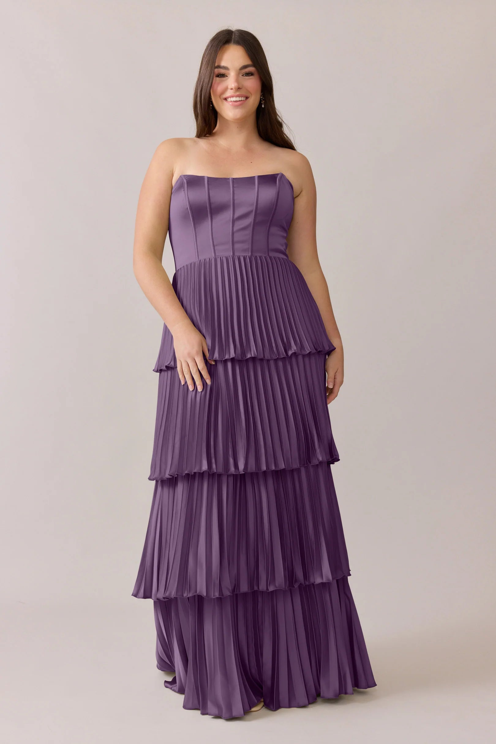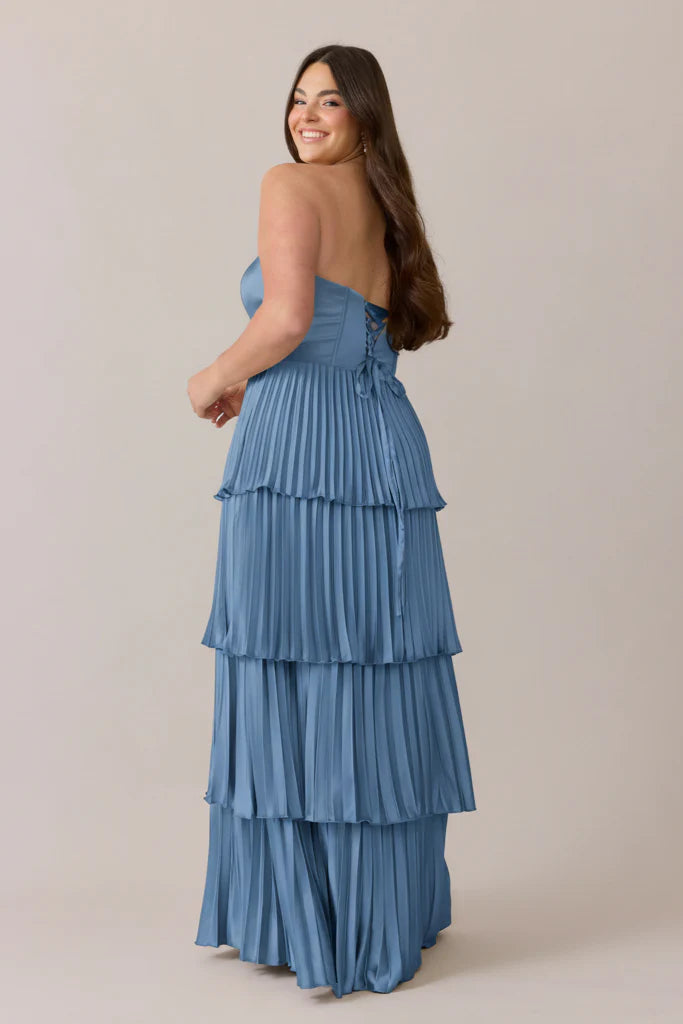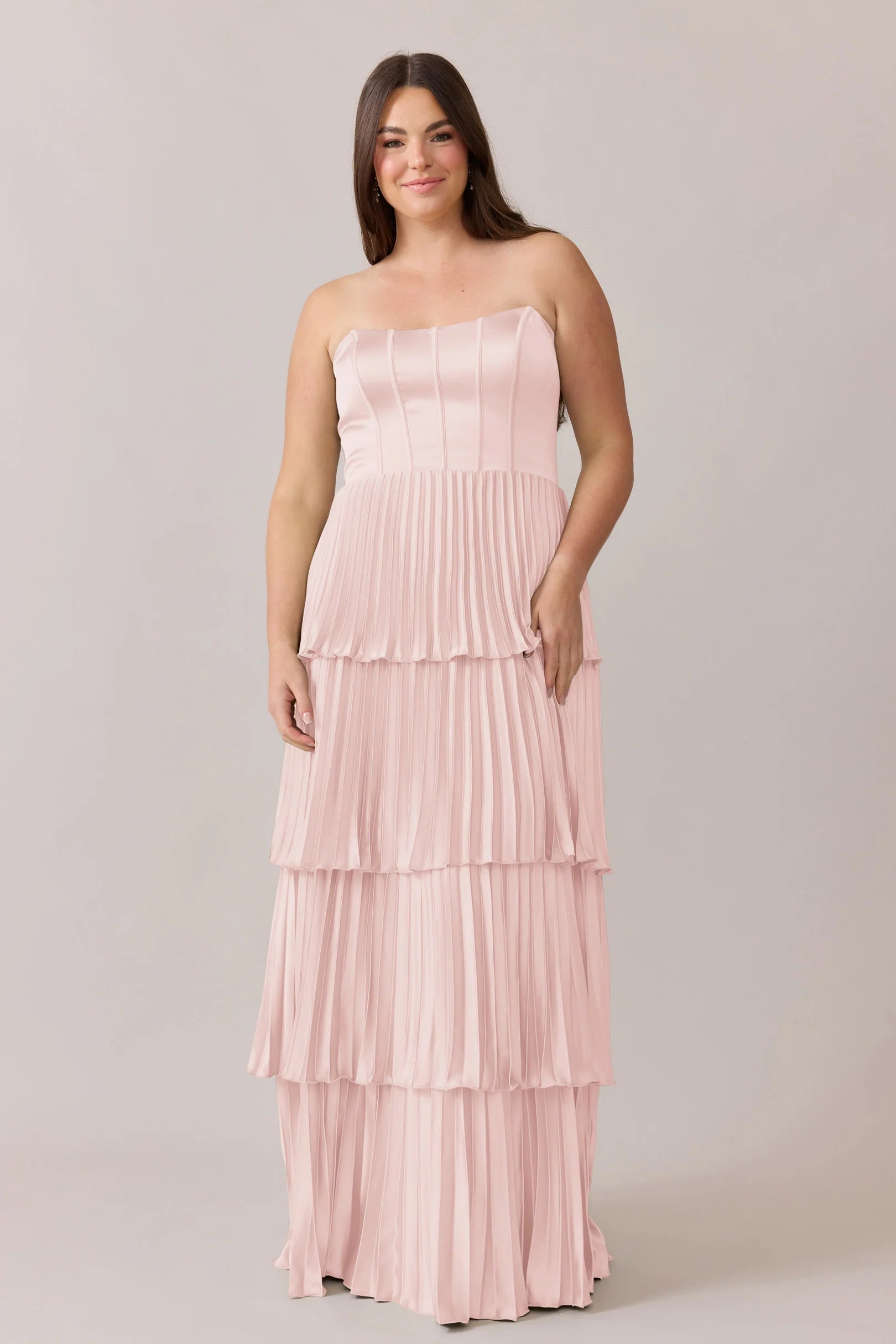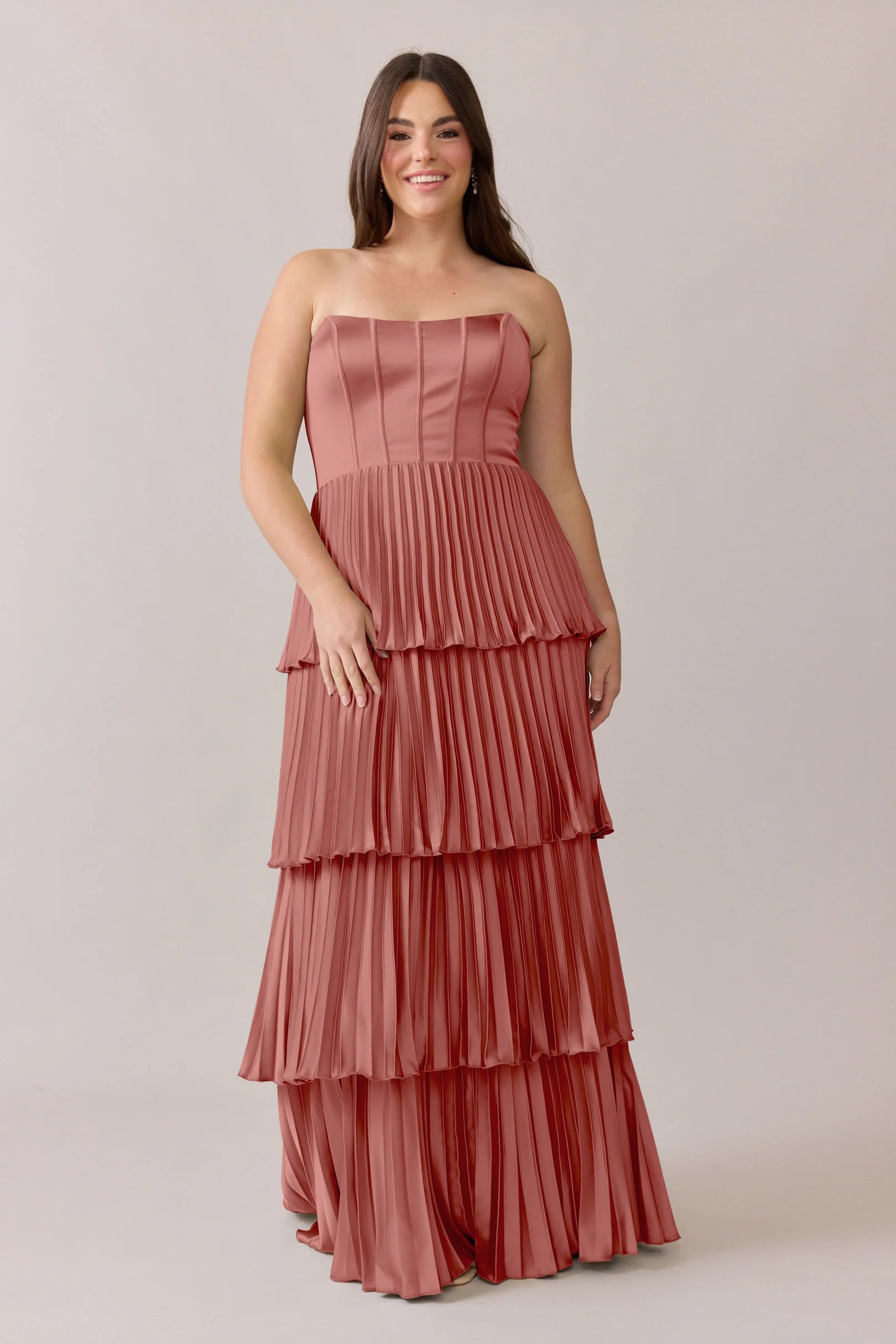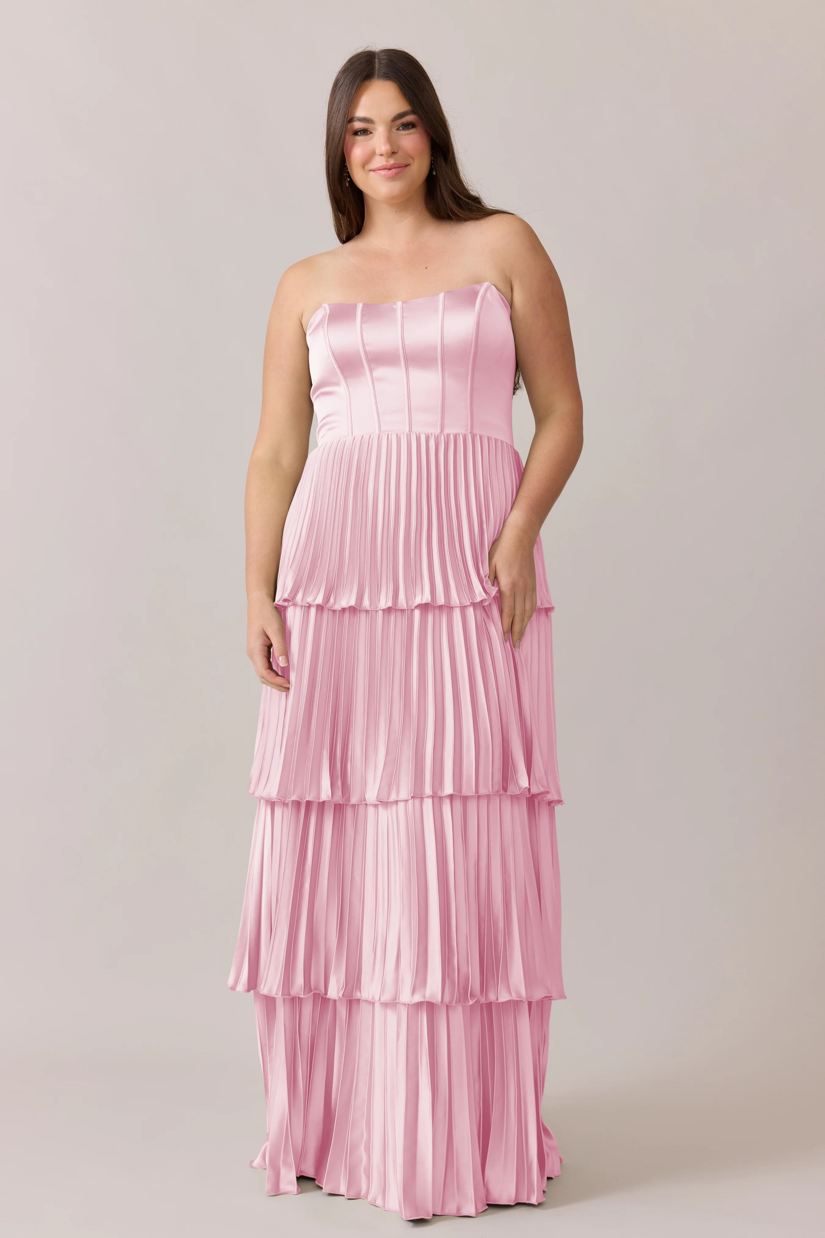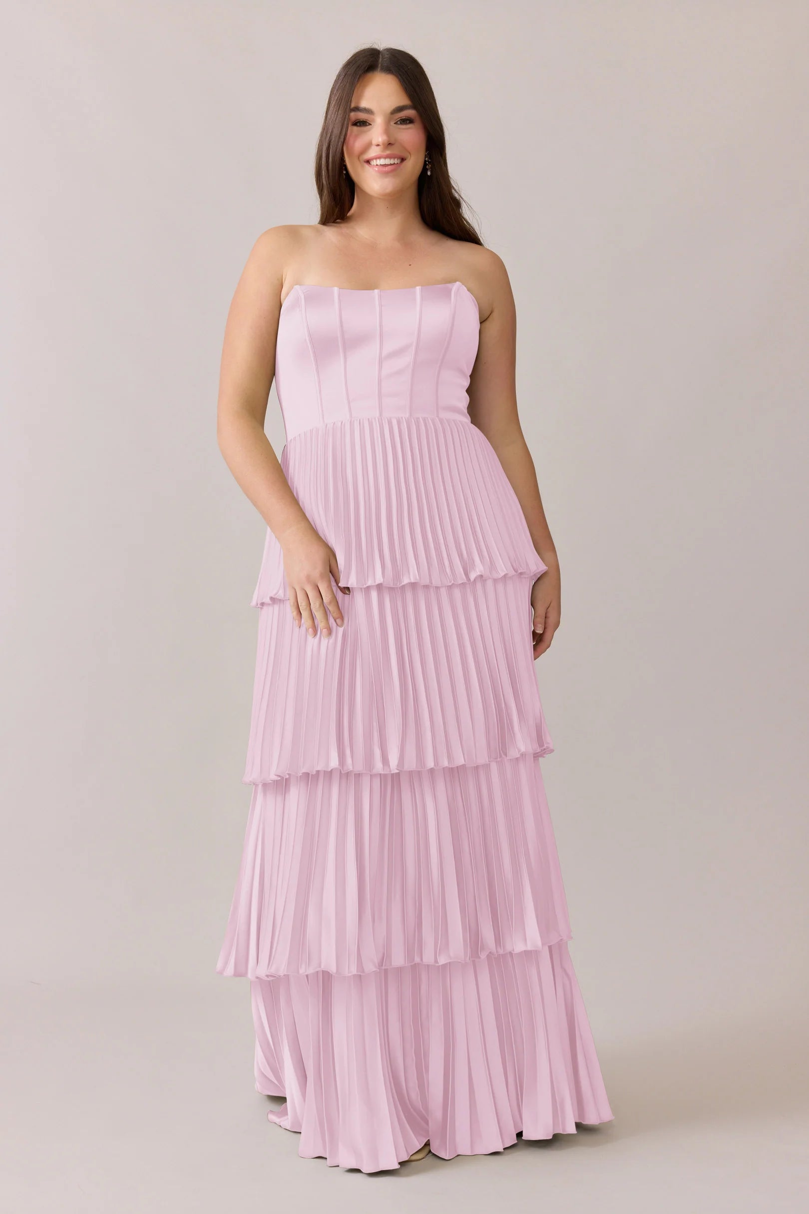 Graceful and refined, the Collins Dress features a strapless A-line silhouette with a cascading four-tier pleated skirt. Built-in bra cups and structured boning provide seamless support, while a lace-up back and hidden zipper offer a tailored fit. Fully lined for smooth coverage, Ellapink is an effortlessly timeless choice—modern, modest, and endlessly flattering.