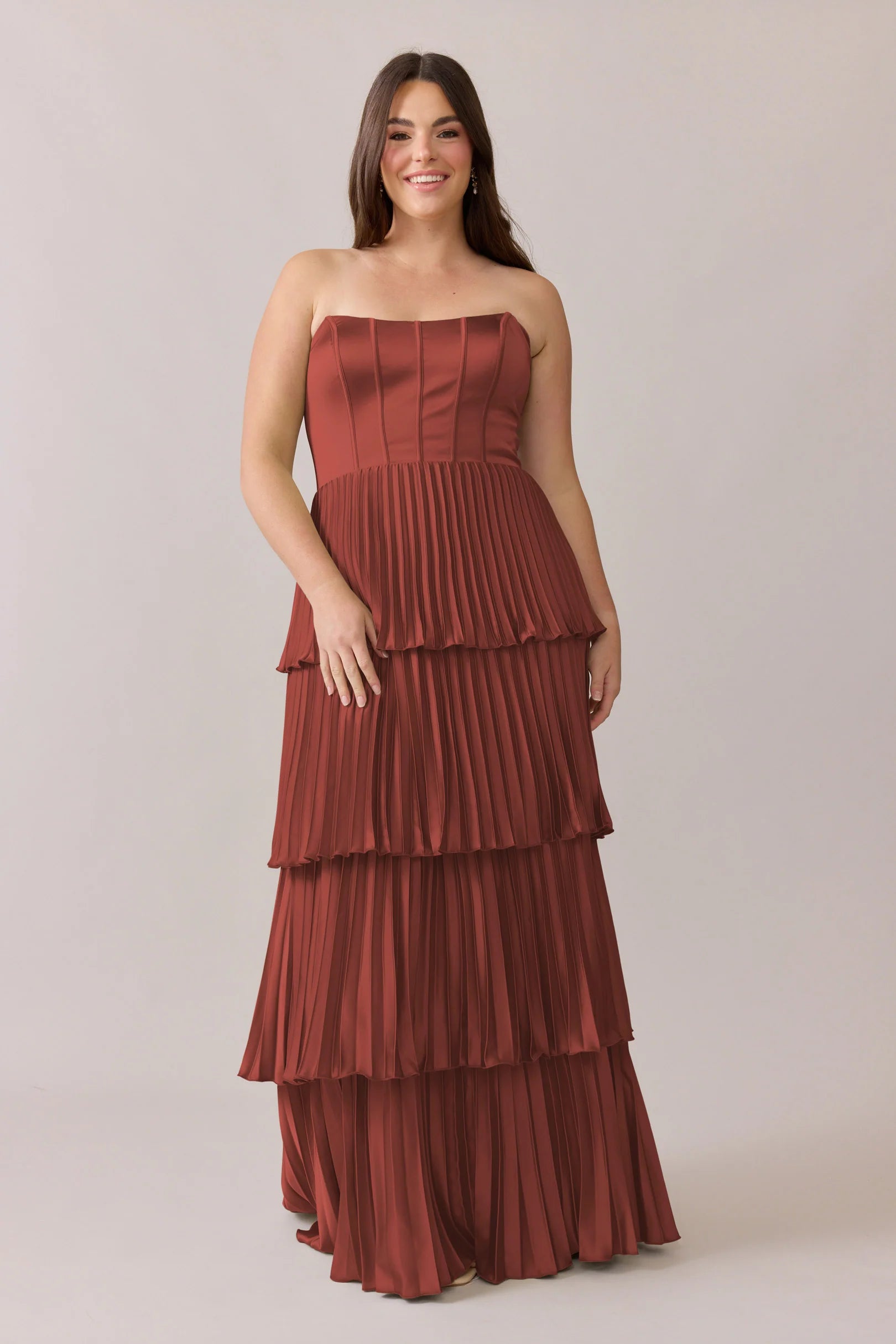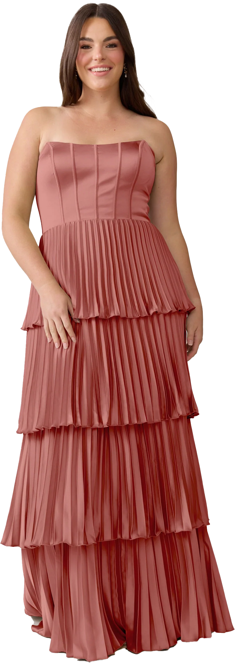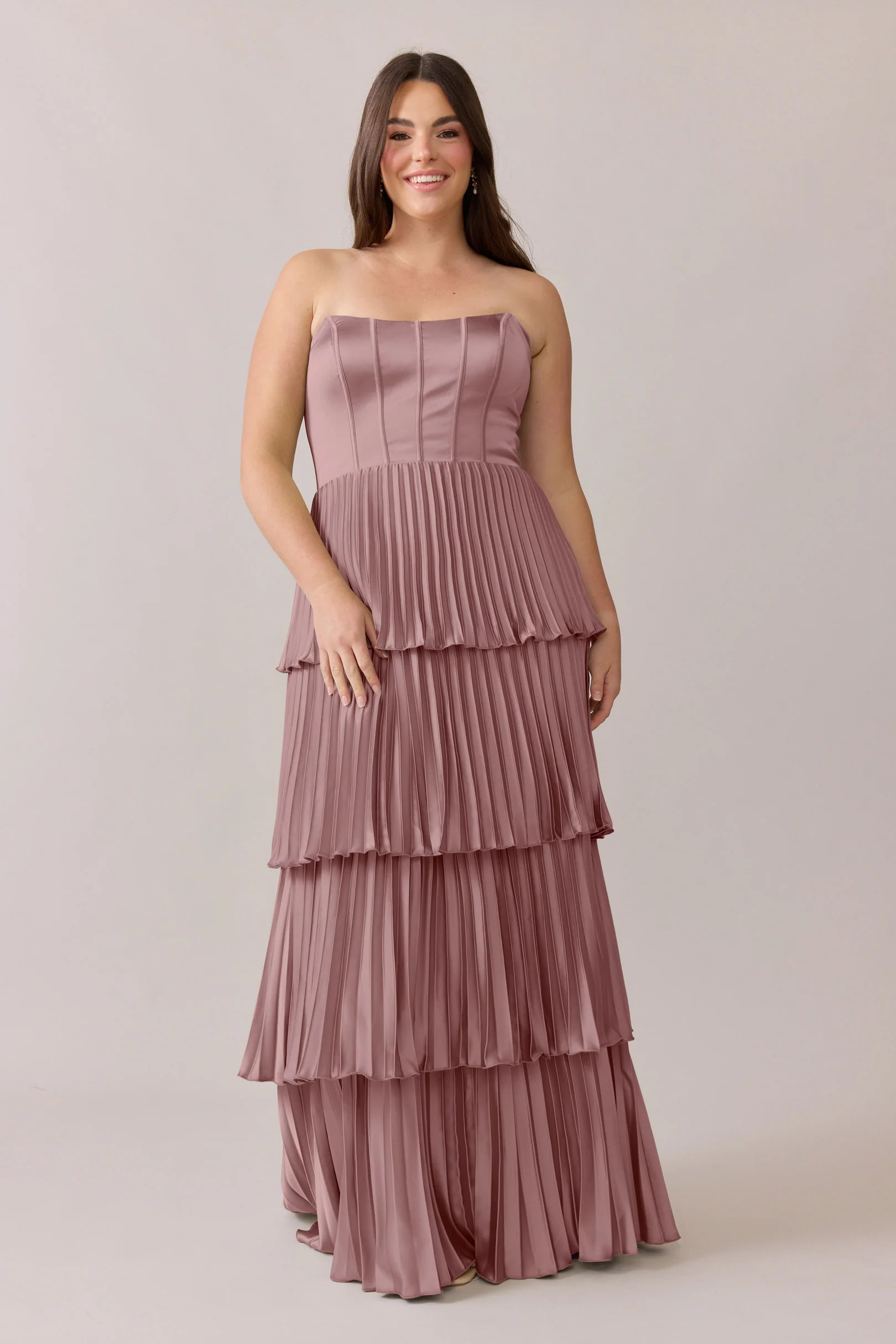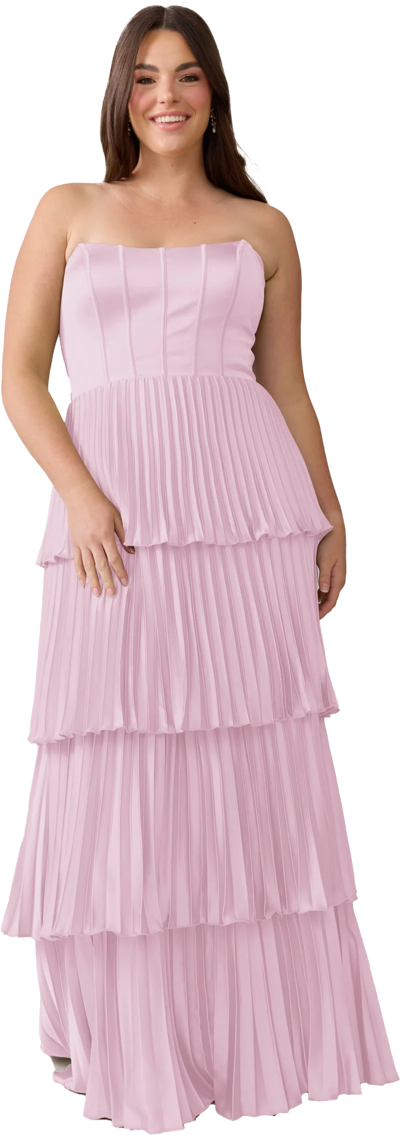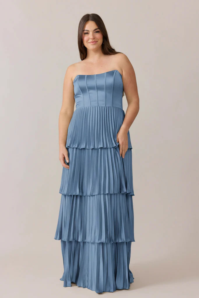 Graceful and refined, the Collins Dress features a strapless A-line silhouette with a cascading four-tier pleated skirt. Built-in bra cups and structured boning provide seamless support, while a lace-up back and hidden zipper offer a tailored fit. Fully lined for smooth coverage, Ellapink is an effortlessly timeless choice—modern, modest, and endlessly flattering.