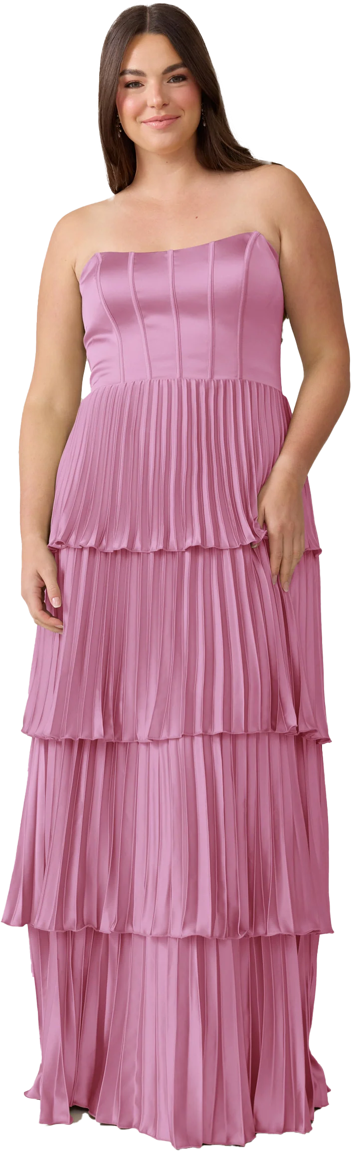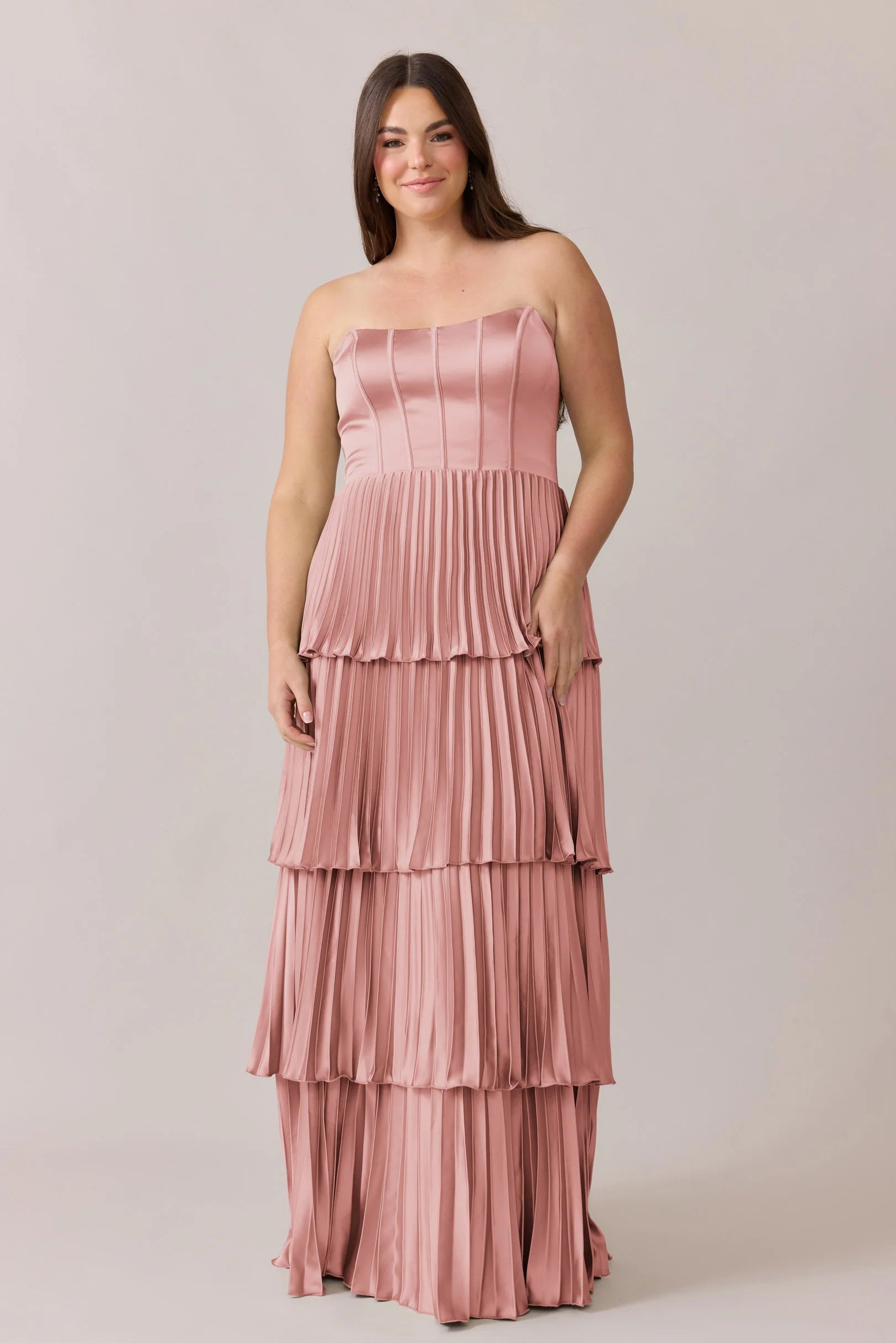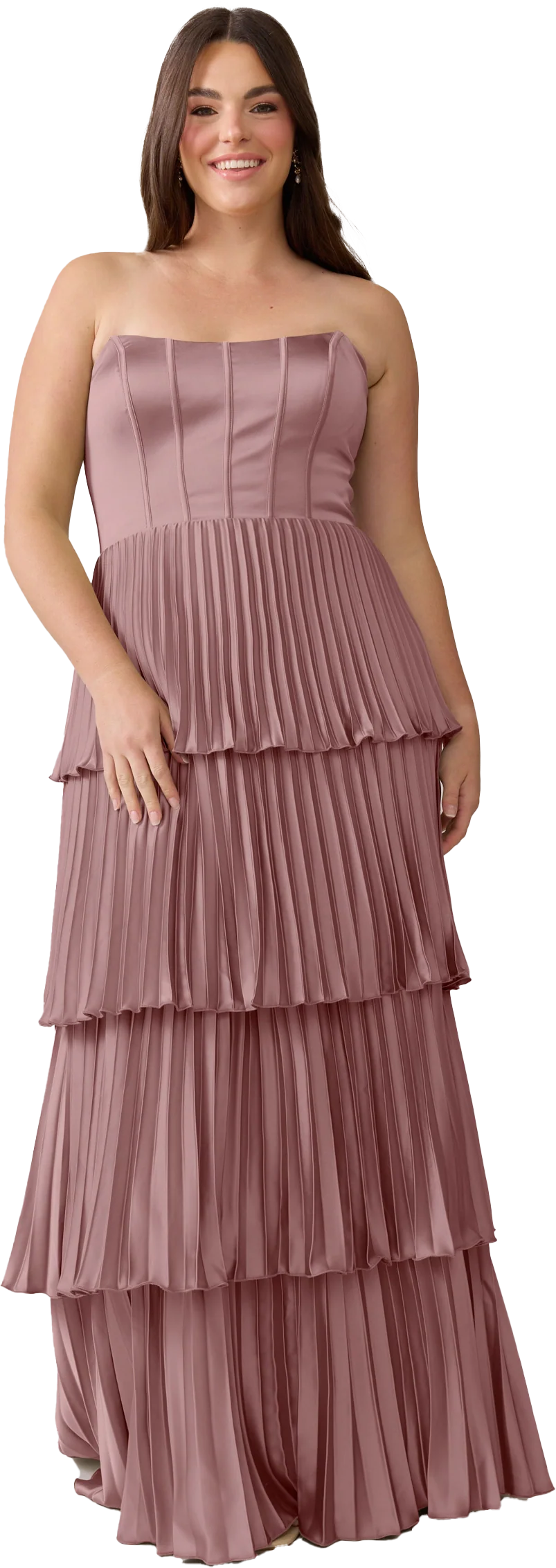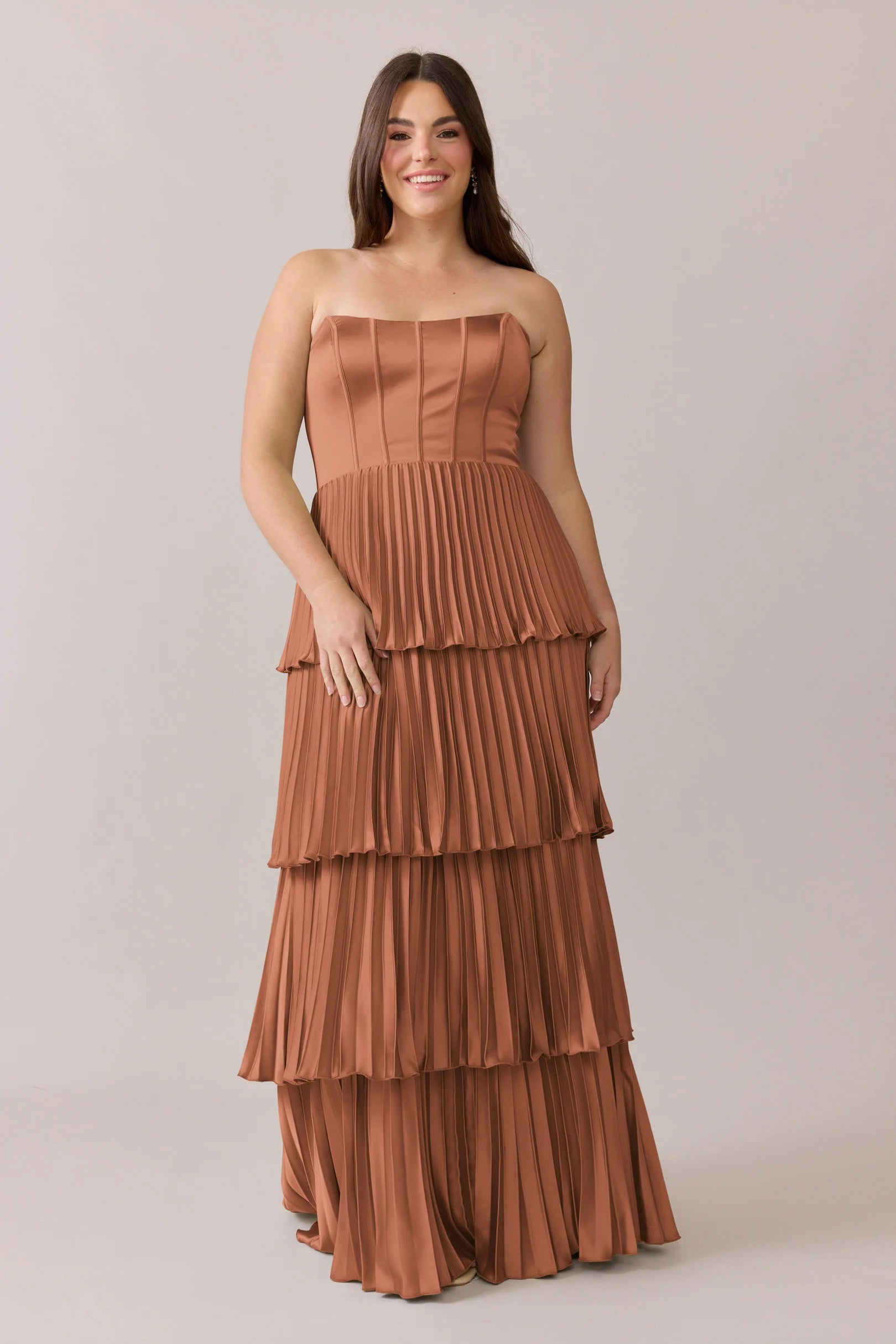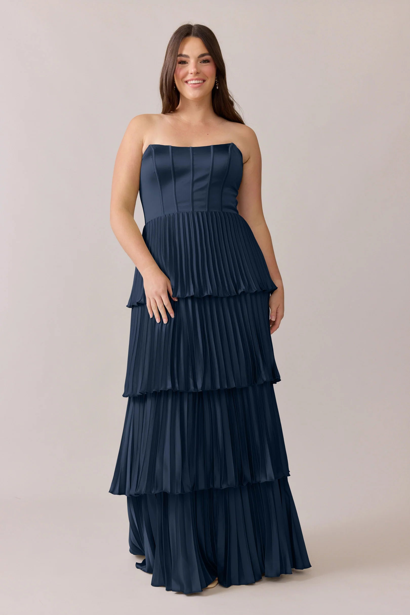 Graceful and refined, the Collins Dress features a strapless A-line silhouette with a cascading four-tier pleated skirt. Built-in bra cups and structured boning provide seamless support, while a lace-up back and hidden zipper offer a tailored fit. Fully lined for smooth coverage, Ellapink is an effortlessly timeless choice—modern, modest, and endlessly flattering.