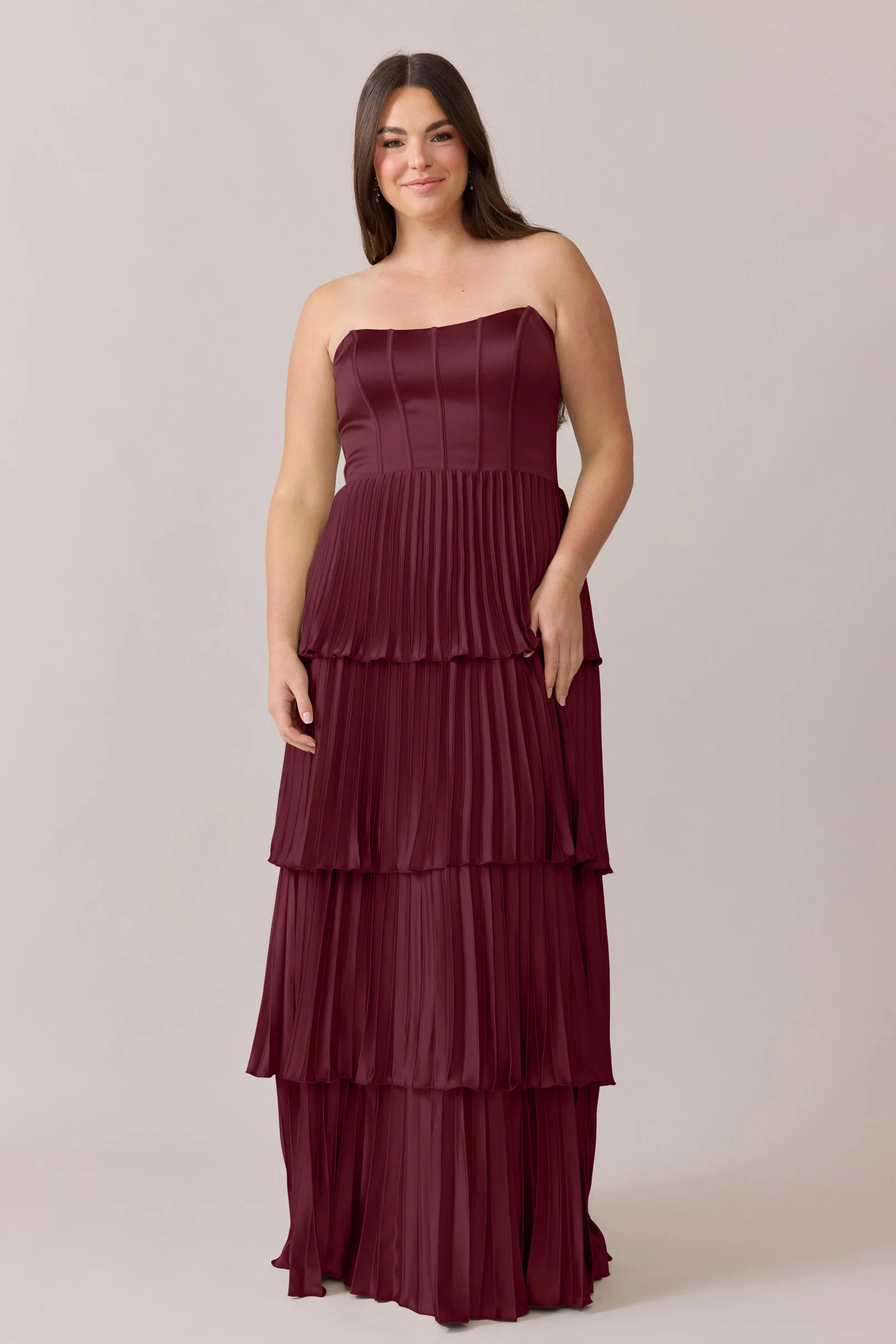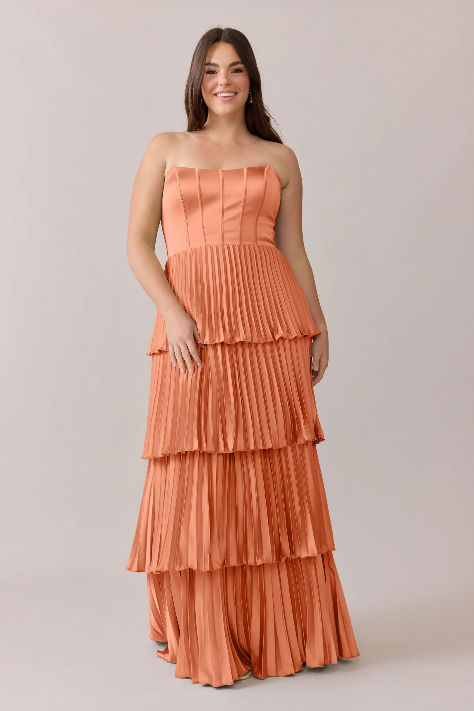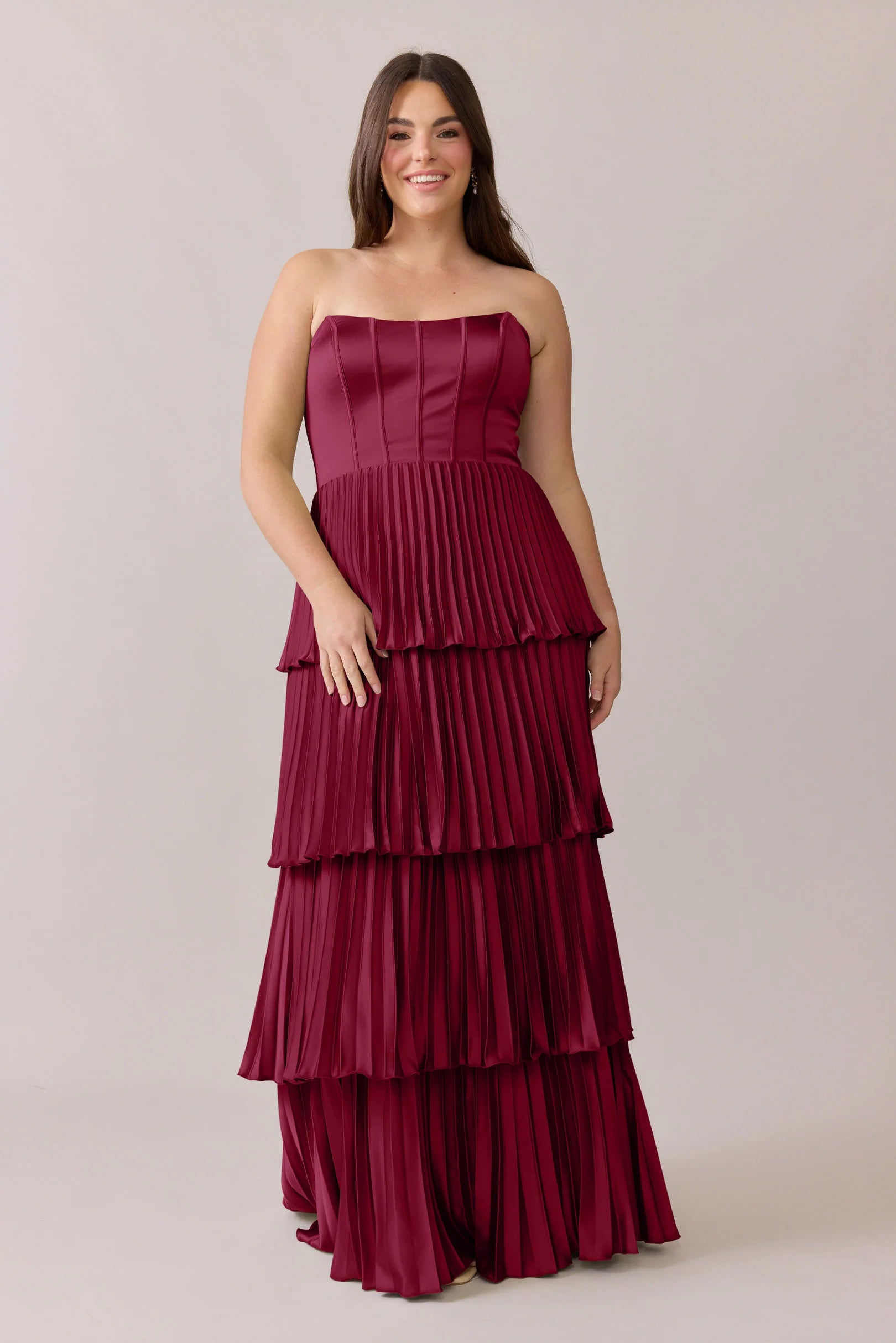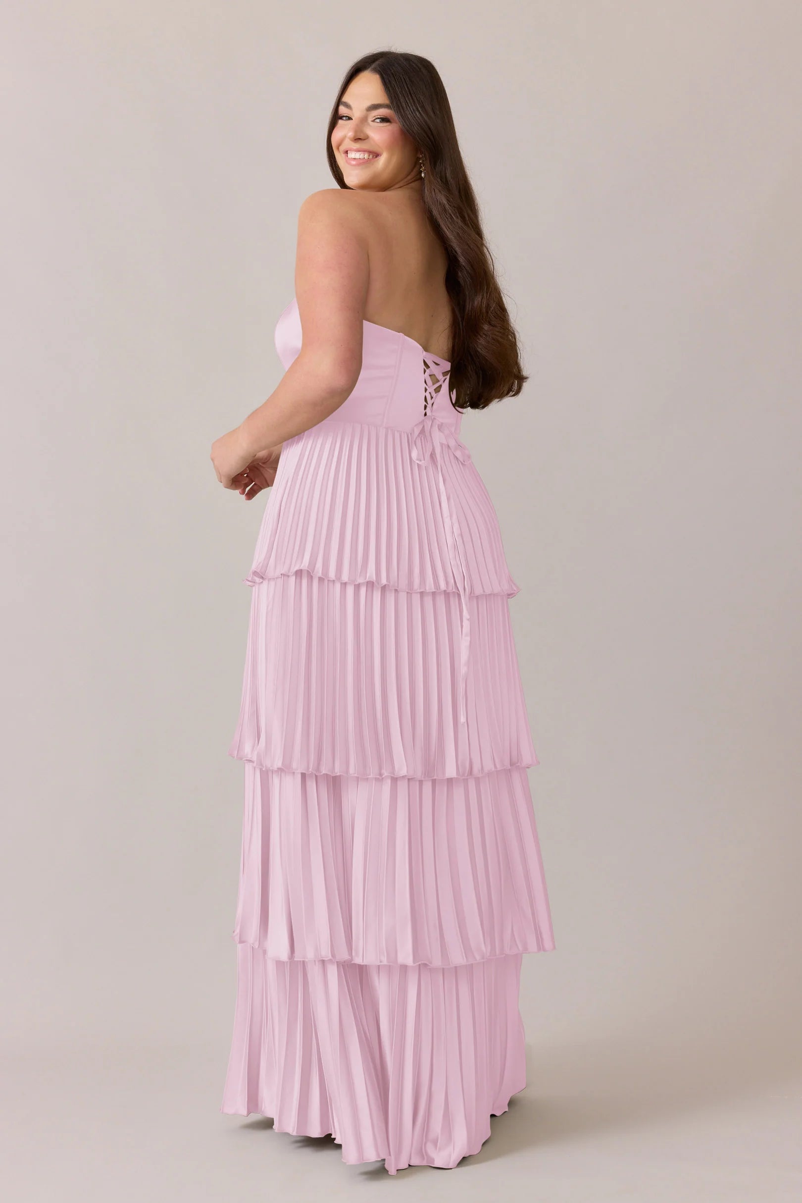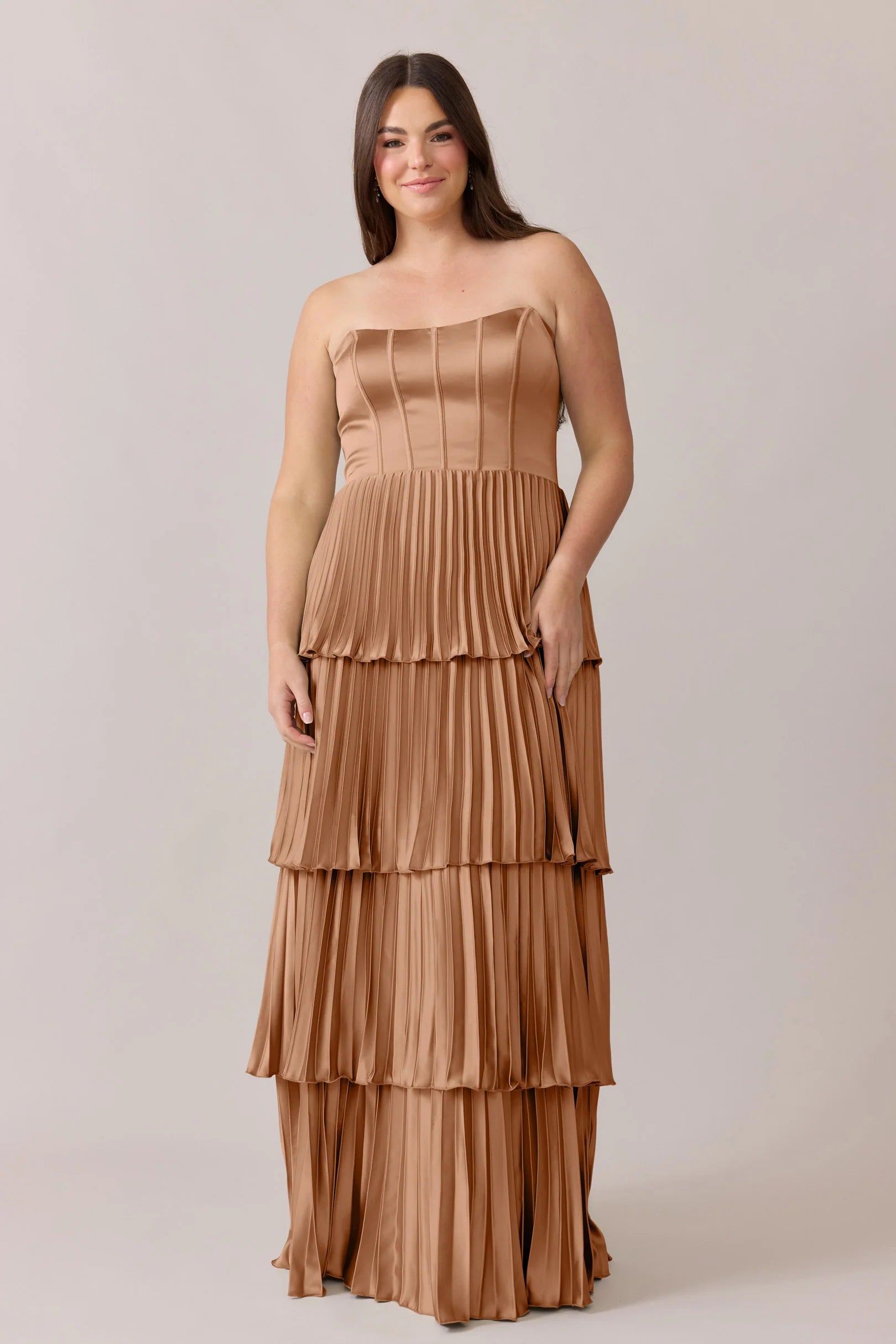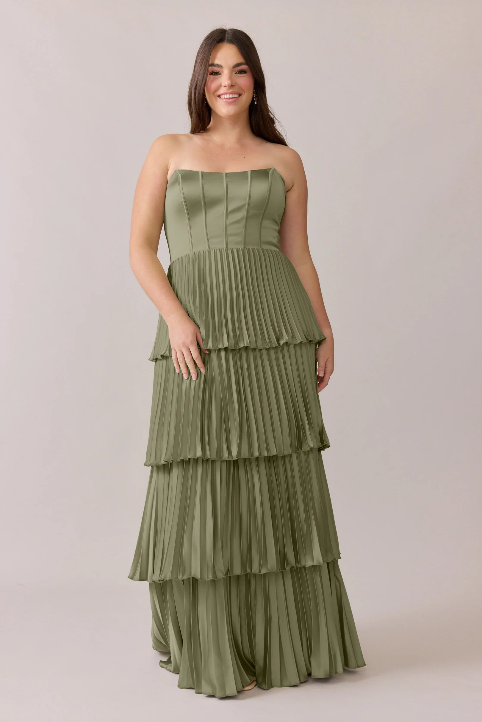 Graceful and refined, the Collins Dress features a strapless A-line silhouette with a cascading four-tier pleated skirt. Built-in bra cups and structured boning provide seamless support, while a lace-up back and hidden zipper offer a tailored fit. Fully lined for smooth coverage, Ellapink is an effortlessly timeless choice—modern, modest, and endlessly flattering.
