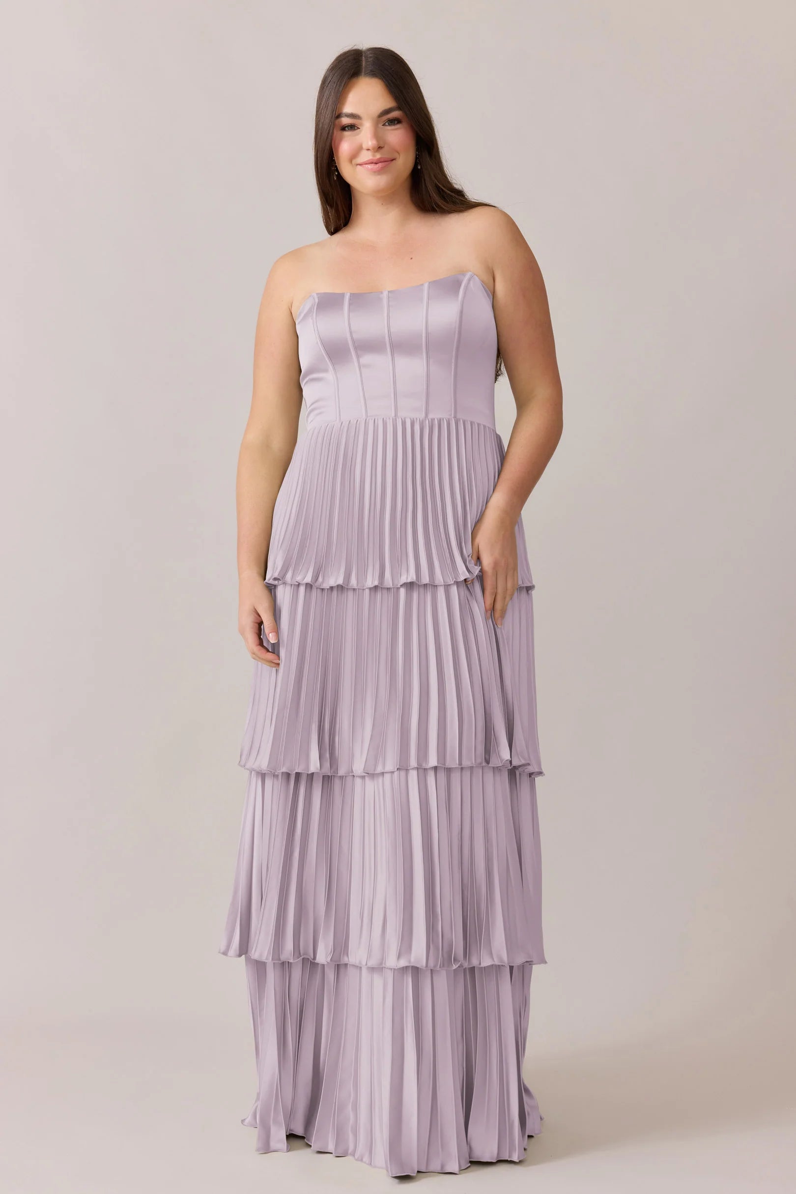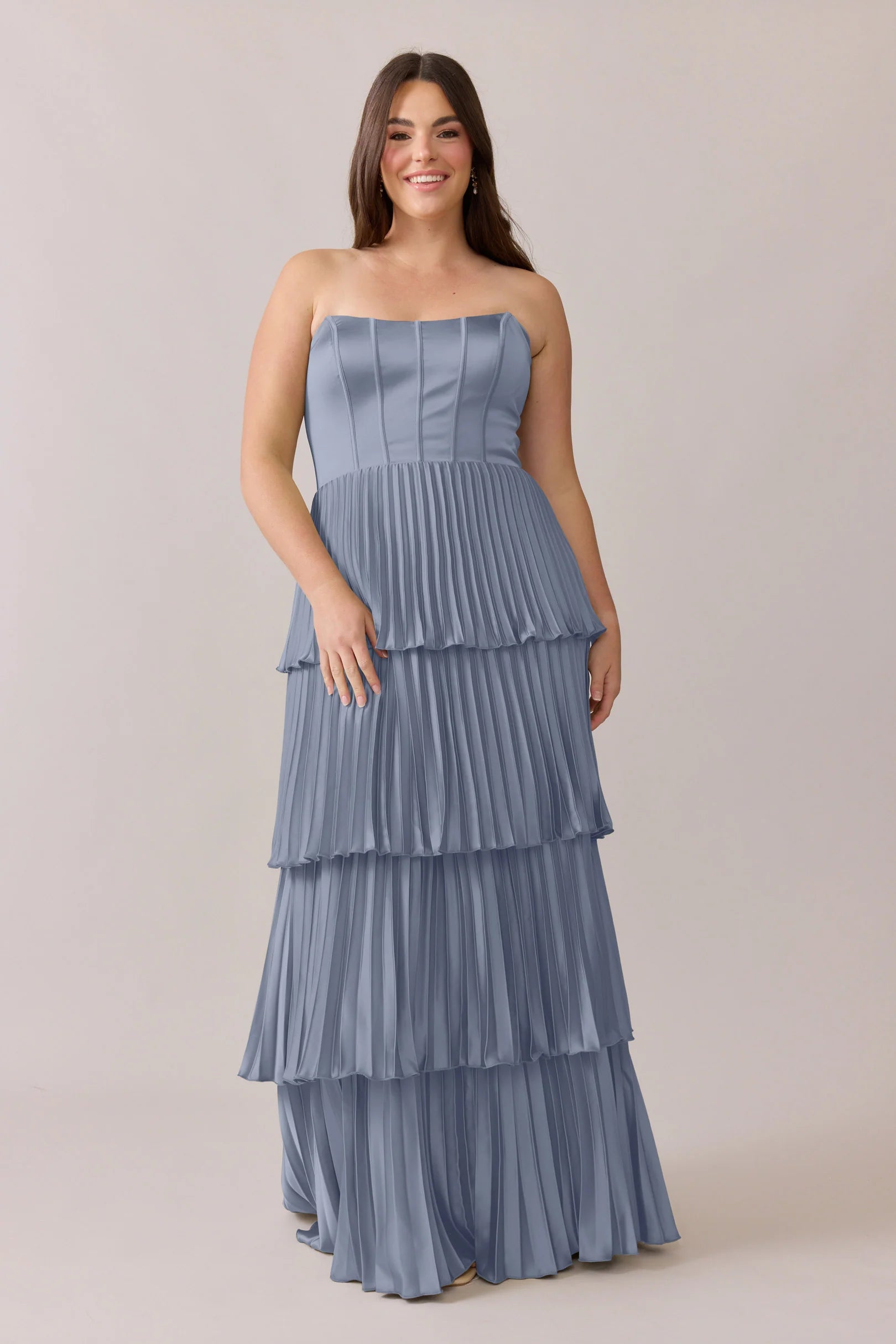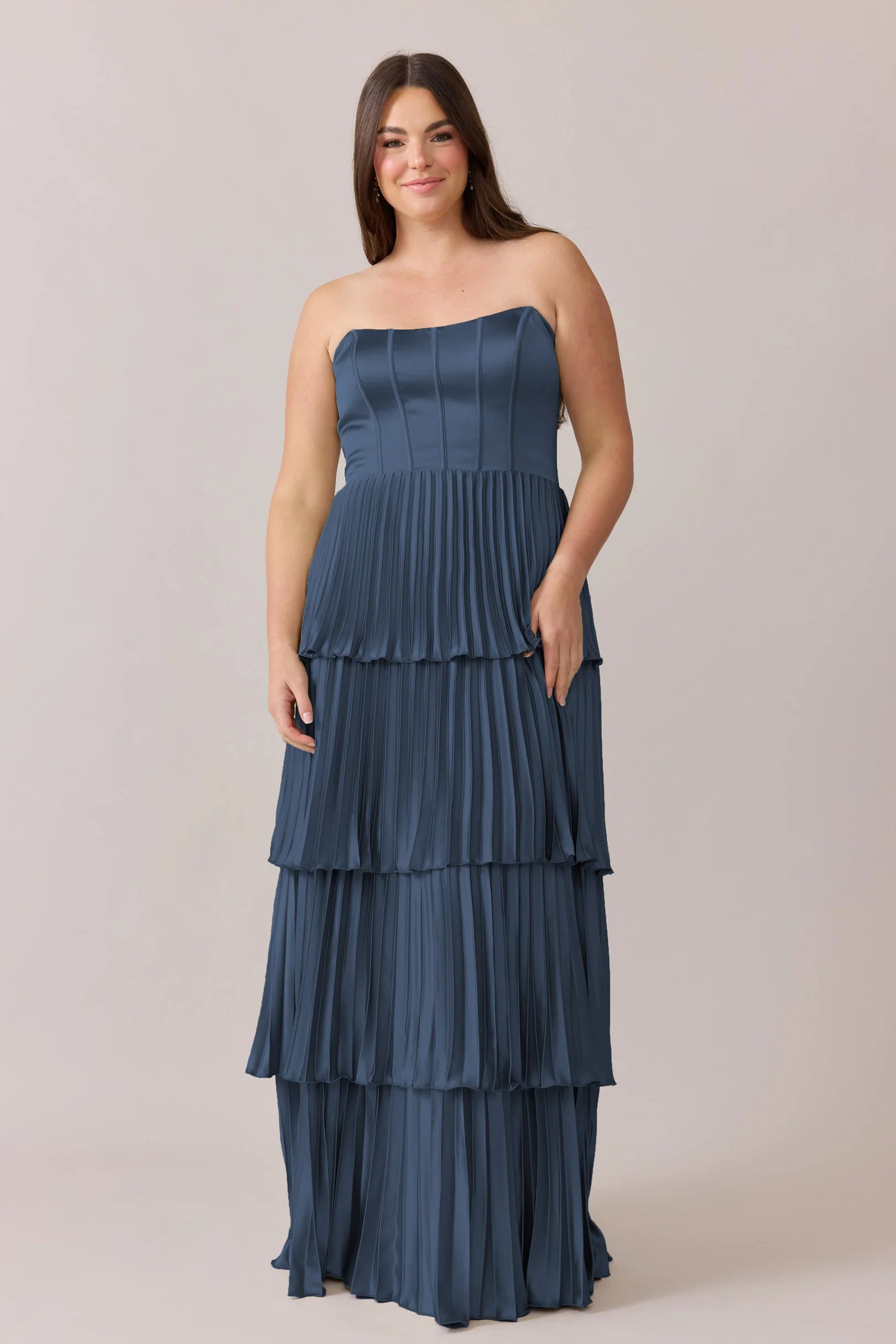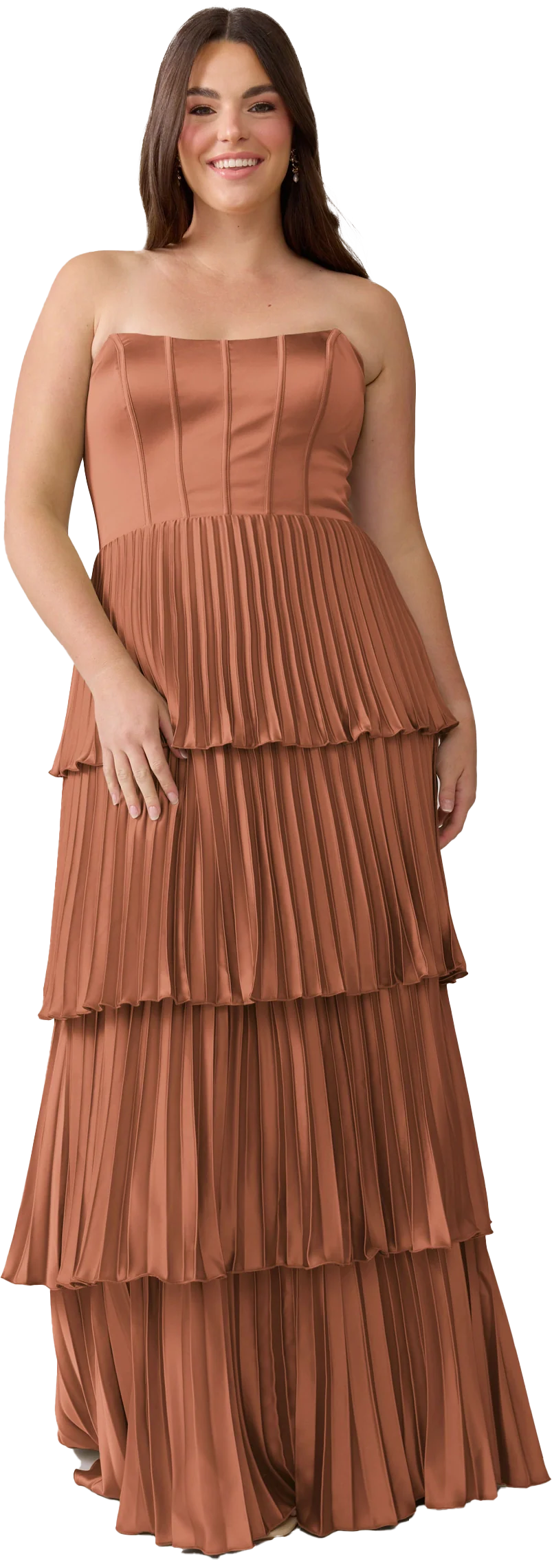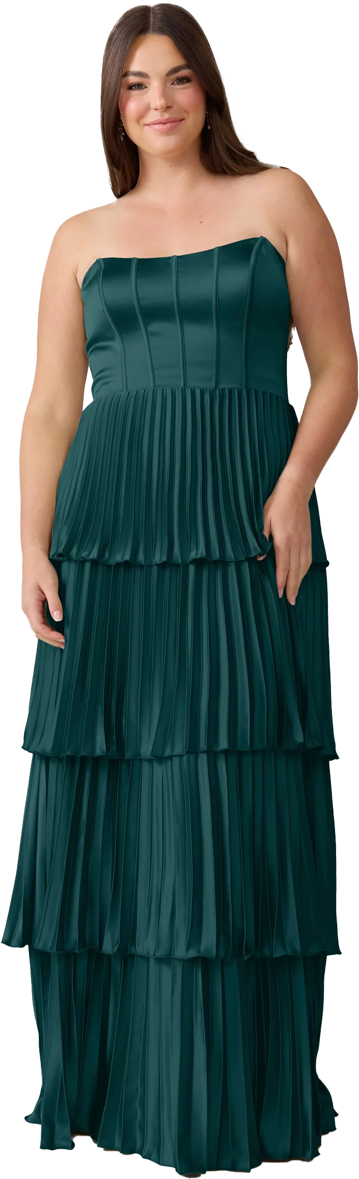 Graceful and refined, the Collins Dress features a strapless A-line silhouette with a cascading four-tier pleated skirt. Built-in bra cups and structured boning provide seamless support, while a lace-up back and hidden zipper offer a tailored fit. Fully lined for smooth coverage, Ellapink is an effortlessly timeless choice—modern, modest, and endlessly flattering.