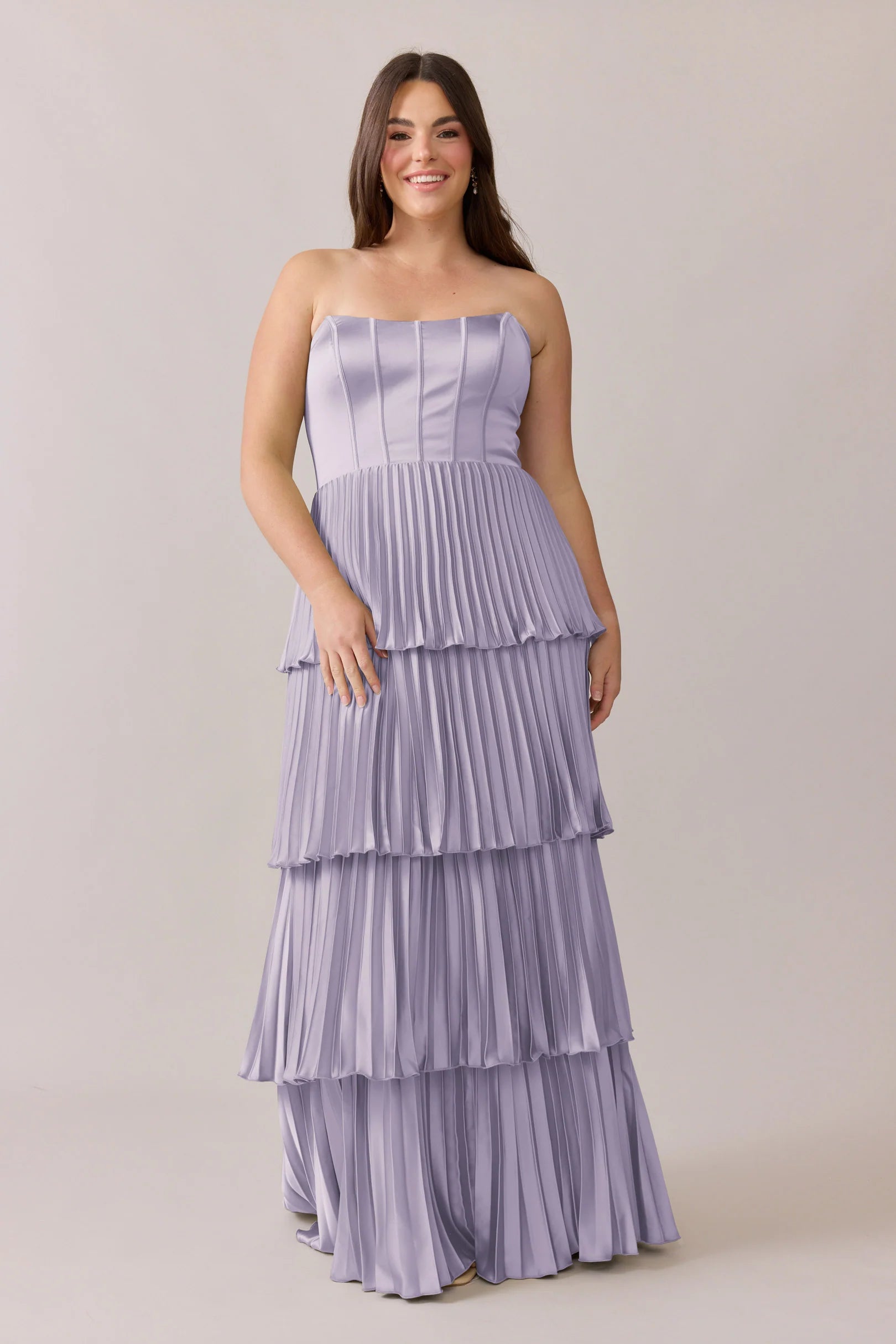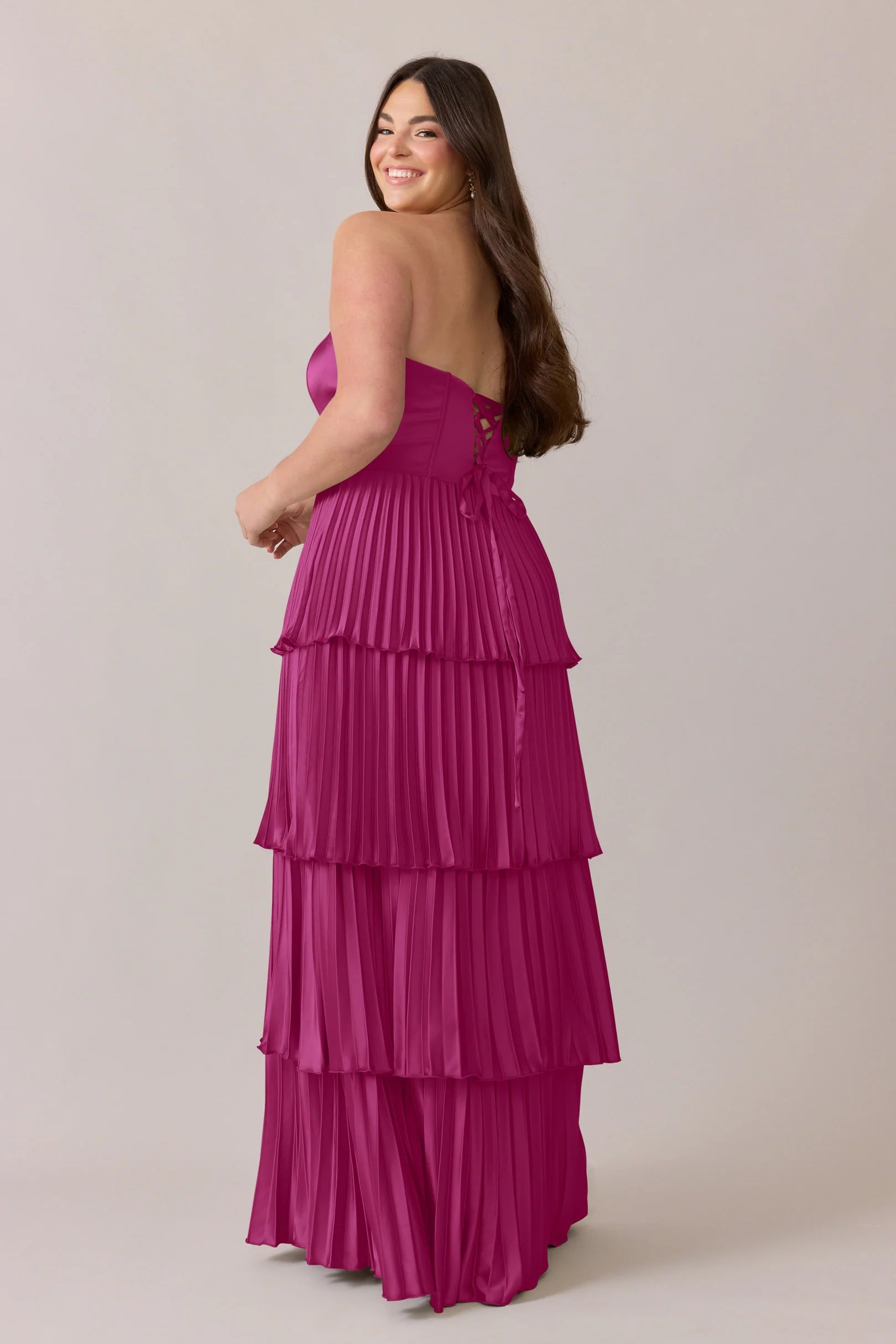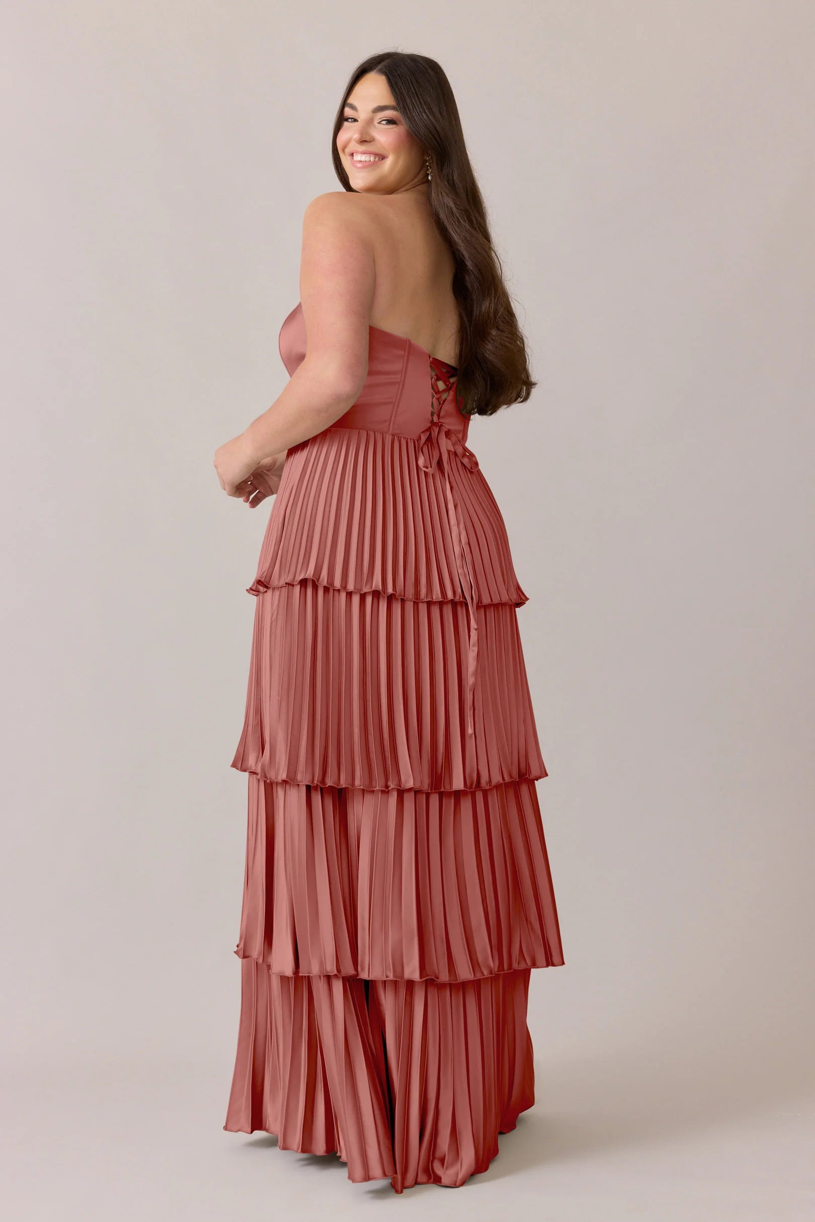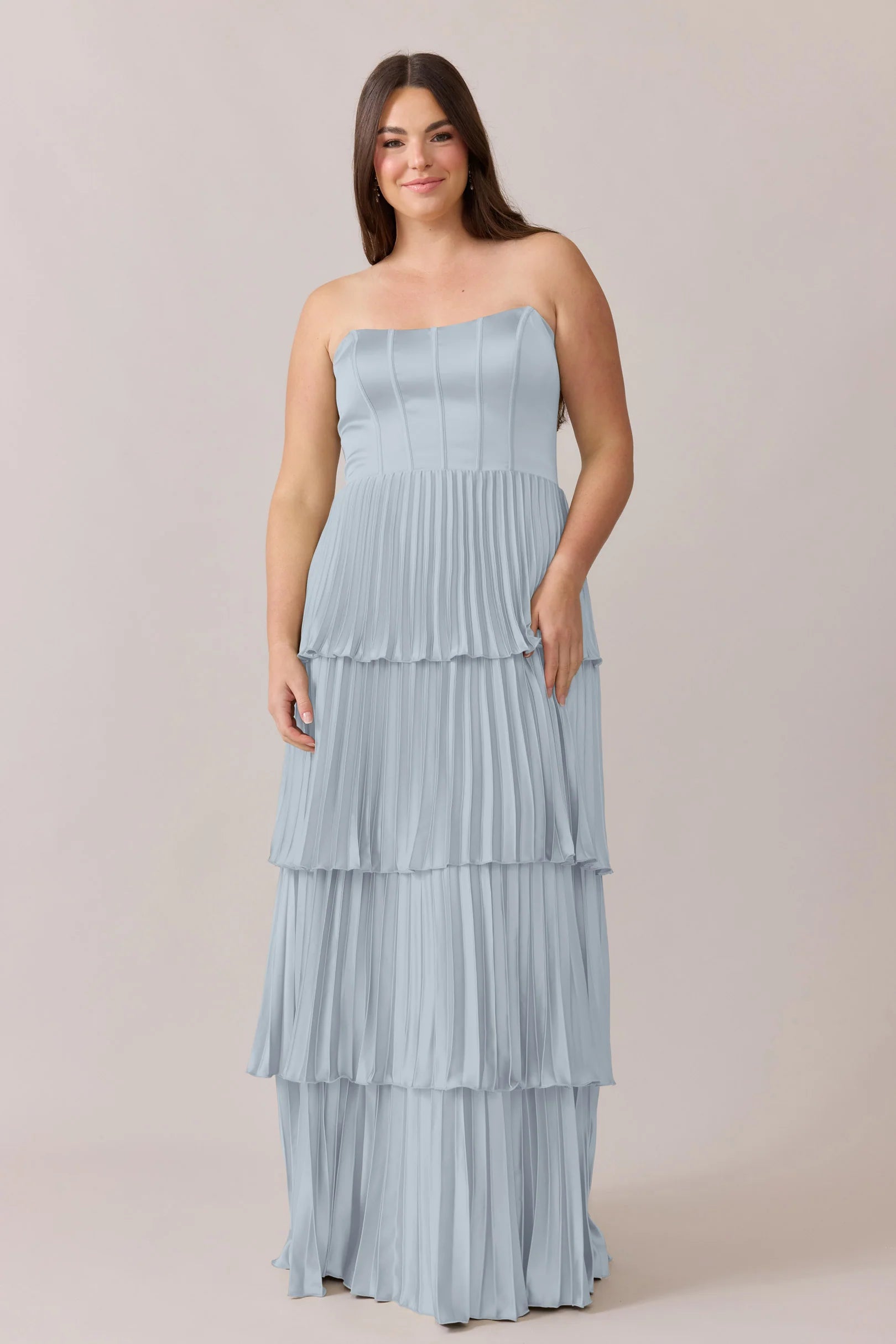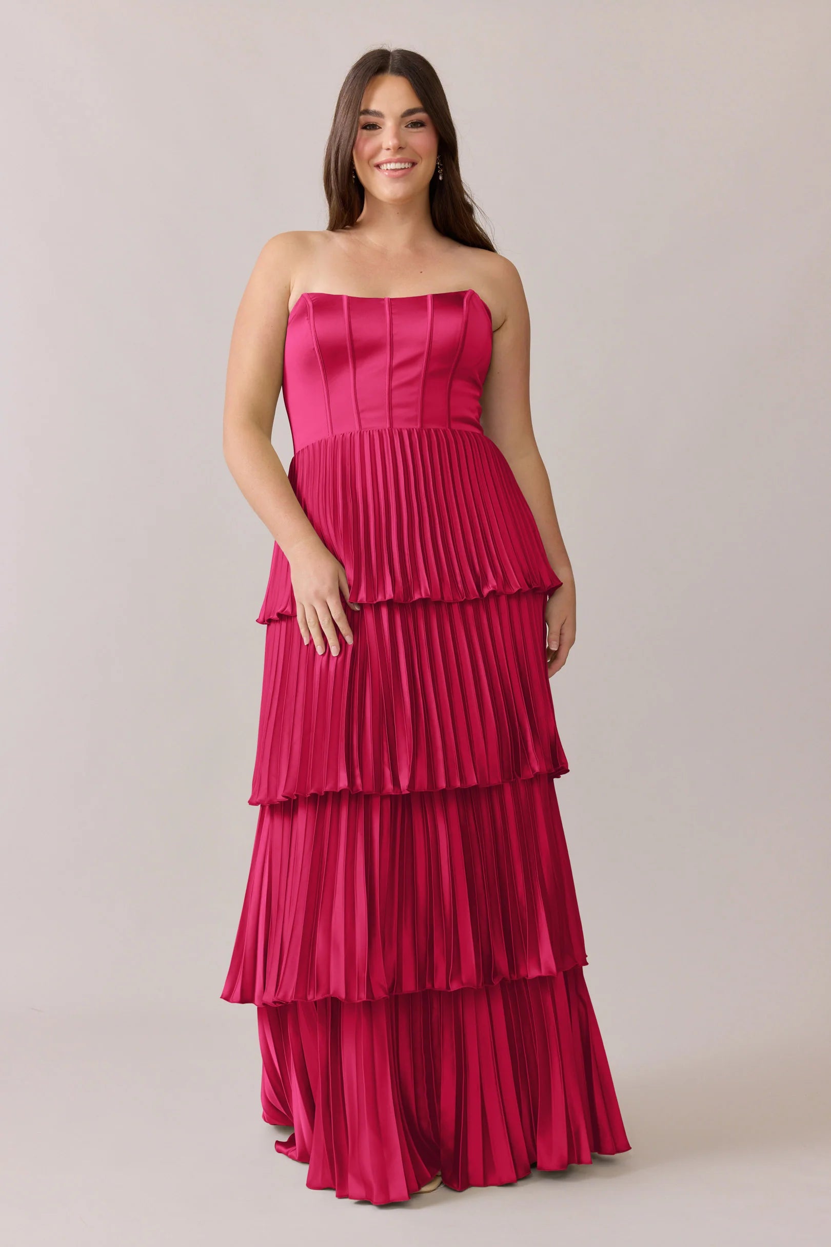 Graceful and refined, the Collins Dress features a strapless A-line silhouette with a cascading four-tier pleated skirt. Built-in bra cups and structured boning provide seamless support, while a lace-up back and hidden zipper offer a tailored fit. Fully lined for smooth coverage, Ellapink is an effortlessly timeless choice—modern, modest, and endlessly flattering.