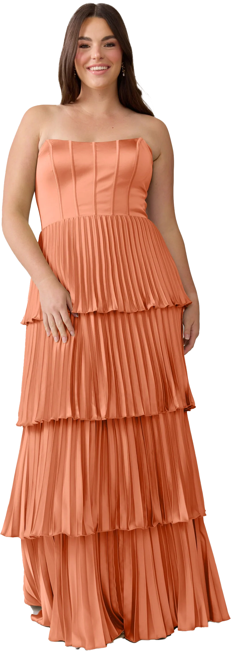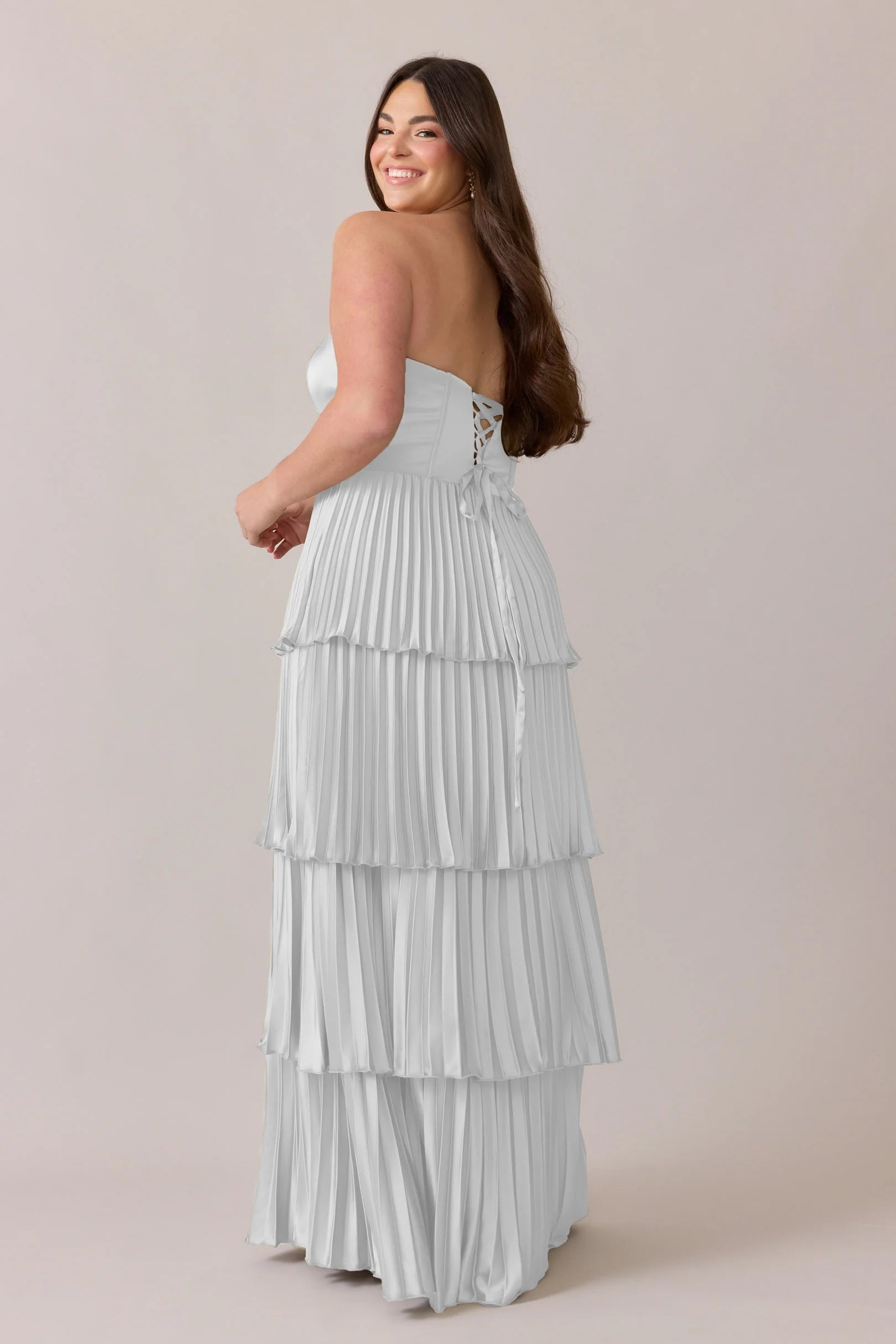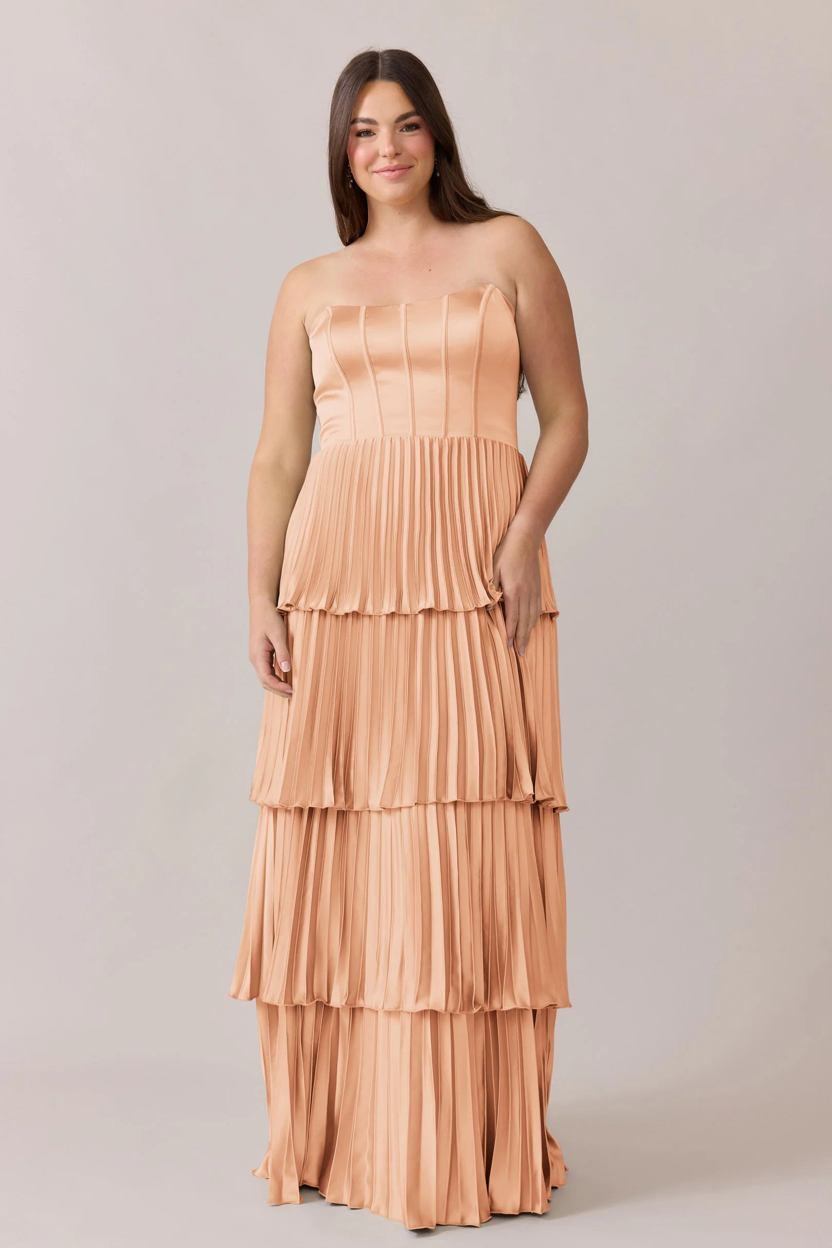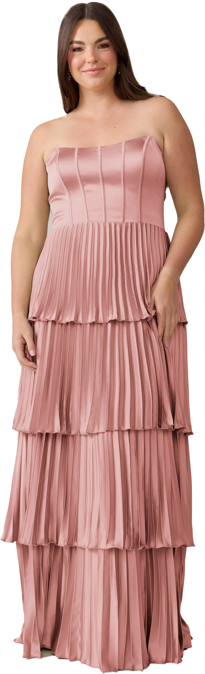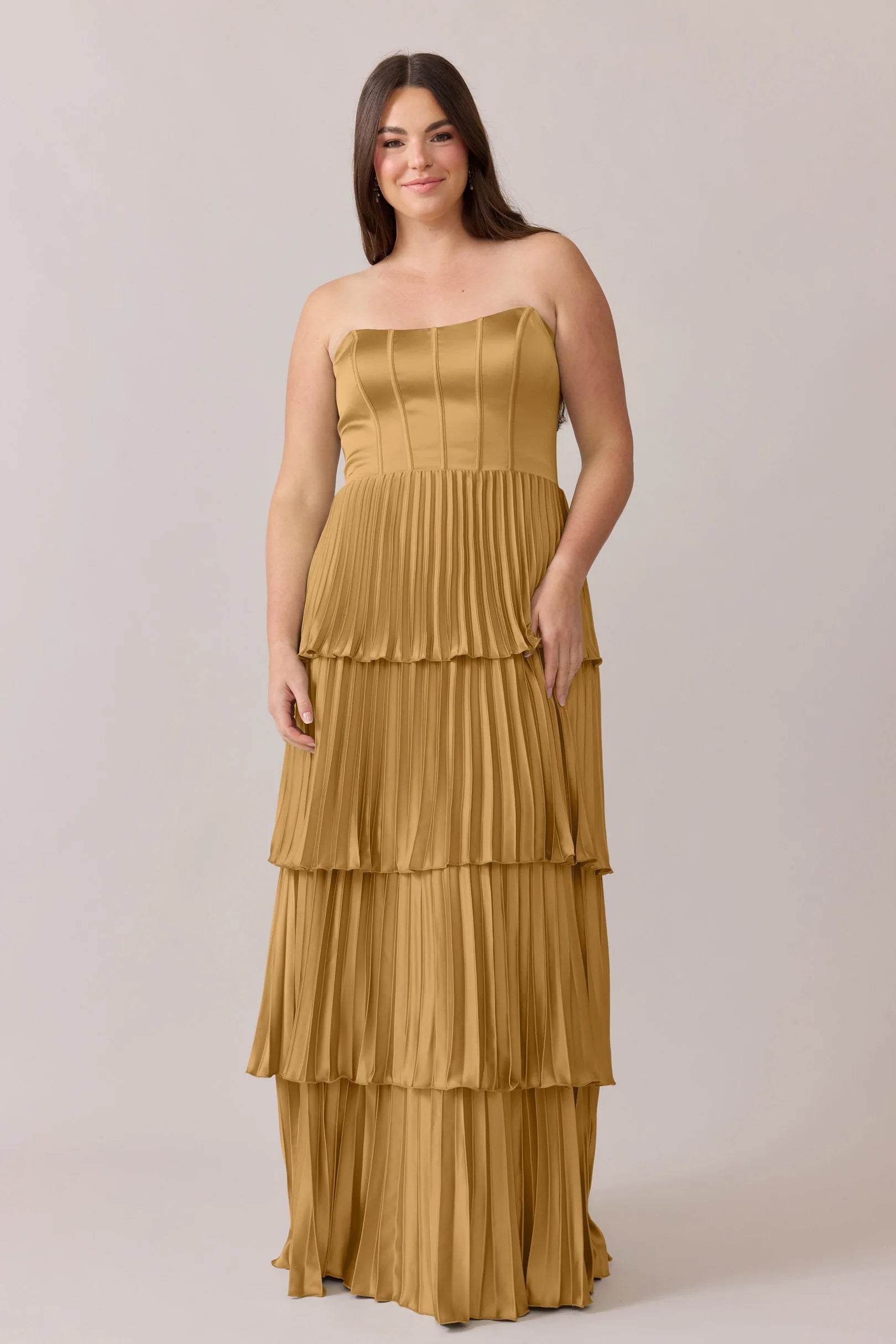 Graceful and refined, the Collins Dress features a strapless A-line silhouette with a cascading four-tier pleated skirt. Built-in bra cups and structured boning provide seamless support, while a lace-up back and hidden zipper offer a tailored fit. Fully lined for smooth coverage, Ellapink is an effortlessly timeless choice—modern, modest, and endlessly flattering.