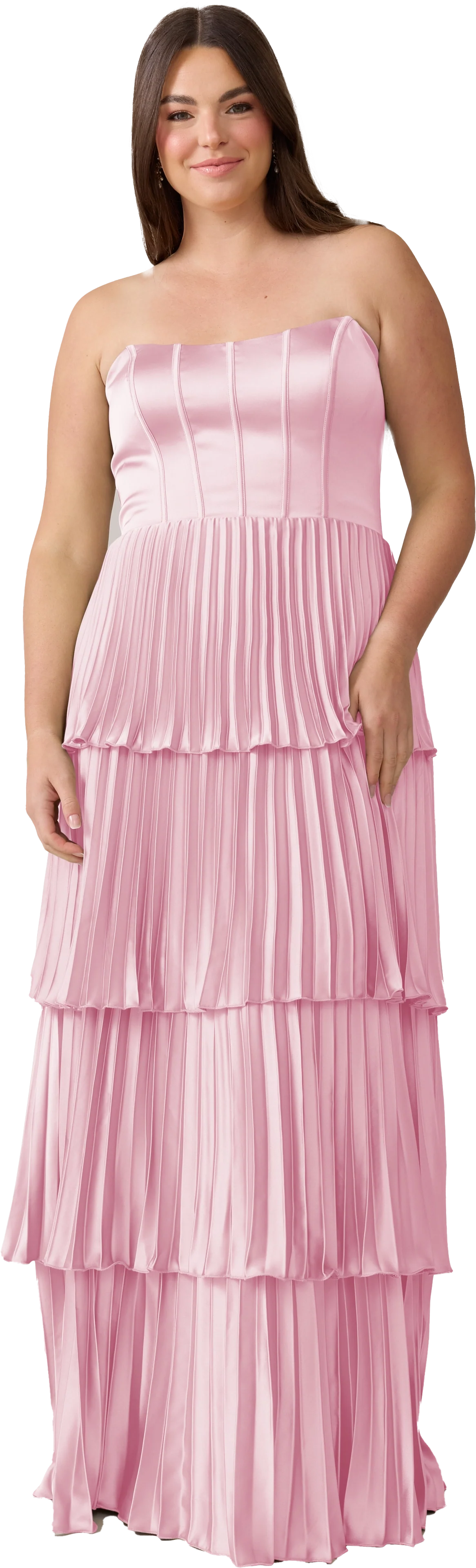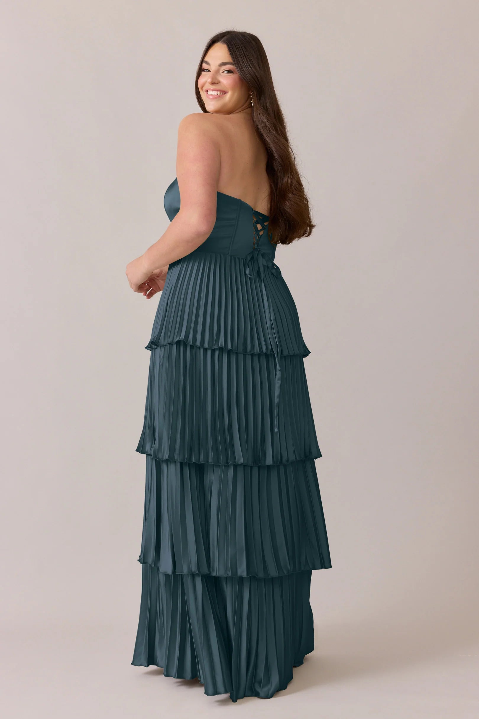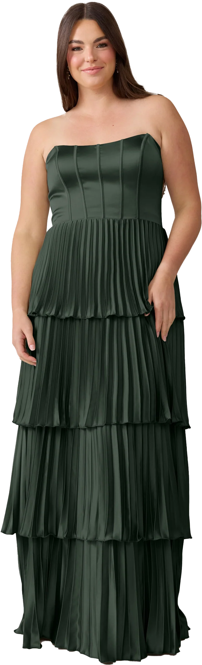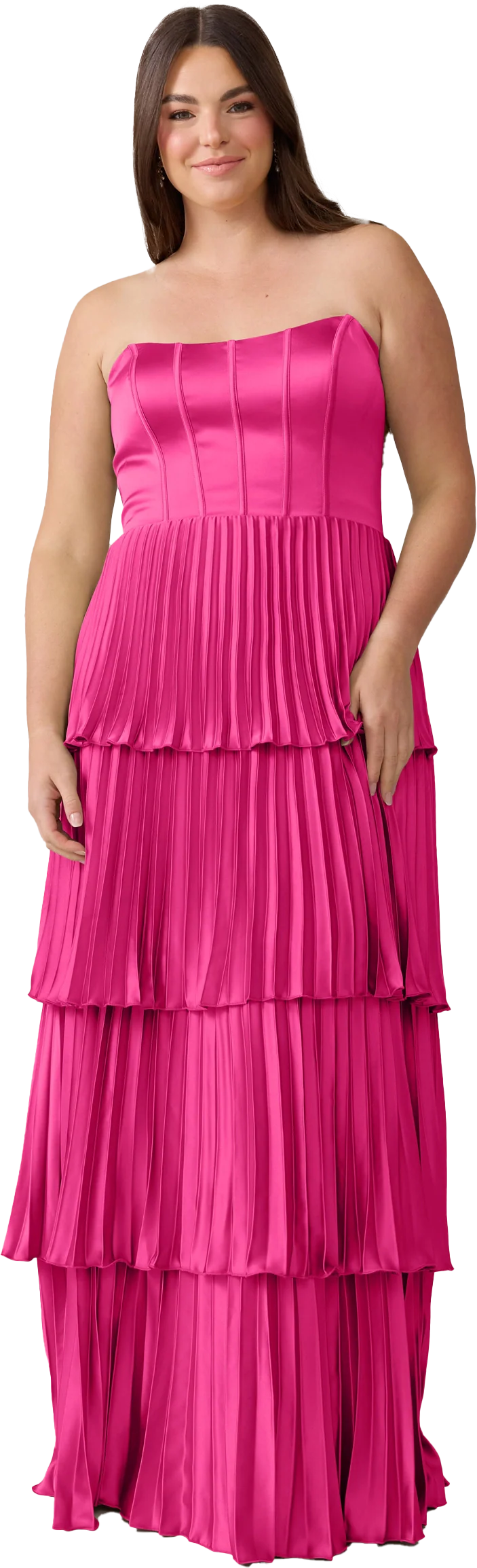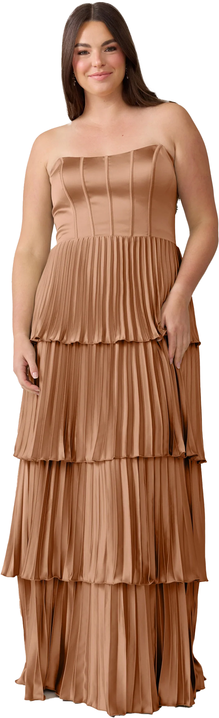 Graceful and refined, the Collins Dress features a strapless A-line silhouette with a cascading four-tier pleated skirt. Built-in bra cups and structured boning provide seamless support, while a lace-up back and hidden zipper offer a tailored fit. Fully lined for smooth coverage, Ellapink is an effortlessly timeless choice—modern, modest, and endlessly flattering.