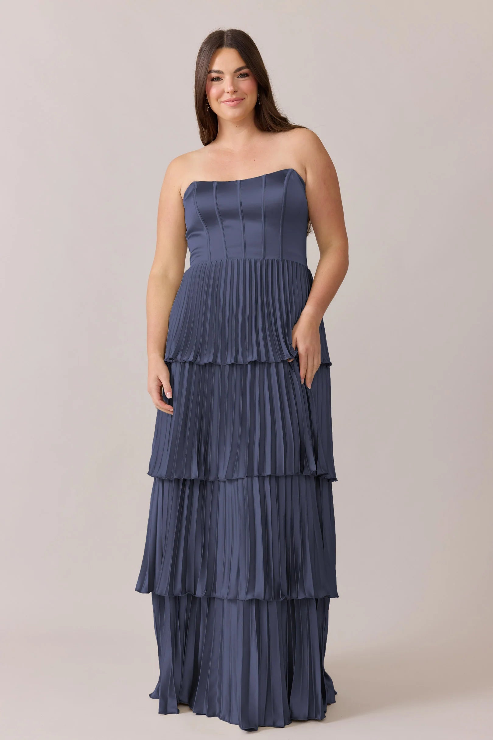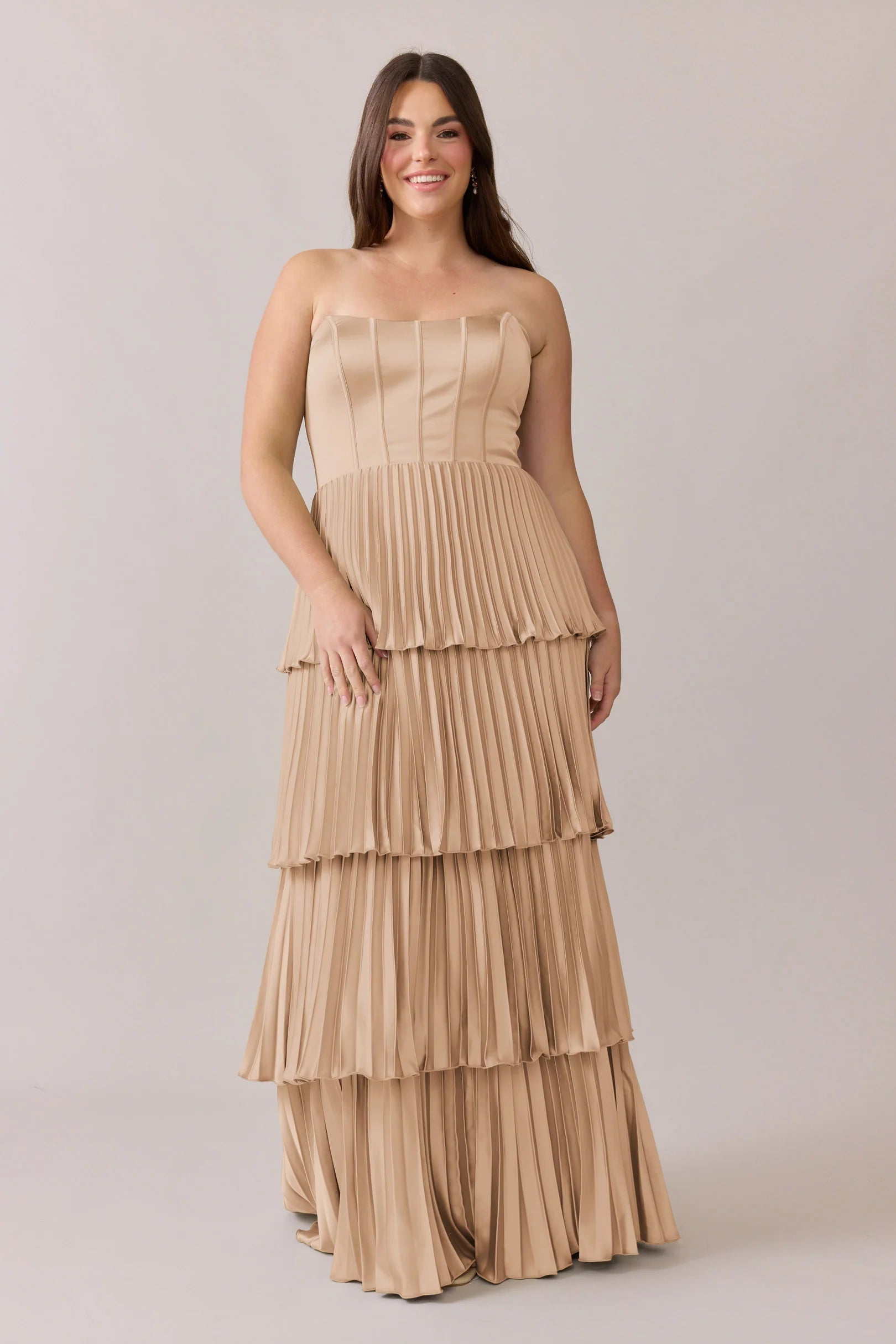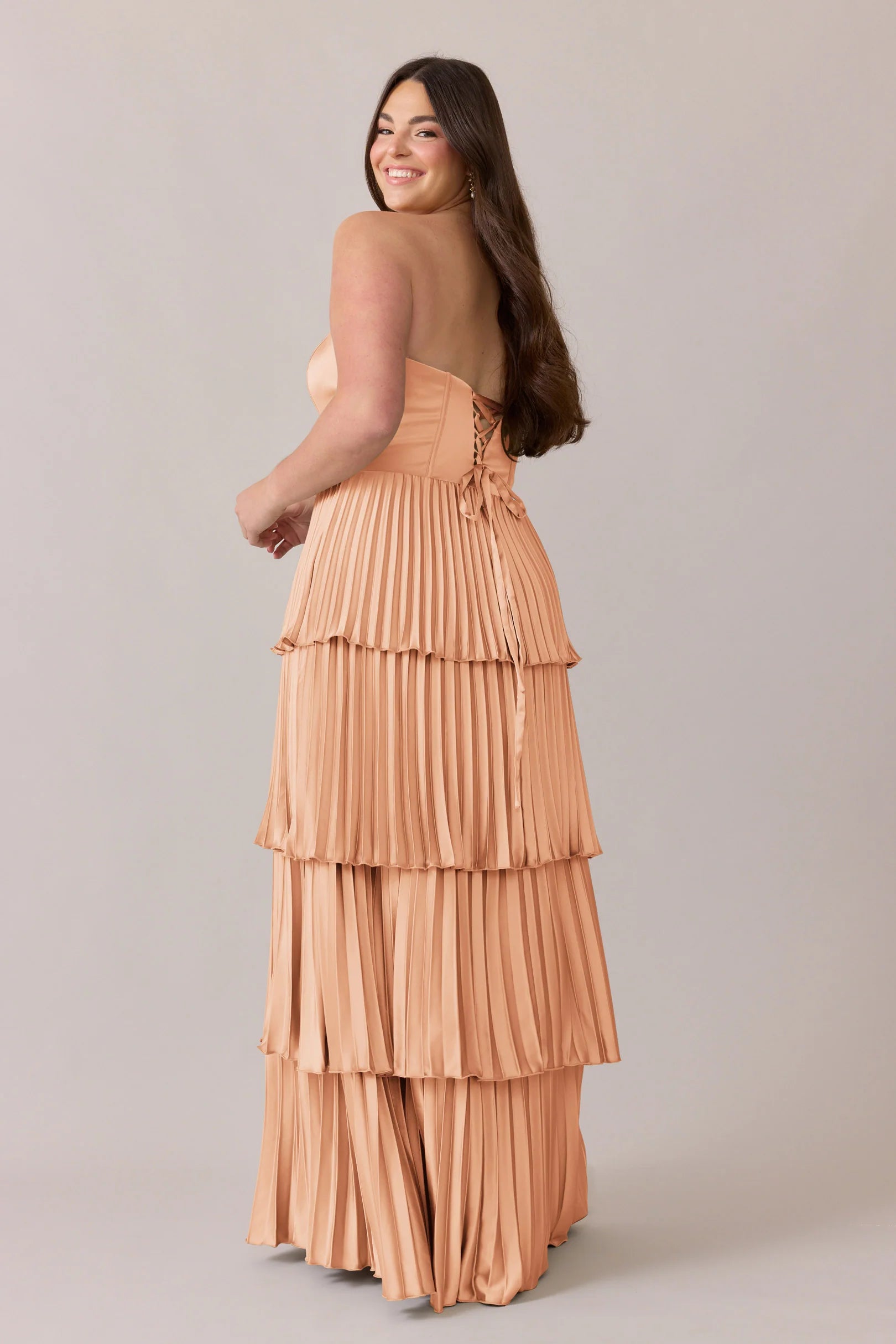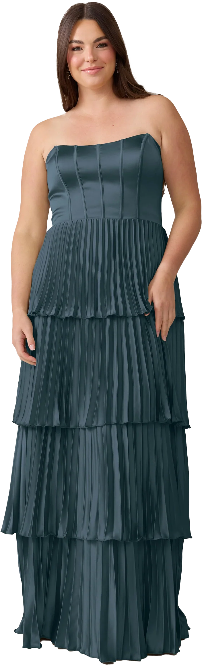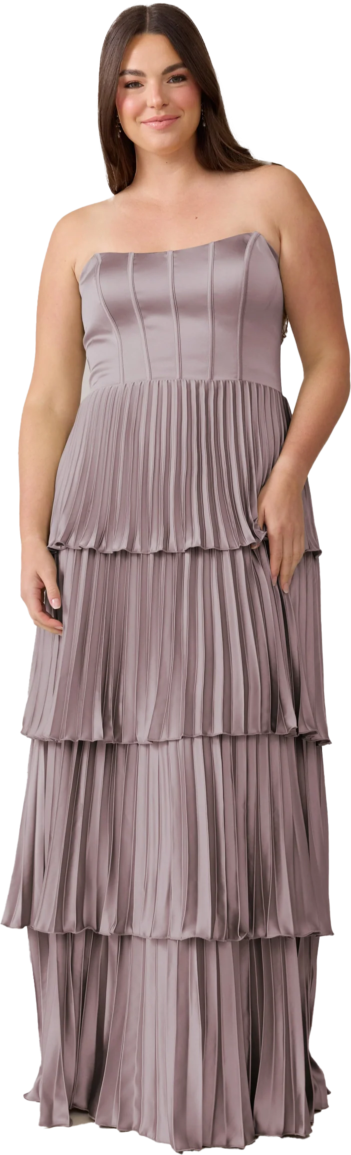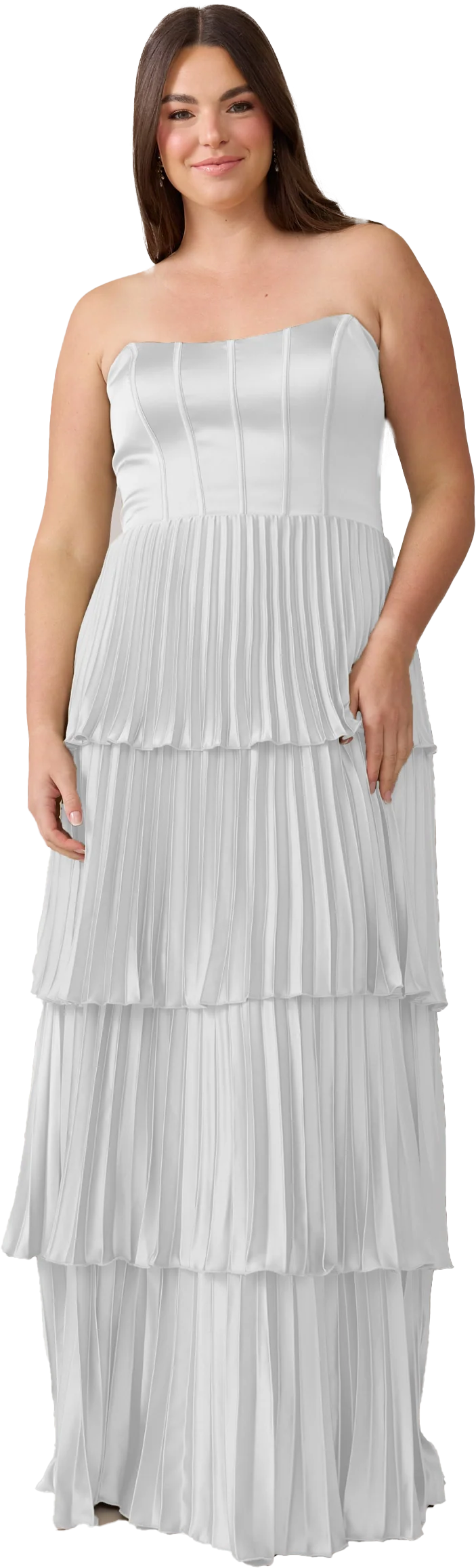 Graceful and refined, the Collins Dress features a strapless A-line silhouette with a cascading four-tier pleated skirt. Built-in bra cups and structured boning provide seamless support, while a lace-up back and hidden zipper offer a tailored fit. Fully lined for smooth coverage, Ellapink is an effortlessly timeless choice—modern, modest, and endlessly flattering.