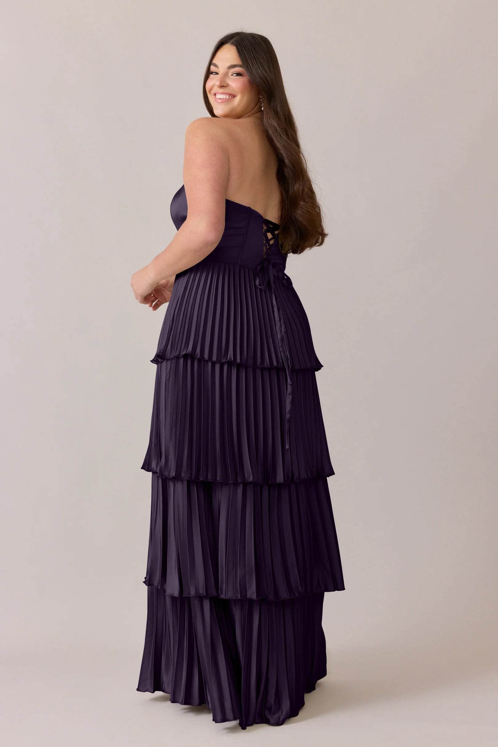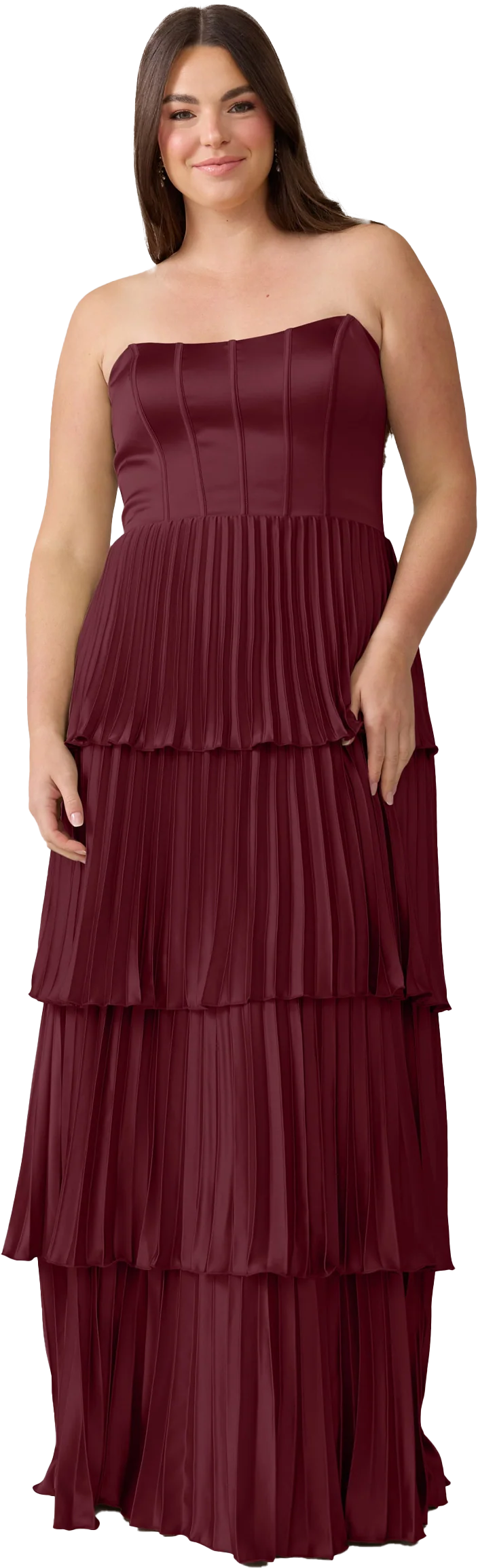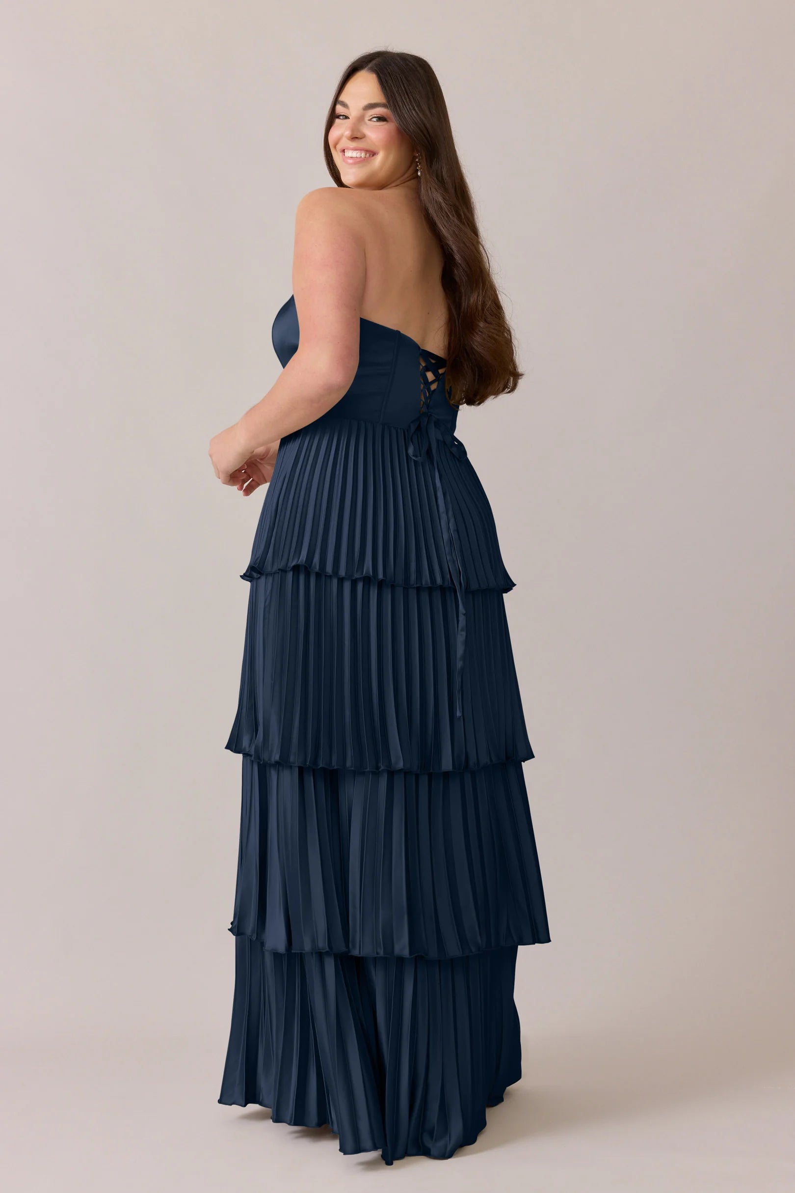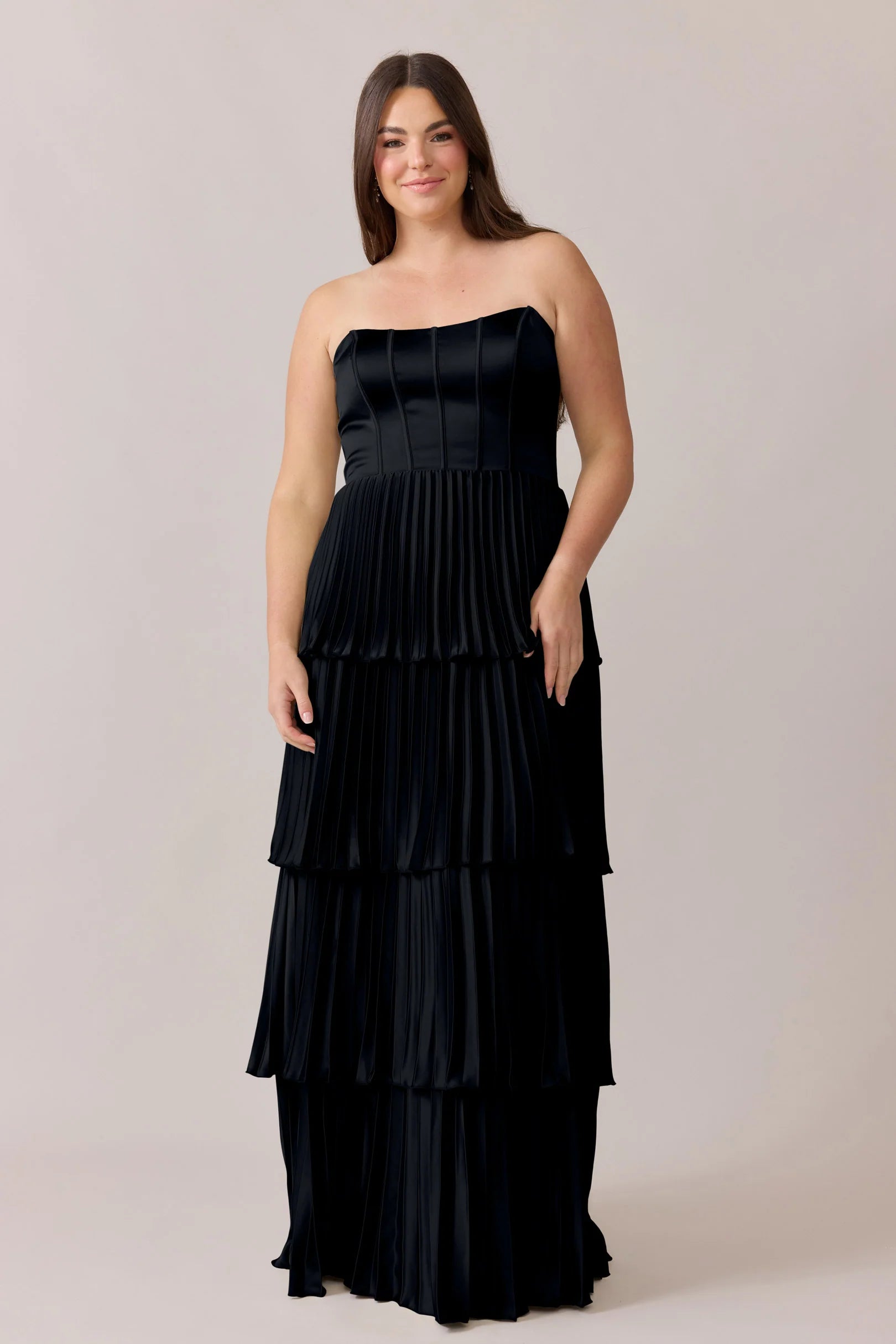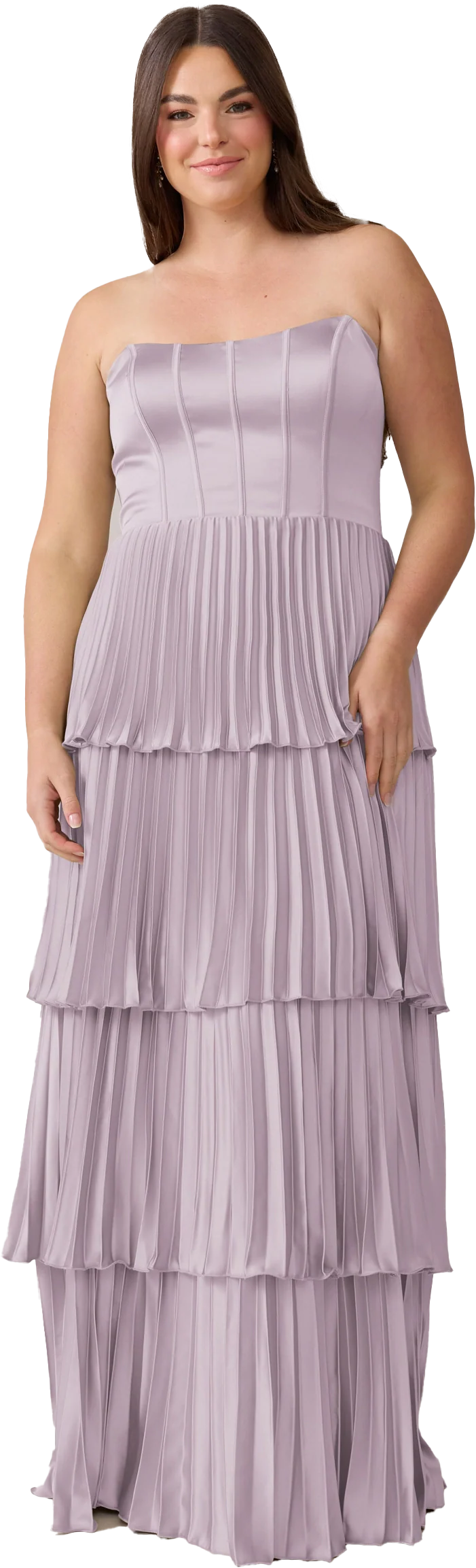 Graceful and refined, the Collins Dress features a strapless A-line silhouette with a cascading four-tier pleated skirt. Built-in bra cups and structured boning provide seamless support, while a lace-up back and hidden zipper offer a tailored fit. Fully lined for smooth coverage, Ellapink is an effortlessly timeless choice—modern, modest, and endlessly flattering.