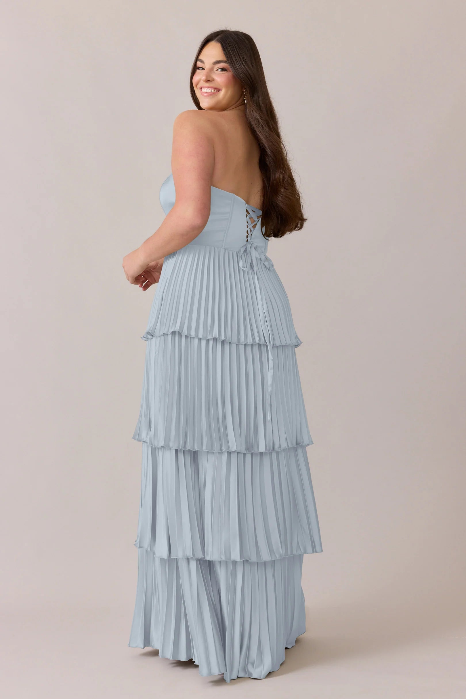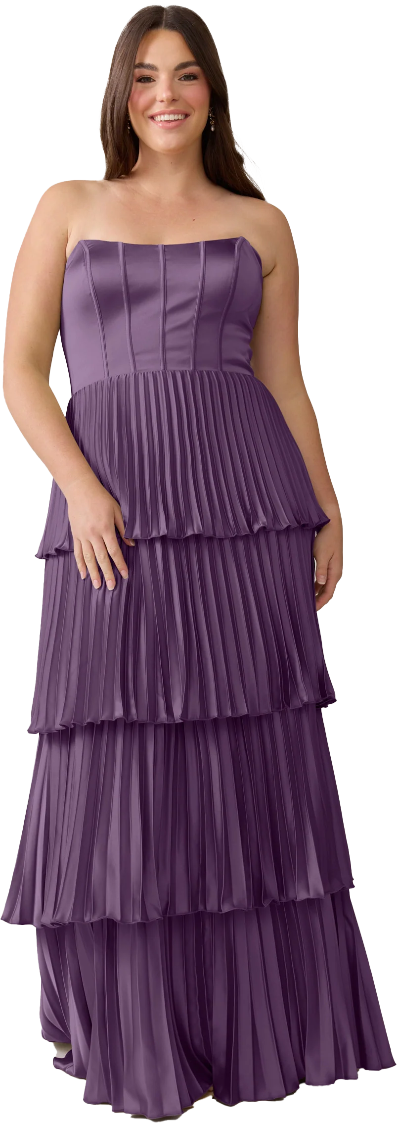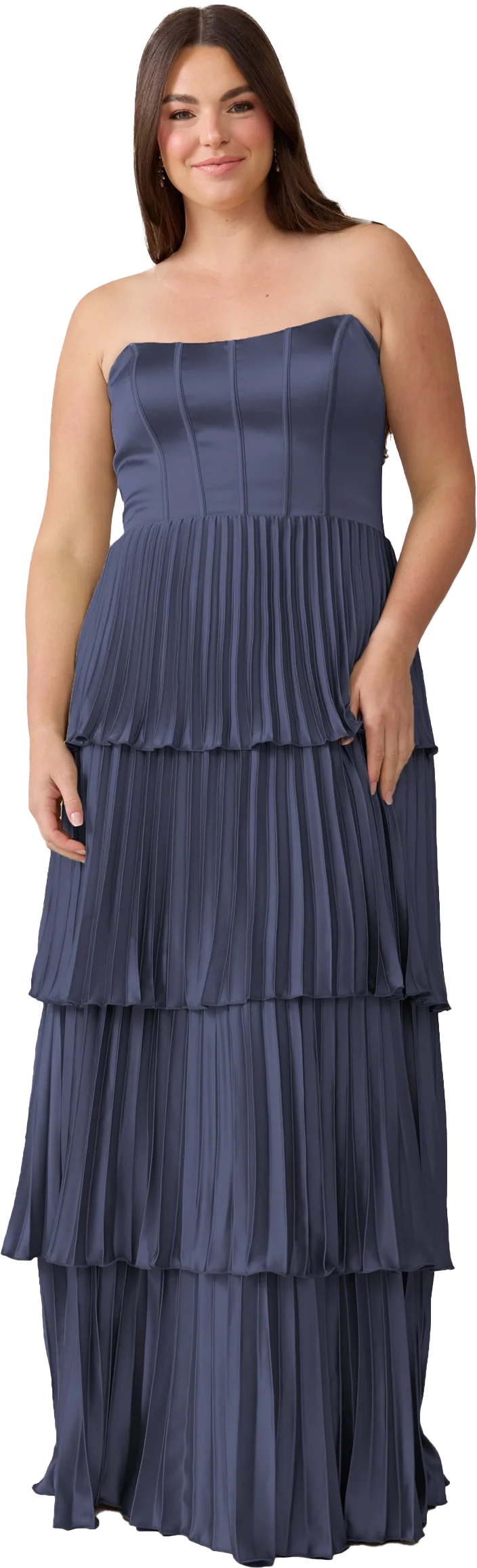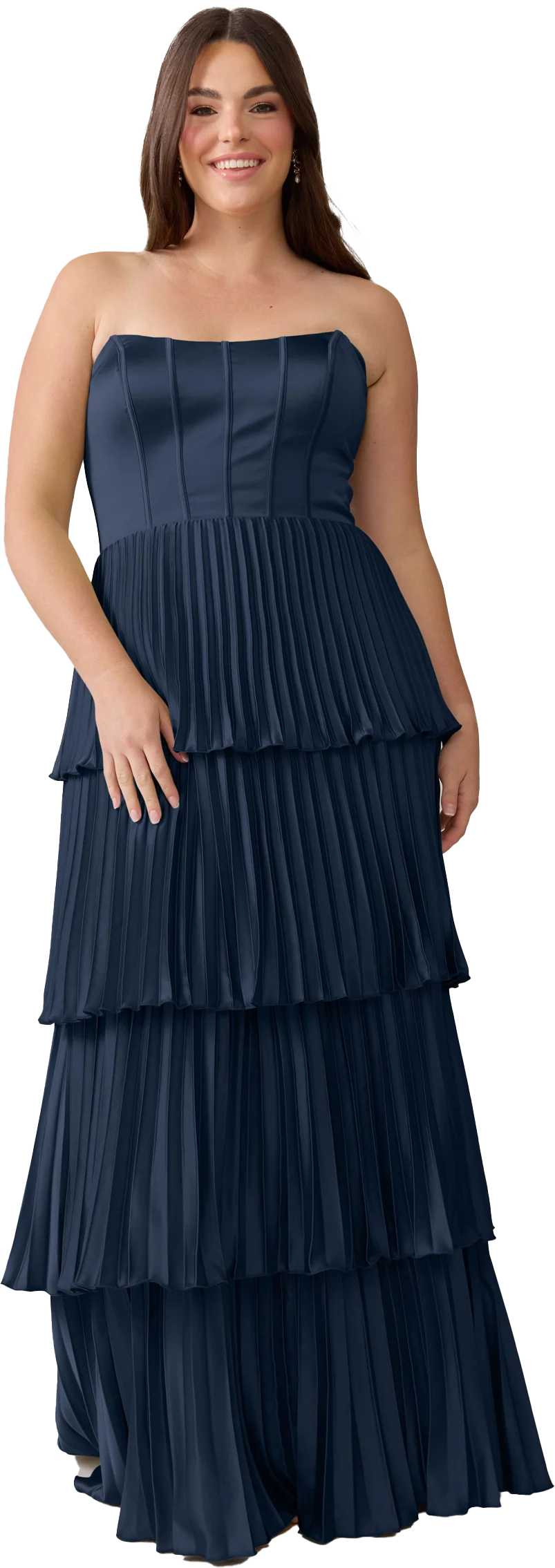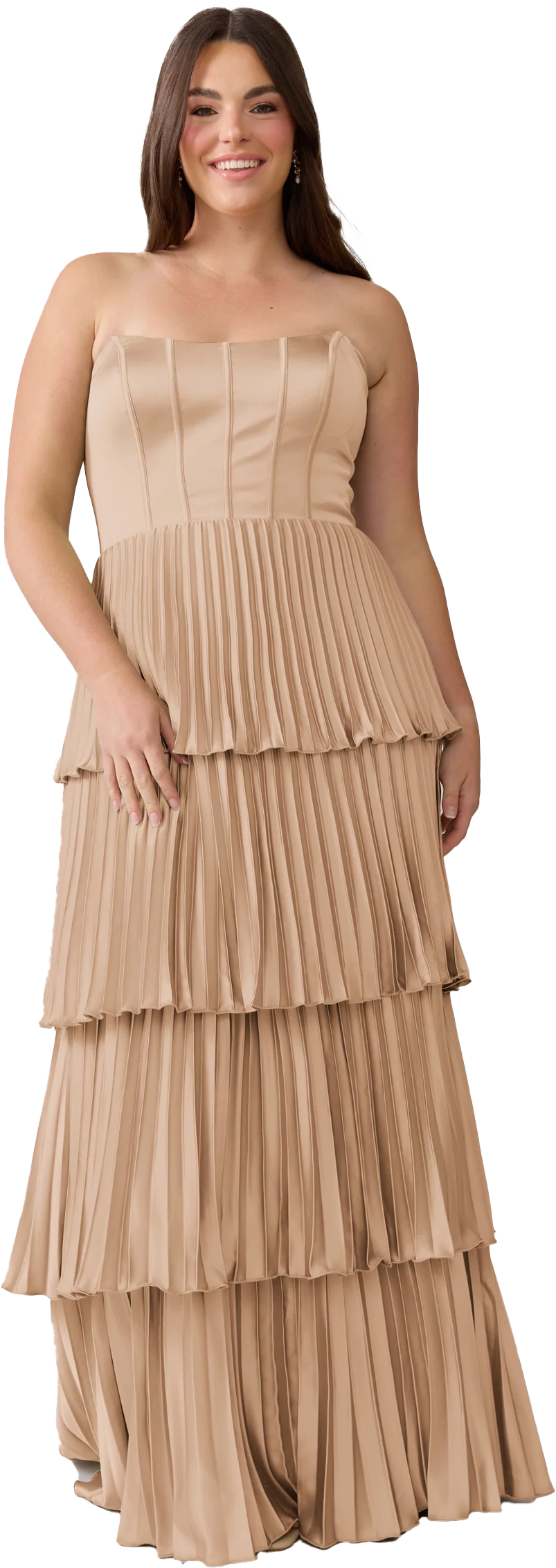 Graceful and refined, the Collins Dress features a strapless A-line silhouette with a cascading four-tier pleated skirt. Built-in bra cups and structured boning provide seamless support, while a lace-up back and hidden zipper offer a tailored fit. Fully lined for smooth coverage, Ellapink is an effortlessly timeless choice—modern, modest, and endlessly flattering.