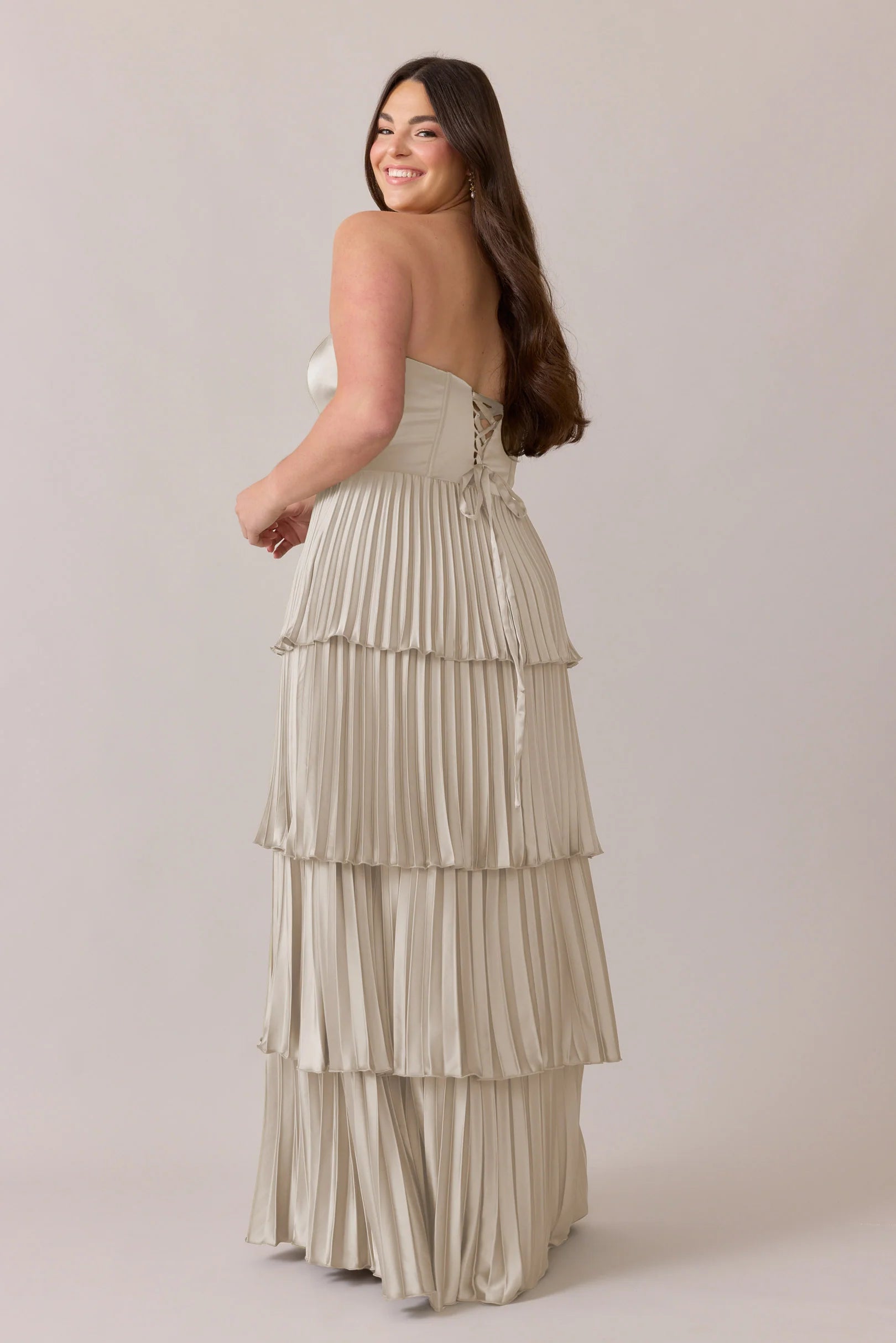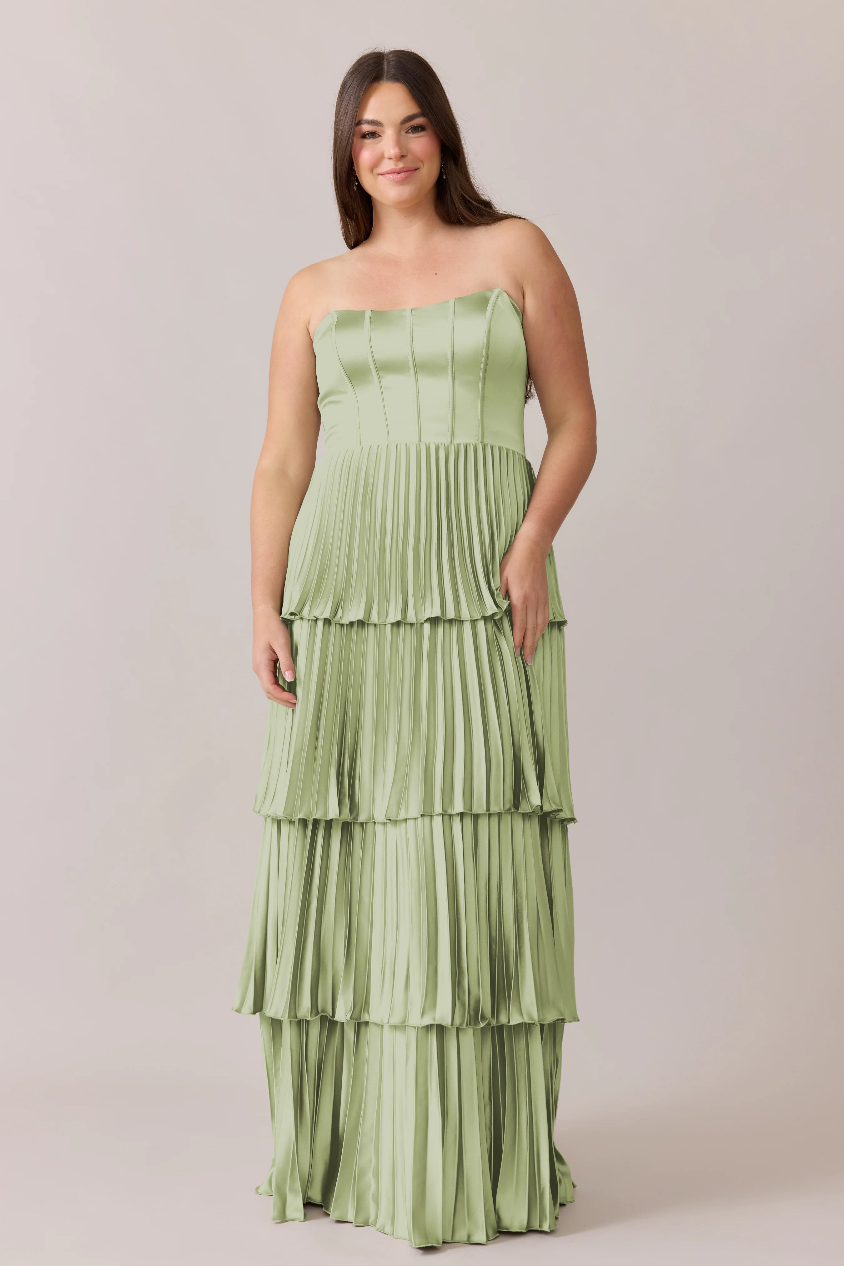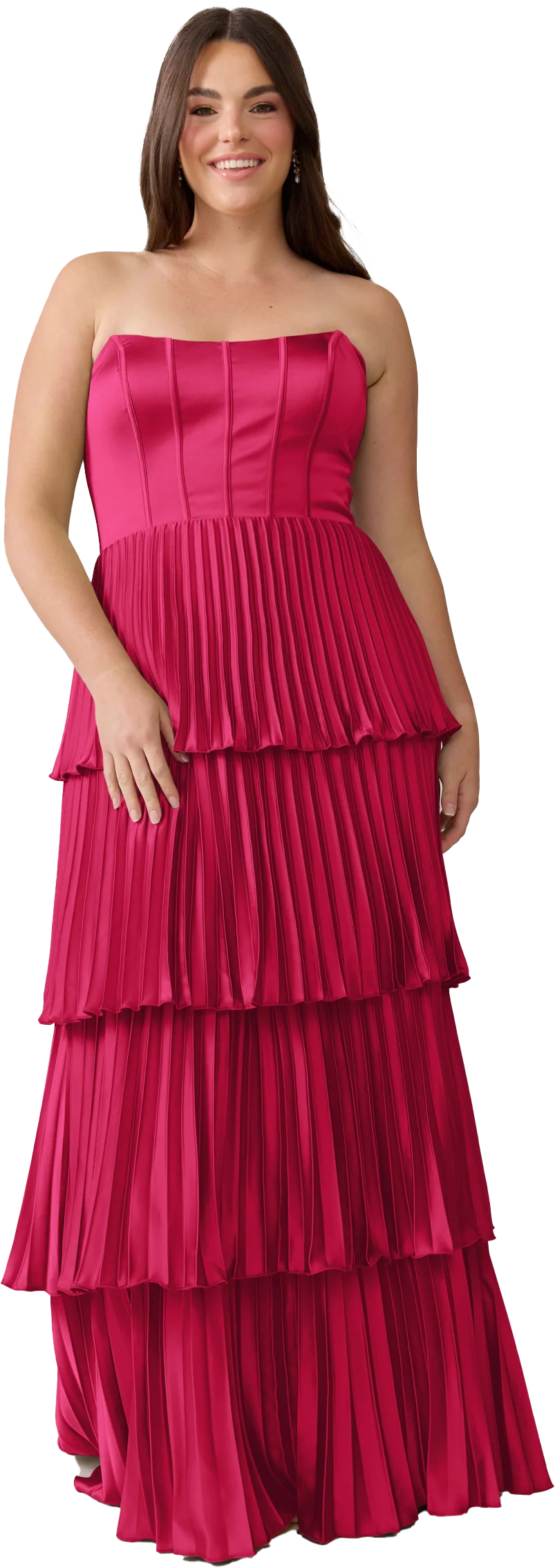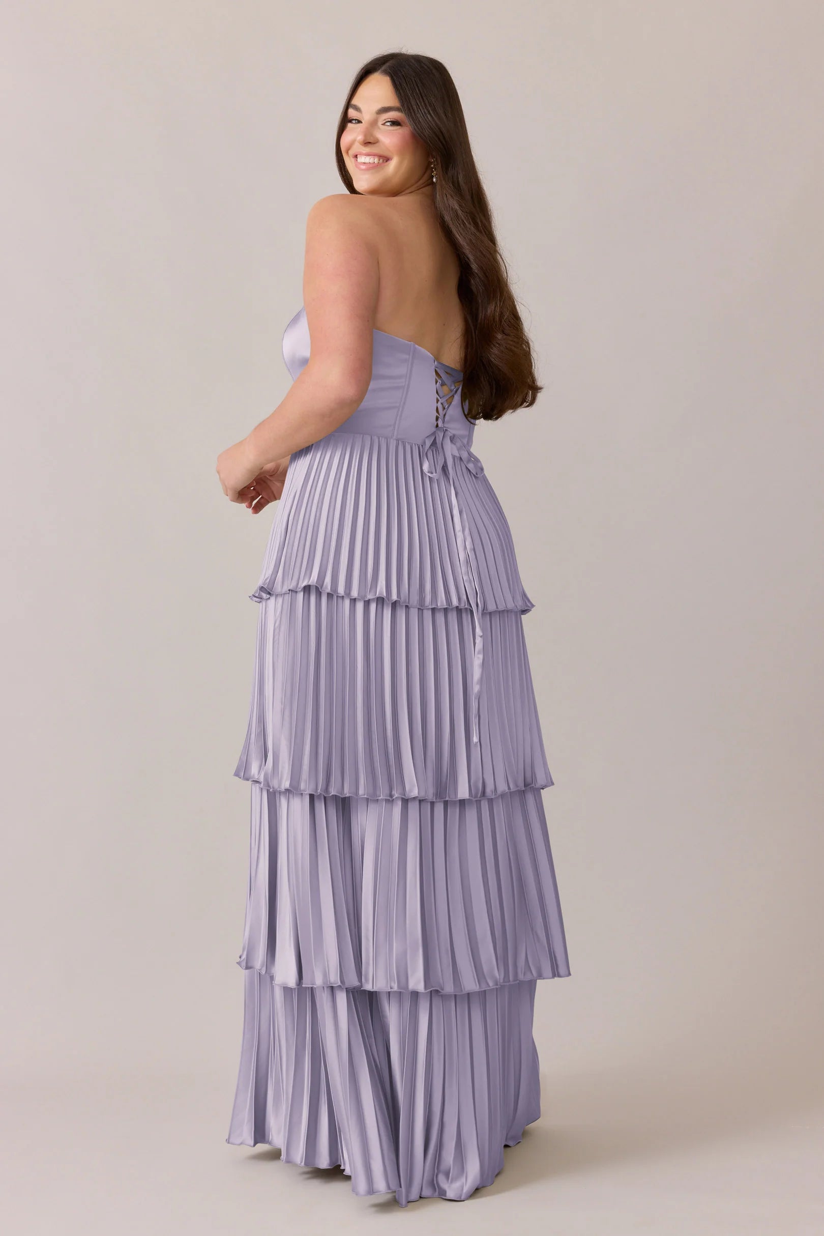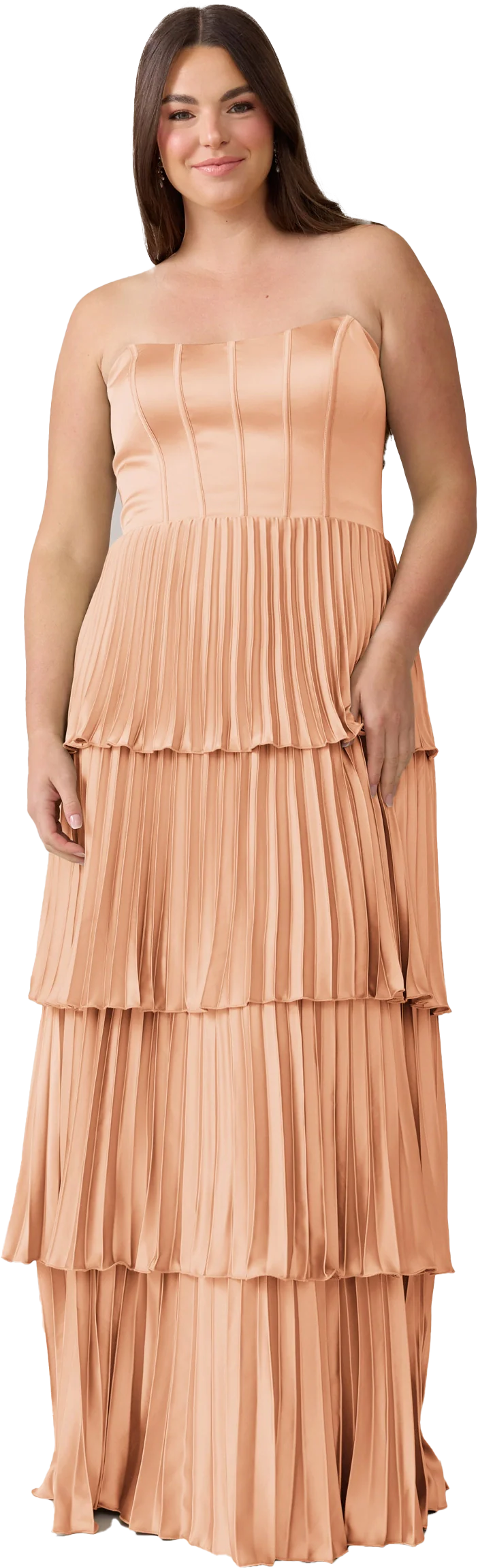 Graceful and refined, the Collins Dress features a strapless A-line silhouette with a cascading four-tier pleated skirt. Built-in bra cups and structured boning provide seamless support, while a lace-up back and hidden zipper offer a tailored fit. Fully lined for smooth coverage, Ellapink is an effortlessly timeless choice—modern, modest, and endlessly flattering.