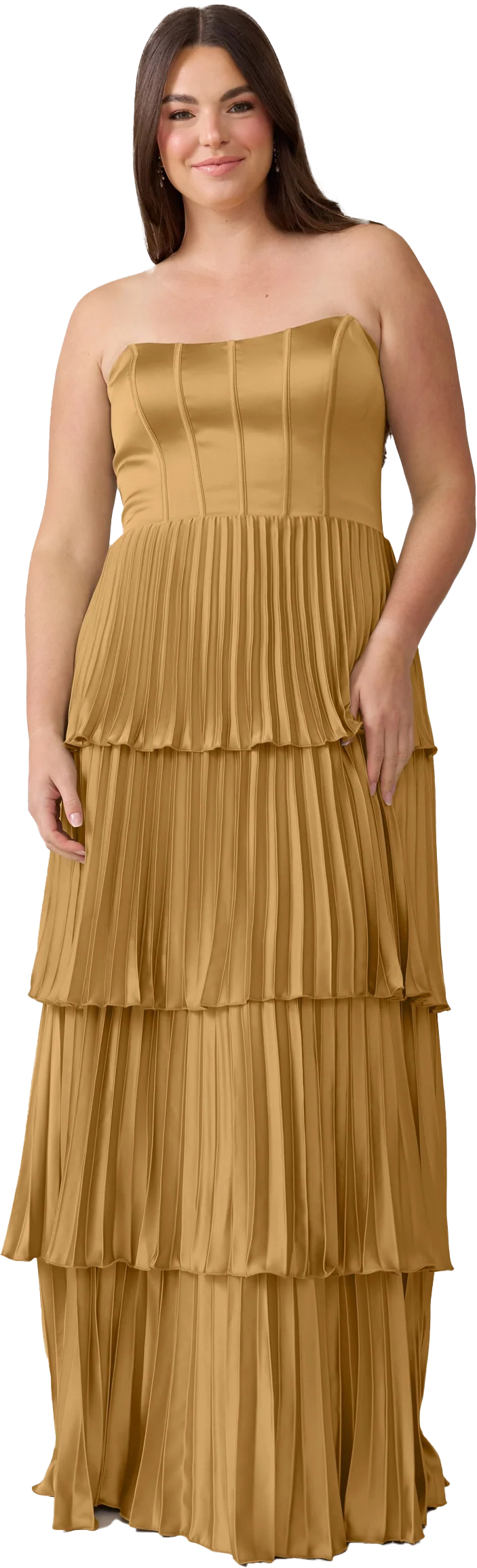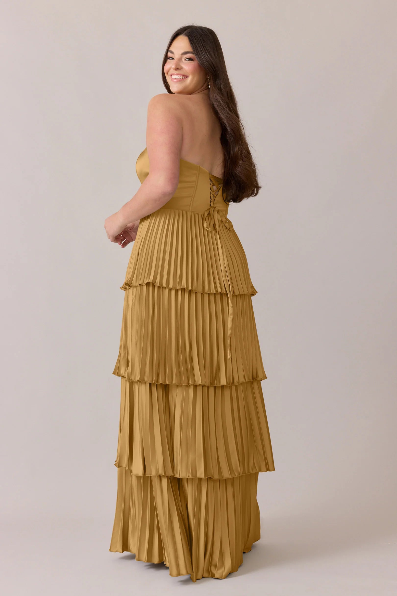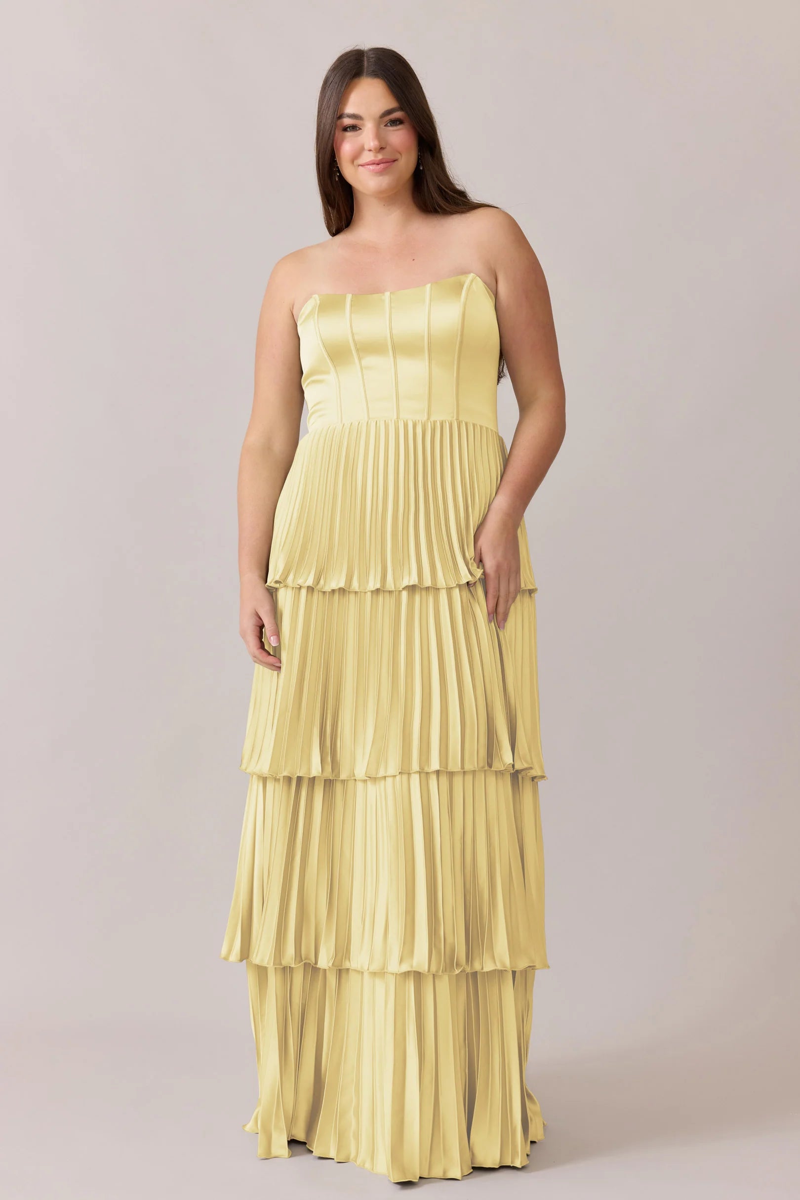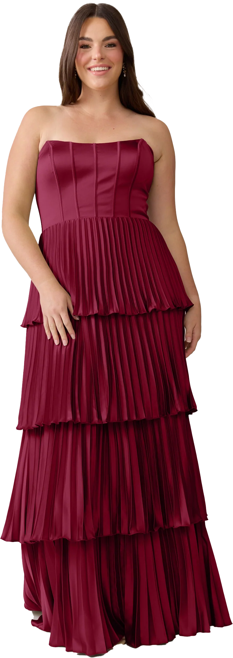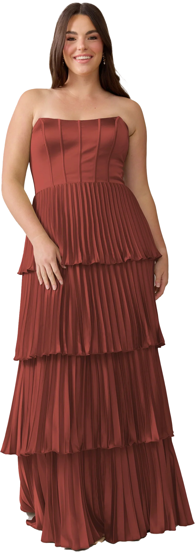 Graceful and refined, the Collins Dress features a strapless A-line silhouette with a cascading four-tier pleated skirt. Built-in bra cups and structured boning provide seamless support, while a lace-up back and hidden zipper offer a tailored fit. Fully lined for smooth coverage, Ellapink is an effortlessly timeless choice—modern, modest, and endlessly flattering.