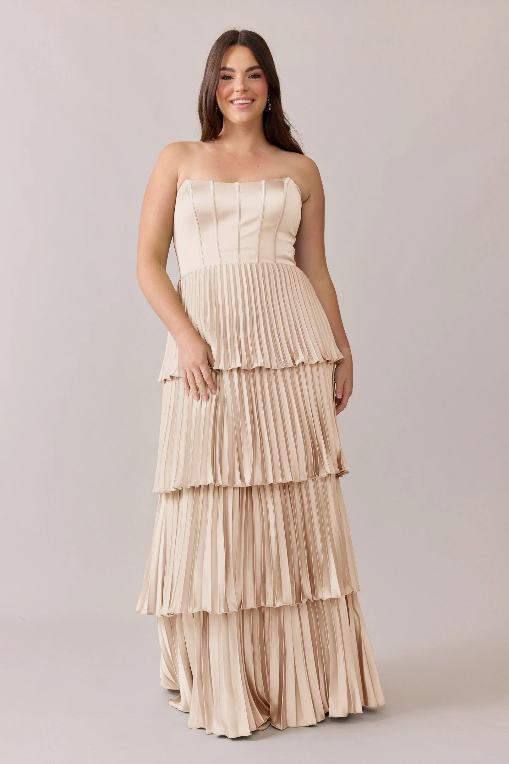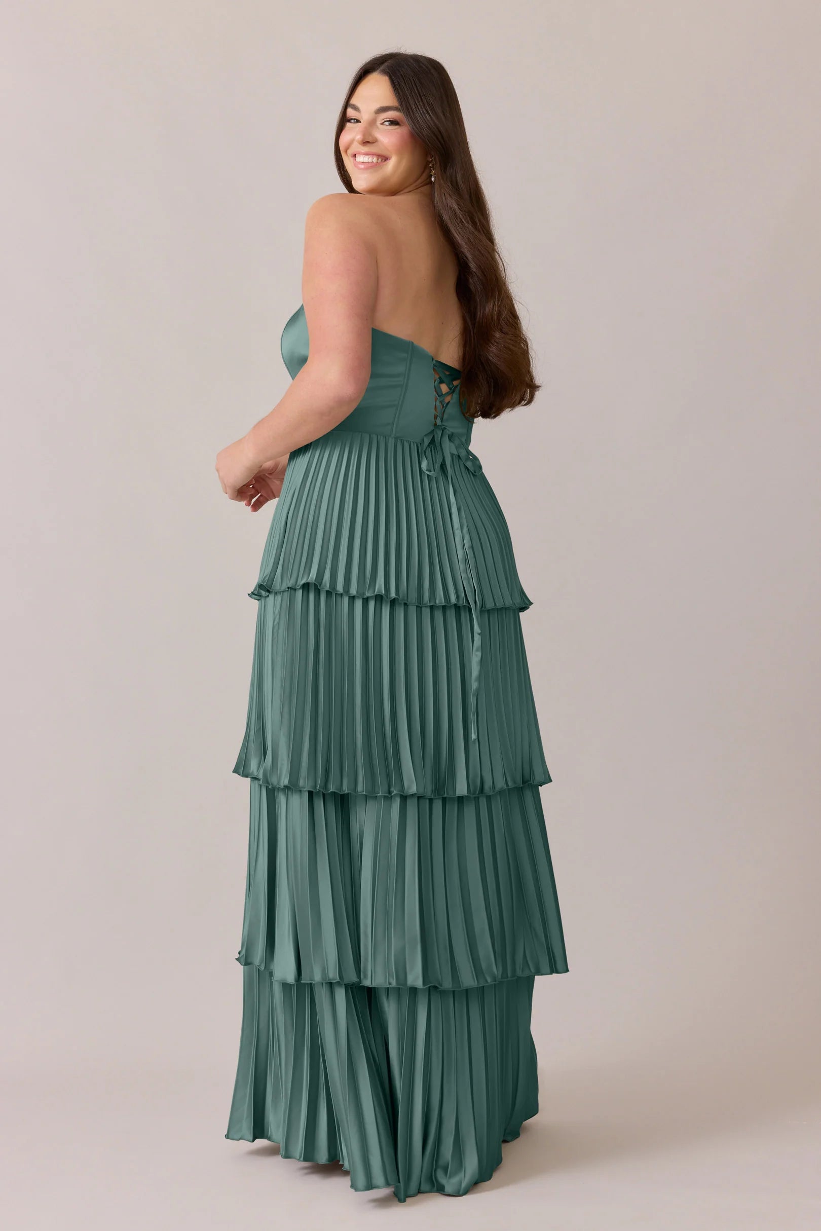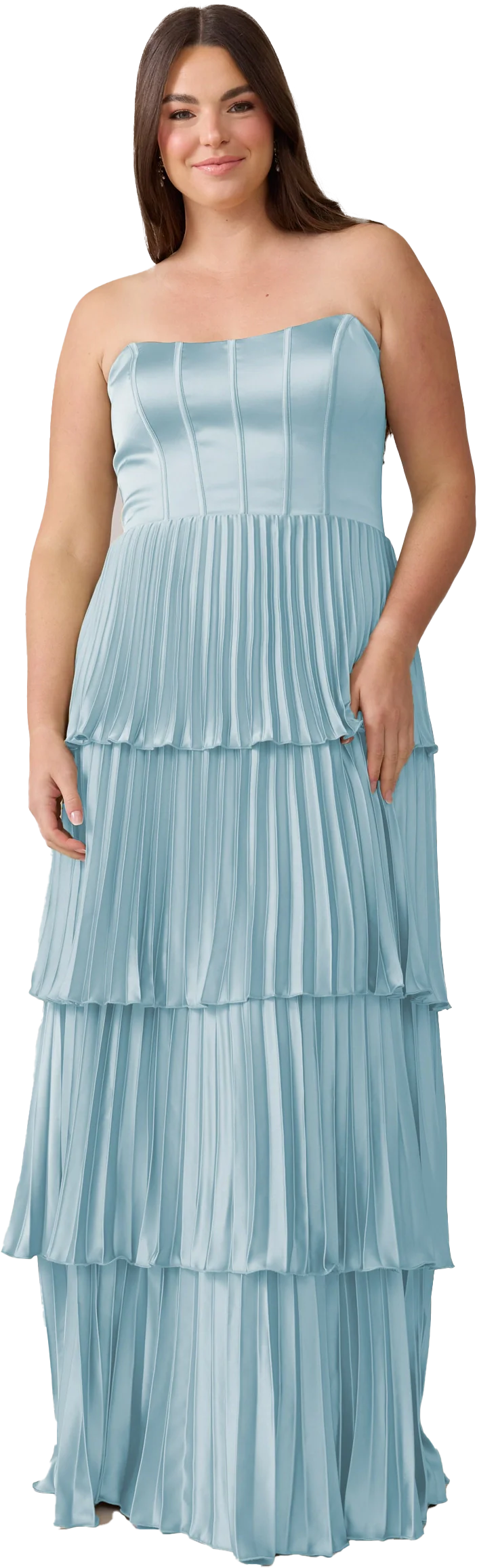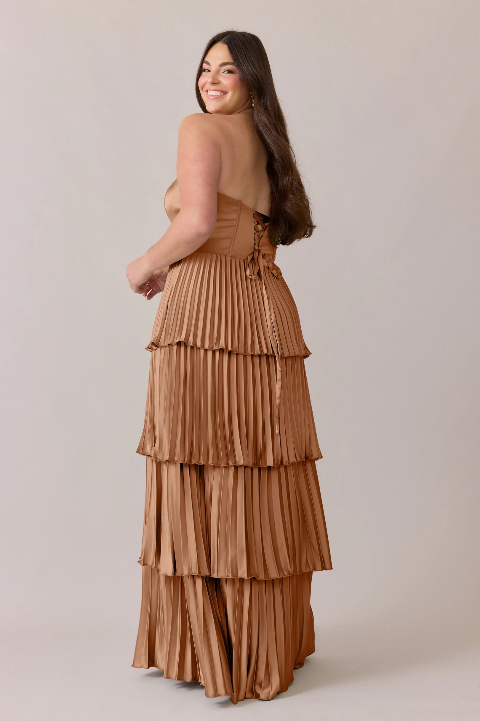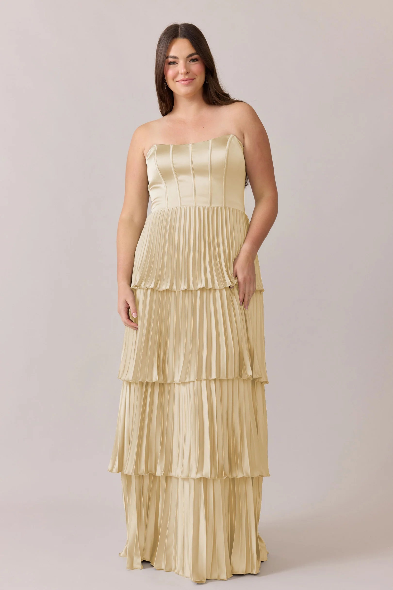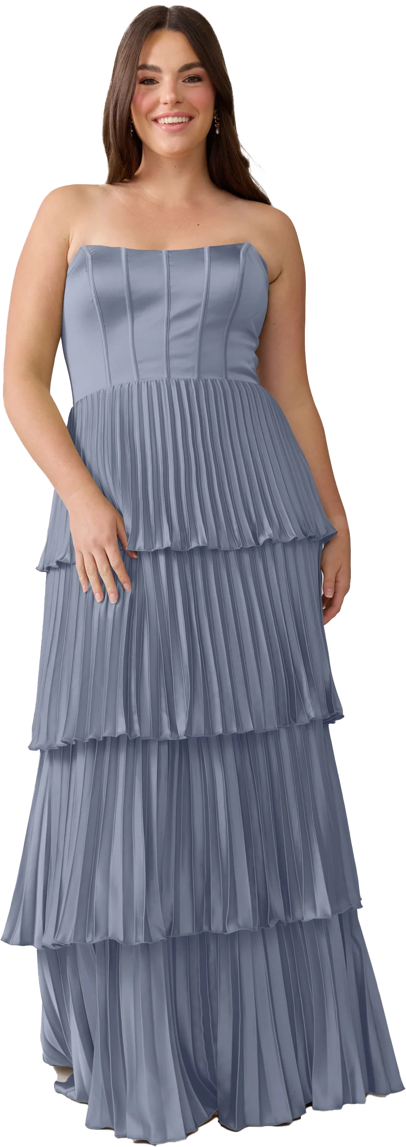 Graceful and refined, the Collins Dress features a strapless A-line silhouette with a cascading four-tier pleated skirt. Built-in bra cups and structured boning provide seamless support, while a lace-up back and hidden zipper offer a tailored fit. Fully lined for smooth coverage, Ellapink is an effortlessly timeless choice—modern, modest, and endlessly flattering.