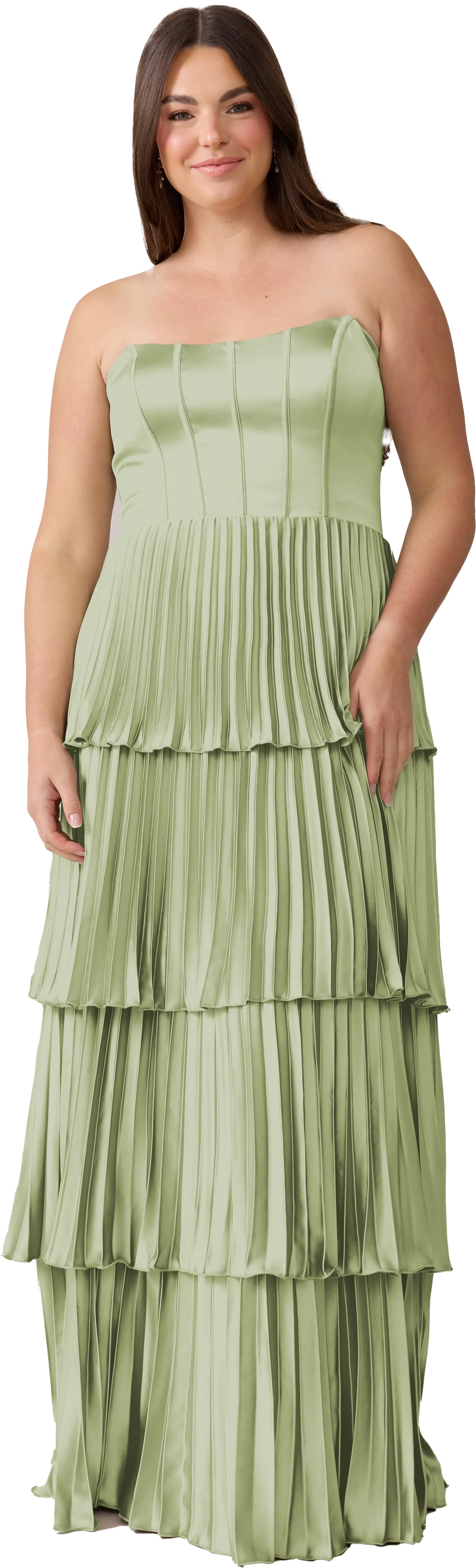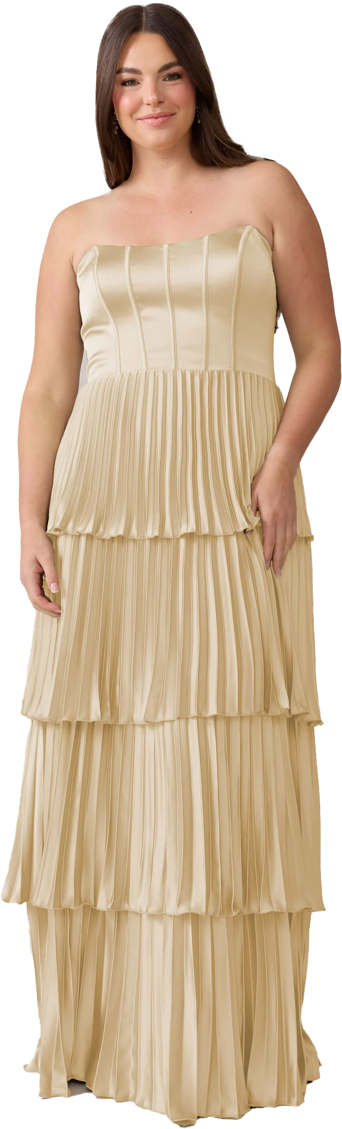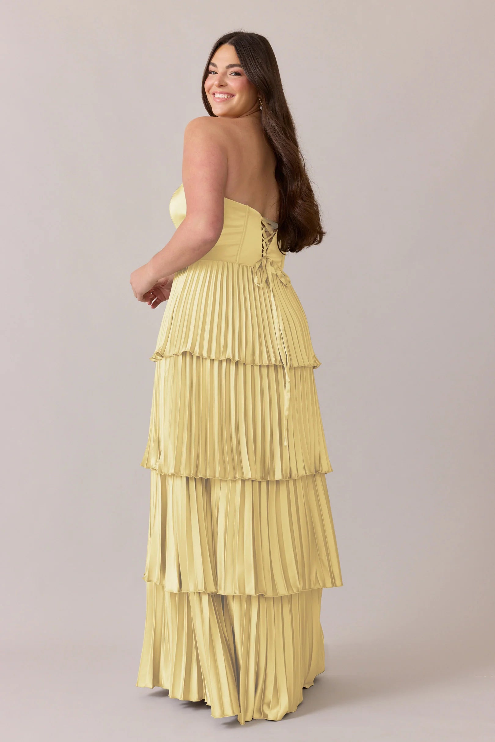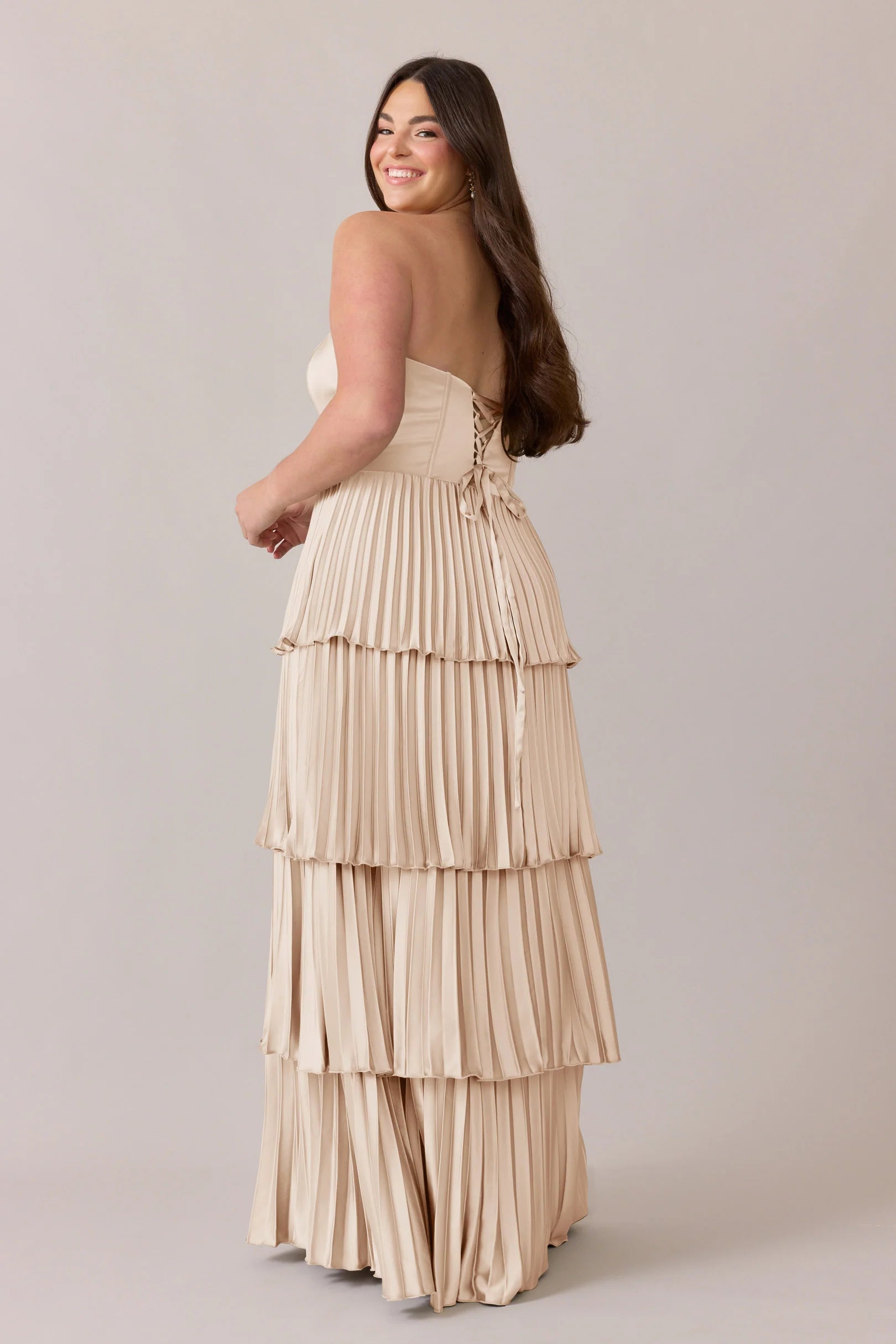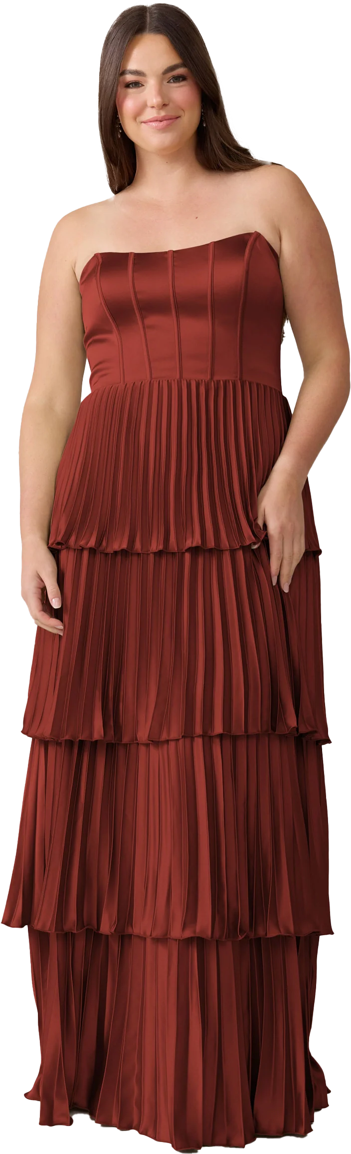 Graceful and refined, the Collins Dress features a strapless A-line silhouette with a cascading four-tier pleated skirt. Built-in bra cups and structured boning provide seamless support, while a lace-up back and hidden zipper offer a tailored fit. Fully lined for smooth coverage, Ellapink is an effortlessly timeless choice—modern, modest, and endlessly flattering.