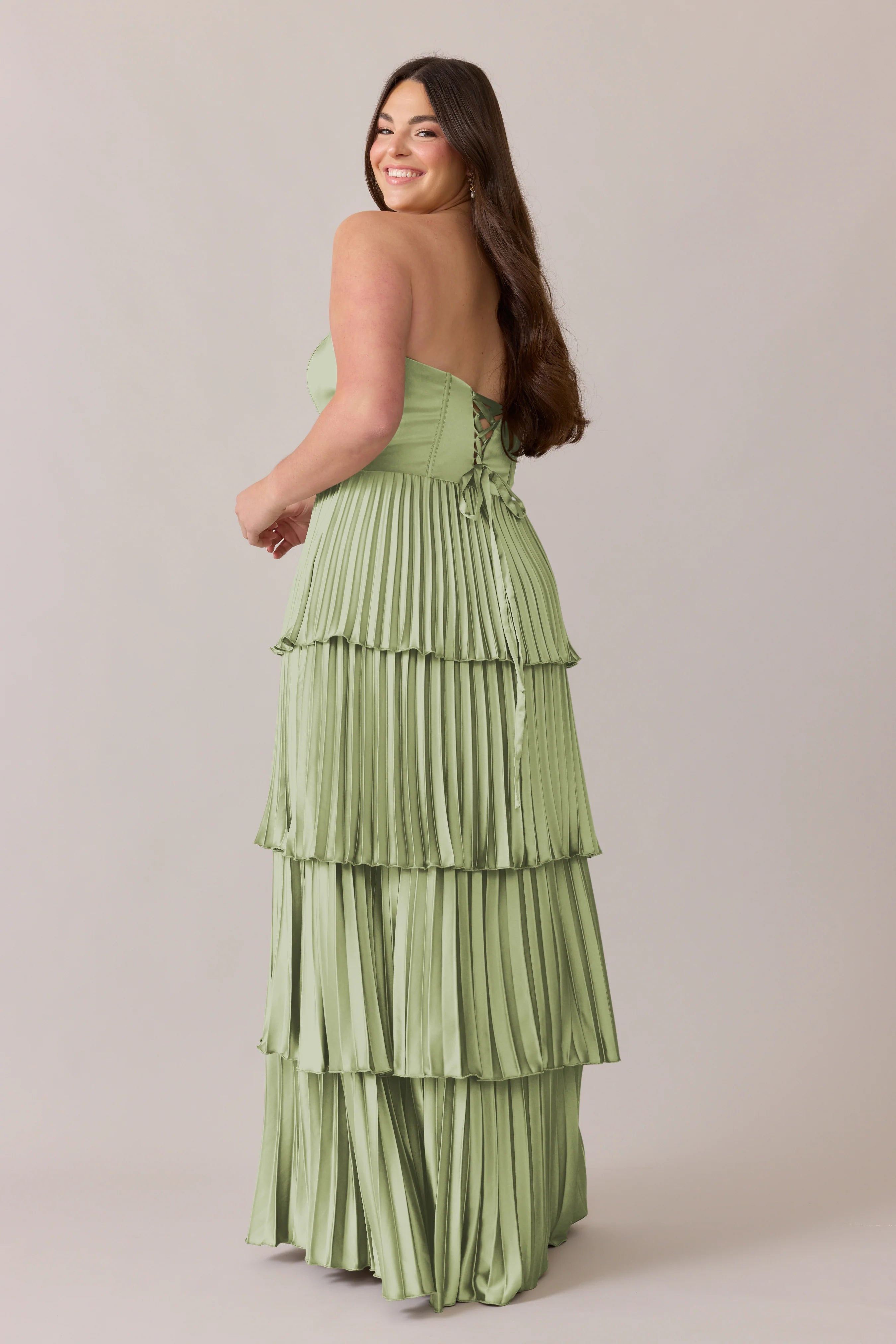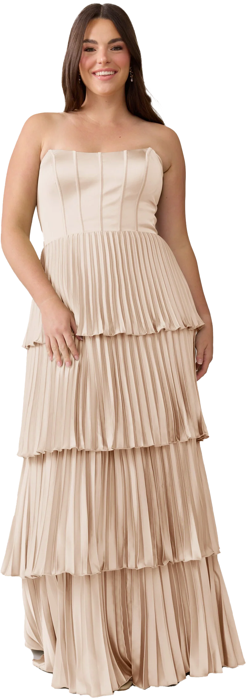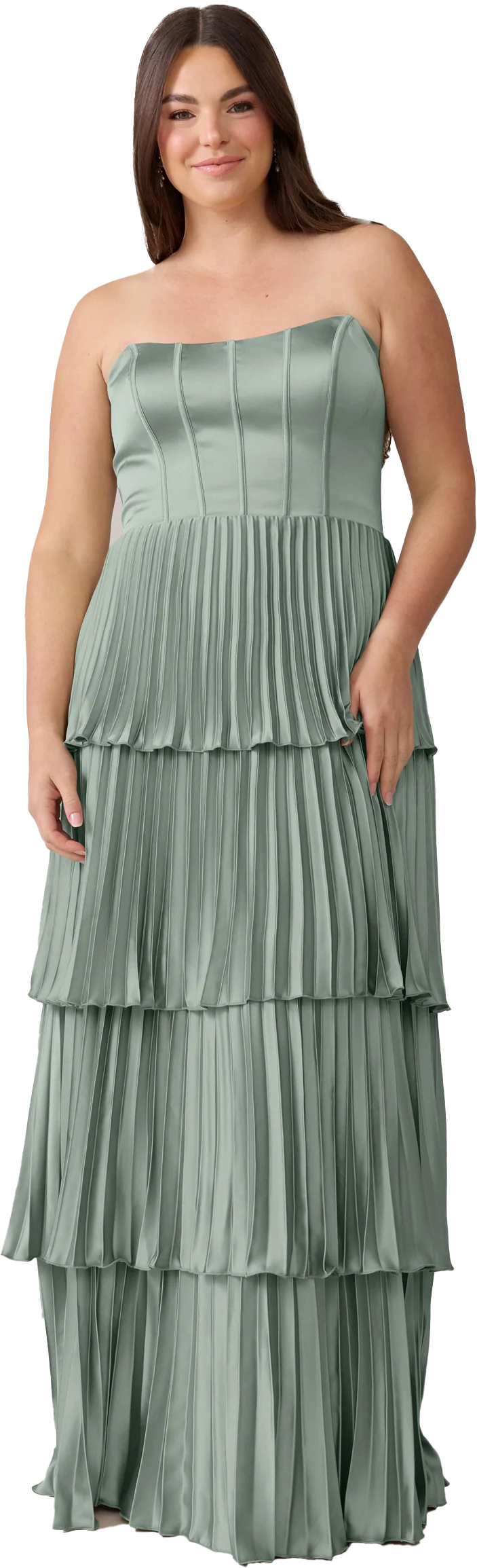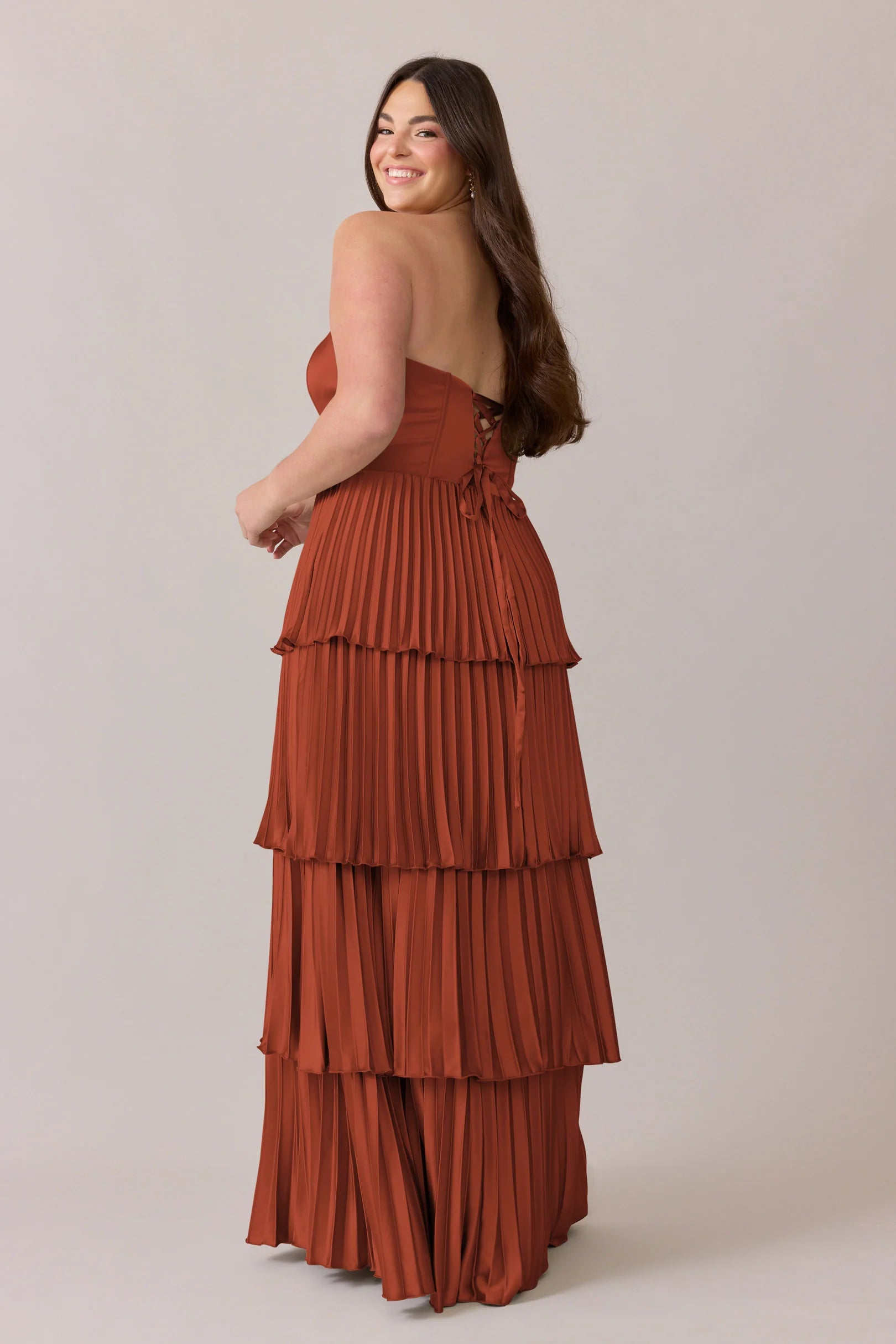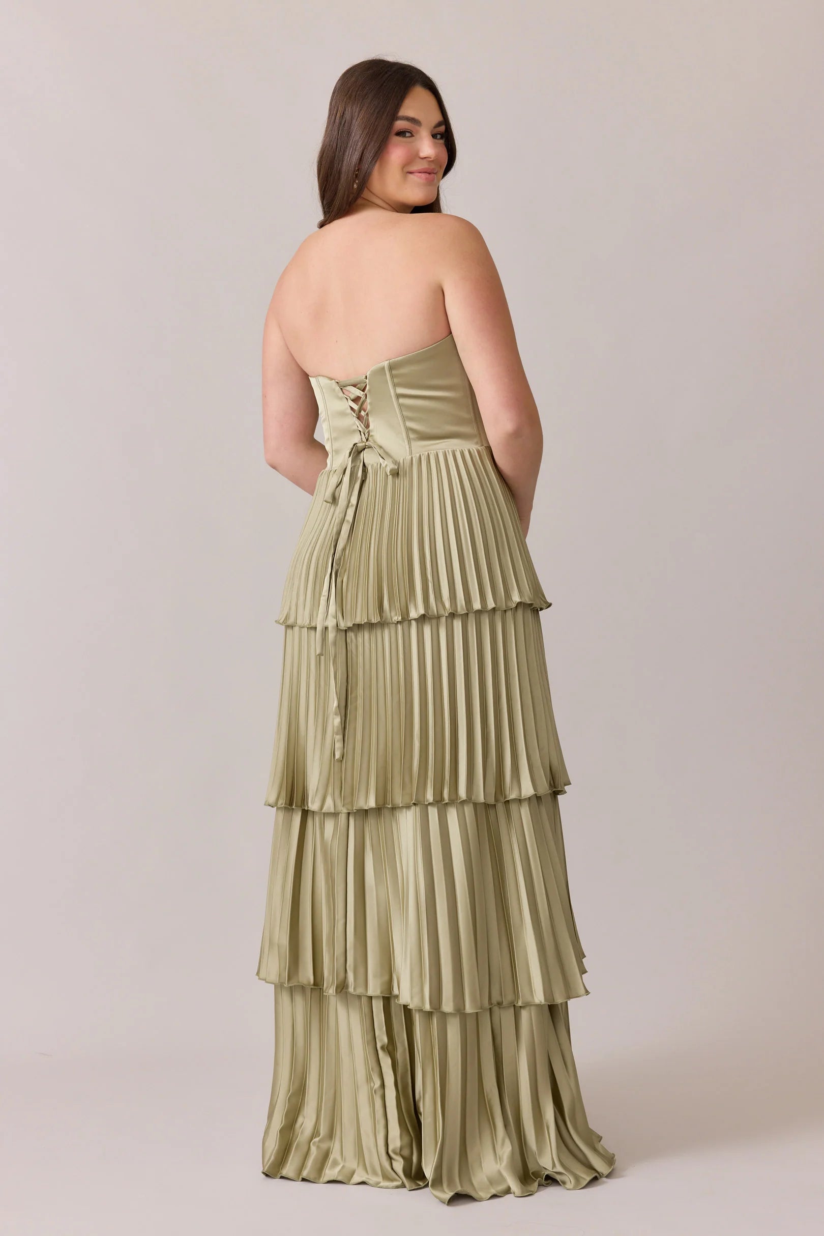 Graceful and refined, the Collins Dress features a strapless A-line silhouette with a cascading four-tier pleated skirt. Built-in bra cups and structured boning provide seamless support, while a lace-up back and hidden zipper offer a tailored fit. Fully lined for smooth coverage, Ellapink is an effortlessly timeless choice—modern, modest, and endlessly flattering.
