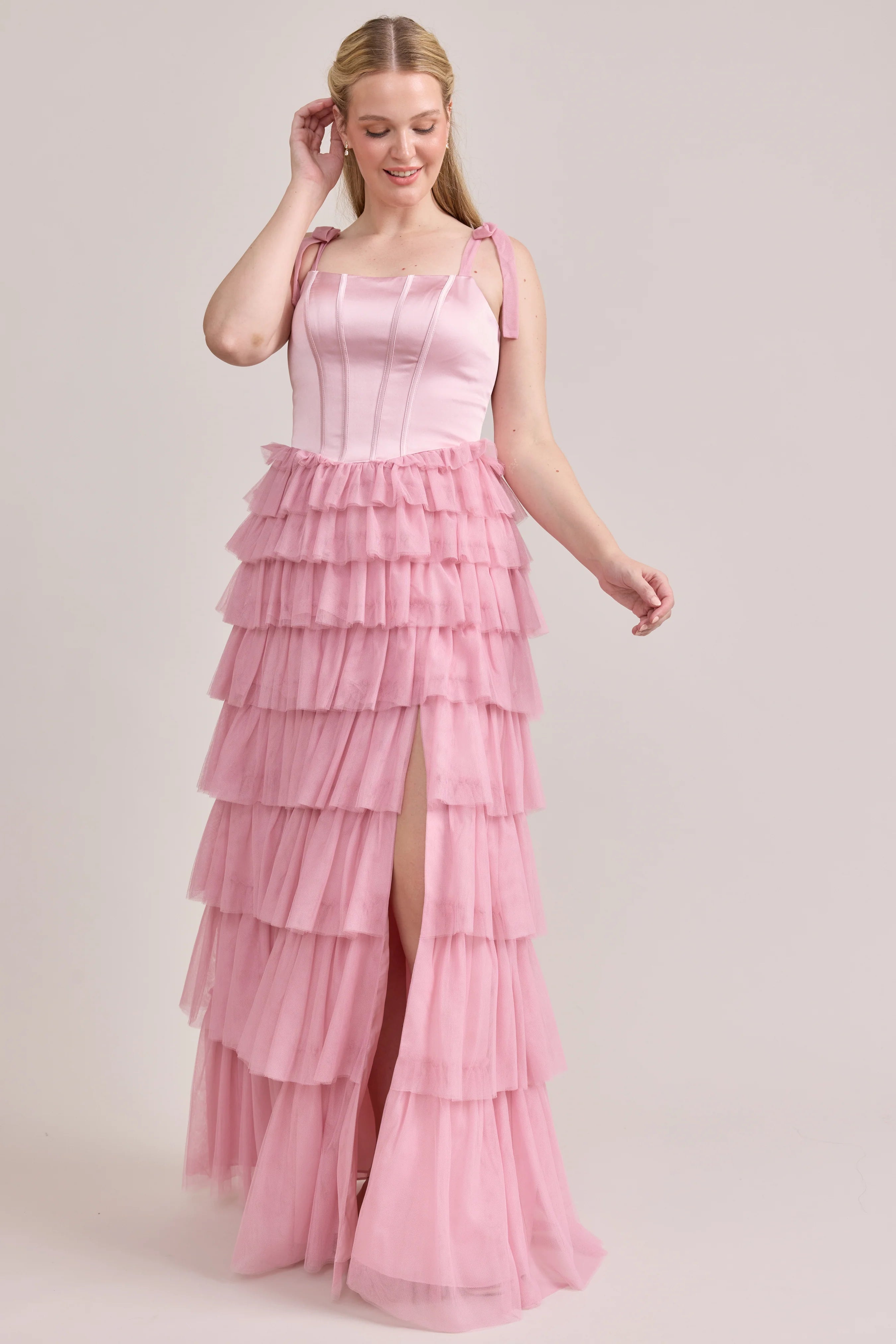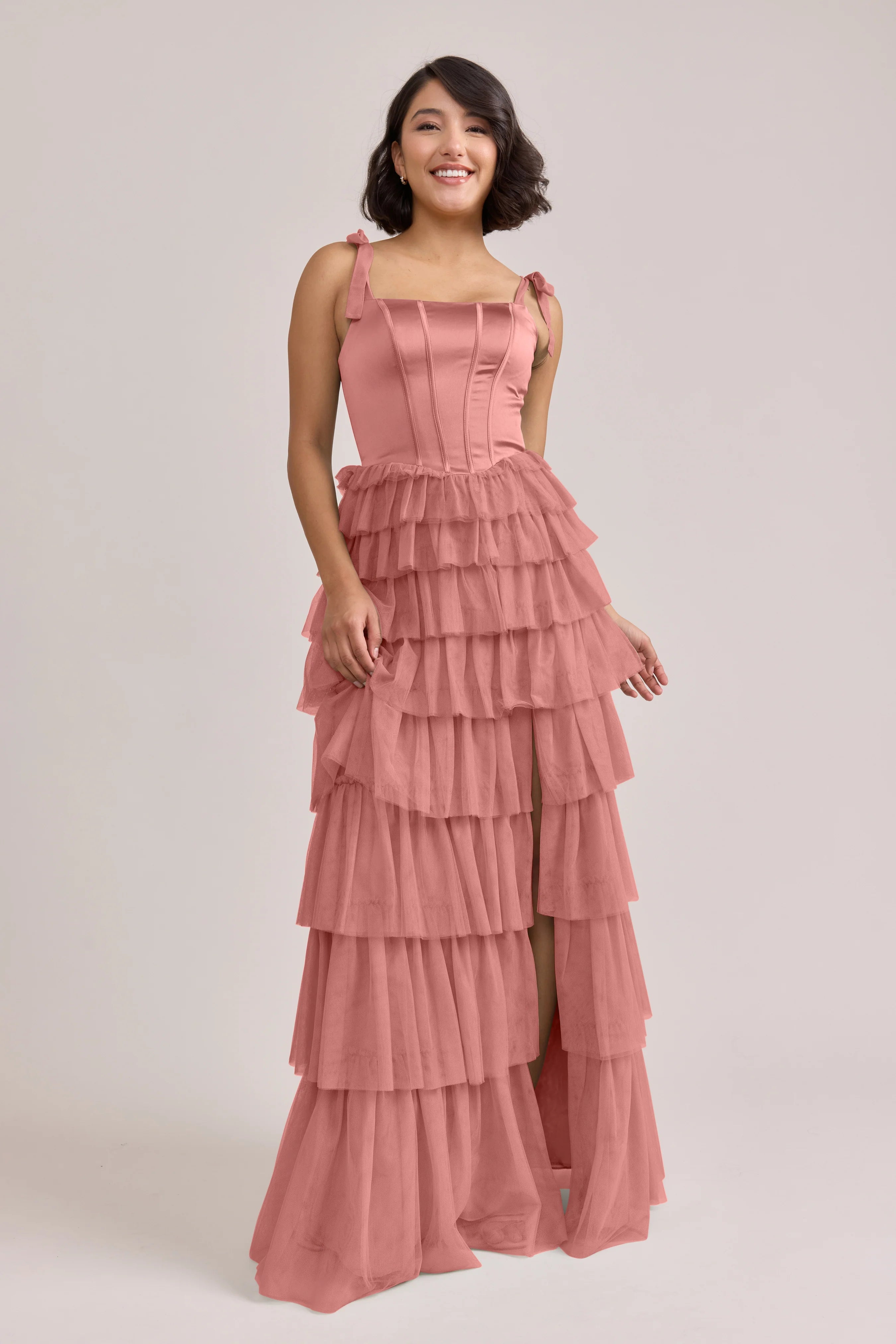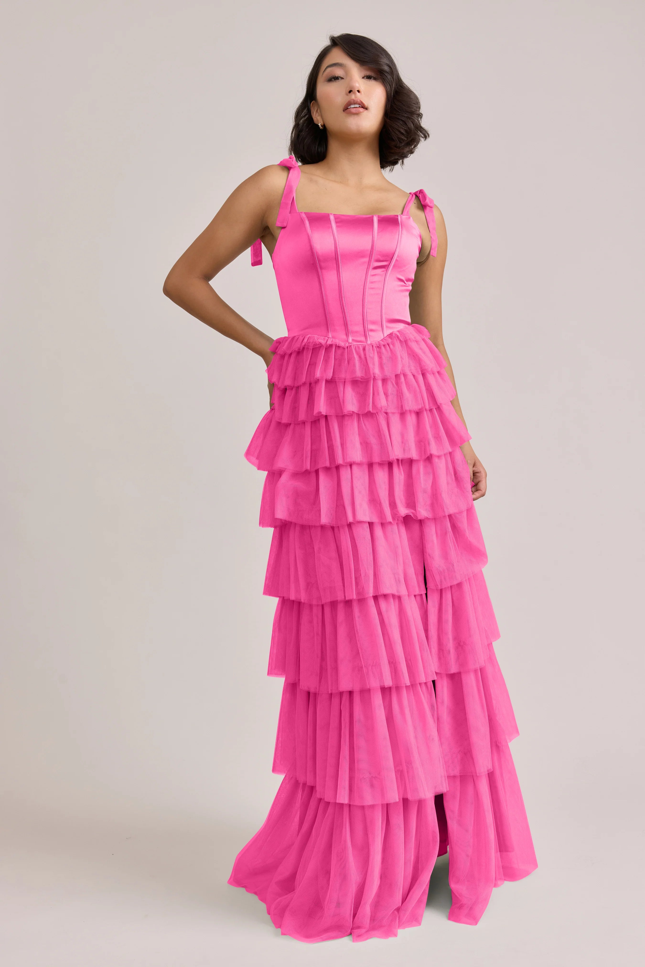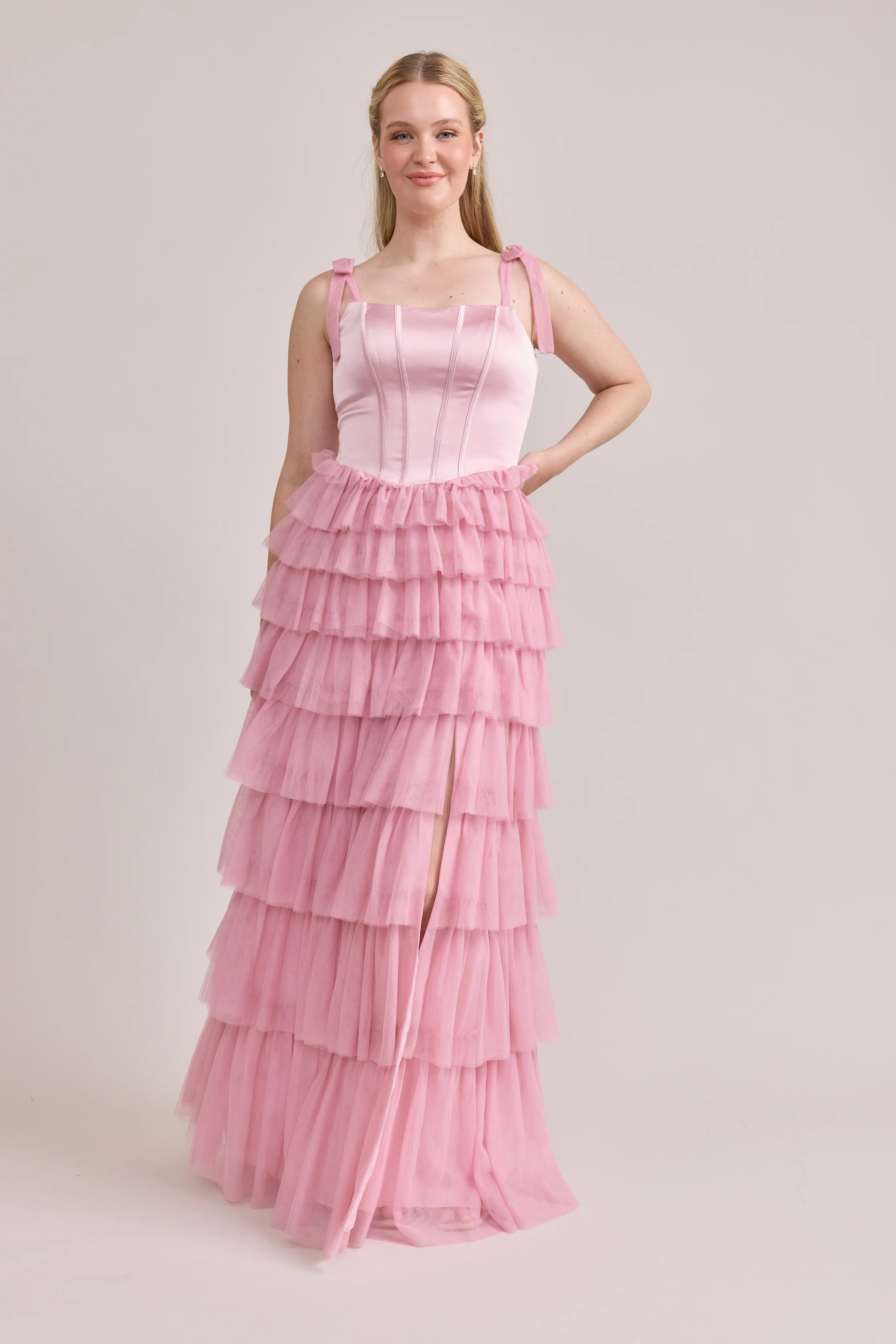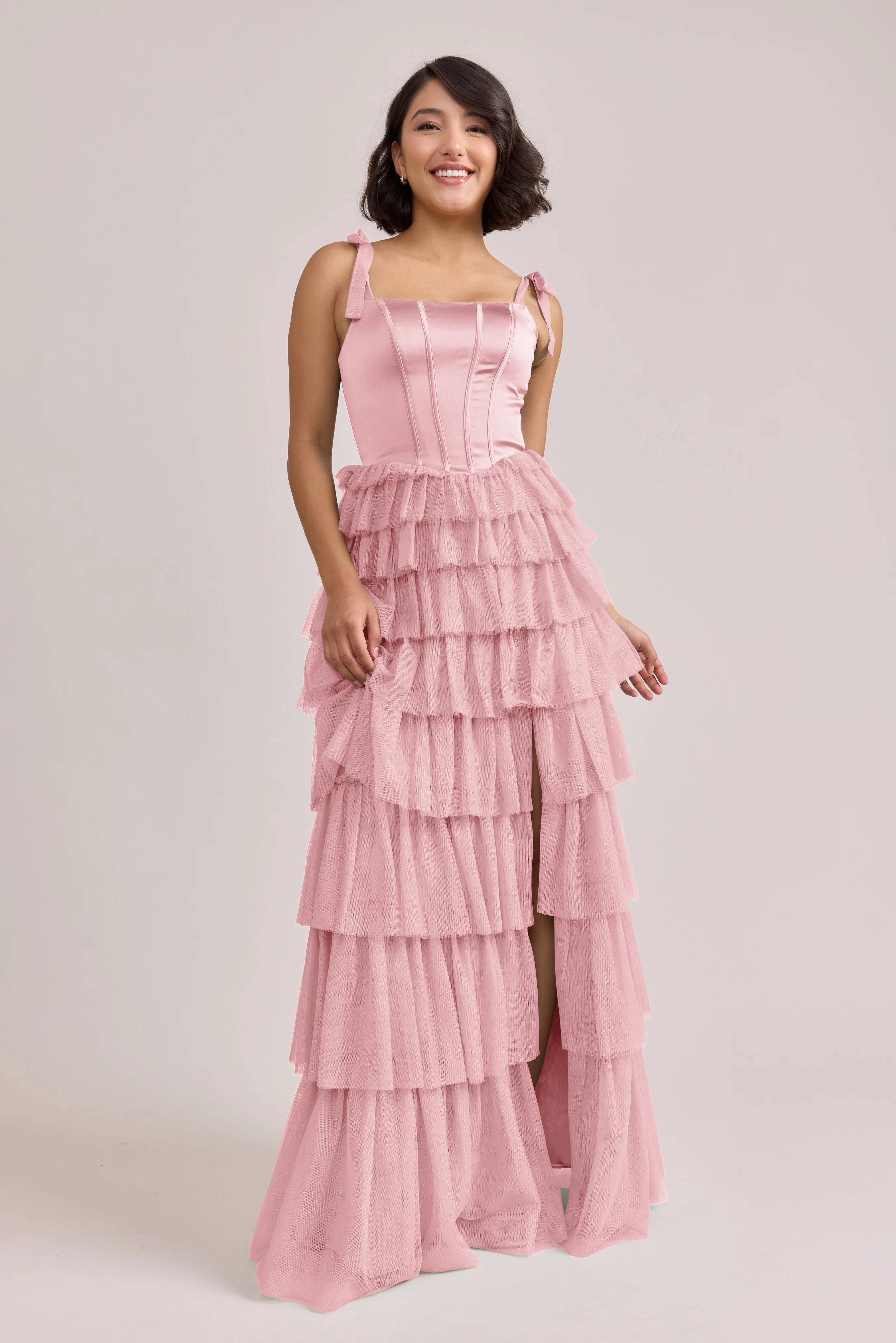 Our Ellapink Satin + Tulle Dress gives all the whimsy and ruffles you could ask for. She features a satin corset bodice with self-tie tulle bow straps, and gorgeous tiers of cascading tulle ruffles. Her trending basque waistline and front slit add the perfect modern touches to her design.