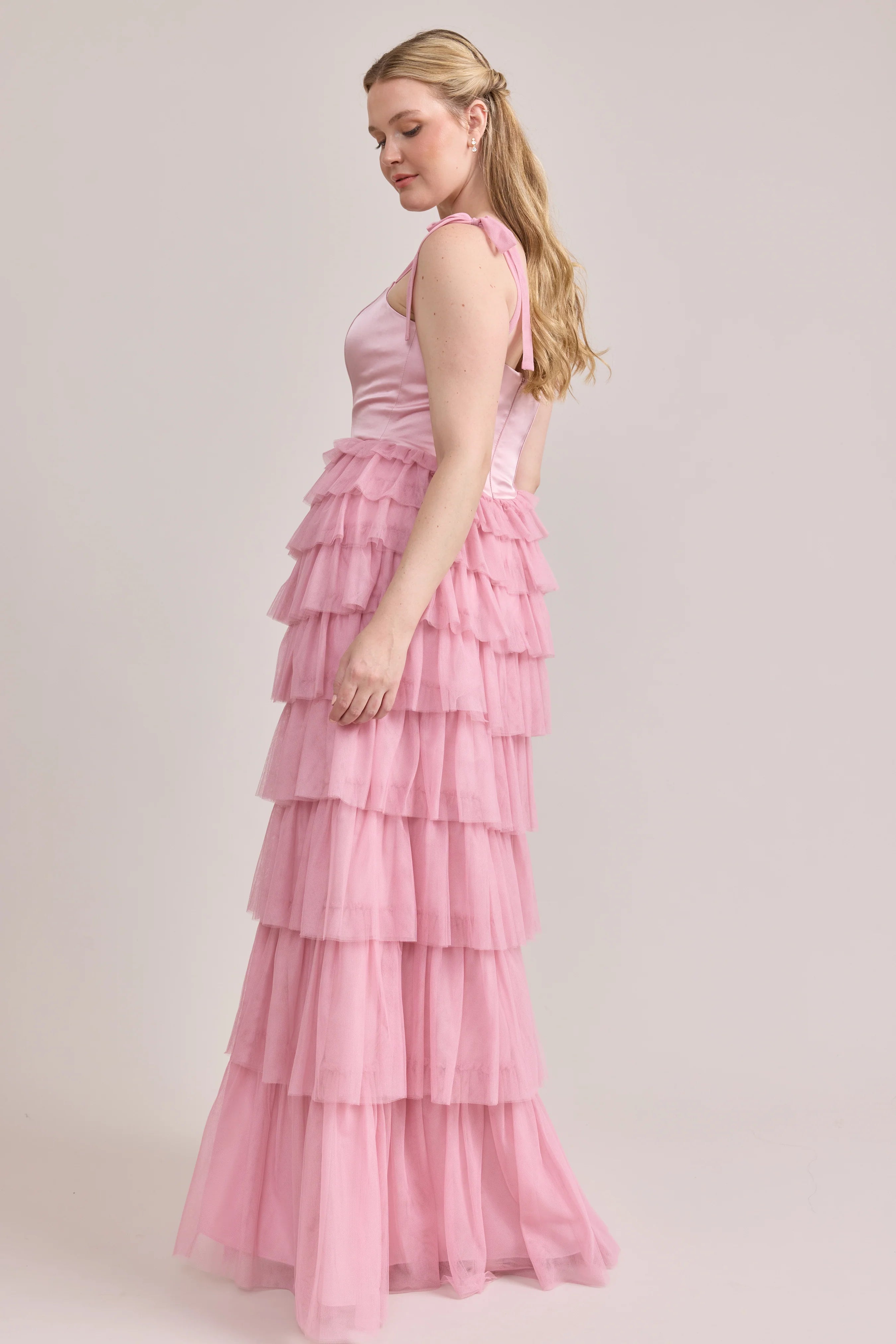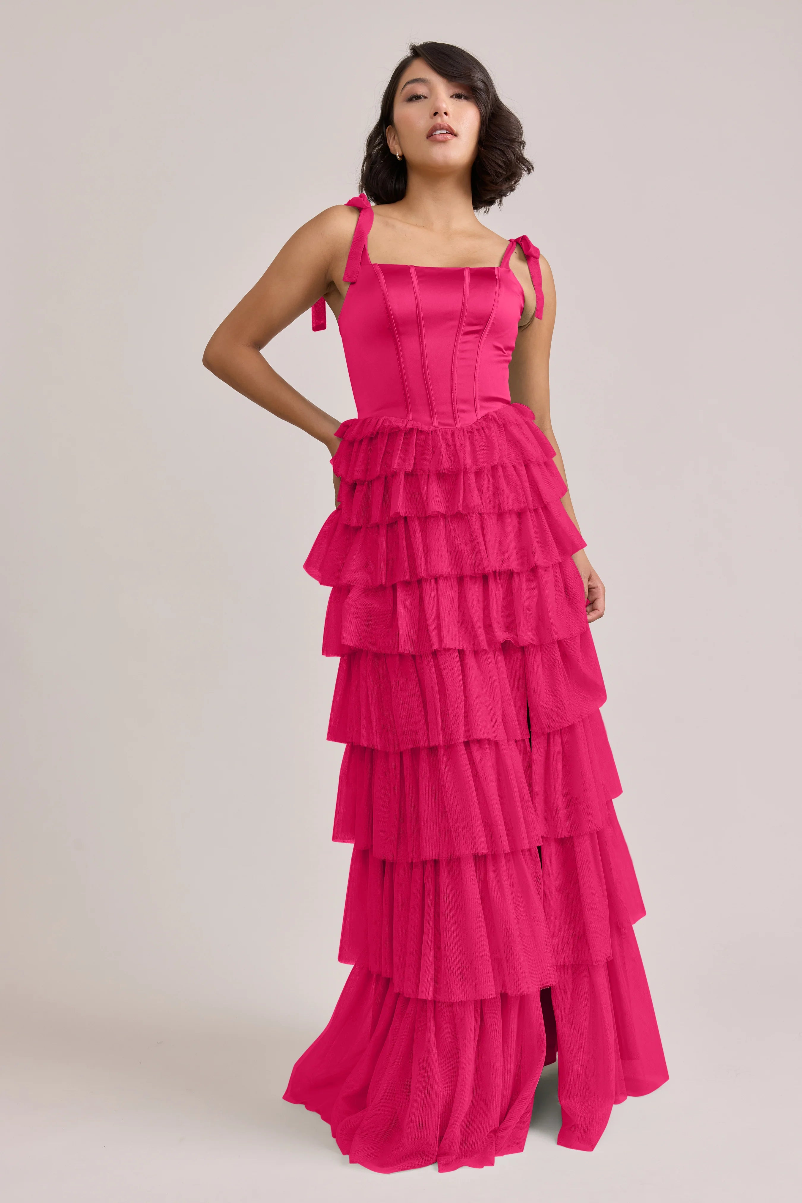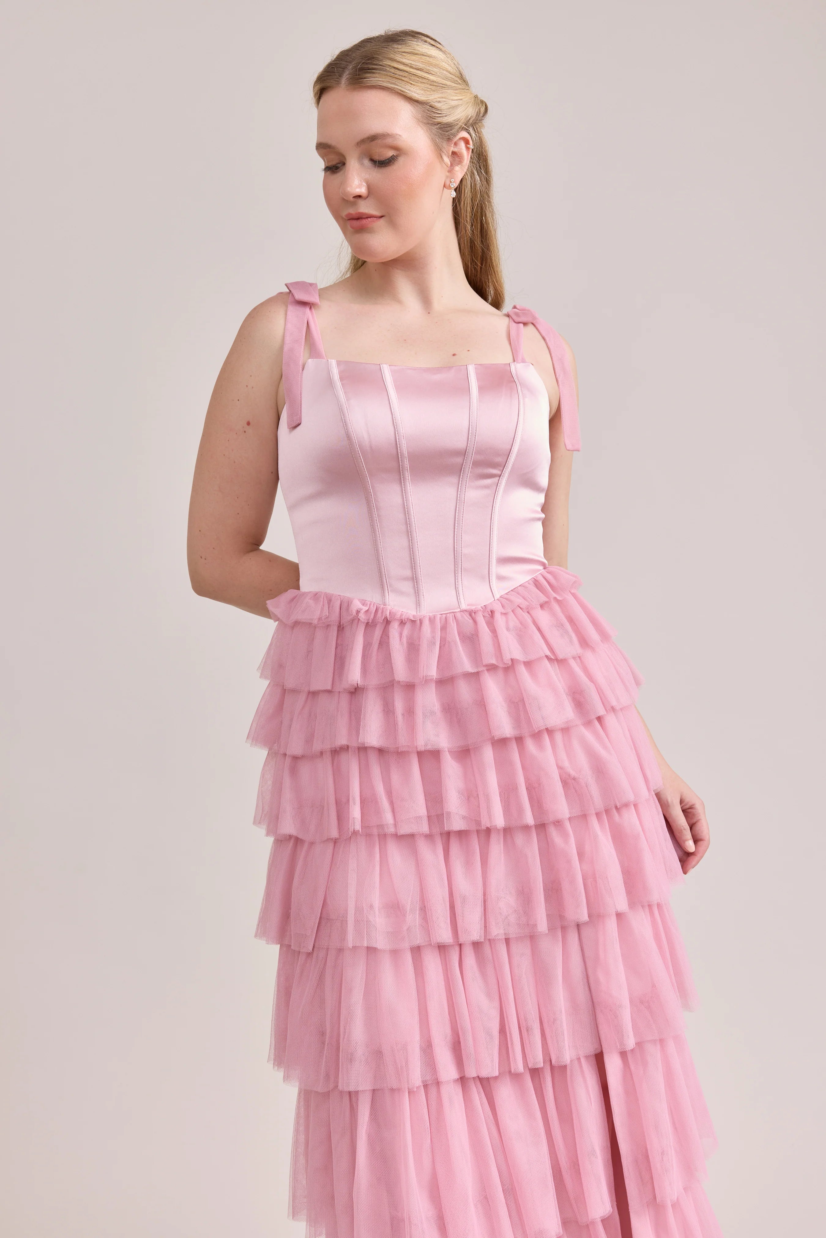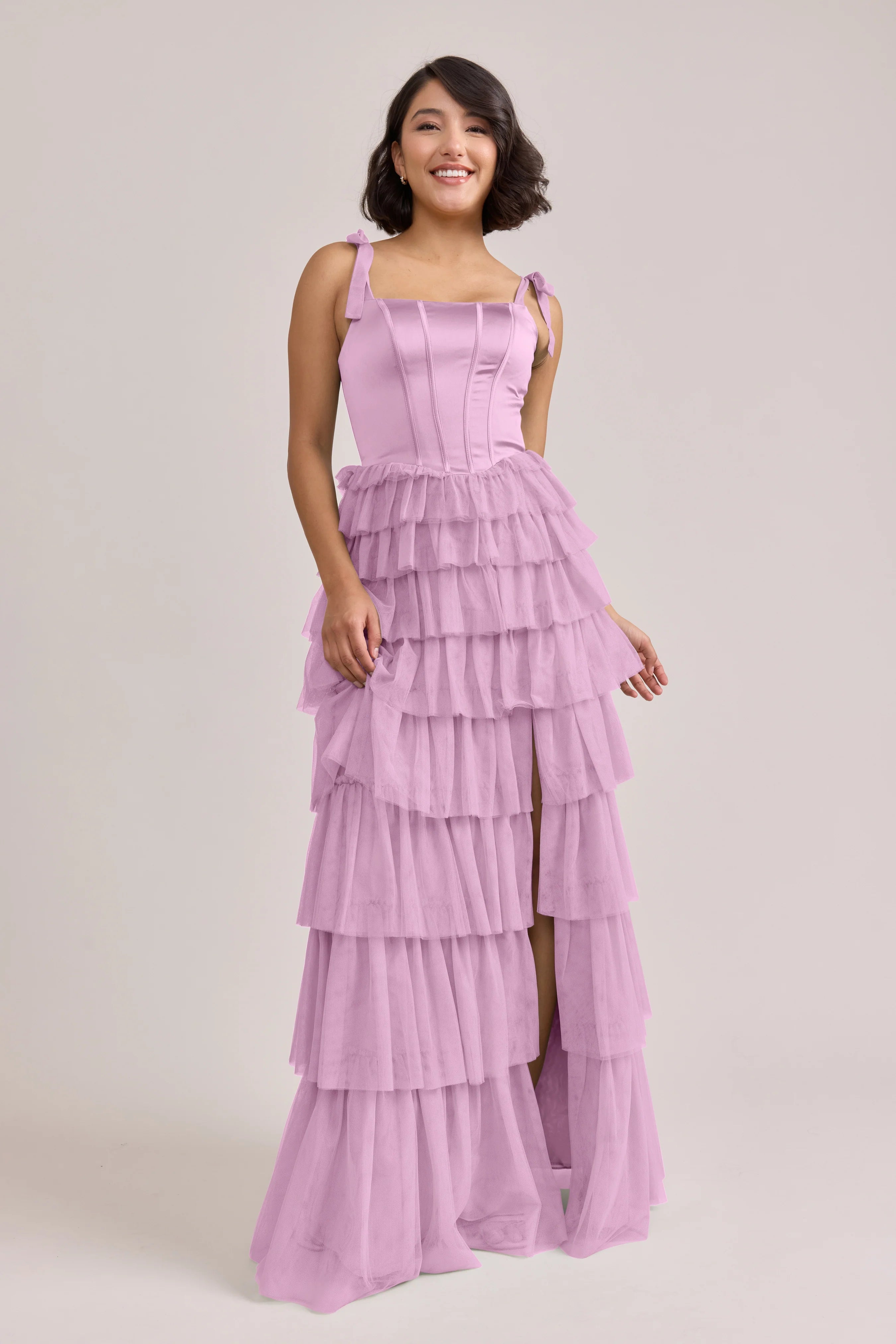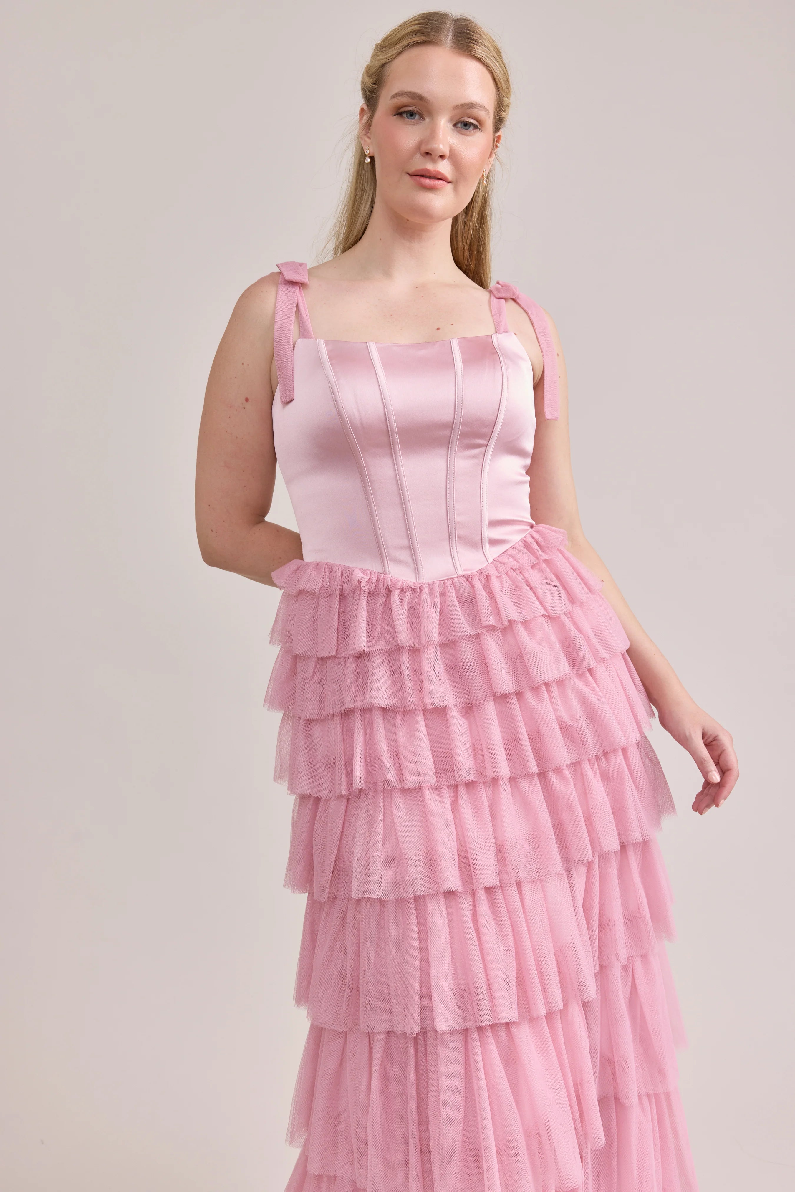 Our Ellapink Satin + Tulle Dress gives all the whimsy and ruffles you could ask for. She features a satin corset bodice with self-tie tulle bow straps, and gorgeous tiers of cascading tulle ruffles. Her trending basque waistline and front slit add the perfect modern touches to her design.
