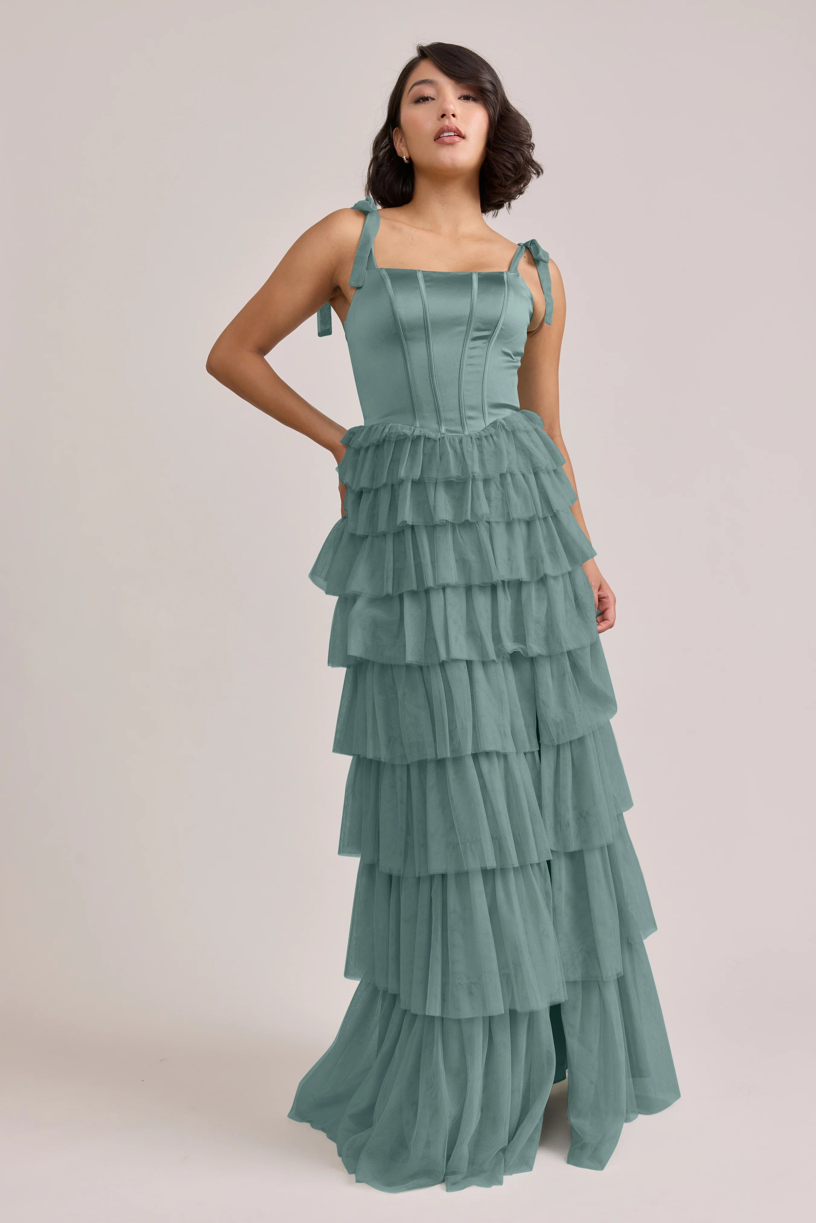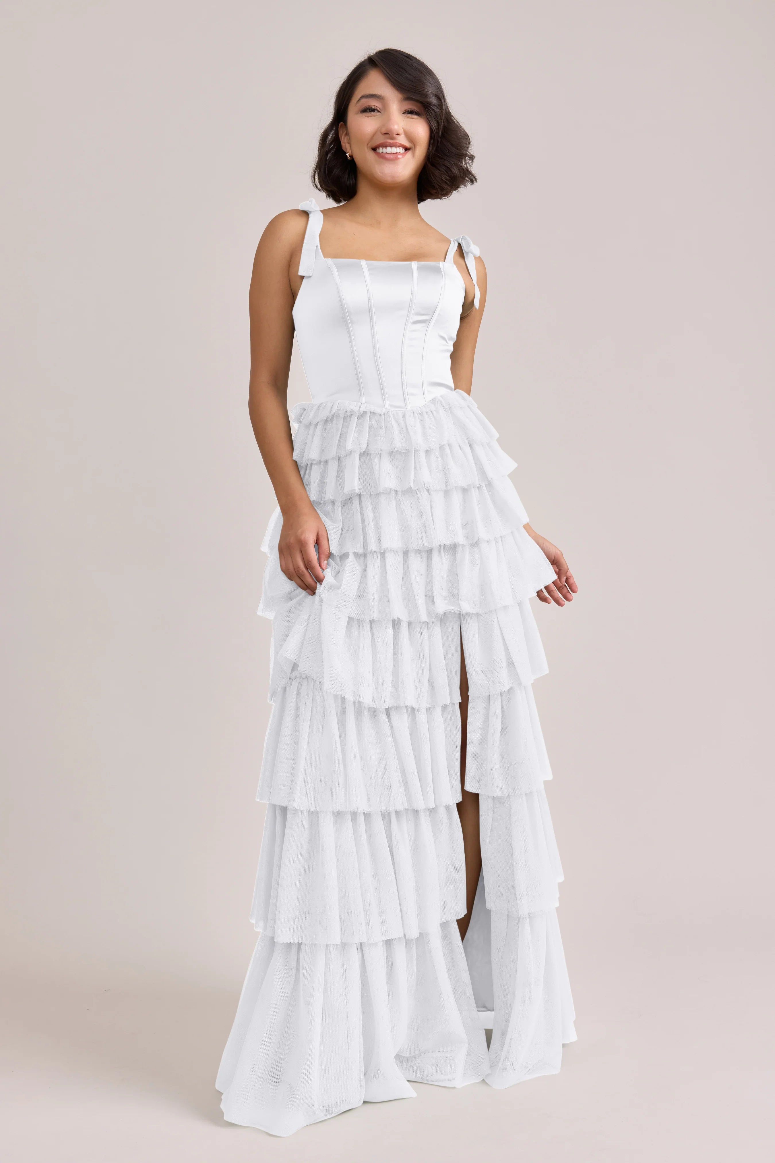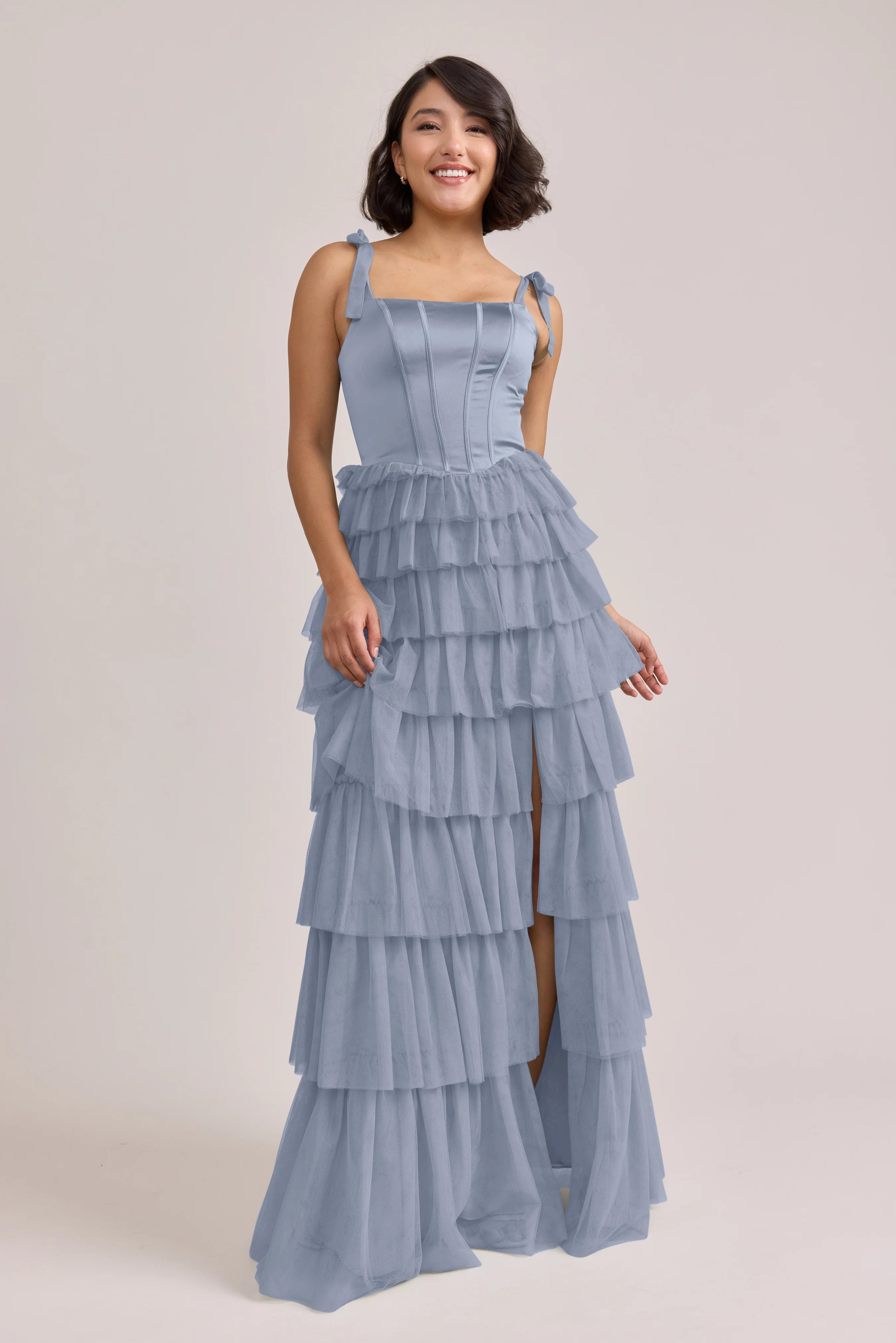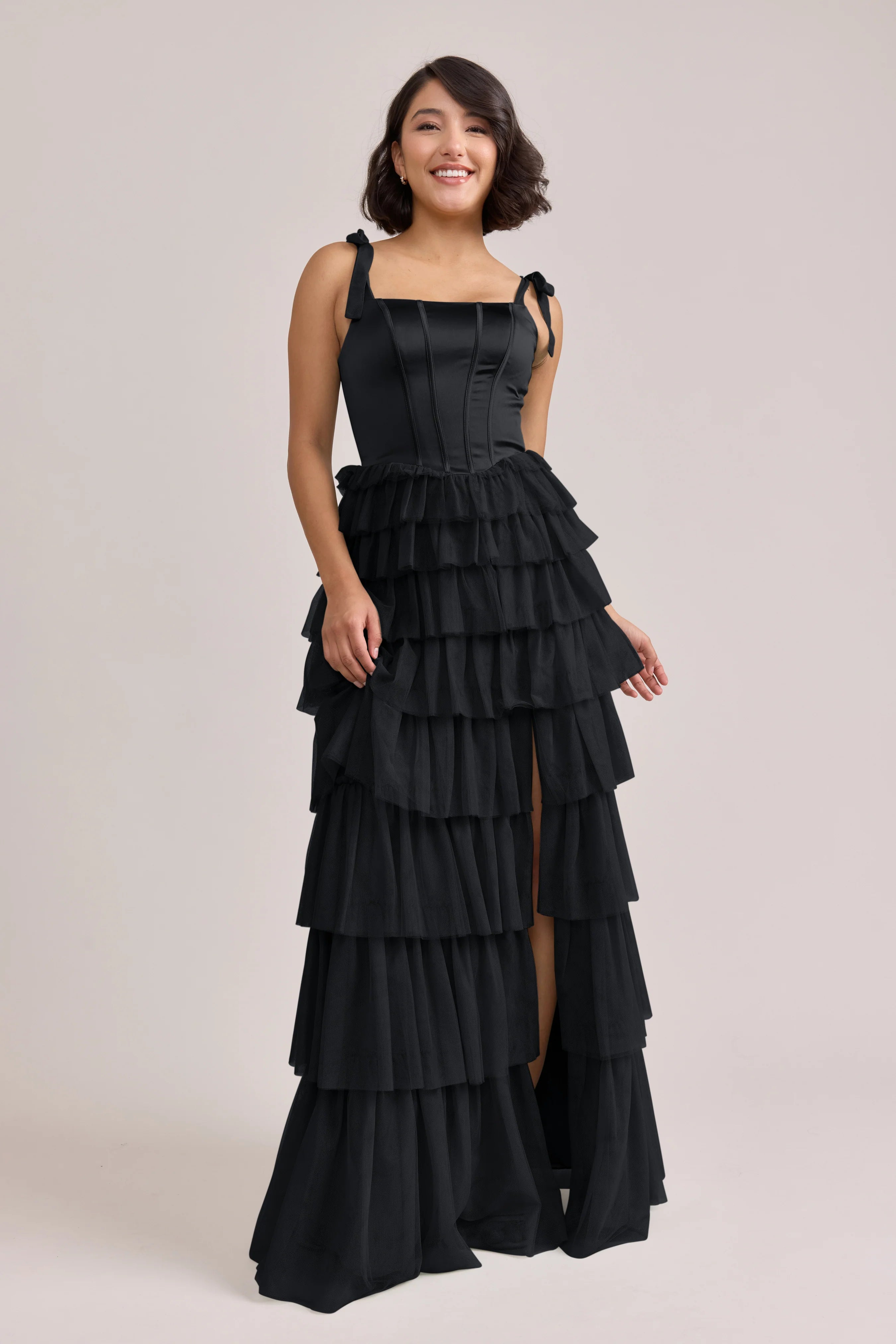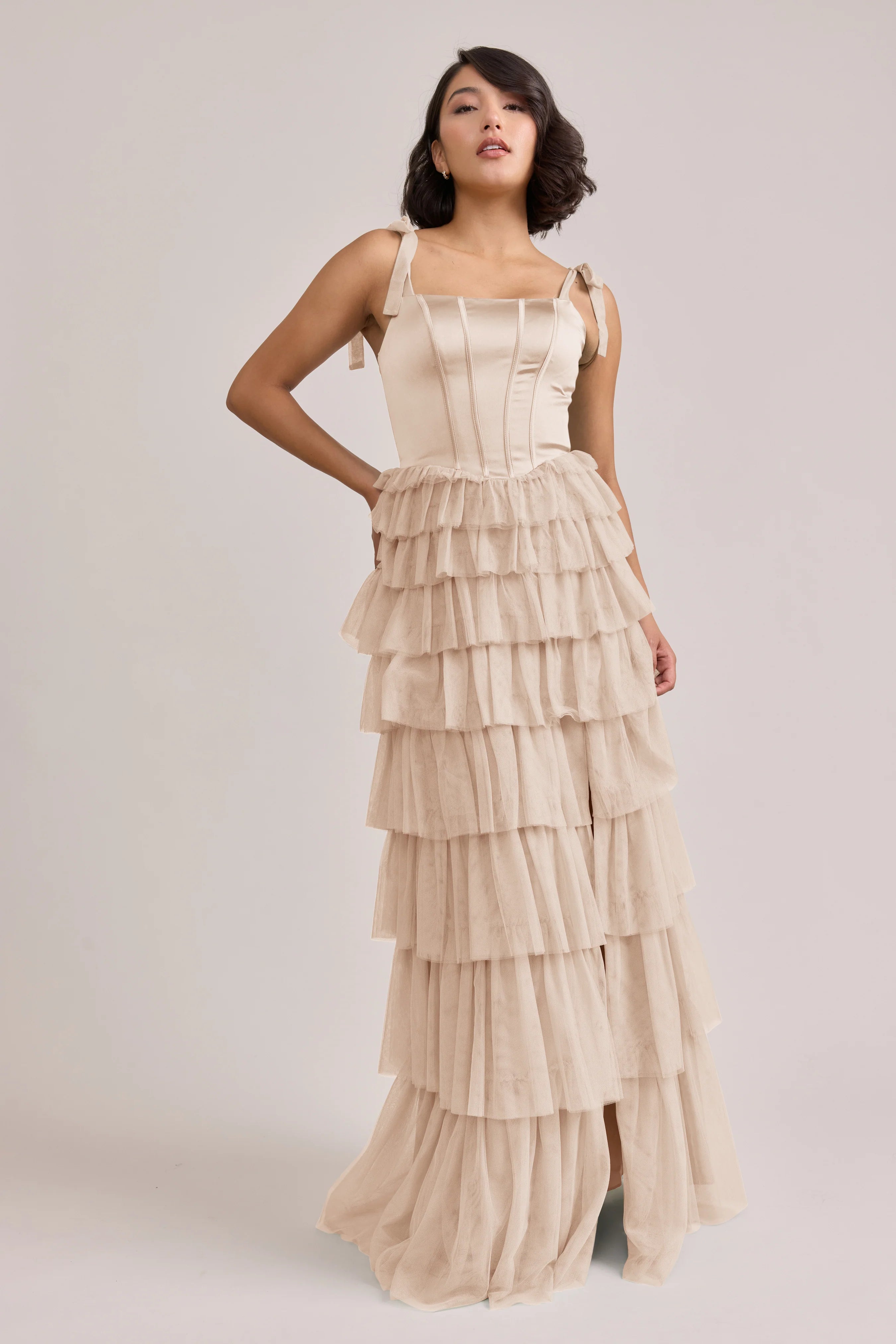 Our Ellapink Satin + Tulle Dress gives all the whimsy and ruffles you could ask for. She features a satin corset bodice with self-tie tulle bow straps, and gorgeous tiers of cascading tulle ruffles. Her trending basque waistline and front slit add the perfect modern touches to her design.