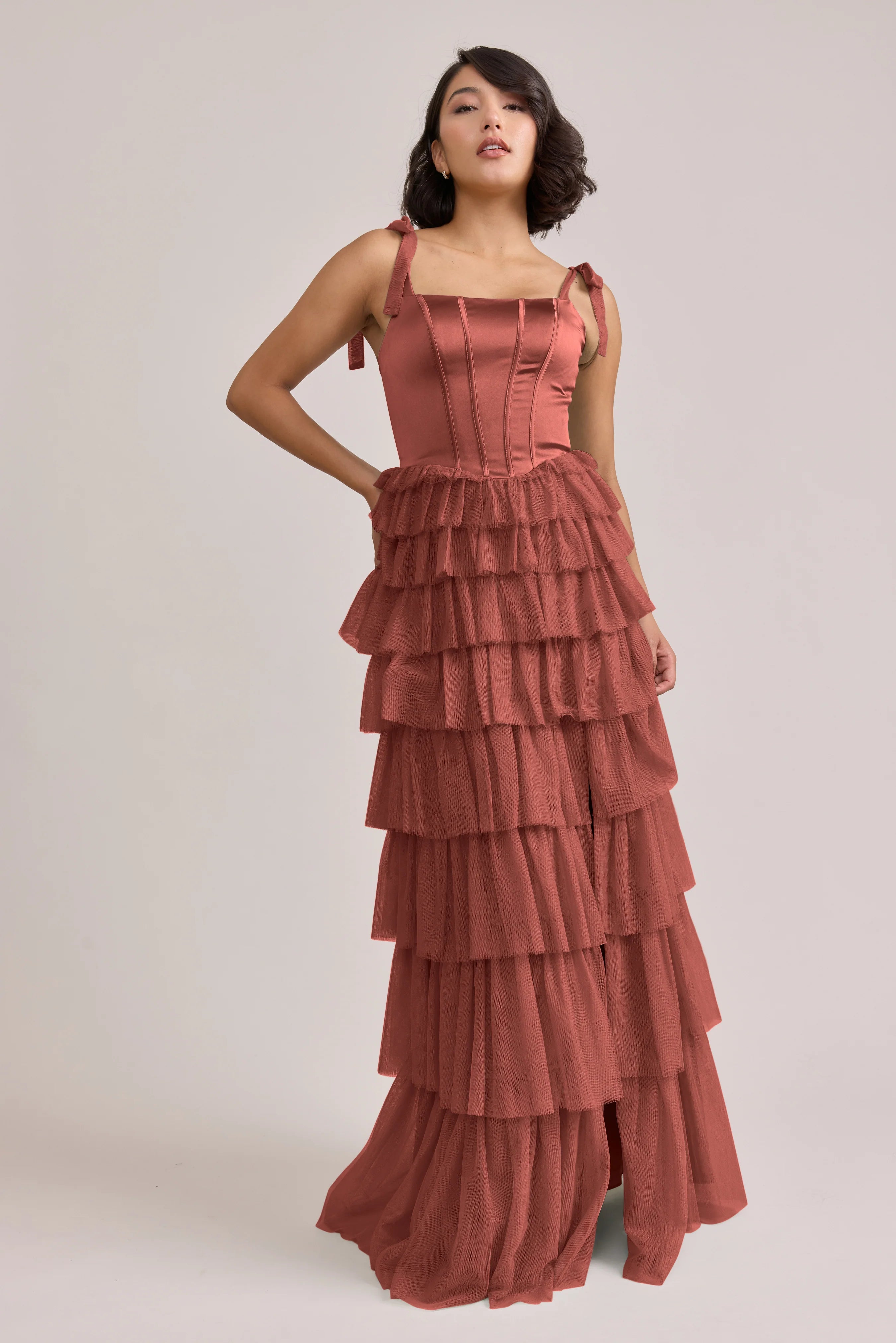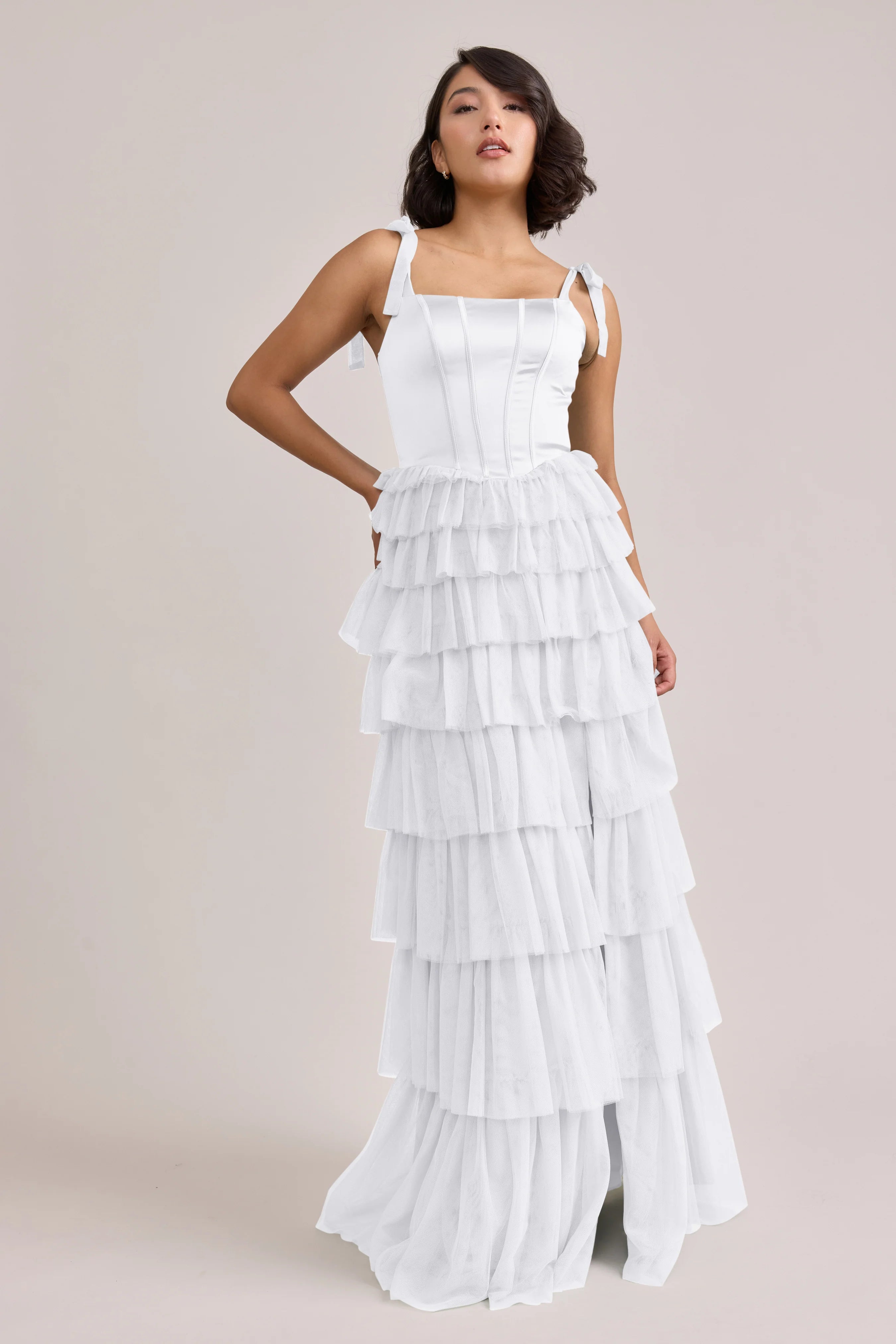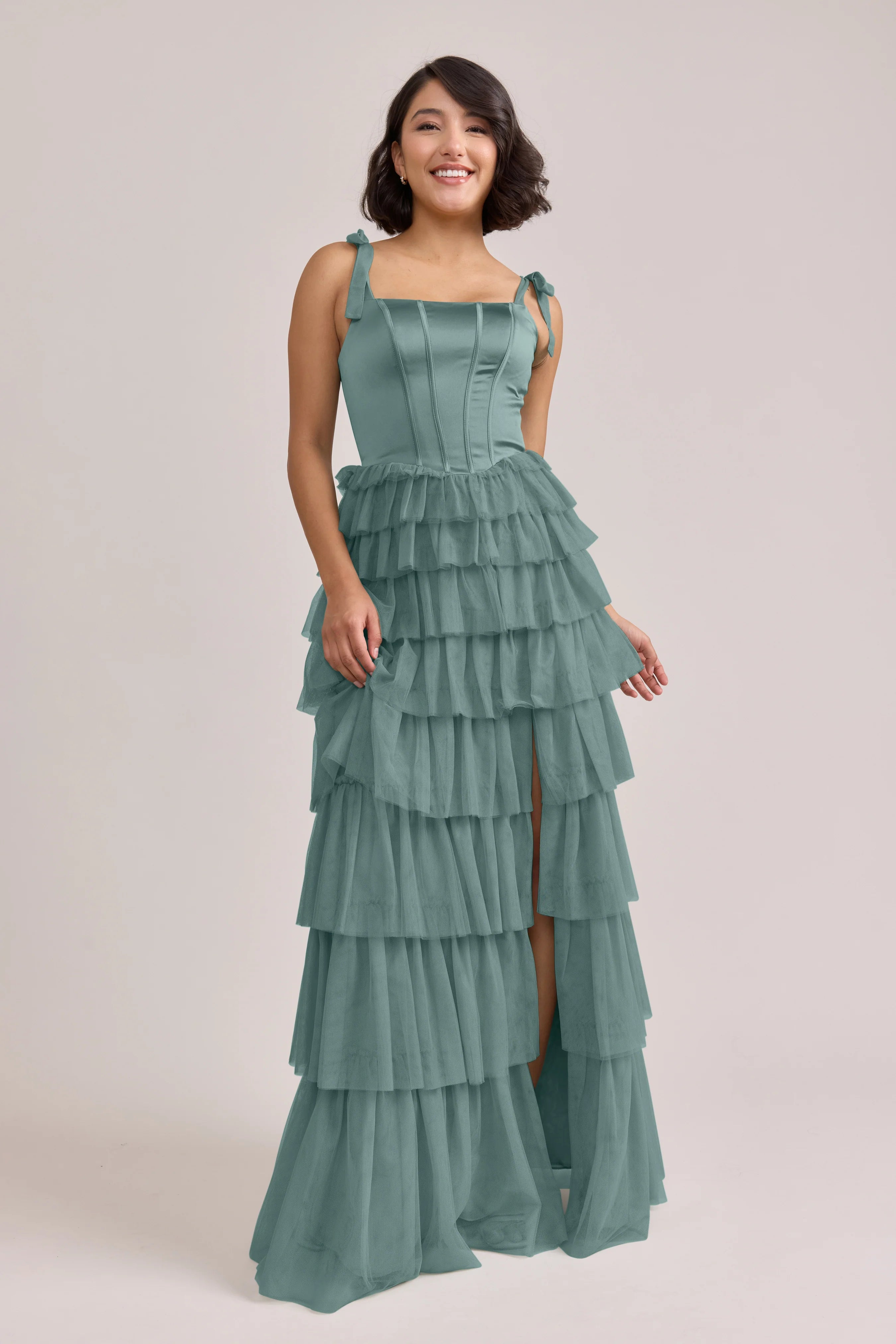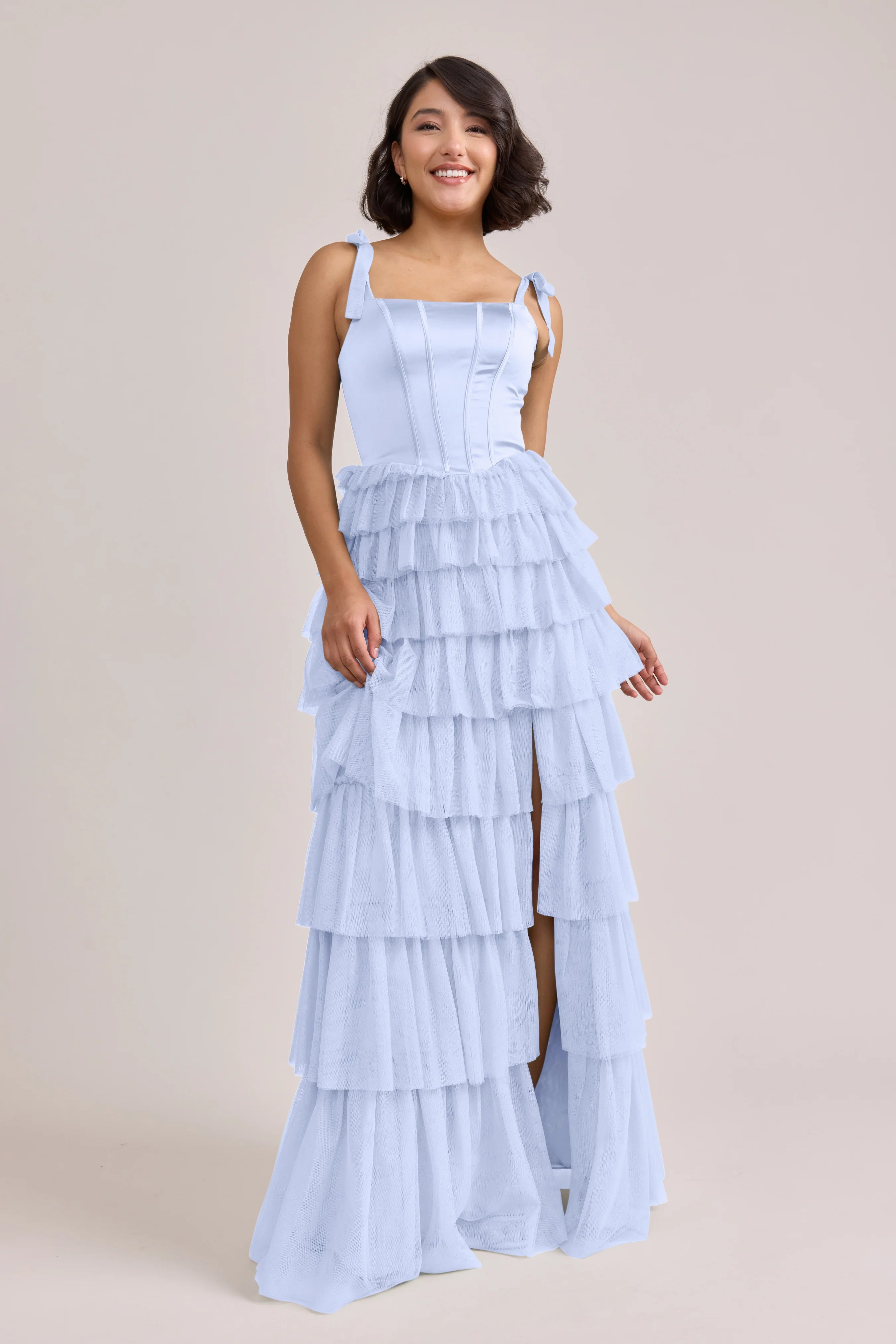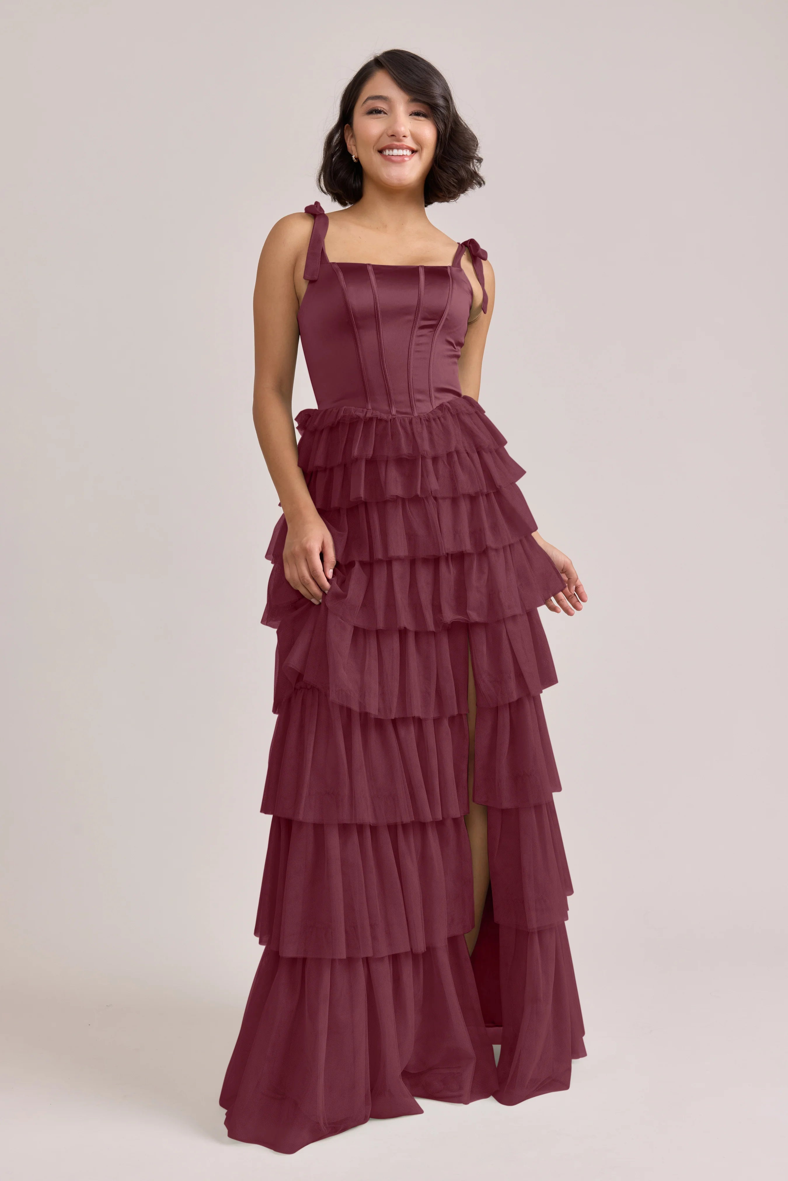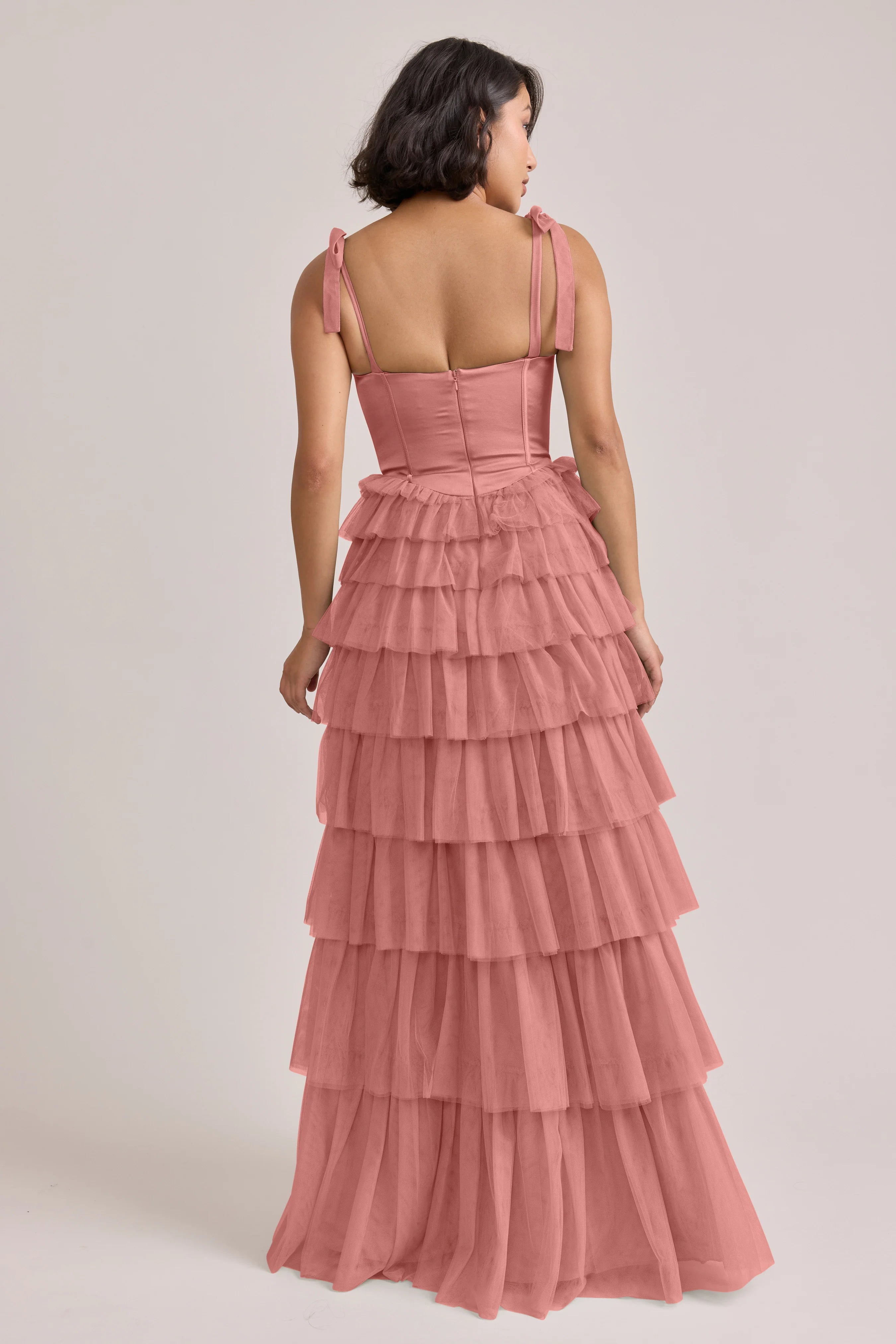 Our Ellapink Satin + Tulle Dress gives all the whimsy and ruffles you could ask for. She features a satin corset bodice with self-tie tulle bow straps, and gorgeous tiers of cascading tulle ruffles. Her trending basque waistline and front slit add the perfect modern touches to her design.