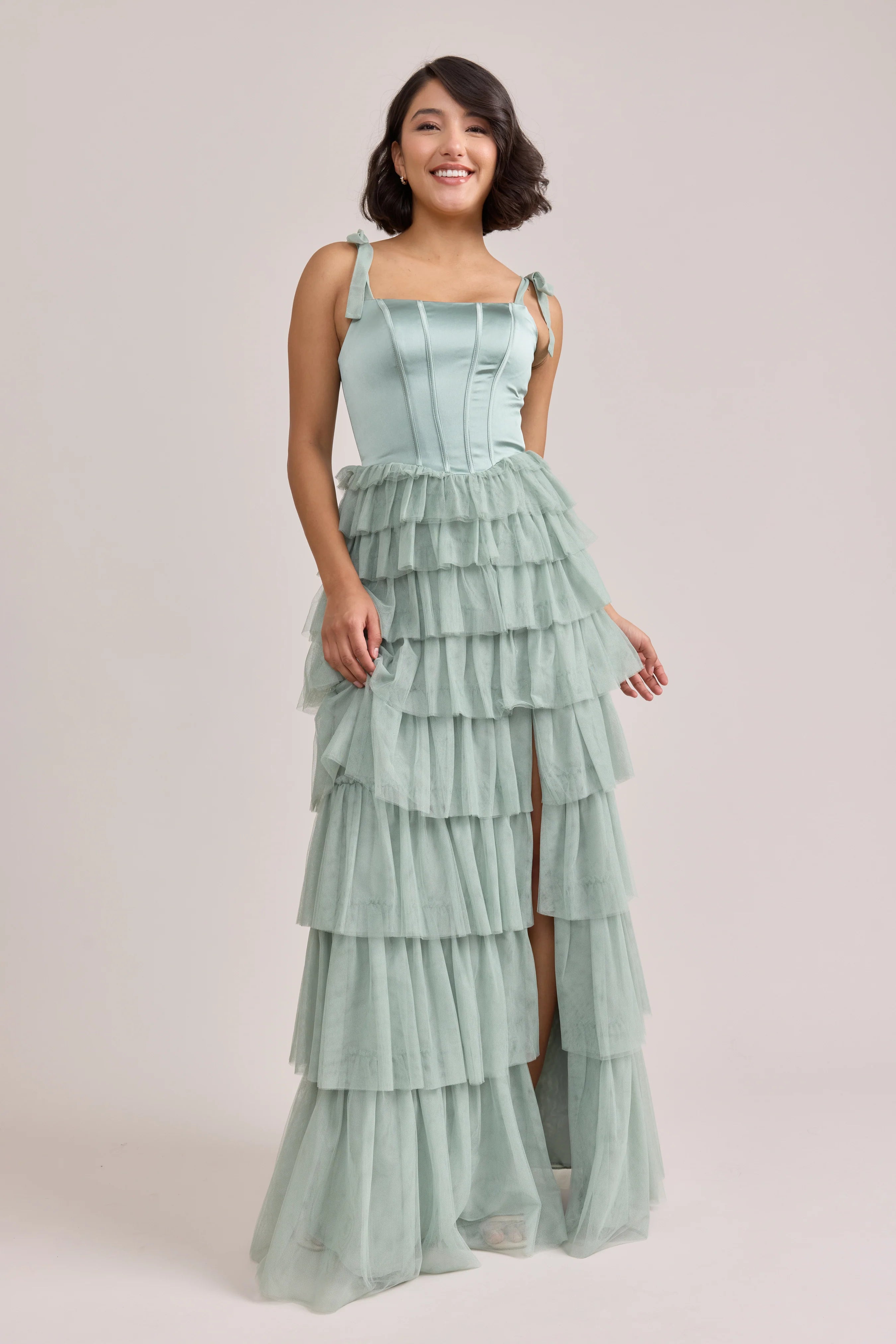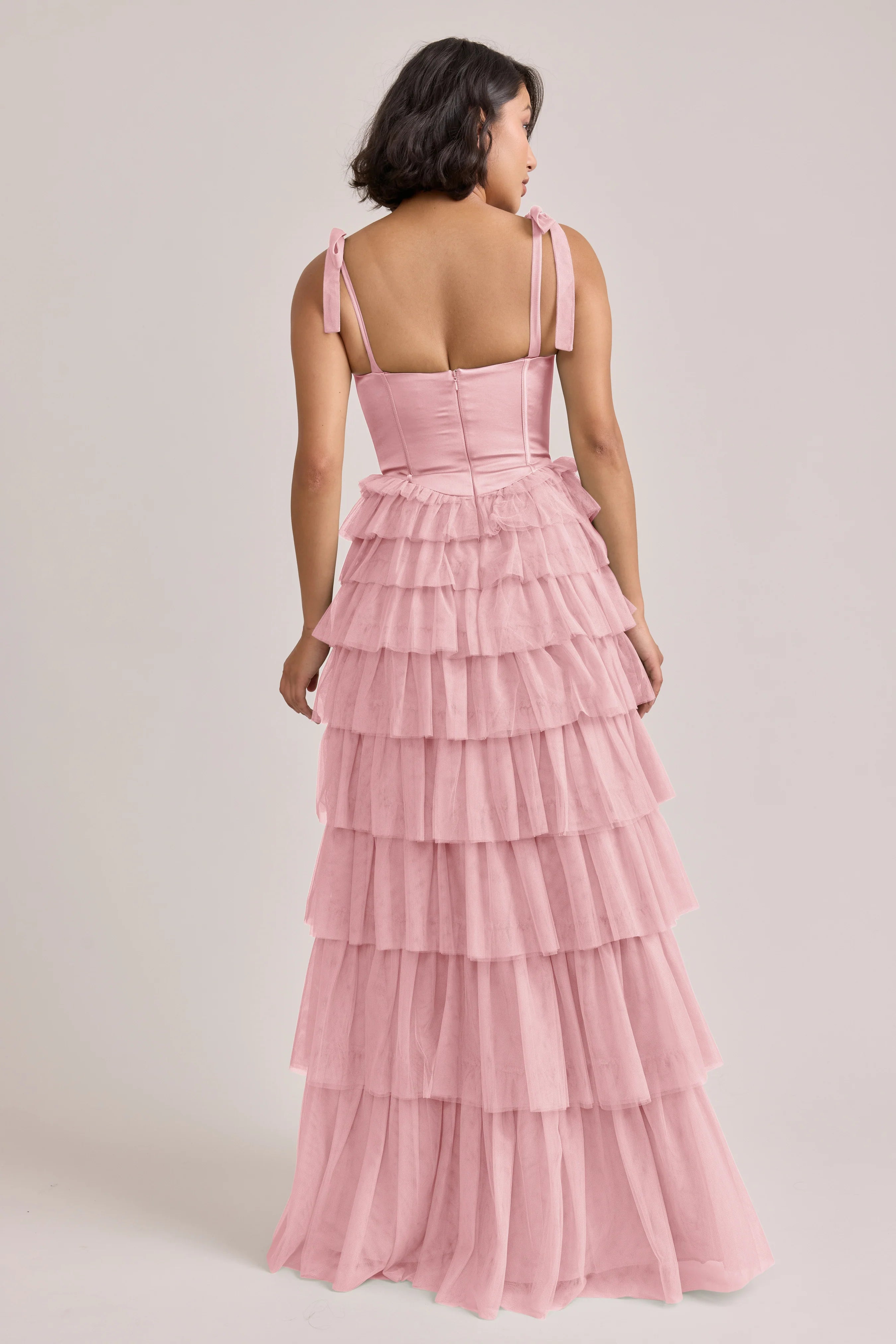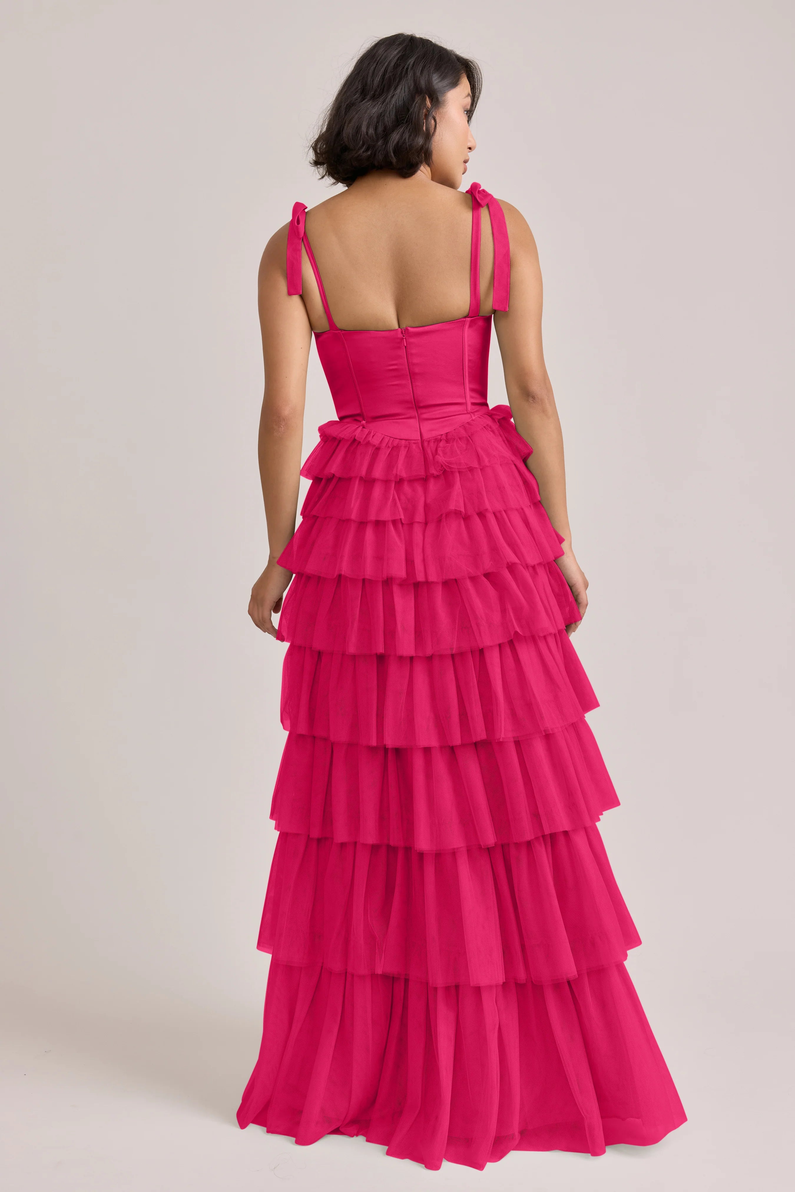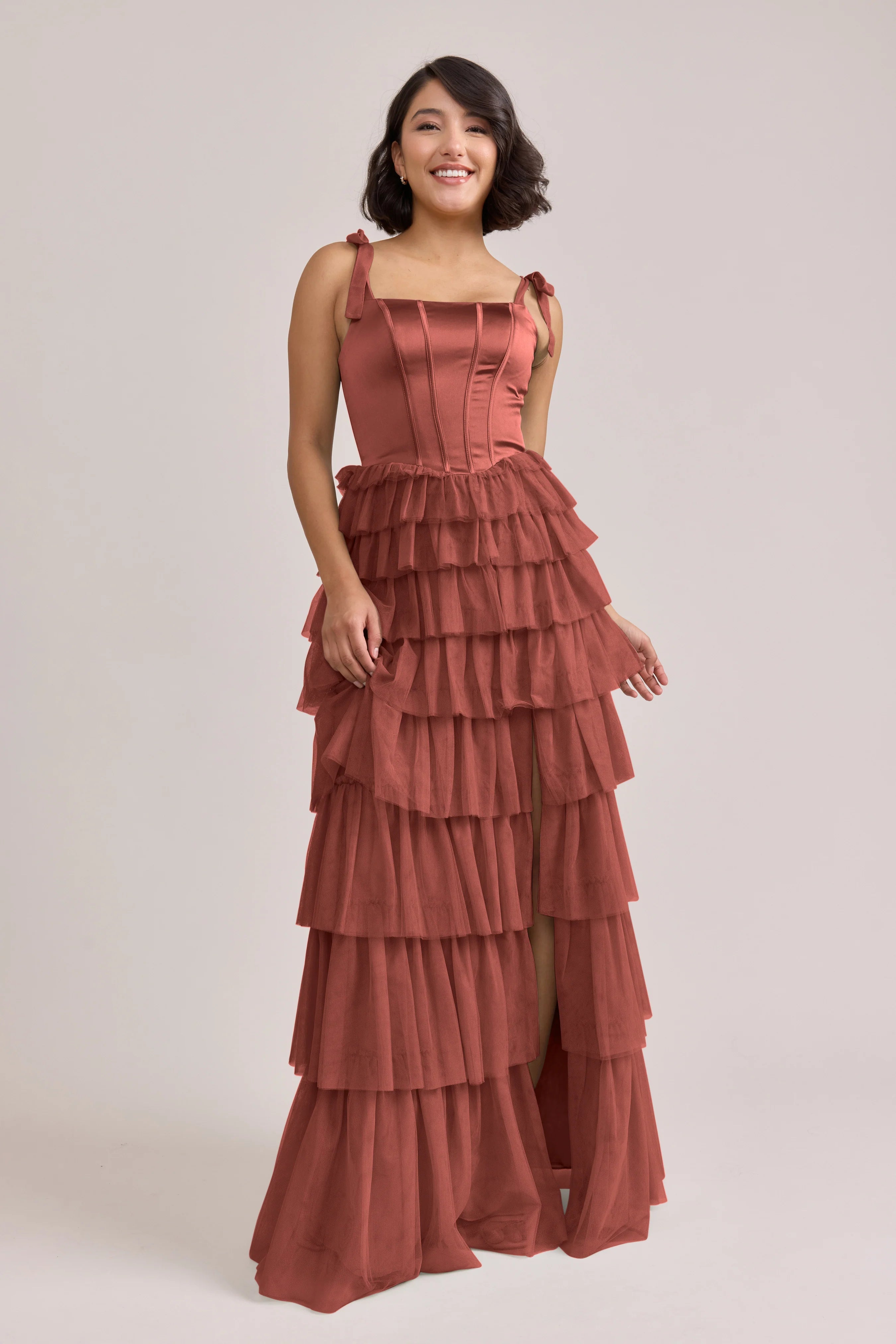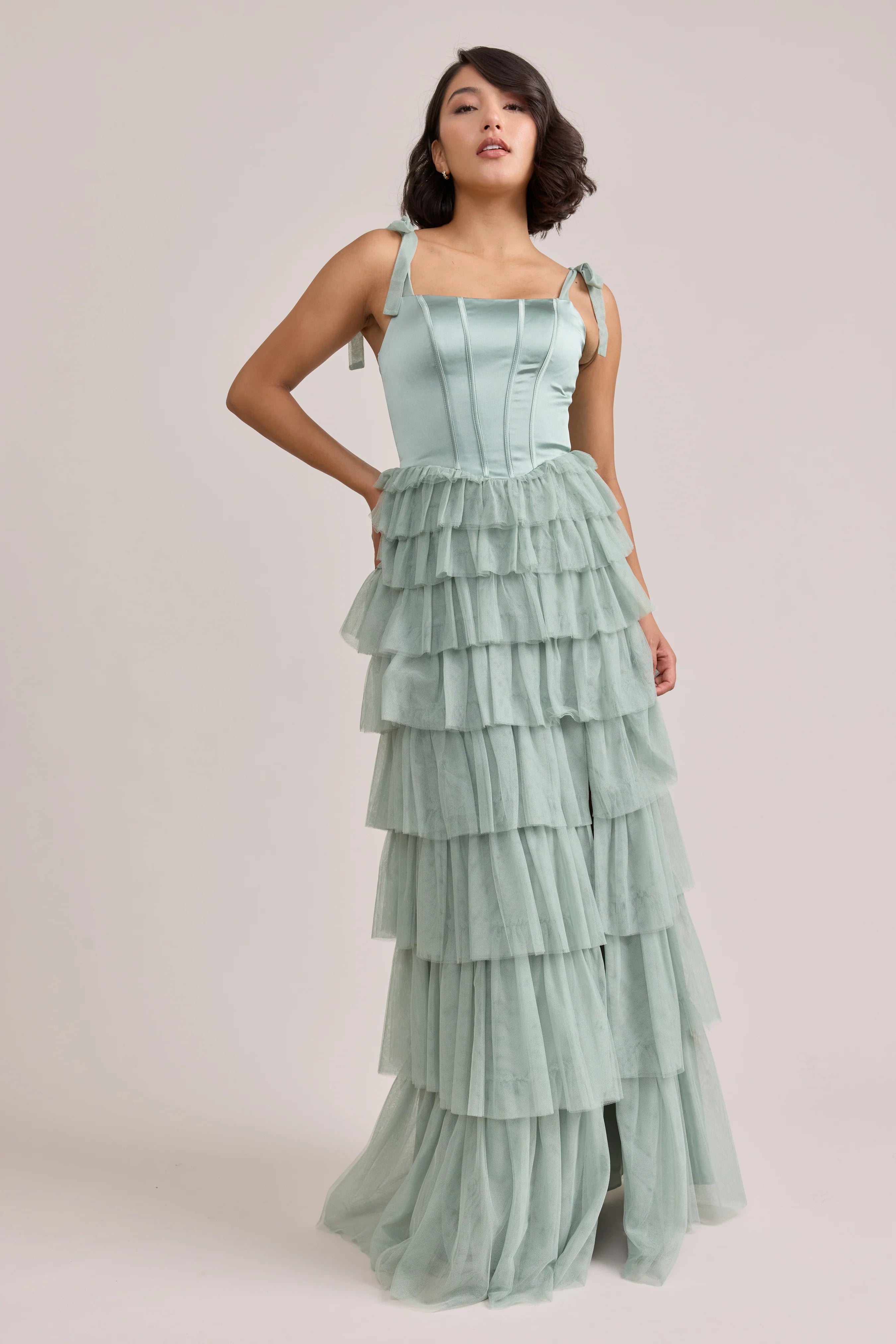 Our Ellapink Satin + Tulle Dress gives all the whimsy and ruffles you could ask for. She features a satin corset bodice with self-tie tulle bow straps, and gorgeous tiers of cascading tulle ruffles. Her trending basque waistline and front slit add the perfect modern touches to her design.