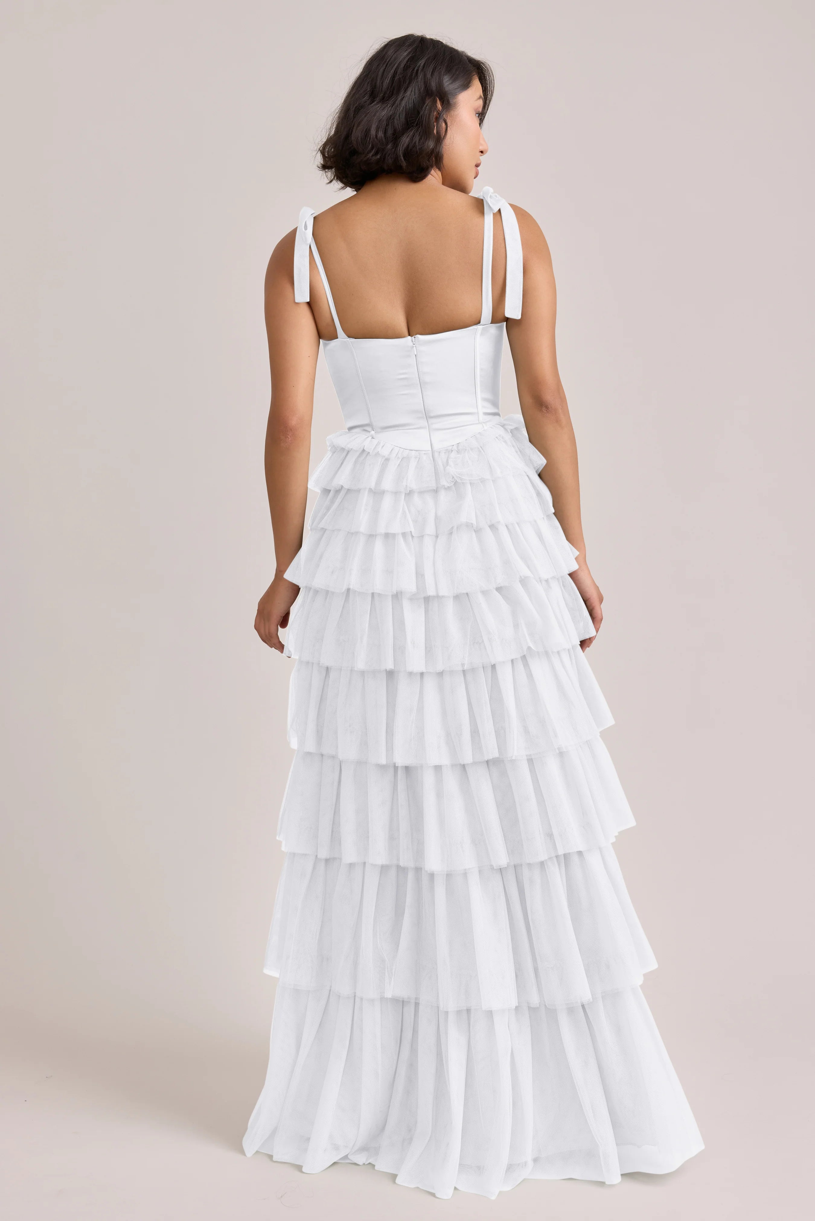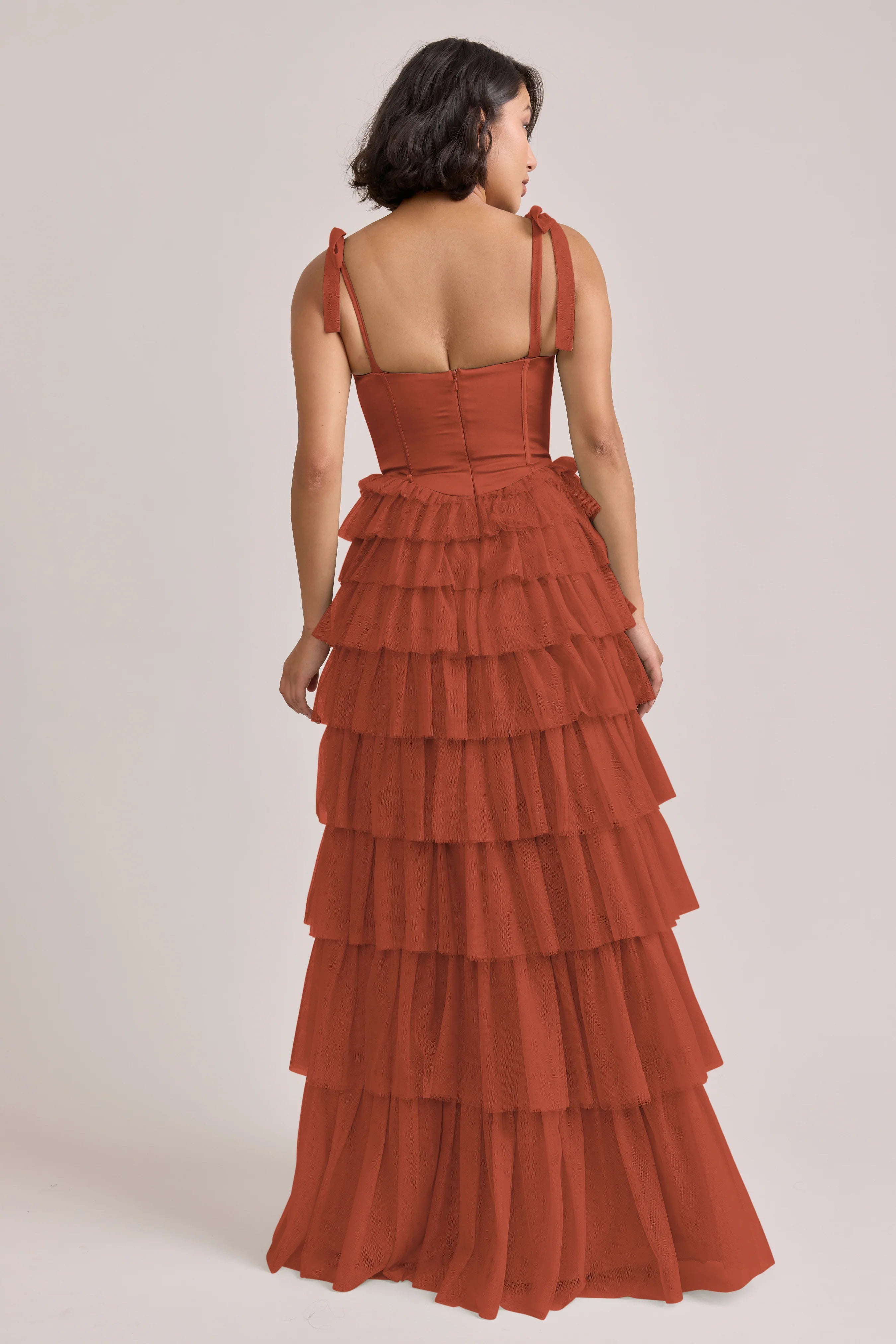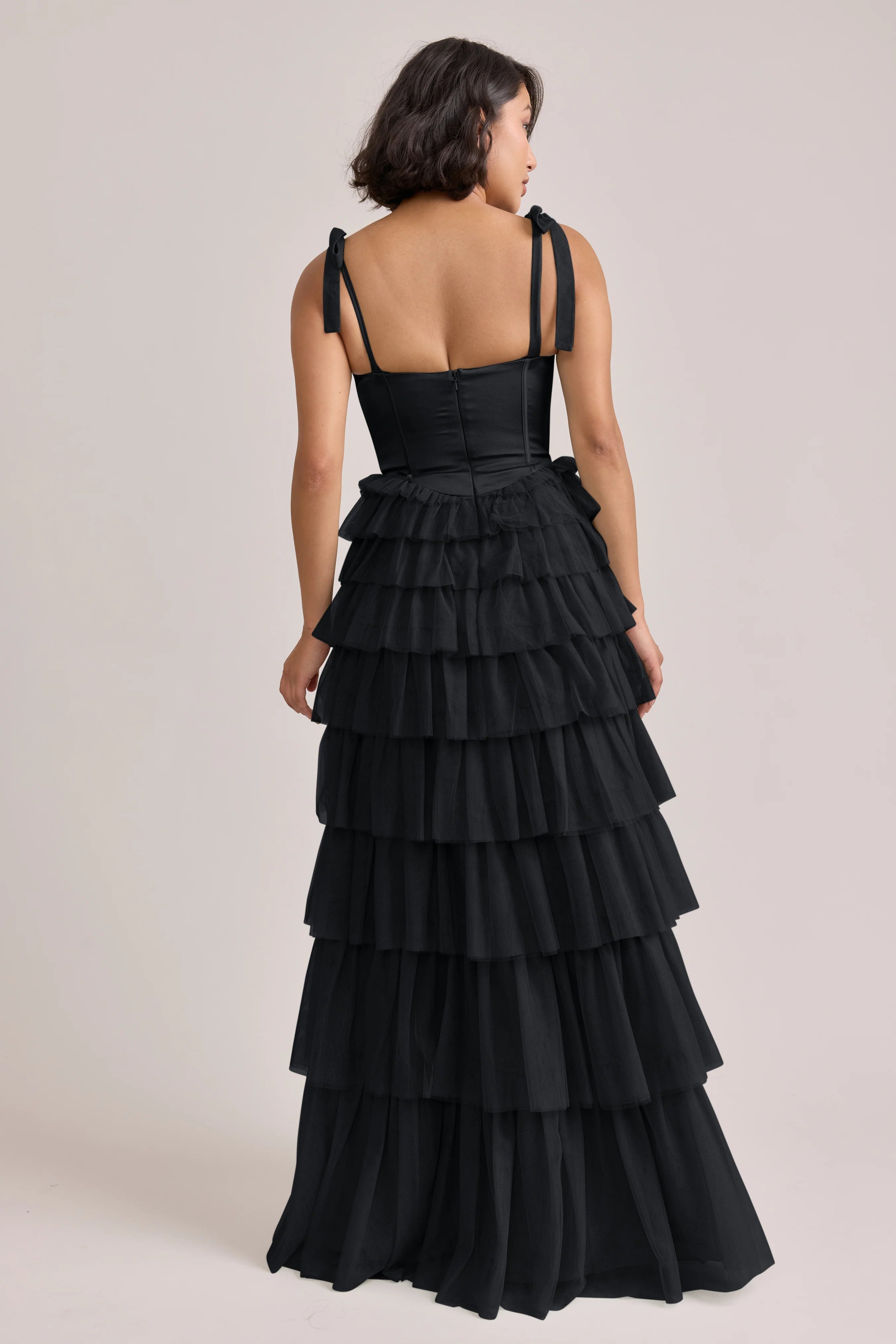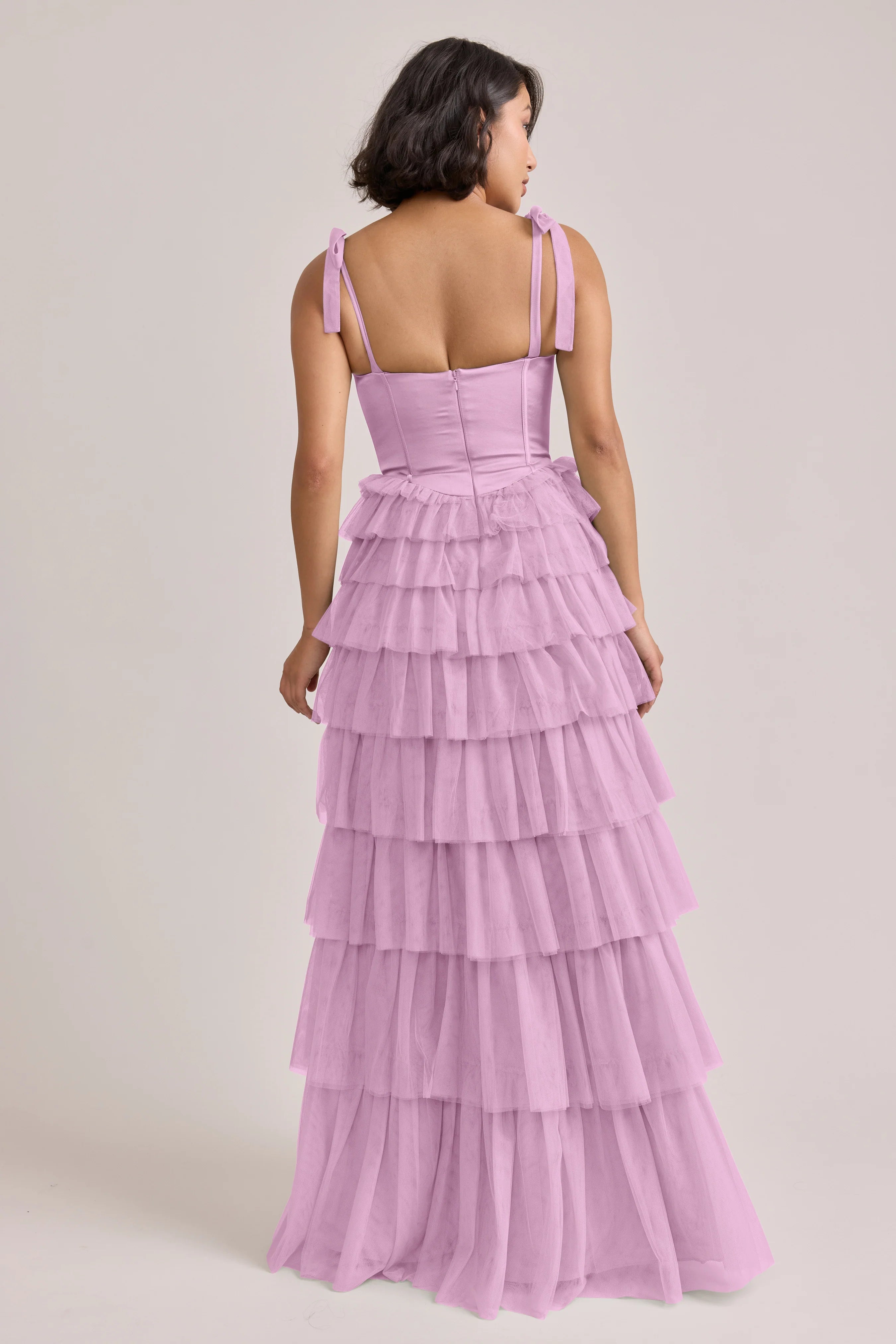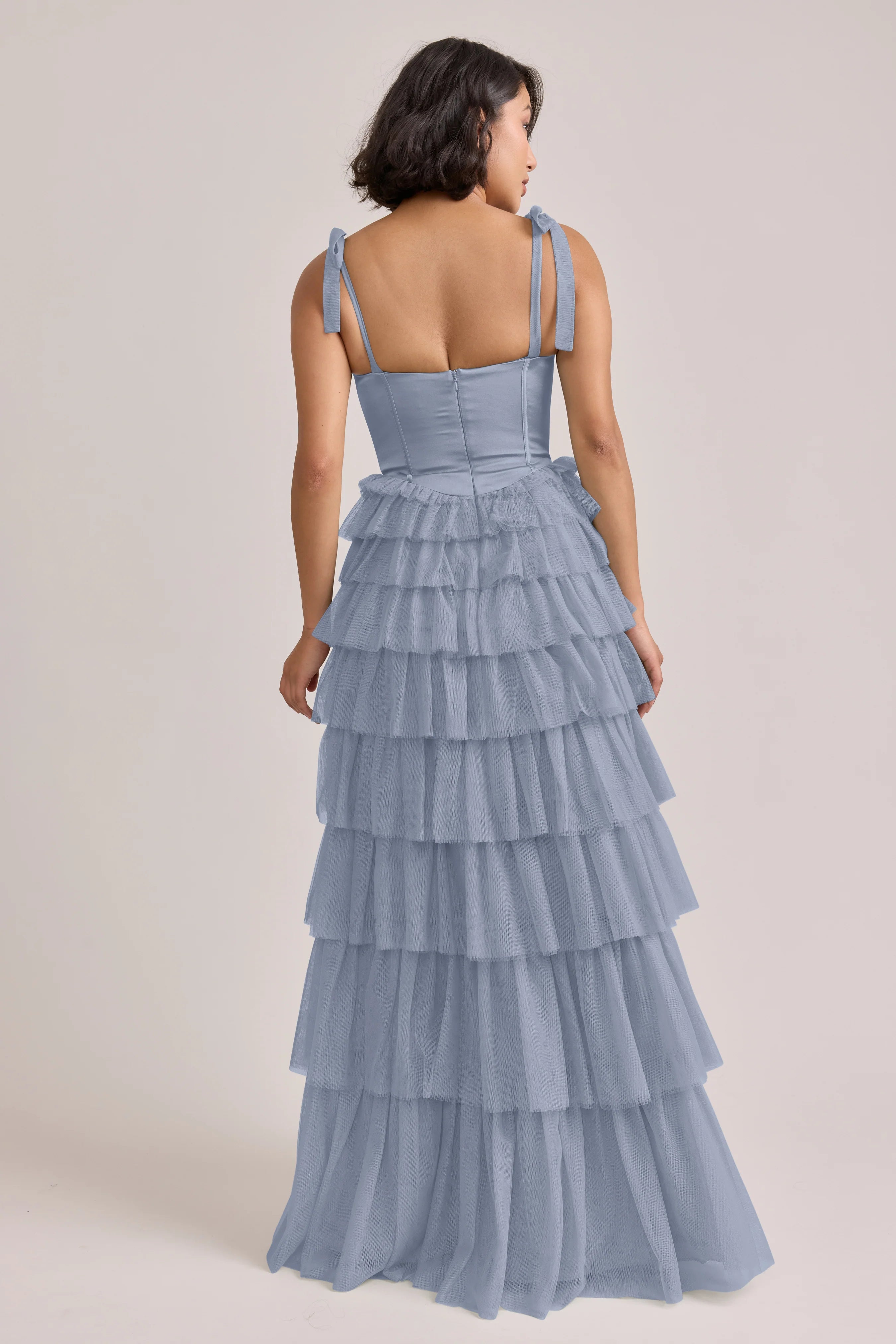 Our Ellapink Satin + Tulle Dress gives all the whimsy and ruffles you could ask for. She features a satin corset bodice with self-tie tulle bow straps, and gorgeous tiers of cascading tulle ruffles. Her trending basque waistline and front slit add the perfect modern touches to her design.