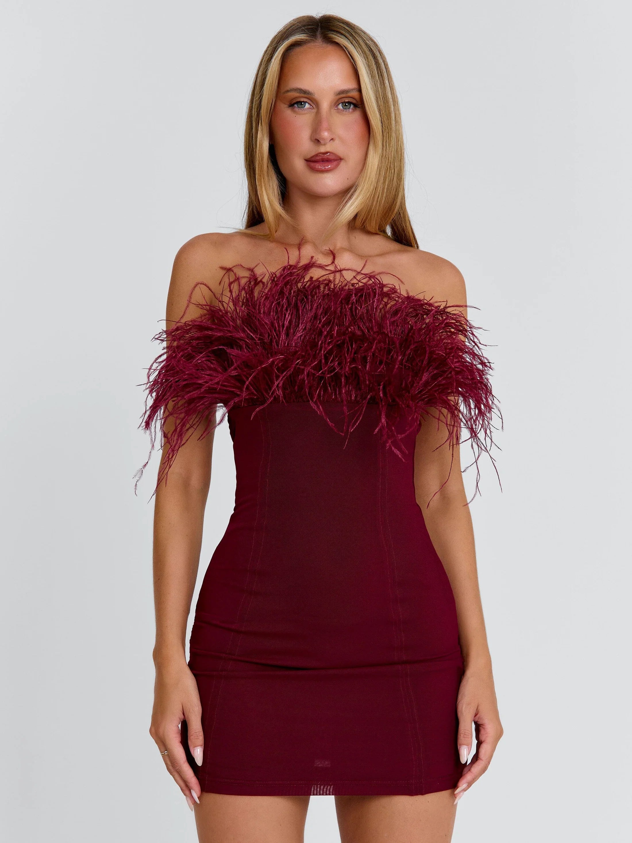 Crafted from a stretch woven fabrication, this fitted, strapless mini hugs the body while keeping its shape. The strapless silhouette is finished with a statement feather trim across the bust, adding texture and drama to the look. A bra-style clasp closure at the back keeps the fit secure, while an invisible side zip allows for easy on and off.