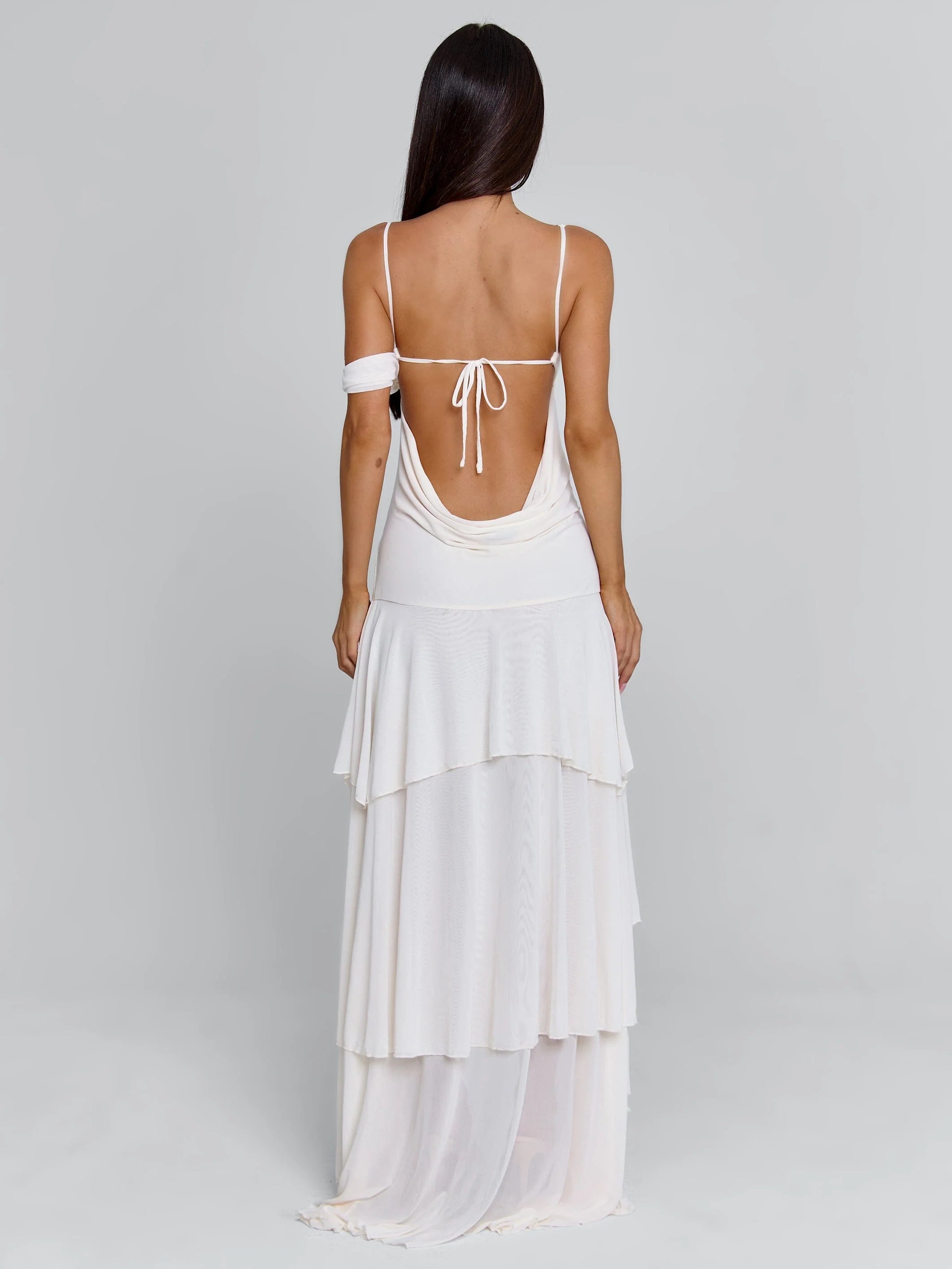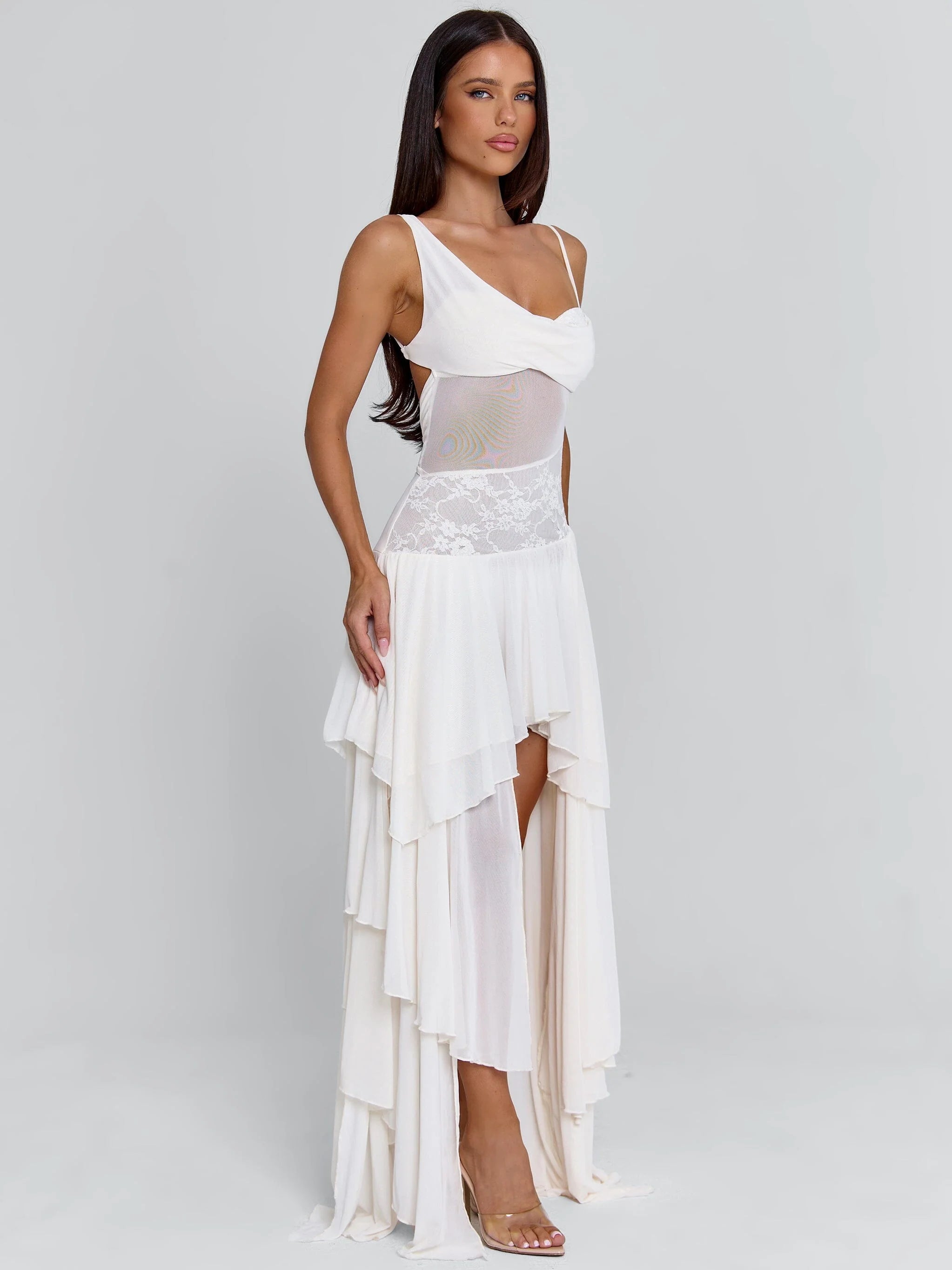 Crafted from soft mesh fabrication, Sinora features an asymmetrical draped bust designed to sit smoothly across the body. Adjustable shoulder and back straps allow for a customised fit, while sheer mesh and lace paneling through the bodice adds subtle detail. The open back with a soft cowl finish balances the look, flowing into a layered maxi skirt with soft volume and movement.
