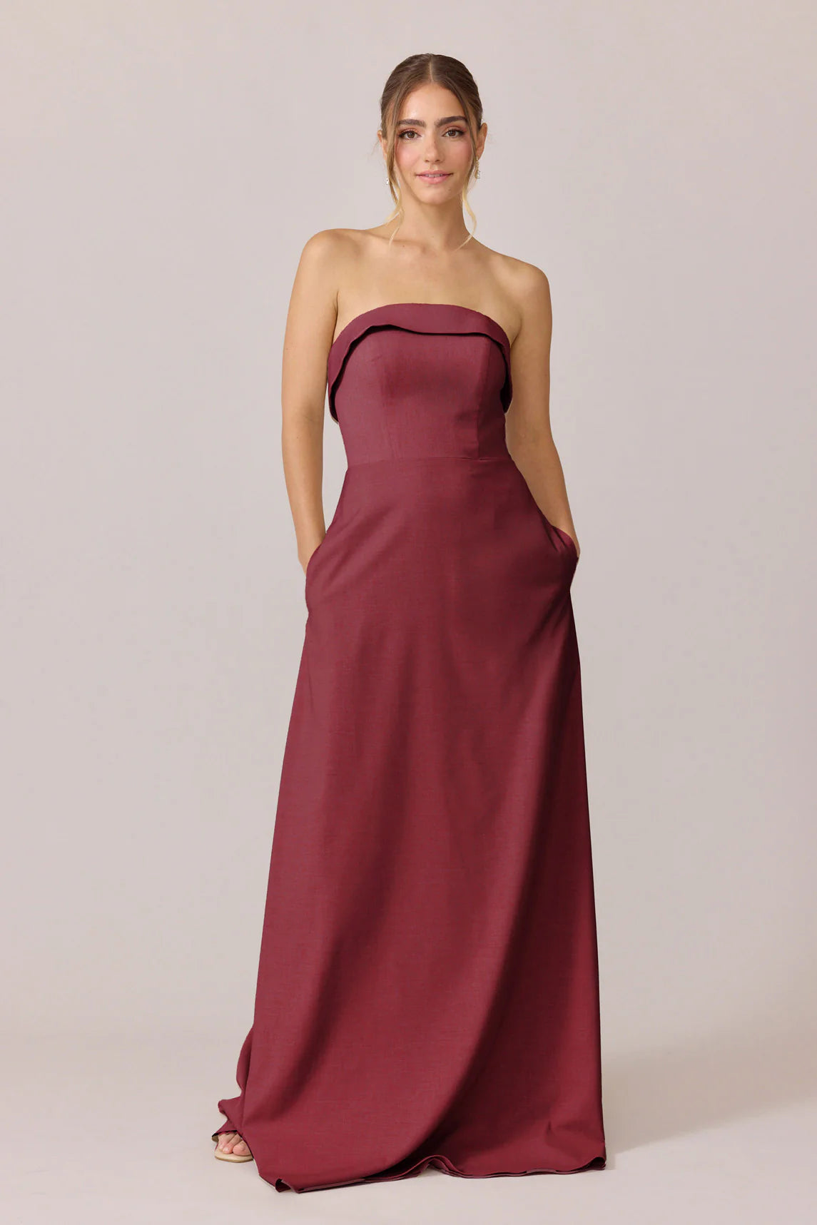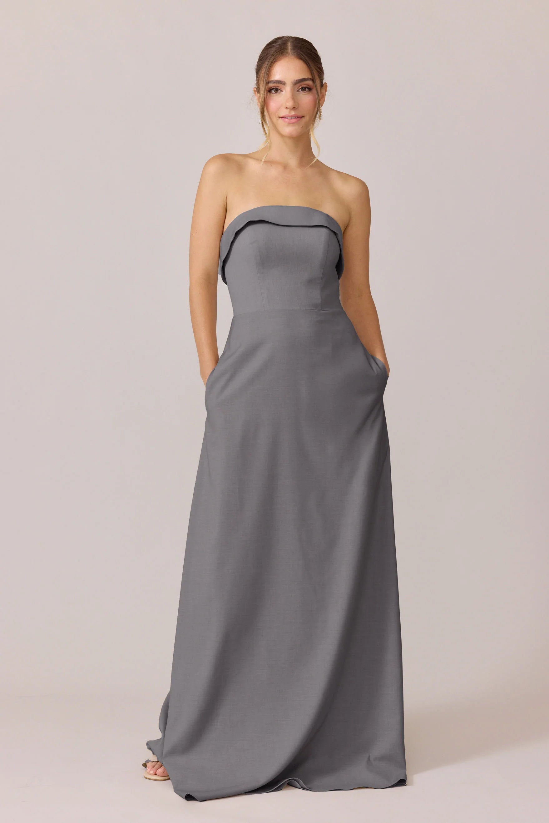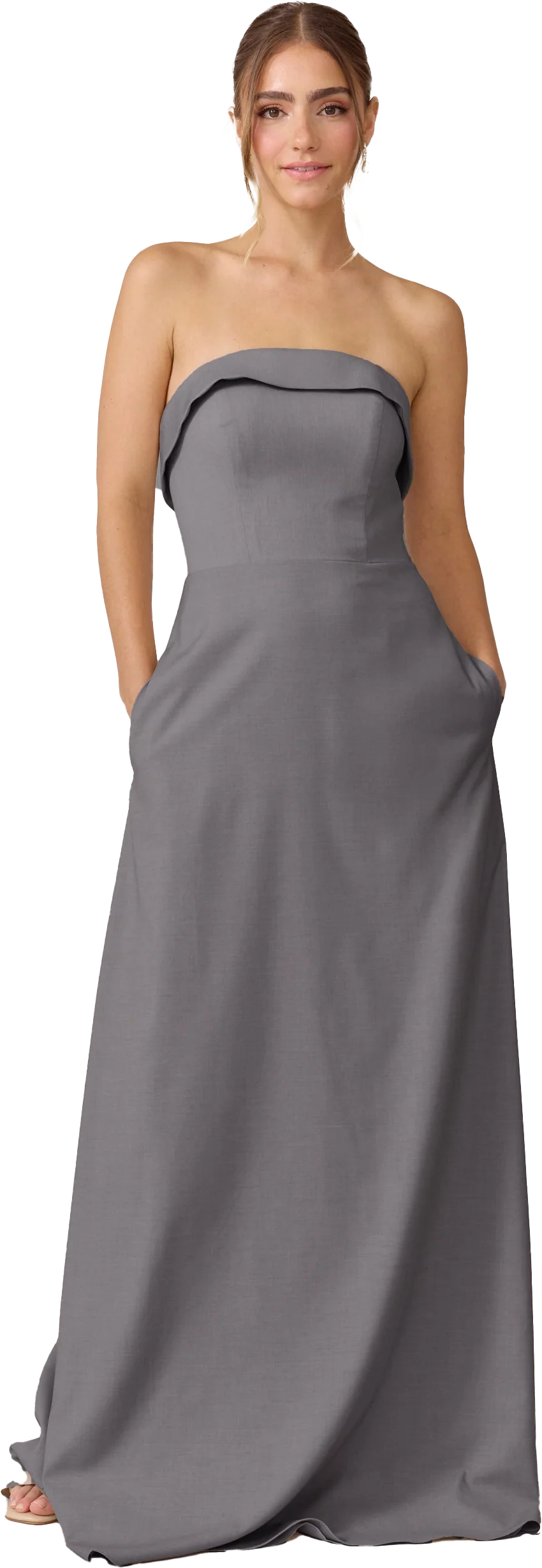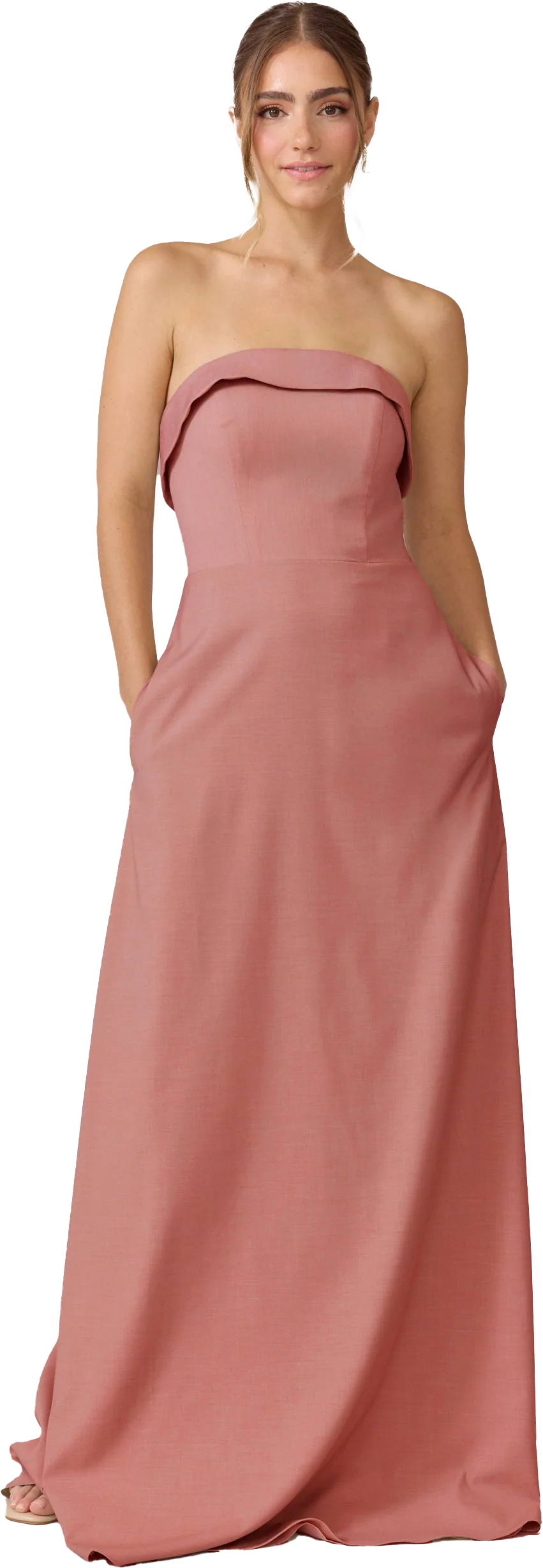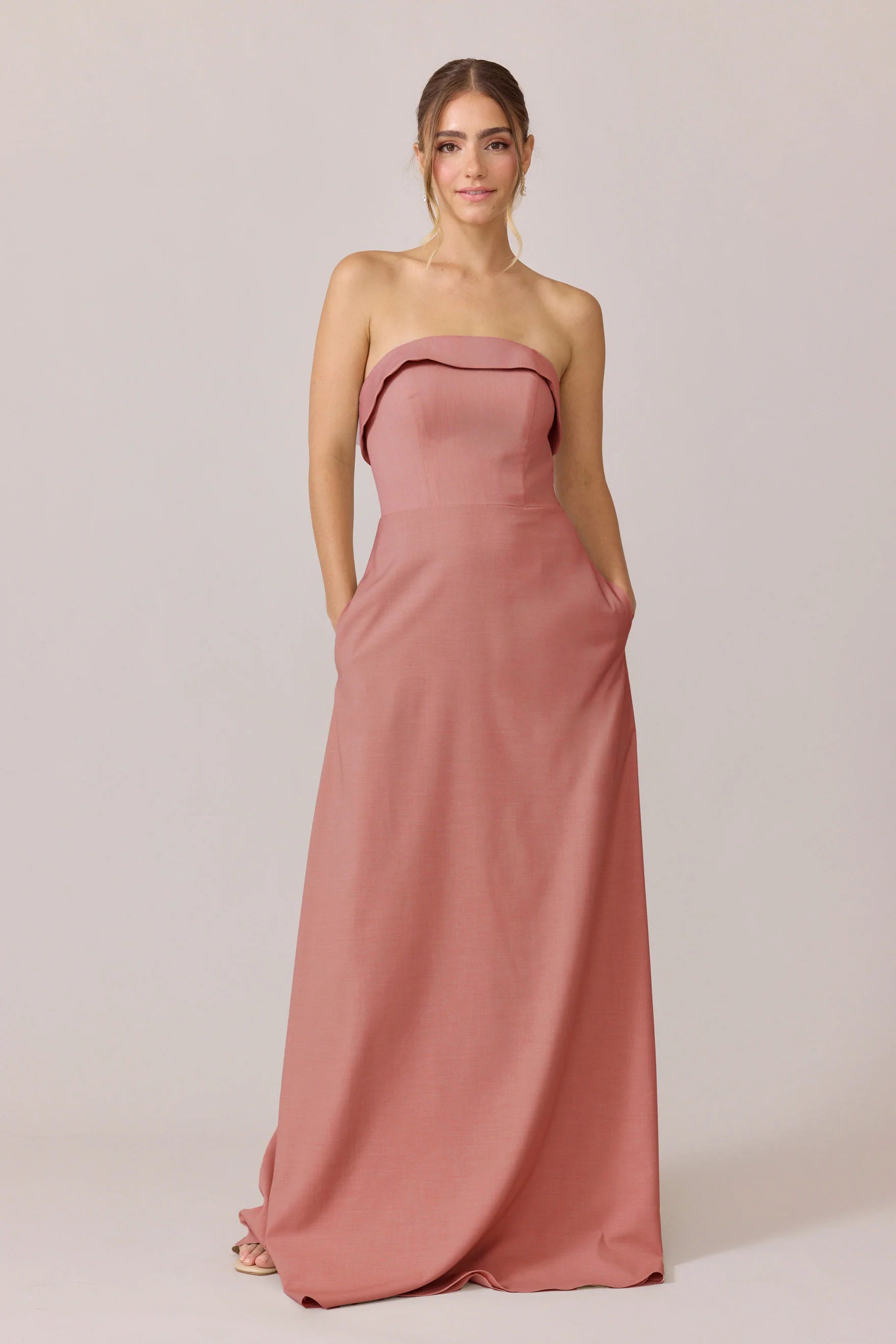 Sharp, structured, and effortlessly cool—the Ellapink Suiting Dress is where modern tailoring meets bridal party chic. Crafted from our premium suiting fabric to coordinate perfectly with our groomsman styles, Clarke features a clean A-line silhouette, a strapless foldover neckline, and—yes—pockets. Built-in cups and boning provide subtle structure, while the full-length double lining ensures a smooth, confident fit from first look to final dance.