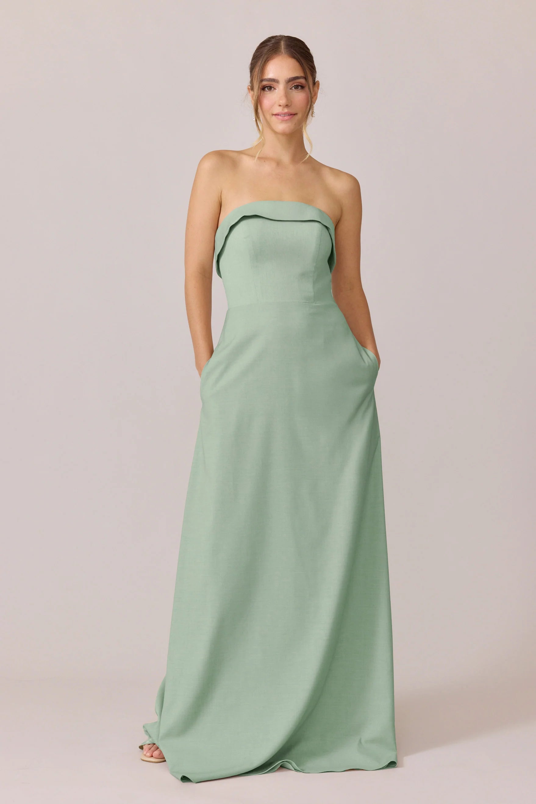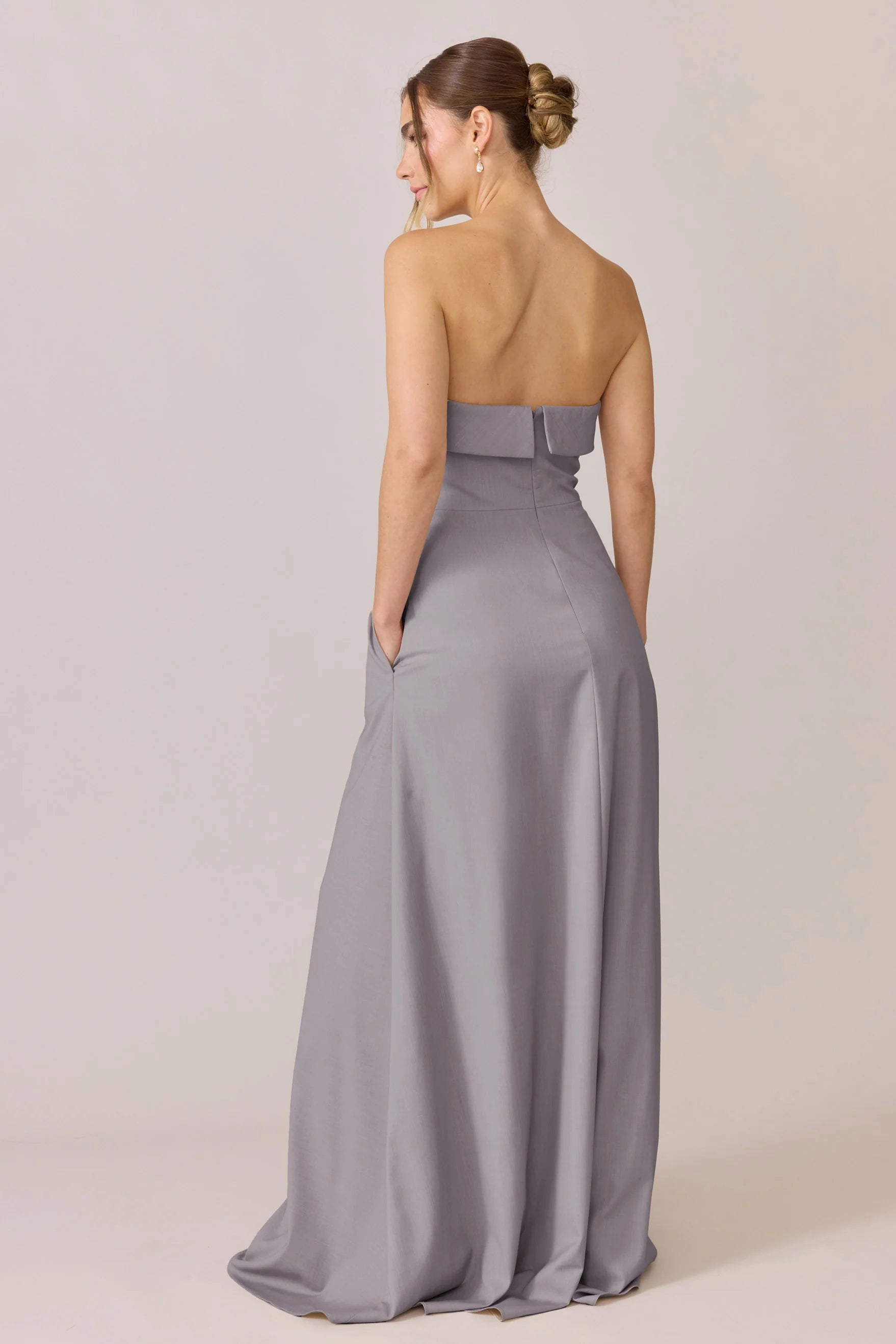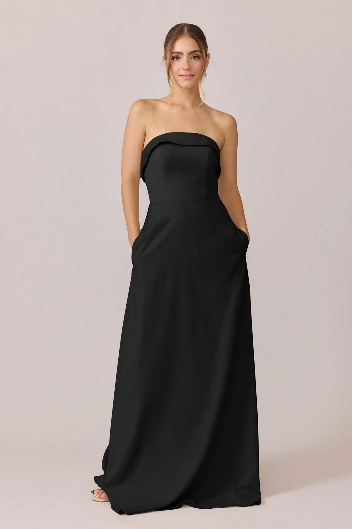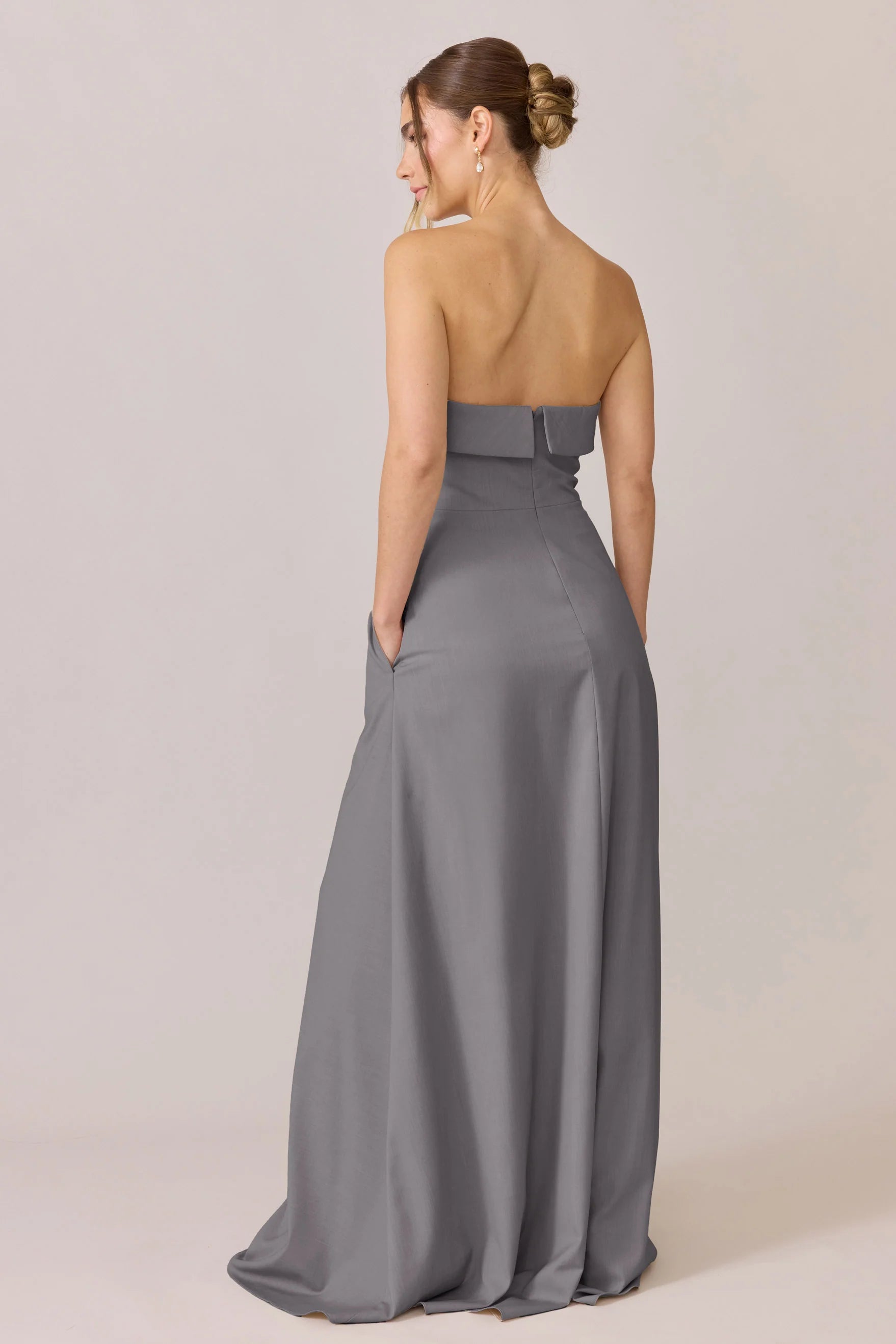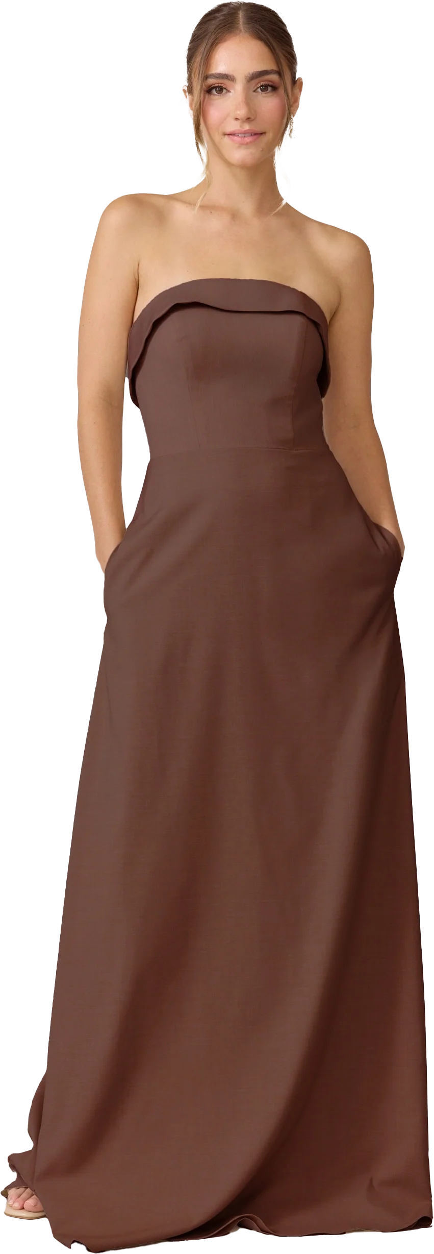 Sharp, structured, and effortlessly cool—the Ellapink Suiting Dress is where modern tailoring meets bridal party chic. Crafted from our premium suiting fabric to coordinate perfectly with our groomsman styles, Clarke features a clean A-line silhouette, a strapless foldover neckline, and—yes—pockets. Built-in cups and boning provide subtle structure, while the full-length double lining ensures a smooth, confident fit from first look to final dance.