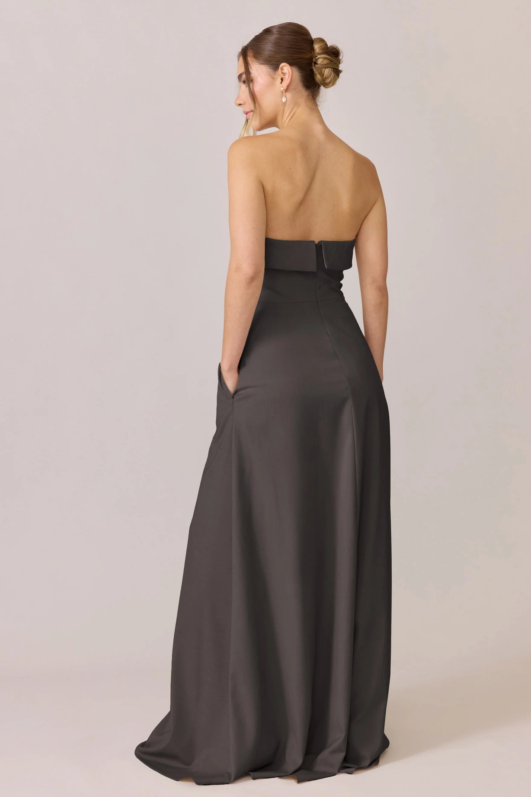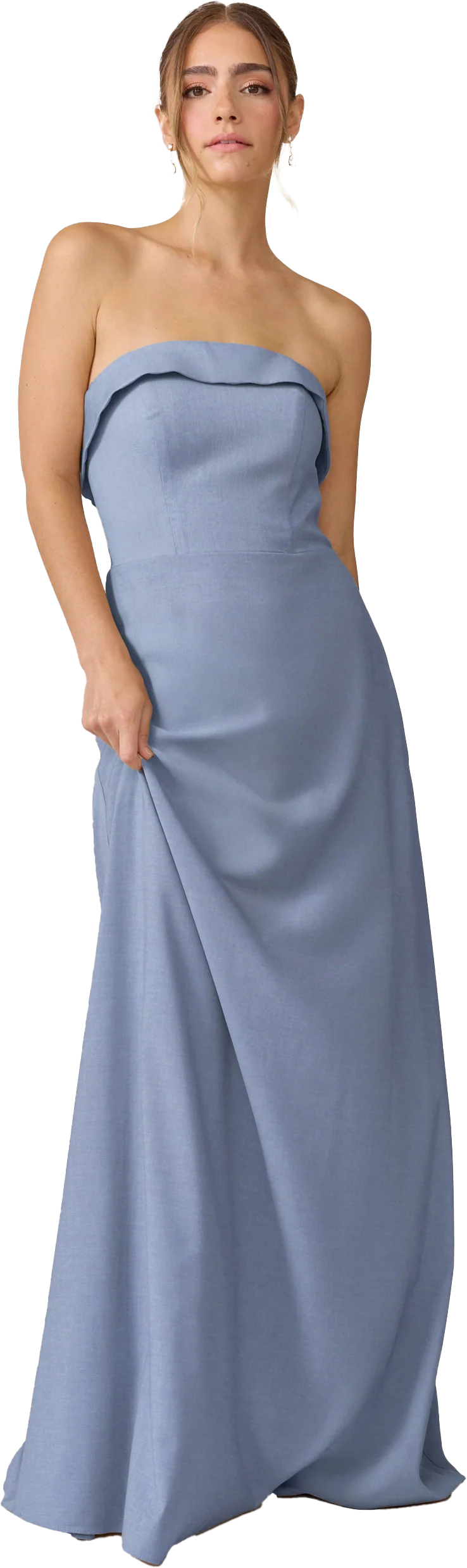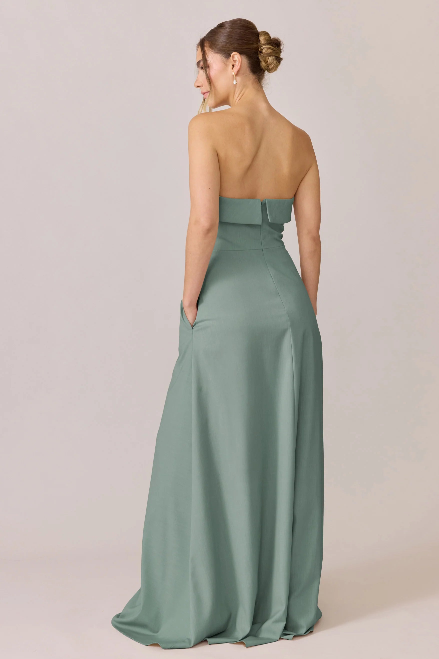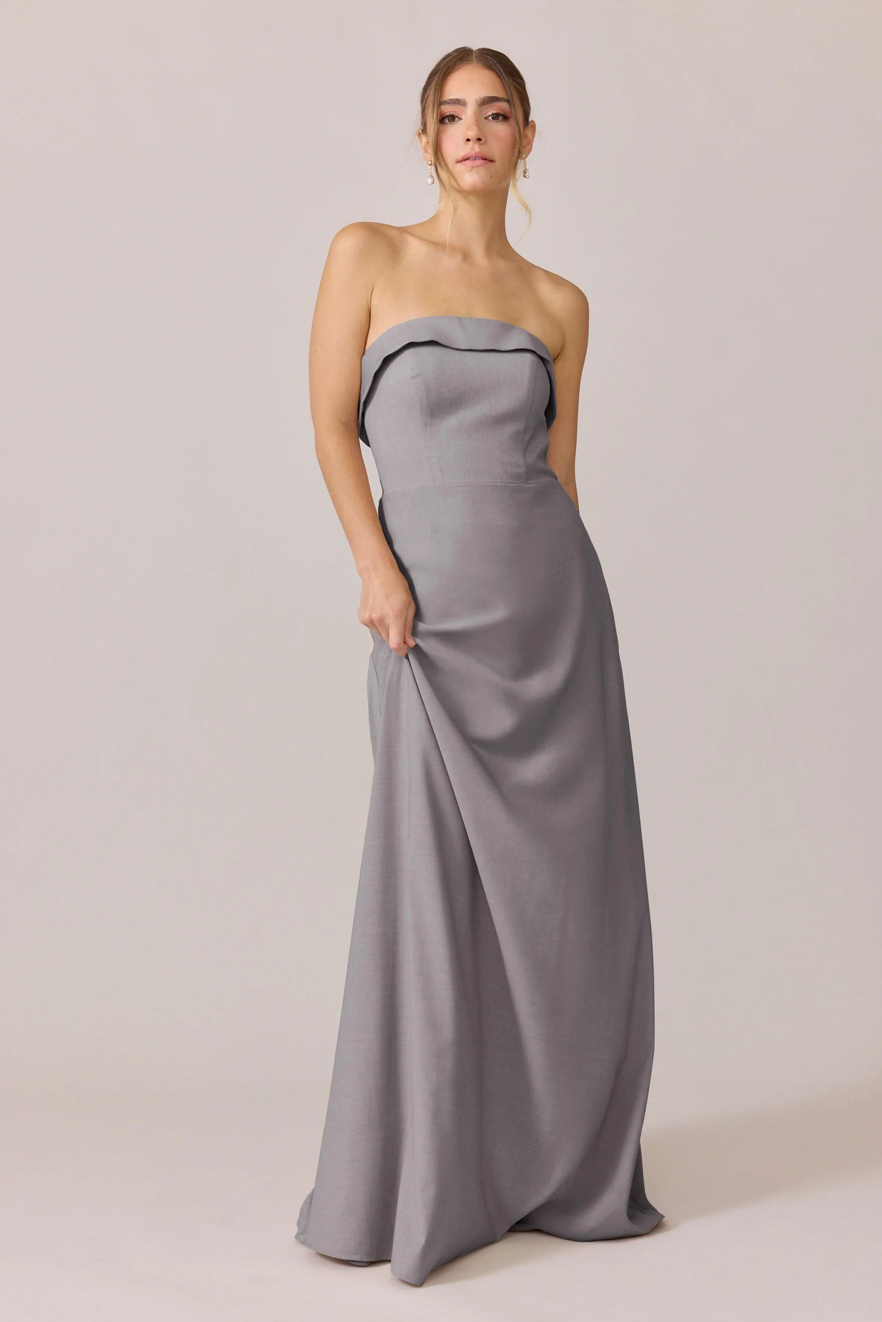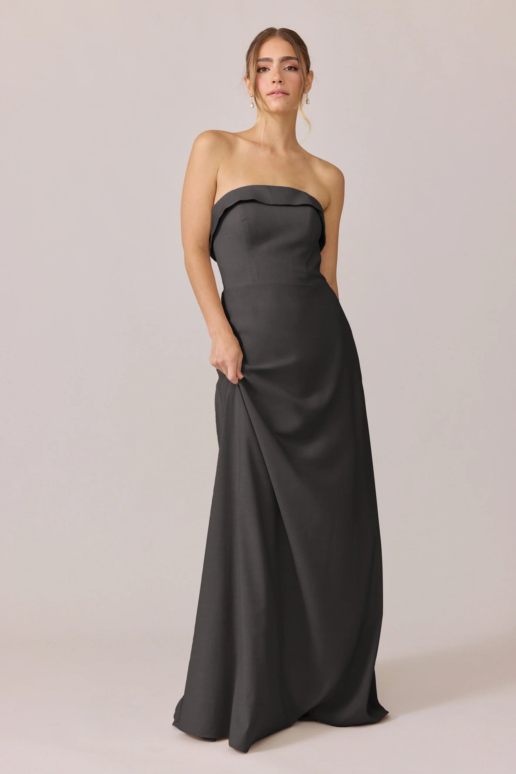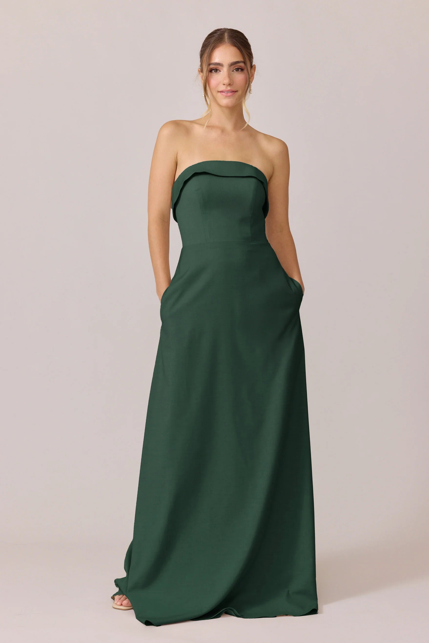 Sharp, structured, and effortlessly cool—the Ellapink Suiting Dress is where modern tailoring meets bridal party chic. Crafted from our premium suiting fabric to coordinate perfectly with our groomsman styles, Clarke features a clean A-line silhouette, a strapless foldover neckline, and—yes—pockets. Built-in cups and boning provide subtle structure, while the full-length double lining ensures a smooth, confident fit from first look to final dance.