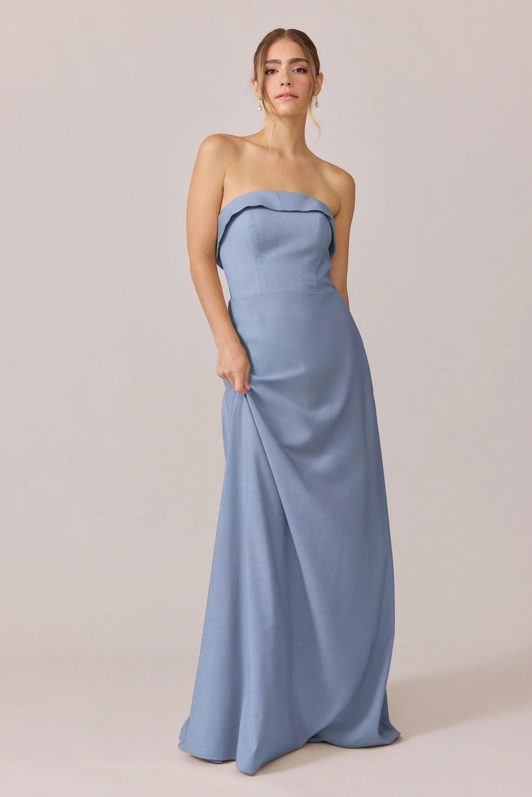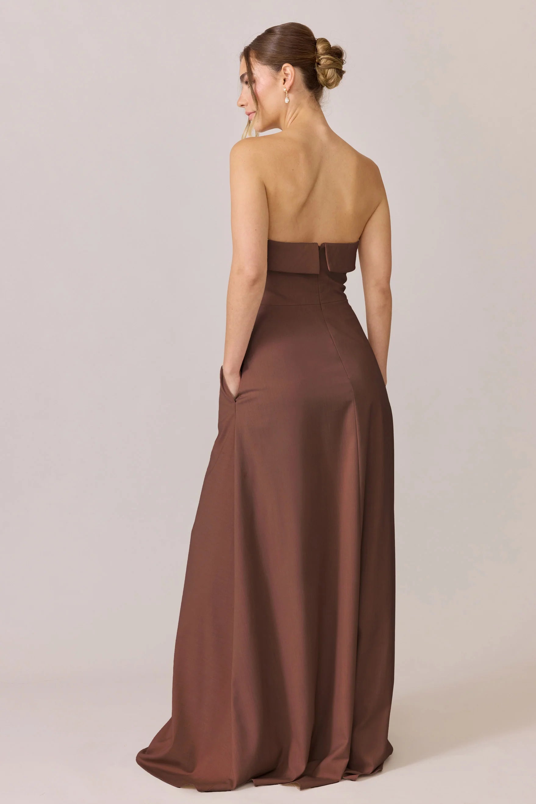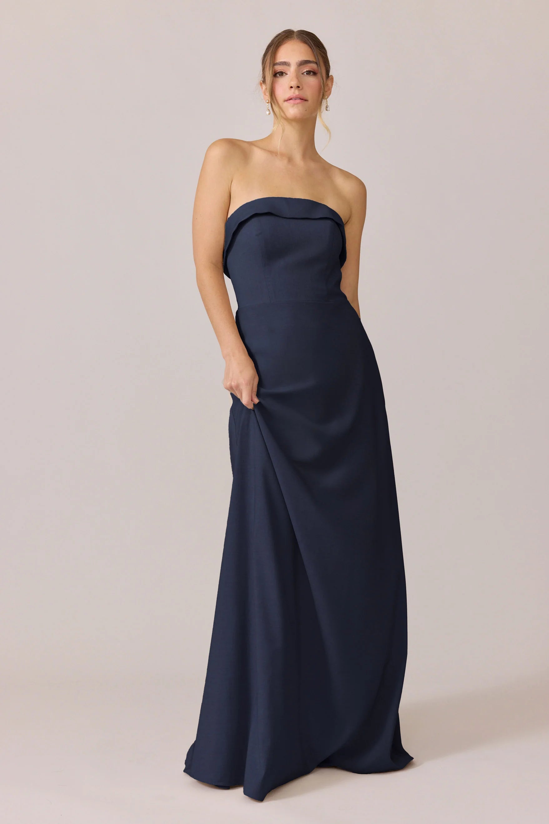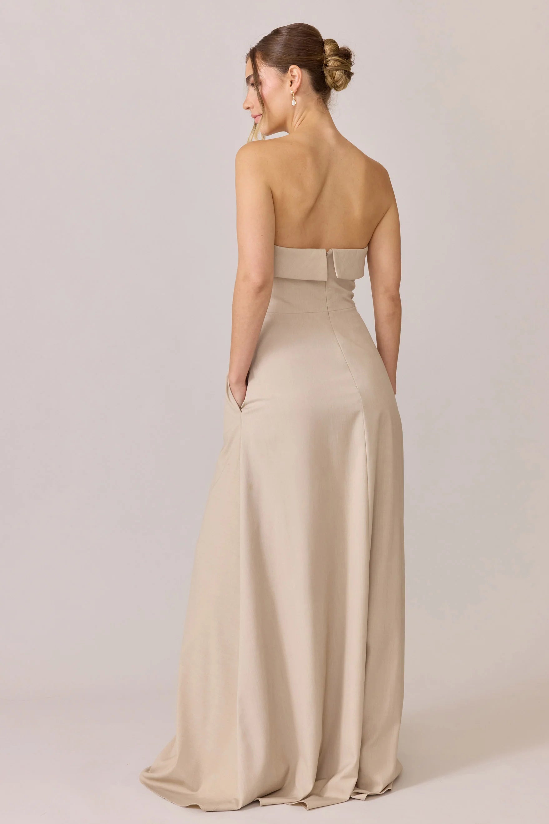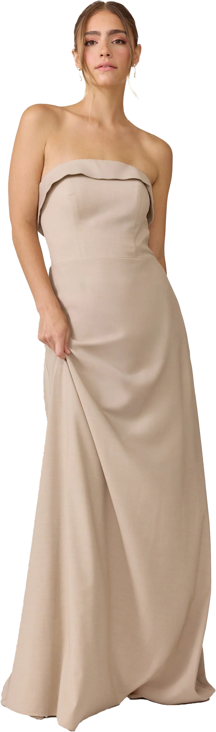 Sharp, structured, and effortlessly cool—the Ellapink Suiting Dress is where modern tailoring meets bridal party chic. Crafted from our premium suiting fabric to coordinate perfectly with our groomsman styles, Clarke features a clean A-line silhouette, a strapless foldover neckline, and—yes—pockets. Built-in cups and boning provide subtle structure, while the full-length double lining ensures a smooth, confident fit from first look to final dance.