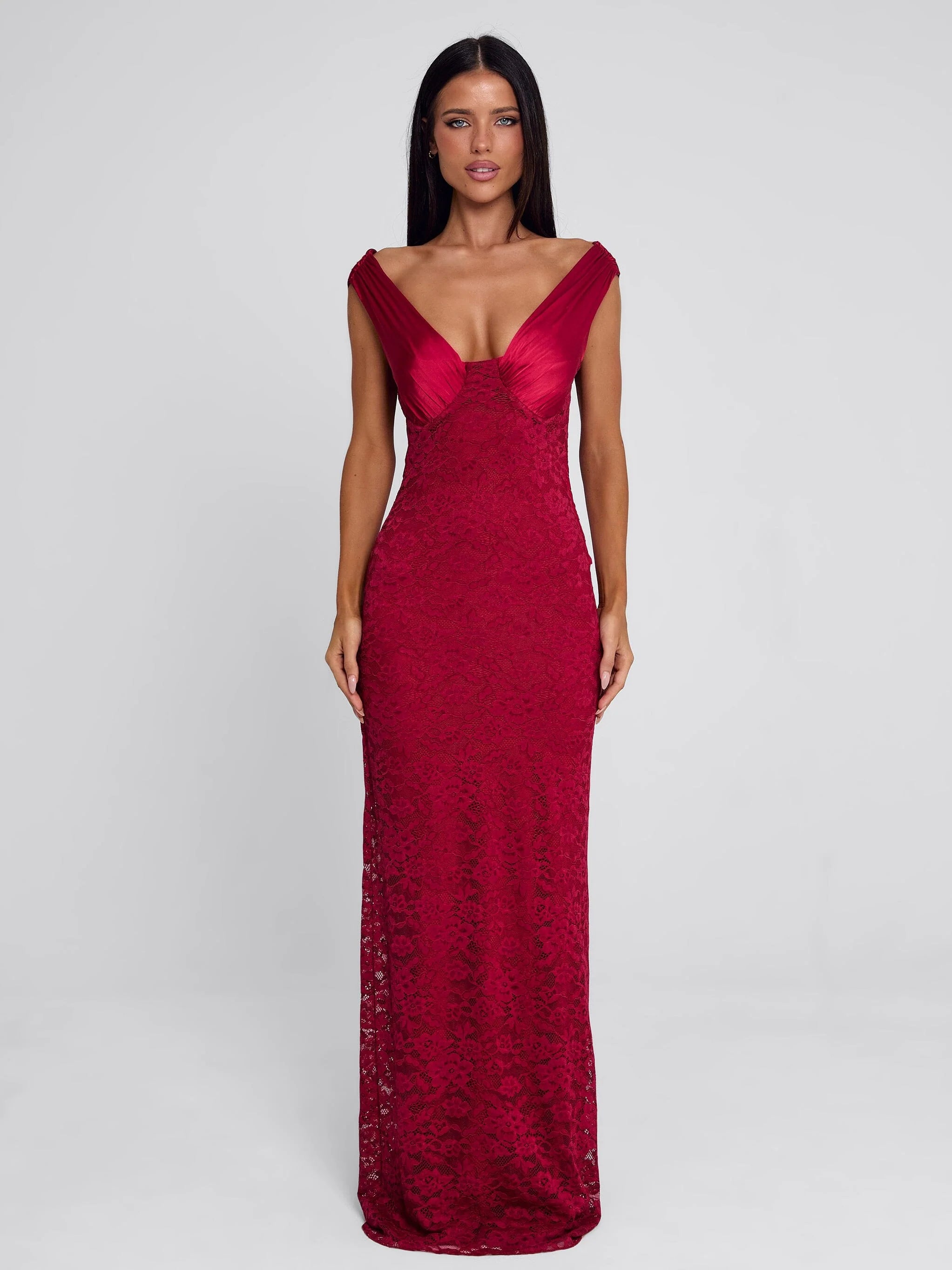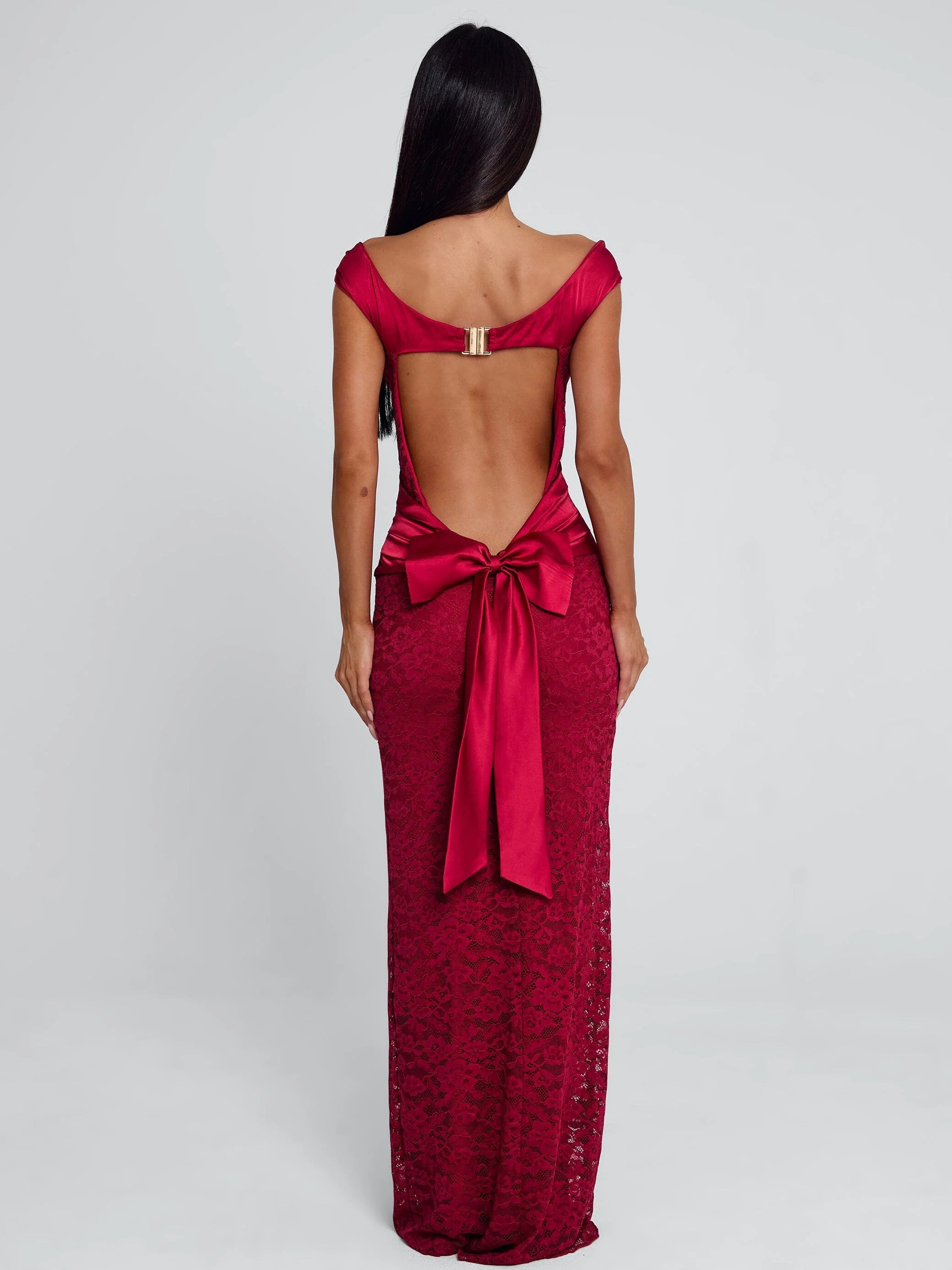 Crafted from a fully lined lace fabrication, she features an off-shoulder satin bust with a soft rose detail at the centre. The open back is finished with a satin clasp at the bust and a statement bow that drapes over the skirt, adding a refined touch to the silhouette. The maxi length keeps the look sleek and elegant.