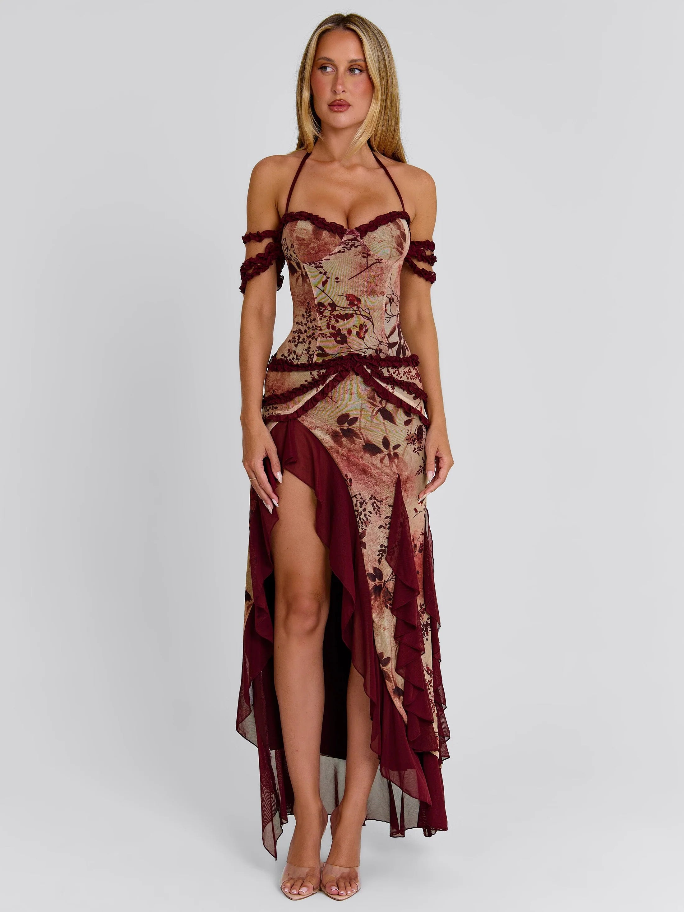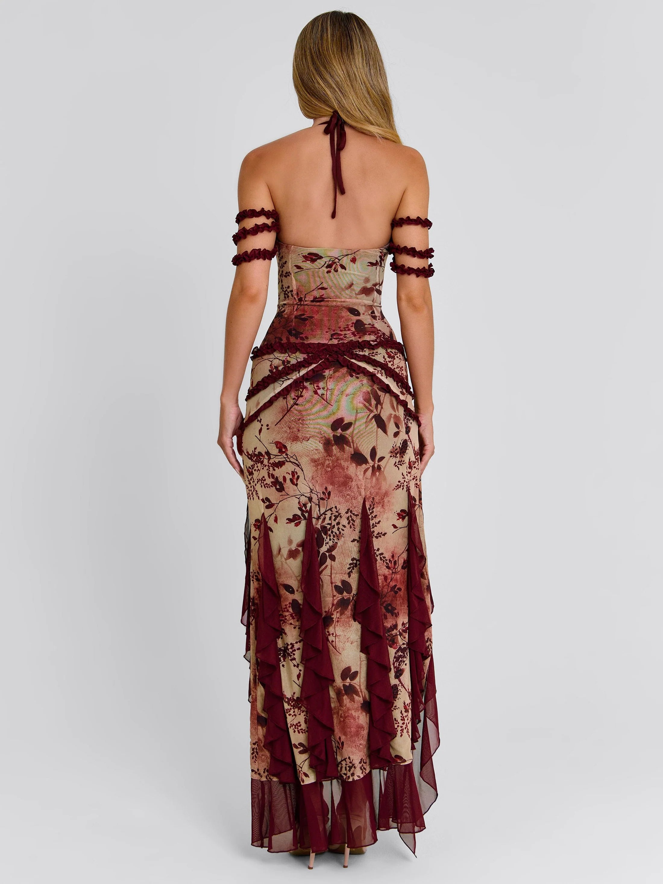 Crafted from printed stretch mesh fabrication, this fully lined maxi contours the body while remaining comfortable to wear. An adjustable halter neckline allows for a personalised fit, while contrast deep maroon ruffle detailing frames the shoulders and hips for a soft, feminine finish. Flounced panels cascade through the skirt, creating fluid movement with every step.