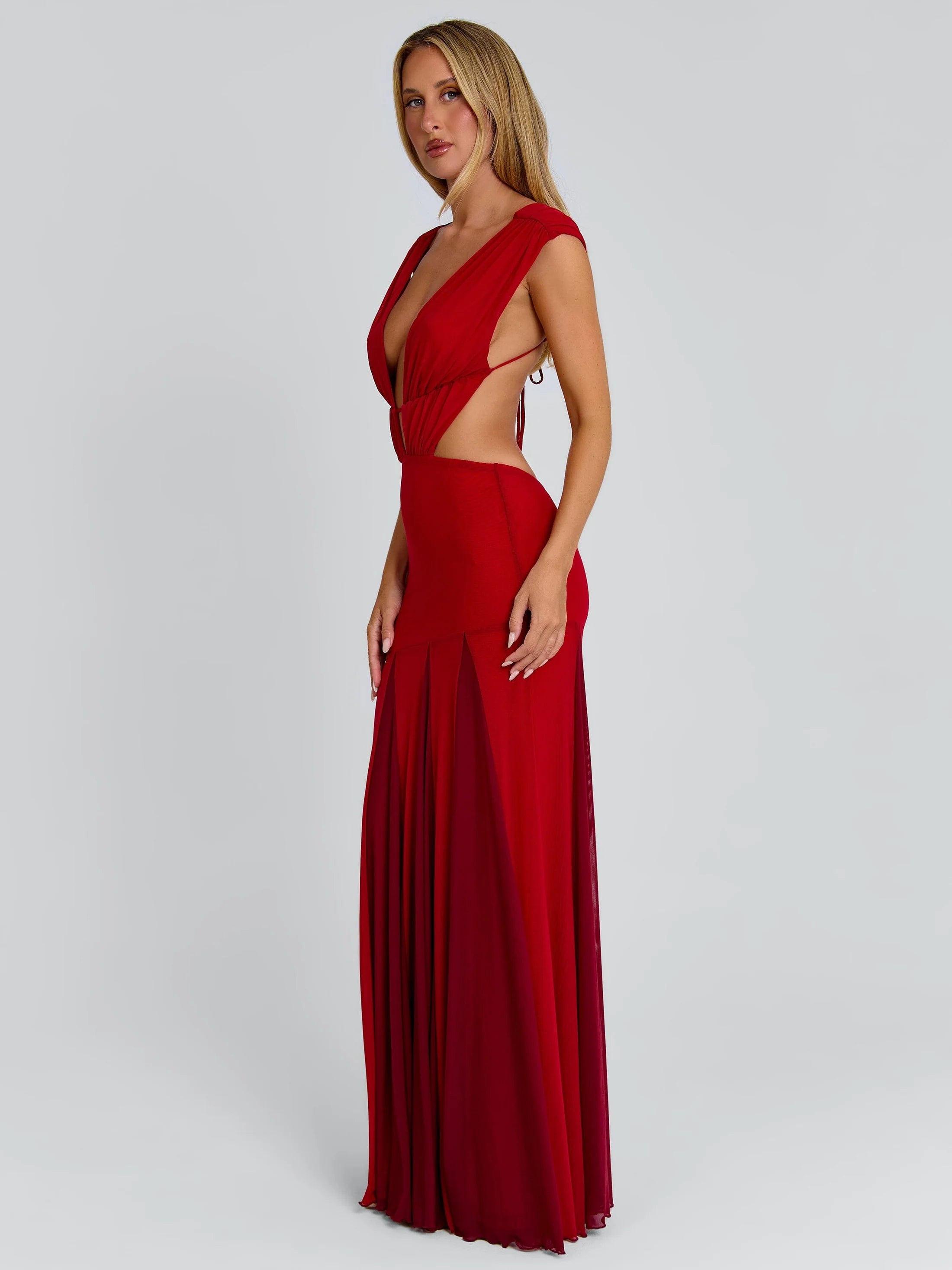 Crafted from a fully lined mesh fabrication, this striking red maxi features a plunging neckline with sculpted cut-outs through the waist for a bold, feminine silhouette. Soft gathering through the shoulders adds shape and movement, while the open back is finished with a delicate tie detail for an adjustable fit. The skirt flows into contrast darker red godets, adding depth and fluid movement as you walk.
